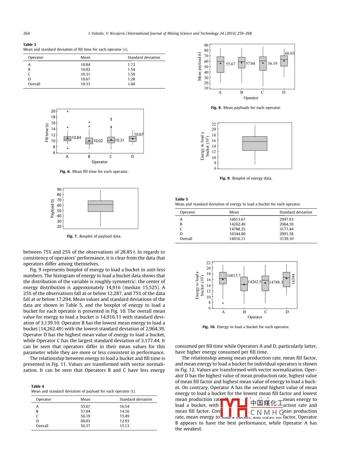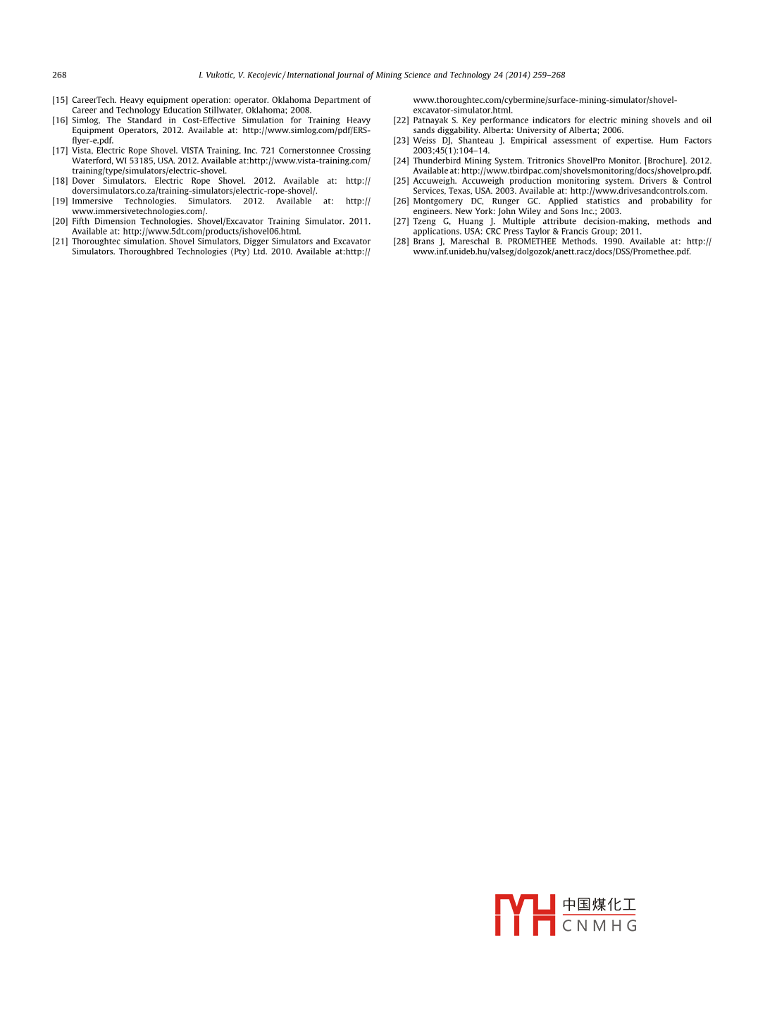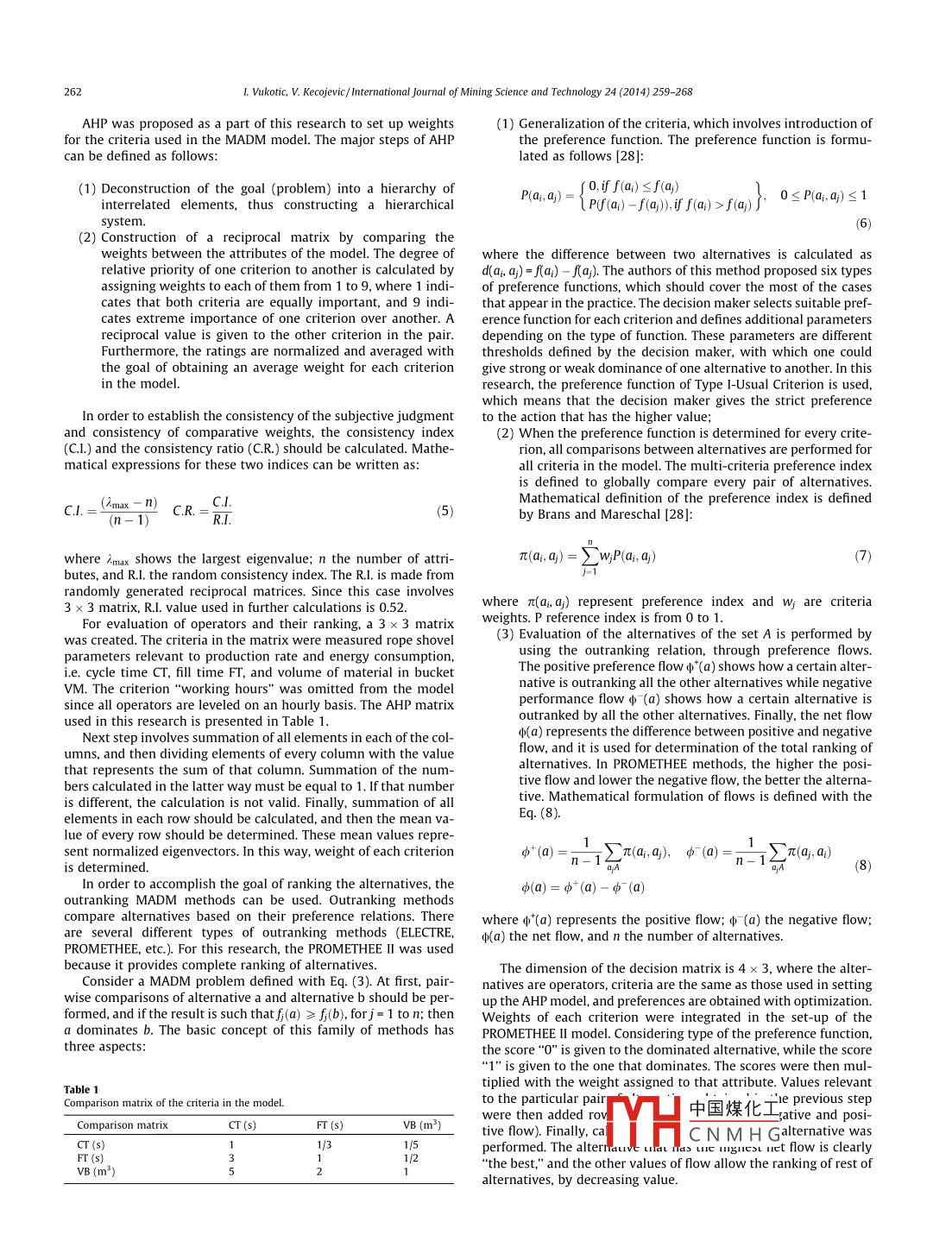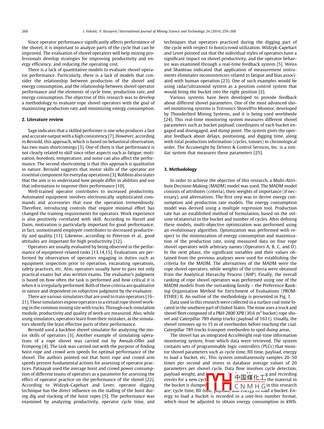 International Journal of Mining Science and Technology 24(2014)259-268Contents lists available at Science DirectInternational Journal of Mining Science and TechnologyELSEVIERurnalhomepagewww.elsevier.com/locate/ijmstEvaluation of rope shovel operators in surface coal miningusing a multi-Attribute Decision-Making modelVukotic Ivana, Kecojevic VladislavARTICLE INFOABSTRACTArticle historRope shovels are used to dig and load materials in surface mines. One of the main factors that influenceReceived 27 July 2013the production rate and energy consumption of rope shovels is the performance of the operator. ThReceived in revised form 26 August 2013aper presents a method for evaluating rope shovel operators using the Multi-Attribute Decision-MakingAccepted 21 September 2013Available online 12 February 2014(MADM)model Data used in this research were collected from an operating surface coal mine in thesouthern United States. The MADM model consists of attributes, their weights of importance, and alter-natives. Shovel operators are considered the alternatives. The energy consumption model was developedpe shovelwith multiple regression analysis, and its variables were included in the MADM model as attributesPreferences with respect to min/ max of the defined attributes were obtained with multi-objective optimization Multi-objective optimization was conducted with the overall goal of minimizing energy con-Imption and maximizing production rate. Weights of importance of the attributes were determinedAHPby the Analytical Hierarchy Process(AHP). The overall evaluation of operators was performed by oneof the MADM models, i.e., PROMETHEE IL. The research results presented here may be used by miningprofessionals to help evaluate the performance of rope shovel operators in surface miningo 2014 Published by Elsevier B V on behalf of China University of Mining Technology1 Introductionmotion are used to control the depth of the bucket penetrationPenetration that is too shallow will lead to longer hoist travel dRope shovels are used in large surface mining operations for the tance needed to fill the bucket, which will increase the fill time anddigging and loading of materials. Shovel productivity is highly influ- decrease the fill factor. However, applying excessive crowd motionenced by the skill and working practices of operators. Caterpillar will make the hoist motion slower The whole cycle time increasesdicates that one of the major factors for obtaining maximum pro- up to 50%, or even more, when the bucket is stalled in the bankductivity is a well-trained operator [1. According to Fiscor, better Therefore, to achieve an effective digging process, it is mandatoryoperator training and a consistent clean-up process around the load- for an operator to establish balance between the hoist and crowding area and face could save 20 min of cycle time per day [2. Several motion. In addition, unbalanced crowd and hoist forces lead toresearch studies have shown that mine operating conditions and jacking of the boom, which can cause serious damage to the shoveloperators'practices significantly affect energy consumption 3-71The swinging phase begins when the bucket is full of material,he most influential factors related to the overall working cycle and in this phase, the operator controls the movement of the bucketof the shovel that impact its productivity are cycle time and fillabil- though a defined swing path and dump height toward the haulle bucket. The basic rope shovel motions involve hoist, truck. An experienced operator can achieve smooth and continuouscrowd, swing, and propel. The shovel operating cycle consists of dig- acceleration, maximum speed, and deceleration Motion that is notging, swinging, dumping, returning, and positioning. Even though smooth can result in the increase of time and spillage, which canthese parts of the operation are operationally independent, the skill further damage the body of the truck. In addition the operator influ-and coordination of an operator is required for a smooth cycleences the propel function, or positioning of the shovel in order to getThe digging phase involves crowd motion of the bucket into the the highest number of filled buckets before moving again. Locatingbank, hoist motion to fill the bucket, and drawing from the bank the shovel too far from the bank can decrease available digging18. When the bucket is hoisted to the bank, crowd and retract power. Also, inappropriate shovel location leads to an increase in cy-cle time. Maximum efficiency is achieved when it is positioned closeto the toe of the bank. According to P&H Mine Pro Services, by savingcomes ponding wian tie icomailwy3ed2 min per operati中國(guó)煤化工 shovel could loadone additional 1CNMHGhttp://dx.doiorg/10.1016/j.ijmst.2014.01.0192095-2686 2014 Published by Elsevier B V on behalf of China University of Mining Technology50L. Vukotic, V. Kecojevic/ International Journal of Mining Science and Technology 24(2014)259-268Since operator performance significantly affects performance of techniques that operators practiced during the digging part ofthe shovel, it is important to analyze parts of the cycle that can be the cycle with respect to hoist/ crowd utilization widzyk-Capehartimproved. The evaluation of shovel operators will help mining pro- and Lever pointed out that the individual styles of operators have afessionals develop strategies for improving productivity and en- significant impact on shovel productivity, and the operator behavergy efficiency, and reducing the operating costior was examined through a real-time feedback system [ 5]. WeissThere is a lack of quantitative models to evaluate shovel opera- and Shanteau indicated that application of measurement instrutor performance. Particularly, there is a lack of models that con- ments eliminates inconsistencies related to fatigue and bias associ-[23 One of such examples would beenergy consumption, and the relationship between shovel operator usin