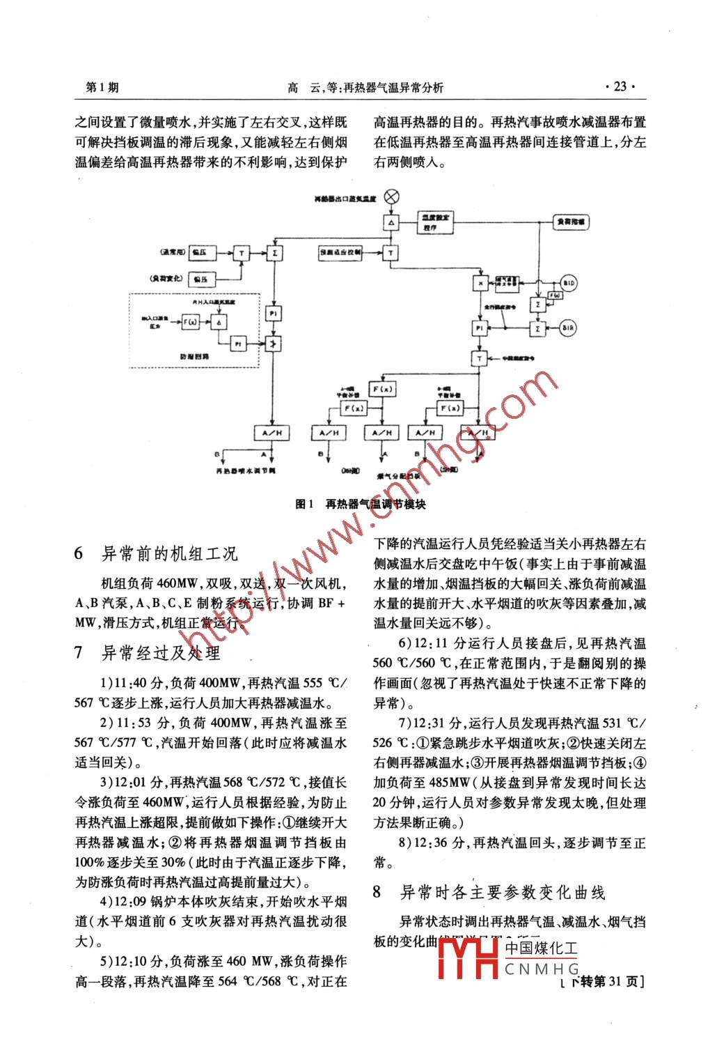 鍋爐制造No. 12013年1月BOILER MANUFACTURINGJan.2013文章編號(hào):CN23-1249(2013)01-0021-04再熱器氣溫異常分析高云1,鄭宏2(1哈爾濱鍋爐廠有服責(zé)任公司,黑龍江哈爾濱150040;2.哈爾濱醫(yī)大二院,黑龍江哈爾濱150060)摘要:介紹了某電廠鍋爐的汽水流程、主要設(shè)計(jì)參數(shù),再熱器氣溫調(diào)節(jié)的特性及調(diào)節(jié)的方塊圖,重點(diǎn)介紹再熱器氣溫的調(diào)節(jié)方式。詳細(xì)介紹了再熱器氣溫異常的整個(gè)運(yùn)行操作過程,異常時(shí)各主要參數(shù)的變化曲線,對(duì)異常做出準(zhǔn)確的分析,并總結(jié)經(jīng)驗(yàn)和教訓(xùn)。關(guān)鍵詞:再熱器;氣溫特性;調(diào)節(jié);異常中圖分類號(hào):TK223文獻(xiàn)標(biāo)識(shí)碼:AReheater Temperature Abnormal AnalysisGao Yun', Zheng Hong(1. Harbin Boiler Co, Ltd, Harbin 150040, China2. second affiliated hospital of harbin medical university, Harbin 150060, China)Abstract This articles introduces a power plant boiler water to steam process, the major design pa-rameters, the air temperature regulative characteristics and the block diagram of the reheater, it Highghts the reheater temperature adjustment method. It details of the reheater temperature anomaliesduring the whole operation control process, Abnormal variation curve of the main parameters undernal condition. It make accurate analysis to the abnormal, And sum up experiences and lessonsKey words: reheater; temperature characteristics; adjust; abnormal0引言膛上部的水冷壁上集箱和后水冷壁吊掛管出口集箱,然后經(jīng)下降管向下到匯集集箱通過連接管連某電廠系某大型鍋爐制造企業(yè)自主設(shè)計(jì)制造接折焰角入口集箱和水平煙道側(cè)墻下集箱然后向的超臨界變壓參數(shù)運(yùn)行、直流、單爐膛、一次中間上到水冷壁排管集箱和側(cè)墻上集箱,再引人汽水再熱、中下部水冷壁采用螺旋管圈、前后墻對(duì)沖旋分離器。從汽水分離器出來的蒸汽引至頂棚和包流燃燒方式、平衡通風(fēng)、固態(tài)排渣、全鋼懸吊結(jié)構(gòu)、墻系統(tǒng),再進(jìn)入低溫過熱器,然后再流經(jīng)屏式過熱采用大屋頂半露天布置、Ⅱ型燃煤鍋爐。器和末級(jí)過熱器到汽輪機(jī)。1鍋爐汽水煙氣流程再熱器分為低溫再熱器和末級(jí)再熱器兩段布置,低溫再熱器布置于尾部雙煙道前部,分為水平鍋爐的汽水流程從前后水冷壁下集箱進(jìn)口一低溫再熱器和立式低溫再熱器,末級(jí)再熱器布置直到中間混合集箱之間為螺旋管圈水冷壁,通過于水平煙道中逆、順流混合換熱。中間混合集箱轉(zhuǎn)換為垂直水冷壁,向上連接到爐煙氣從爐膛出口至鍋爐尾部煙道,依次流經(jīng)上中國煤化工收稿日期:2011-11-13作者簡介:高云(1971-),男,黑龍江省哈爾濱人,1992年畢業(yè)于哈爾濱理工大學(xué)THCNMH(務(wù)工作。22鍋爐制造總第237期爐膛的屏式過熱器末級(jí)過熱器、高溫再熱器,到尾進(jìn)入下方的兩臺(tái)回轉(zhuǎn)式空氣預(yù)熱器到引風(fēng)機(jī)。部雙煙道中煙氣分兩路,一路經(jīng)前部煙道中的立式和水平低溫再熱器、省煤器,一路經(jīng)后部煙道的立2鍋爐主要設(shè)計(jì)技術(shù)規(guī)范式低溫過熱器、水平低溫過熱器、省煤器,最后都該鍋爐主要技術(shù)參數(shù)見下表1所示。表1技術(shù)參數(shù)過熱器出口蒸汽再熱器出口蒸汽再熱器噴水流量過熱器出口蒸汽再熱器進(jìn)口蒸汽再熱器出口蒸汽負(fù)荷流量Uh流量tht/h壓力MPa.g壓力MPag壓力MPa.g16044.65808.415234.4175% BMCR50% THA816.8722最低負(fù)荷高加切除過熱器出口蒸汽過熱汽溫度左右再熱器進(jìn)口蒸汽再熱器出口蒸汽再熱汽溫度左右再熱器減溫水負(fù)荷溫度/℃偏差℃溫度/℃溫度/℃偏差/℃BMCR190.73152187.975% BMCR50%O THA571157.7最低負(fù)荷高加切除3鍋爐再熱器汽溫特性膛受熱面結(jié)渣或積灰,會(huì)使?fàn)t內(nèi)輻射傳熱量減少再熱器區(qū)的煙溫提高,因而再熱汽溫增加;再熱器鍋爐滑壓運(yùn)行時(shí),再熱器的蒸汽壓力隨著負(fù)本身嚴(yán)重積灰、結(jié)渣或管內(nèi)結(jié)垢時(shí),將直接影響吸荷逐漸降低而降低。隨著蒸汽的比熱減小,加熱熱,造成再熱汽溫下降。到相同溫度所需的熱量也減少。5)爐膛火焰中心對(duì)再熱汽溫的影響?;鹧?)鍋爐負(fù)荷對(duì)再熱汽溫的影響。對(duì)于對(duì)流中心升高,爐膛輻射吸熱量下降,爐膛折焰角上部受熱面,再熱蒸汽溫度隨著鍋爐負(fù)荷的增加而增和水平煙道內(nèi)布置的再熱器因?yàn)閭鳠釡貕涸黾佣?對(duì)于輻射受熱面,再熱蒸汽溫度隨負(fù)荷的增大增加吸熱量,再熱出口汽溫升高而降低。2)給水溫度對(duì)再熱汽溫的影響。給水溫度4再熱器汽溫調(diào)節(jié)方塊圖的升高,工質(zhì)總吸熱量減少,燃煤量減少,爐膛溫直流鍋爐再熱汽溫的調(diào)節(jié)不同于過熱汽溫,不度降低,輻射吸熱量下降,對(duì)流吸熱量也因煙氣溫能用燃水比來進(jìn)行調(diào)節(jié)。再熱汽溫過低,將使汽輪度和煙氣流速速的降低而減少,再熱汽溫隨給水機(jī)汽耗量增加;再熱汽溫過高,會(huì)造成金屬材料的溫度的升高而降低。損壞。因此,運(yùn)行中必須控制再熱汽溫保持在規(guī)定3)爐膛出口過量空氣系數(shù)對(duì)再熱汽溫的影的范圍內(nèi)。再熱器氣溫調(diào)節(jié)模塊見圖1所示。響。爐膛出口過量空氣系數(shù)增大,送入爐膛的風(fēng)量增大,爐膛內(nèi)溫度水平降低輻射