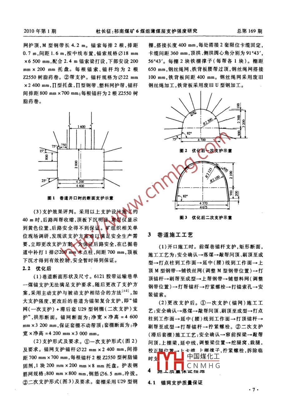 2010年第1期中州煤炭總第169期祁南煤礦6煤組薄煤層支護(hù)強(qiáng)度研究杜長征(淮北礦業(yè)集團(tuán)祁南煤礦,安徽宿州234115)擴(kuò)要:祁南煤礦現(xiàn)開釆中組薄煤層,由于地質(zhì)方面的原因,使巷道支護(hù)困難,礦井開采難度較大。通過對(duì)祁南煤礦61煤層據(jù)進(jìn)支護(hù)的探索,找到了解決祁膚煤礦中組薄煤層(6、52、6)巷道壓力大、支護(hù)難問題的方法:采用錨架復(fù)合支護(hù),即“錨網(wǎng)(初次支護(hù))+滯后套U29型鋼棚(二次支護(hù))聯(lián)合支護(hù)”,巷道采用拱形斷面。關(guān)鍵詞:回采巷道;錨架復(fù)合支護(hù);直接頂;直接底中田分類號(hào):TD353文獻(xiàn)標(biāo)識(shí)碼:A文章編號(hào):1003-0506(2010)01-0006-04Thin CoalBed Supporting Intensity Exploration of No 6 Coal Group in Qi nan Coal Mine(Qinan Coal Mine, Huaibei Mining Industry Group, Suzhou 234115,ChinaAbstract: The current coal mining seam of Qinan Coal Mine is thin seam in middle group. Based on the complex geological conditionsthe supporting of the roadway is very difficult, and it is hard to mine coal. Through the discussion of driving support of 6, Coal Seam inQinan Coal Mine, the solution of roadway large-pressure and supporting difficulty was proposed to deal with the problems of thin coseam in middle coal seam group(6,, 62, 6,): using anchor rack compound supports and protections, that is, "Compound support by bolting with wire mesh( initial supporting)+ setting U29 steel shed( secondary supporting)", and the roadway is arched section.Keywords: gateway; anchor rack compound supports and protections; immediate roof; immediate bottom淮北礦業(yè)集團(tuán)公司祁南煤礦是年產(chǎn)240萬t的界,其下一區(qū)段為6123工作面,該面尚未準(zhǔn)備。從大型礦井,可開采煤層共有10層(23、3261、62、63、82采區(qū)6煤組運(yùn)輸上山開口,該巷道為回采巷道7,728、9、10)。近年來隨著開采的深入,中組薄煤沿6,煤施工。層已逐漸得到配采,但由于地質(zhì)方面原因,開采難度6,煤層厚1.2~1.4m,平均1.3m,以薄煤層為大,掘進(jìn)困難,前掘后修情況較普遍,極大地浪費(fèi)了主,煤層結(jié)構(gòu)簡單,以單一煤層為主,局部含一層泥人力物力。該礦通過對(duì)6121膠帶運(yùn)輸巷支護(hù)方式巖夾矸。直接頂?shù)拙鶠槟鄮r,較軟,但遇水不泥化。的優(yōu)化,取得了較好的效果。根據(jù)鉆探資料及三維地震勘探資料分析,61211巷道支護(hù)概況膠帶運(yùn)輸巷以F(10°∠60°,H=0~20m)正斷層保護(hù)煤柱為界,在施工過程中對(duì)掘進(jìn)影響較大。受此祁南煤礦6121工作面位于82采區(qū)上部,開采斷層影響,小構(gòu)造較為發(fā)育,局部地段煤層起伏較6煤層煤厚平均1.3m,煤厚傾角11°,頂、底板均大,頂板較為破碎,壓力較大為泥巖,很不穩(wěn)定。6121膠帶運(yùn)輸巷位于82采區(qū)左翼6煤組第1區(qū)段611工作面下方,6121工作面2巷道斷面尺寸及支護(hù)參數(shù)上部以-360m防砂煤柱為界,6121工作面右側(cè)以2.1開口時(shí)采區(qū)上山保護(hù)煤柱為界,下方以F斷層保護(hù)煤柱為(1)巷道斷面形狀及尺寸。6121膠帶運(yùn)輸巷剛開口時(shí)設(shè)計(jì)為煤巷錨桿支護(hù),錨索補(bǔ)強(qiáng),矩形斷面,收稿日期:2009-11-25斷面V凵中國煤化工x中高)。作者簡介:杜長征(1975-),男,安徽淮北人,注冊(cè)安全工程師,1995CNMHG。①頂支護(hù)。錨桿年畢業(yè)于徐州工業(yè)學(xué)校,200年畢業(yè)于安徽理工大學(xué)長期從事煤規(guī)格222mmx2400mm,錨桿間排距為750mmx礦掘進(jìn)工作700mm,每根錨桿1塊M型托盤,M型鋼帶、鐵絲2010年第1期杜長征:祁南煤礦6煤組薄煤層支護(hù)強(qiáng)度研究總第169期網(wǎng)護(hù)頂,M型鋼帶長4.2m。錨索每排2根,排距棚,搭接長度400mm,每處搭接2套限位卡纜固定0.7m,間距1.6m,按中線布置,錨索規(guī)格⑧18mm卡纜間距360mm,頂拱、側(cè)拱圓心角分別為91°43’,6500mm,配合2.4m錨索梁打設(shè),下部安設(shè)20056°43’′。每棚2塊鐵棚撐子(每幫各1塊)。棚距mmx200mm托盤。每根錨索、錨桿均為2根650mm,鋼絲繩網(wǎng)、鐵背板腰幫過頂,鋼絲繩網(wǎng)搭接z2550樹脂藥卷。②幫支護(hù)。錨桿規(guī)格為¢22mm100mm,鐵背板間距400mm。鋼絲繩網(wǎng)采用廢舊2400mm,∏型托盤,∏型鋼帶塑料網(wǎng)護(hù)幫,錨桿鋼絲繩加工,鐵背板采用廢舊U型鋼加工。間排距800mmx700mm;每根錨桿為2根Z2550樹脂藥卷。4700圖2優(yōu)化后一次支護(hù)示意4400圖1巷道開口時(shí)的斷面支護(hù)示意(3)支護(hù)效果評(píng)判。采用以上支護(hù)設(shè)計(jì)施工約40m時(shí),后路兩幫收縮,頂板下沉明顯,離層儀顯示圖3優(yōu)化后二次支護(hù)示意到黃色位置,后路安全得不到保證。礦組織相關(guān)單位現(xiàn)場調(diào)研,發(fā)現(xiàn)該支護(hù)方案難以滿足安全生產(chǎn)需3巷道施工工藝要,立即更改支護(hù)方案。為保證后路安全,在已掘巷(1)開口施工時(shí)。前煤巷錨桿支護(hù),矩形斷面,道中補(bǔ)打1排200mm木點(diǎn)柱,間距700mm,頂板施工工藝為:安全確認(rèn)→落煤→敲幫問頂、刷頂至成下沉才得到有效控制,安全暫時(shí)得到保證。型→打點(diǎn)柱到工作面→延中(腰)線到工作面→上2.2優(yōu)化后頂M型鋼帶→鋪鐵絲網(wǎng)(調(diào)整M型鋼帶位置)→打(1)巷道斷面形狀及尺寸。6121膠帶運(yùn)輸巷單頂錨桿→刷幫至成型→上幫鋼帶→鋪塑料網(wǎng)(調(diào)整煤錨支護(hù)無法滿足支護(hù)要求,隨后更改了支護(hù)方鋼帶位置)→打
