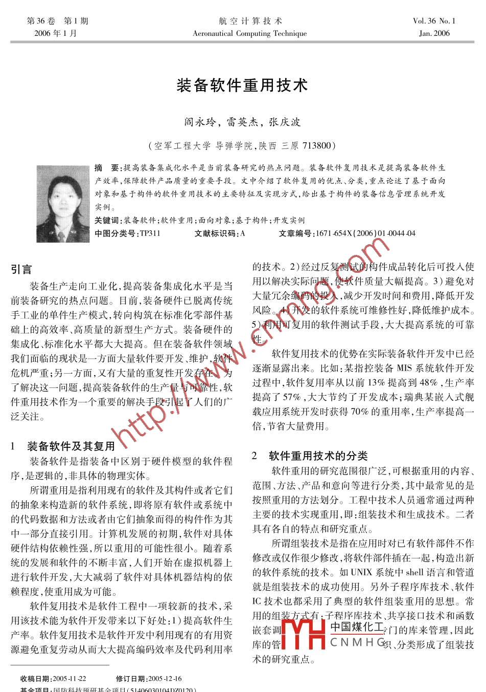 第36卷第1期航空計(jì)算技術(shù)Vol. 36 No. 12006年1月Aeronautical Computing TechniqueJan. 2006裝備軟件重用技術(shù)閻永玲,雷英杰,張慶波(空軍工程大學(xué)導(dǎo)彈學(xué)院,陜西三原713800)摘 要:提高裝備集成化水平是當(dāng)前裝備研究的熱點(diǎn)問題。 裝備軟件復(fù)用技術(shù)是提高裝備軟件生產(chǎn)效率,保障軟件產(chǎn)品質(zhì)量的重要手段。文中介紹了軟件復(fù)用的優(yōu)點(diǎn)、分類,重點(diǎn)論述了基于面向?qū)ο蠛突跇?gòu)件的軟件重用技術(shù)的主要特征及實(shí)現(xiàn)方式,給出基于構(gòu)件的裝備信息管理系統(tǒng)開發(fā)關(guān)鍵詞:裝備軟件;軟件重用;面向?qū)ο?基于構(gòu)件;開發(fā)實(shí)例中圖分類號(hào):TP311文獻(xiàn)標(biāo)識(shí)碼:A文章編號(hào):1671 -654X(2006)01 004404引言的技術(shù)。2)經(jīng)過反復(fù)測(cè)試的構(gòu)件成品轉(zhuǎn)化后可投入使裝備生產(chǎn)走向工業(yè)化,提高裝備集成化水平是當(dāng)用以解決實(shí)際問題,使軟件質(zhì)量大幅提高。3)避免對(duì)前裝備研究的熱點(diǎn)問題。目前,裝備硬件已脫離傳統(tǒng)大量冗余編碼的投人,減少開發(fā)時(shí)間和費(fèi)用,降低開發(fā)手工業(yè)的單件生產(chǎn)模式,轉(zhuǎn)向構(gòu)筑在標(biāo)準(zhǔn)化零部件基風(fēng)險(xiǎn)。4)開發(fā)的軟件系統(tǒng)可維修性好,降低維護(hù)成本。礎(chǔ)上的高效率高質(zhì)量的新型生產(chǎn)方式。裝備硬件的5)利用可復(fù)用的軟件測(cè)試手段,大大提高系統(tǒng)的可靠集成化標(biāo)準(zhǔn)化水平都大大提高。但在裝備軟件領(lǐng)域性。我們面臨的現(xiàn)狀是- .方面大量軟件要開發(fā)、維護(hù),軟件軟件復(fù)用技術(shù)的優(yōu)勢(shì)在實(shí)際裝備軟件開發(fā)中已經(jīng)危機(jī)嚴(yán)重;另-方面,又有大量的重復(fù)性開發(fā)存在。為逐漸:顯露出來。比如:某指控裝備MIS系統(tǒng)軟件開發(fā)了解決這一-問題,提高裝備軟件的生產(chǎn)量與可靠性,軟過程中,軟件復(fù)用率從以前13%提高到48% ,生產(chǎn)率.件重用技術(shù)作為-一個(gè)重要的解決手段引起了人們的廣提高了57%,大大節(jié)約了開發(fā)成本;瑞典某嵌人式艦泛關(guān)注。載應(yīng)用系統(tǒng)開發(fā)時(shí)獲得70%的重用率,生產(chǎn)率提高一倍,節(jié)省大量費(fèi)用。1裝備軟件及其復(fù)用裝備軟件是指裝備中區(qū)別于硬件模型的軟件程2軟件重用技術(shù)的分類序,是邏輯的,非具體的物理實(shí)體。軟件重用的研究范圍很廣泛,可根據(jù)重用的內(nèi)容、所謂重用是指利用現(xiàn)有的軟件及其構(gòu)件或者它們范圍、方法、產(chǎn)品和意向等進(jìn)行分類,其中最常見的是的抽象來構(gòu)造新的軟件系統(tǒng),即將原有軟件或系統(tǒng)中按照重用的方法劃分。工程中技術(shù)人員通常通過兩種的代碼數(shù)據(jù)和方法或者由它們抽象而得的構(gòu)件作為其主要 的技術(shù)實(shí)現(xiàn)重用,即:組裝技術(shù)和生成技術(shù)。二者中- -部分直接引用。計(jì)算機(jī)發(fā)展的初期,軟件對(duì)具體具有各自的特點(diǎn)和研究重點(diǎn)。硬件結(jié)構(gòu)依賴性強(qiáng),所以重用的可能性很小。隨著系所謂組裝技術(shù)是指在應(yīng)用時(shí)對(duì)已有軟件部件不作統(tǒng)的發(fā)展和軟件的不斷豐富,人們開始在虛擬機(jī)器上修改或僅作很少修改,將軟件部件插在一-起 ,構(gòu)造出新進(jìn)行軟件開發(fā),大大減弱了軟件對(duì)具體機(jī)器結(jié)構(gòu)的依的軟件系統(tǒng)的技術(shù)。如UNIX系統(tǒng)中shell 語言和管道賴程度,使重用成為可能。就是組裝技術(shù)的成功使用。另外子程序庫技術(shù)、軟件軟件復(fù)用技術(shù)是軟件工程中-項(xiàng)較新的技術(shù),采.IC技術(shù)也都采用了典型的軟件組裝重用的思想。常用該技術(shù)能為軟件開發(fā)帶來以下好處:1)提高軟件生用的組裝方式有子程序庫技術(shù)、共享接口技術(shù)和函數(shù)產(chǎn)率。軟件復(fù)用技術(shù)是軟件開發(fā)中利用現(xiàn)有的有用資嵌套調(diào)| YH中國煤化工;?門的庫來管理,因此源避免重復(fù)勞動(dòng)從而大大提高編碼效率及代碼利用率庫的管CN M H G織、分類形成了組裝技術(shù)的研究重點(diǎn)。收稿日期2005-11-22修訂日期:2005-12-16基金項(xiàng)目:國防科技預(yù)研基金項(xiàng)日(51406030104DZ0120)作者簡介:閻永玲(1978- ),女,山西太原人,講師,碩士研究生研究方向?yàn)檐娪密浖碚摵蛙娛卵b備。2006年1月閻永玲等:裝備軟件重用技術(shù)●45.生成技術(shù)是由軟件部件衍生出新的程序,根據(jù)部件合所以面向?qū)ο蟮拈_發(fā)方法可以降低大規(guī)模裝備軟件管成原則將部件合成具有新功能的部件。這是一種模式理系統(tǒng)的開發(fā)難度,同時(shí)還給出了一種軟件復(fù)用的模重用,由軟件生成器通過對(duì)不同特定參數(shù)的選擇來生式/框架(也稱為白盒框架)。開發(fā)人員以類為復(fù)用的成新的軟件成份。比較典型的使用生成技術(shù)的例子是基本單位,封裝得很好的類作為功能實(shí)體被重復(fù)使用,UNIX系統(tǒng)中詞法分析器Lex和語法分析器Yacc。生大大提高了軟件開發(fā)的效率。成技術(shù)與組裝技術(shù)相比,優(yōu)點(diǎn)是軟件重用的效率高,缺點(diǎn)在于生成新