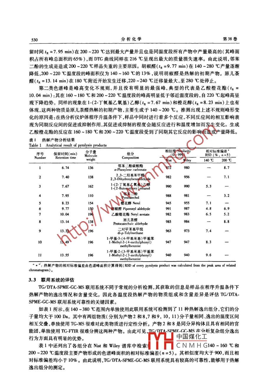 第38卷分析化學(xué)( FENXI HUAXUE)研究報告42010年4月Chinese Journal of Analytical Chemistry527~531DoI:10.3724/SP,J1096.2010.00527熱重/差熱分析-固相微萃取…氣相色譜質(zhì)譜聯(lián)用系統(tǒng)的建立與應(yīng)用朱文輝2楊柳”2楊紅燕23吳億勤2董學(xué)暢繆明明(云南民族大學(xué)化學(xué)與生物技術(shù)學(xué)院,昆明65031)2(紅塔煙草(集團(tuán))有限責(zé)任公司技術(shù)中心,玉溪653100)3(云南大學(xué)化學(xué)科學(xué)與工程學(xué)院昆明650091)‘(云南煙草科學(xué)研究院昆明650106)摘要根據(jù)非平衡態(tài)固相微萃取理論建立了熱重/差熱分析固相微萃取氣相色譜質(zhì)譜聯(lián)用系統(tǒng)并按照劃分溫度段取樣的方法將其應(yīng)用于原兒茶醛熱解行為的研究,以驗證聯(lián)用系統(tǒng)的可靠性和分析方法的可行性。采用此系統(tǒng),在10℃/mn升溫速率、200mL/min氮?dú)饬魉贄l件下,在140-380℃溫度范圍內(nèi)監(jiān)測并分析了原兒茶醛的10種熱解逸出產(chǎn)物的含量變化和原兒茶醛本體的遷移情況。結(jié)果表明此聯(lián)用系統(tǒng)在分析復(fù)雜組分逸出行為方面有明顯優(yōu)勢;根據(jù)熱解產(chǎn)物色譜峰面積計算得到的聯(lián)用系統(tǒng)相對標(biāo)準(zhǔn)偏差(n=5)小于10%,證明此聯(lián)用系統(tǒng)具有較高的可靠性能夠用于熱解行為的研究關(guān)鍵詞熱重/差熱分析;固相微萃取;氣相色譜質(zhì)譜;熱解行為;原兒茶醛1引言熱重/差熱分析法(TG/DTA)是應(yīng)用熱天平在程序控制溫度下測量物質(zhì)質(zhì)量與溫度關(guān)系的熱分析技術(shù),已廣泛應(yīng)用于諸多領(lǐng)域。將熱分析儀與其它檢測系統(tǒng)聯(lián)用結(jié)合各自的特點(diǎn)和功能,擴(kuò)大分析內(nèi)容是熱分析儀器的發(fā)展趨勢。目前普遍使用熱重傅立葉變換紅外聯(lián)用( TG-FTIR)和熱重質(zhì)譜聯(lián)用(TGMS),主要用于熱分析儀的逸出組分分析。但 TG-FTIR不適用于鑒定具有相同官能團(tuán)特征的復(fù)雜有機(jī)物-3:而TGMS尚未完全解決樣品在熱分解過程中同時逸出復(fù)雜組分的重疊質(zhì)譜峰解析“。上述問題制約了熱分析聯(lián)用技術(shù)的發(fā)展與應(yīng)用,需組建立一種能夠分析復(fù)雜逸出組分的聯(lián)用裝置,以彌補(bǔ)現(xiàn)有熱分析技術(shù)的不足。固相微萃取(SPME)是一種集萃取濃縮、解吸、進(jìn)樣于一體的樣品前處理技術(shù)已在環(huán)保、醫(yī)藥食品香料等領(lǐng)域得到廣泛應(yīng)用。將SPME應(yīng)用于熱分析儀逸出組分分析的研究尚未見報道。本研究基于SPME非平衡態(tài)吸附理論1-3),設(shè)計了可吸附熱分析儀逸出組分的聯(lián)結(jié)裝置結(jié)合氣相色譜質(zhì)譜法,建立了熱重/差熱分析固相微萃取氣相色譜質(zhì)譜(TG/ DTA-SPME-GC-MS)聯(lián)用系統(tǒng)。采用劃分溫度段取樣的方法,分析原兒茶醛(丹參等中草藥中的活性成分)的熱解行為,以驗證此聯(lián)用系統(tǒng)的可靠性和分析方法的可行性,為熱分析儀逸出組分分析提供了新的研究手段和方法。2實驗部分2.1儀器與試劑Pyris Diamond T/DTA型熱重/差熱綜合熱分析儀,外部溫度控制單元(日本SI公司)XL型氣相色譜 TurboMass Gold MS型質(zhì)譜聯(lián)用儀(美國 Perkin Elmer公司);100μm聚二甲基硅氧烷( Polydimethylsiloxane,PDMs)商用萃取頭,固相微萃取手柄(美國 Supelco公司)。原兒茶醛( Protocate-chui aldehyde,純度≥99.5%,華寶公司)。22TG/ DTA-SPME-GC-MS聯(lián)用系統(tǒng)的建立SPME-GC-MS聯(lián)用技術(shù)發(fā)展至今已經(jīng)比較成熟,而中國煤化工系統(tǒng)的關(guān)鍵在于熱分析儀與固相微萃取裝置的聯(lián)結(jié)。THCNMHG20090721收稿2009-11-12接受9@126.c0m528分析化學(xué)第38卷自行設(shè)計的聯(lián)結(jié)裝置如圖1所示,出口加熱帶固相微萃取裝置溫度由熱分析儀自帶的外部溫度控制單元調(diào)節(jié),溫度控在室溫至300℃范圍內(nèi);將爐體出口通過金屬不銹鋼管轉(zhuǎn)接頭與內(nèi)徑3mm的不銹鋼管連接;不銹鋼管外部m如體加熱帶加套保溫層,其上端出口帶有螺紋并能與手動固相Heat insulationOutlet heater band樣品架微萃取裝置緊密契合。在靠近不銹鋼管末端位置設(shè)天平榨有排氣孔;調(diào)節(jié)固相微萃取裝置的高度,使其萃取頭Balance beam伸出后全部位于不銹鋼管保溫層中,不與管壁接觸。報頭在爐體未加熱、出口加熱帶保持300℃,測得萃取頭位置的溫度為31℃,爐內(nèi)樣品架的溫度為45℃(室溫由空調(diào)控制恒定23℃);在爐體出口未圖1熱分析儀與固相微萃取的聯(lián)結(jié)裝置示意圖Fig 1 Schematic diagram of device coupling thermal an加熱、爐體于1000℃保持lh的條件下,測得萃取頭alyzer with solid phase microextration( SPME)位置的溫度為室溫。在出口加熱帶保持300℃的條件下,萃取溫度恒定為31℃,而不會受到爐體升溫的影響,保證了萃取條件的穩(wěn)定性。2.3儀器分析條件23.1熱分析儀(TG/DTA)條件熱天平靈敏度1μg;爐體溫度控制范圍為室溫至1000℃;載氣為高純氮?dú)?參比物a氧化鋁6.054mg;載氣流速200mL/min;出口加熱帶溫度控制范圍為室溫至300℃。232固相微萃取(SPME)條件100μm聚二甲基硅氧烷萃取頭;吸附溫度31℃;吸附時間2min233氣相色譜(GC)條件HP5Ms毛細(xì)管色譜柱(30mx0.25mm,0.25μm);進(jìn)樣口溫度250℃;載氣He(純度為99%9),載氣流速lmL/min;升溫程序50℃250℃,保持5min;不分流進(jìn)樣。234質(zhì)譜(MS)條件