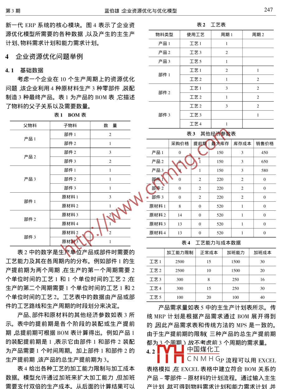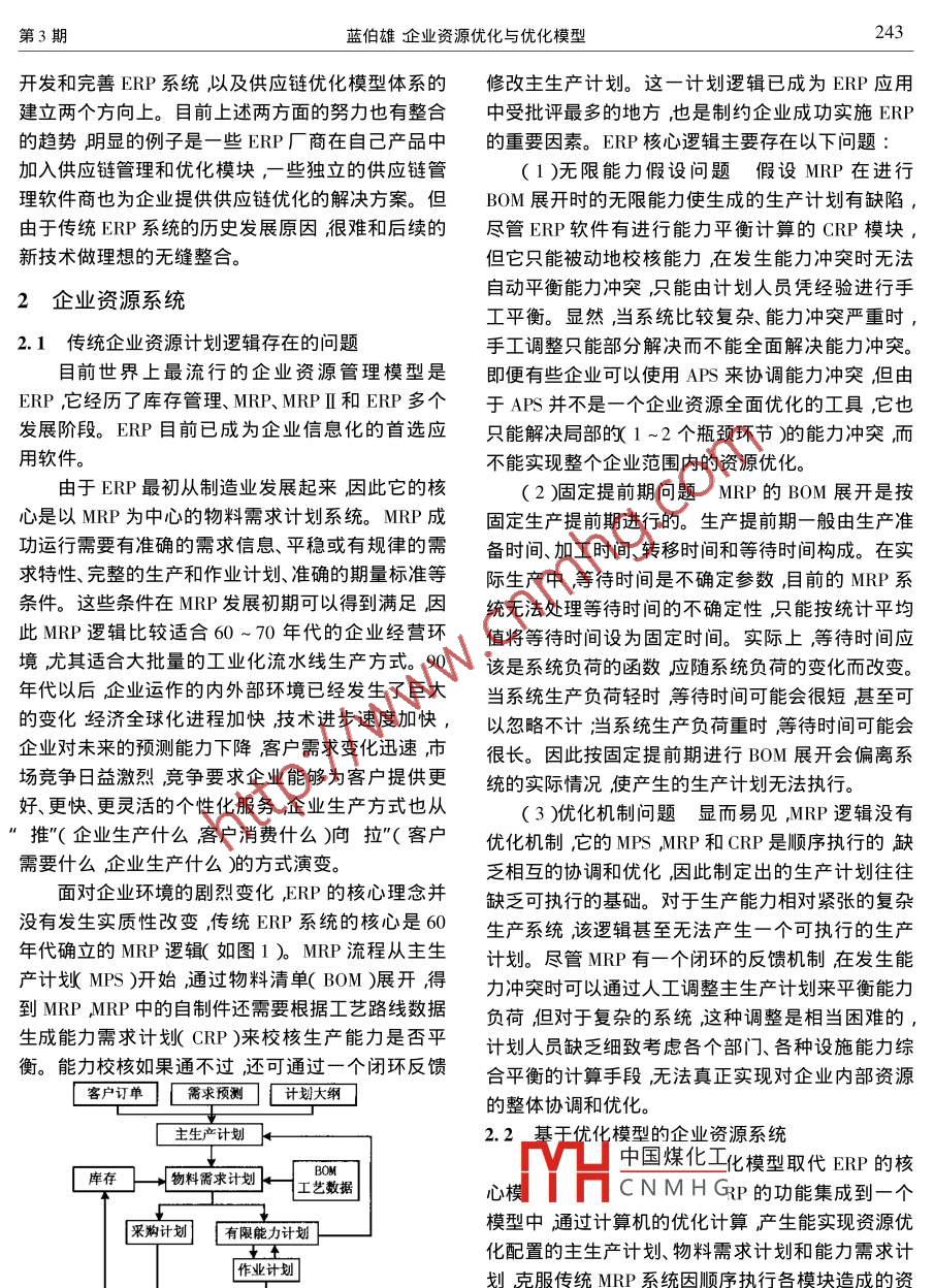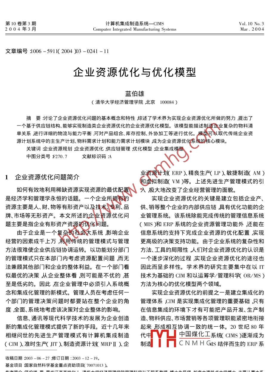 第10卷第3期計(jì)算機(jī)集成制造系統(tǒng)一-CIMSVol. 10 No. 32004年3月Computer Integrated Manufacturing SystemsMar.2004文章編號(hào):1006 -5911( 2004 )03 -0241 -11企業(yè)資源優(yōu)化與優(yōu)化模型藍(lán)伯雄(清華大學(xué)經(jīng)濟(jì)管理學(xué)院北京100084 )摘要討論了企業(yè)資源優(yōu)化問(wèn)題的基本概念和特性綜述了學(xué)術(shù)界為實(shí)現(xiàn)企業(yè)資源優(yōu)化所做的努力提出了-個(gè)基于供應(yīng)鏈結(jié)構(gòu)、能夠?qū)崿F(xiàn)制造類企業(yè)資源優(yōu)化的企業(yè)資源優(yōu)化模型。該模型能描述制造企業(yè)復(fù)雜的物料清單關(guān)系進(jìn)行詳細(xì)的物流與能力平衡,可對(duì)產(chǎn)品組合、庫(kù)存控制、外協(xié)加工等進(jìn)行優(yōu)化。模型可以取代傳統(tǒng)企業(yè)資源計(jì)劃系統(tǒng)中的主生產(chǎn)計(jì)劃、物料需求計(jì)劃和能力需求計(jì)劃模塊成為企業(yè)資源優(yōu)化系統(tǒng)的核心模塊。關(guān)鍵詞企業(yè)資源規(guī)劃企業(yè)資源優(yōu)化供應(yīng)鏈管理;優(yōu)化模型企業(yè)集成模型中圖分類號(hào):P270. 7文獻(xiàn)標(biāo)識(shí)碼:A業(yè)資源計(jì)劃ERP)精良生產(chǎn)(LP)敏捷制造(AM)1企業(yè)資源優(yōu)化問(wèn)題簡(jiǎn)介和虛擬制造(VM)等。上述先進(jìn)生產(chǎn)管理模式的引如何有效地利用稀缺資源實(shí)現(xiàn)資源的最優(yōu)配置入極大地改變了企業(yè)經(jīng)營(yíng)管理的面貌。是經(jīng)濟(jì)學(xué)和管理學(xué)永恒的話題。一個(gè)企業(yè)所擁有的實(shí)現(xiàn)企業(yè)資源優(yōu)化的關(guān)鍵是建立包括企業(yè)產(chǎn)、資源主要是人、財(cái)、物等有形資產(chǎn)以及技術(shù)、專利、品供、銷等整個(gè)企業(yè)的內(nèi)部供應(yīng)鏈具有優(yōu)化功能的企牌、市場(chǎng)等無(wú)形資產(chǎn)。本文所述的企業(yè)資源優(yōu)化問(wèn)業(yè)管理系統(tǒng)。該系統(tǒng)除能完成傳統(tǒng)的管理信息系統(tǒng)題主要是指企業(yè)有形資產(chǎn)資源的優(yōu)化問(wèn)題。(MIS)和ERP系統(tǒng)的企業(yè)資源管理功能外還能在由于企業(yè)是一個(gè)復(fù)雜的社會(huì)大系統(tǒng)影響企業(yè)信息系統(tǒng)的支持下完成企業(yè)資源的優(yōu)化配置,實(shí)現(xiàn)經(jīng)營(yíng)的因素成千上萬(wàn),利用傳統(tǒng)的管理模式與管理更高級(jí)的決策支持功能。由于企業(yè)系統(tǒng)的復(fù)雜性和方法很難使企業(yè)供應(yīng)鏈協(xié)調(diào)運(yùn)轉(zhuǎn)。以功能劃分部門(mén)方法、工具的局限性人們對(duì)企業(yè)資源優(yōu)化的認(rèn)識(shí)是的管理模式只在本部門(mén)內(nèi)考慮資源配置問(wèn)題而無(wú)-個(gè)逐步深化的過(guò)程實(shí)現(xiàn)企業(yè)資源優(yōu)化的途徑也法兼顧其他部門(mén)]和企業(yè)的整體利益。在-個(gè)部門(mén)看因此而呈多樣性。學(xué)術(shù)界的研究主要集中在以IT似最優(yōu)的決策從企業(yè)整體看則可能是不優(yōu)的甚技術(shù)為基礎(chǔ)的CIM和以運(yùn)籌學(xué)/管理科學(xué)(OR/MS)至是低劣的。因此,在企業(yè)管理中必須引入系統(tǒng)概方法為核心的優(yōu)化模型兩個(gè)領(lǐng)域。念和集成化管理的新模式。管理人員在考慮任何一實(shí)現(xiàn)企業(yè)資源優(yōu)化的前提之-是建立集成化的個(gè)部門(mén)]的管理決策問(wèn)題時(shí)都要站在整個(gè)企業(yè)的角管理體系CIM是實(shí)現(xiàn)集成化管理的重要基礎(chǔ)只有度,全面、系統(tǒng)地考慮該決策對(duì)企業(yè)整體的影響。在信息集成的環(huán)境下才有可能把產(chǎn)品開(kāi)發(fā)、生產(chǎn)制信息、通訊等現(xiàn)代科學(xué)技術(shù)的發(fā)展為企業(yè)創(chuàng)造造、物料供應(yīng)、市場(chǎng)營(yíng)銷等各項(xiàng)管理職能緊密地銜接新的集成化管理模式提供了新的手段。近十幾年來(lái)起來(lái)形成相互協(xié)調(diào)一致的統(tǒng)一體。20 世紀(jì)80年相繼問(wèn)世的先進(jìn)生產(chǎn)管理模式有計(jì)算機(jī)集成制造代中中國(guó)煤化工系統(tǒng)CIMS )逐漸成為( CIM )準(zhǔn)時(shí)生產(chǎn)( JIT )制造資源計(jì)劃MRPII )企制造YHCNMHGis結(jié)伴而生的ERP系收稿日期2003 -06-27修訂日期:2003 -12 -19?;痦?xiàng)目國(guó)家自然科學(xué)基金重點(diǎn)資助項(xiàng)目( 70071013 )。作者簡(jiǎn)介藍(lán)伯雄男黑龍江齊齊哈爾人清華大學(xué)經(jīng)濟(jì)管理學(xué)院管理科學(xué)與工程系教授博士生導(dǎo)師加拿大滑鐵盧大學(xué)博士主要從事大系統(tǒng)優(yōu)化理論與算法、供應(yīng)鏈優(yōu)化模型、復(fù)雜制造系統(tǒng)優(yōu)化模型等方面的研究。E - mail :lanbx@ em. tsinghua. edu. cn。242計(jì)算機(jī)集成制造系統(tǒng)一-CIMS第10卷統(tǒng)可以說(shuō)是實(shí)現(xiàn)企業(yè)資源優(yōu)化目標(biāo)的產(chǎn)物。但無(wú)論1.2計(jì)算機(jī)集成 制造是CIMS還是ERP都只是為實(shí)現(xiàn)企業(yè)資源優(yōu)化打計(jì)算機(jī)集成制造雖然完成了企業(yè)資源的集成,-個(gè)良好的基礎(chǔ)其自身還缺乏優(yōu)化的工具。但由于它缺少描述企業(yè)整體目標(biāo)的模型和優(yōu)化手企業(yè)資源優(yōu)化可借助OR/MS提供的各種方法段因此還不是-個(gè)完善的企業(yè)資源優(yōu)化系統(tǒng)。為和手段如