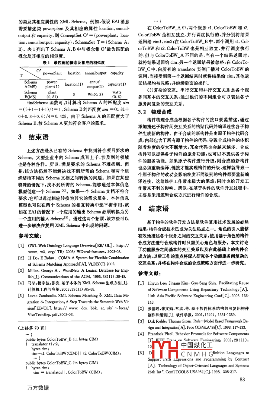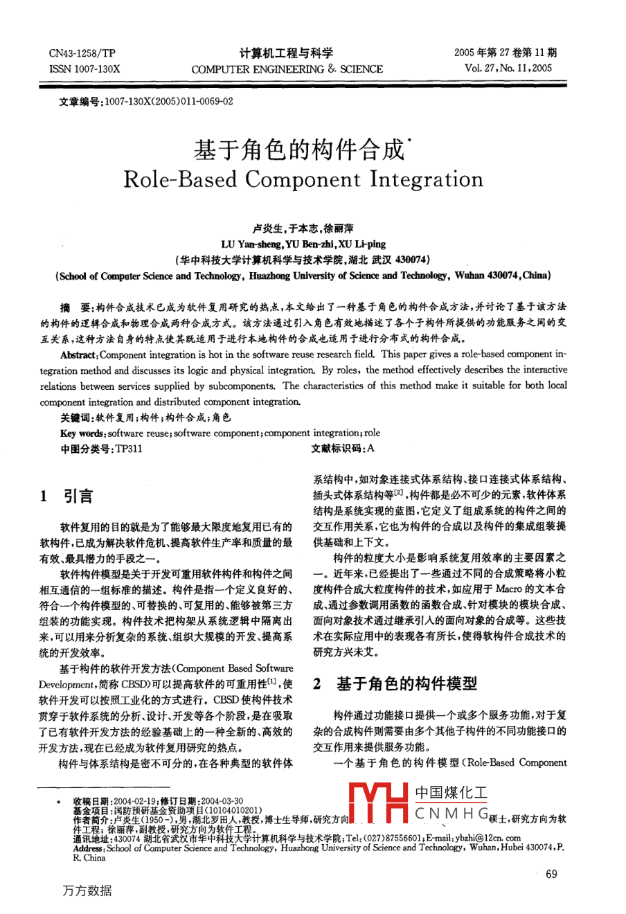 CN43-1258/TP計(jì)算機(jī)工程與科學(xué)2005年第27卷第11期ISSN 1007-130XCOMPUTER ENGINEERING & SCIENCEVol. 27,No. 11,2005文章編號(hào):1007-130X(2005)011-0069-02基于角色的構(gòu)件合成Role- Based Component Integration盧炎生,于本志,徐麗萍LU Yanr sheng, YU Ben-zhi,XU Li-ping(華中科技大學(xué)計(jì)算機(jī)科學(xué)與技術(shù)學(xué)院,湖北武漢430074)(School of Compater Science and Technology, Huazhong University of Science and Technology, Wuhan 430074,China)摘要:構(gòu)件合成技術(shù)已成為軟件復(fù)用研究的熱點(diǎn),本文給出了一種基于角 色的構(gòu)件合成方法,并討論了基于該方法的構(gòu)件的邏輯合成和物理合成兩種合成方式。該方法通過(guò)引入角色有效地描述了各個(gè)子構(gòu)件所提供的功能服務(wù)之間的交互關(guān)系,這種方法自身的特點(diǎn)使其既適用于進(jìn)行本地構(gòu)件的合成也適用于進(jìn)行分布式的構(gòu)件合成。Alstract:Component integration is hot in the software reuse research field. This paper gives a rolebased component in-tegration method and discusses its logic and pbysical integration. By roles, the method effectively describes the interactiverelations between services supplied by subcomponents. The characterstics of this method make it suitable for both localcomponent integration and distributed component integration.關(guān)鍵詞:軟件復(fù)用;構(gòu)件;構(gòu)件合成;角色Key words: software reuse; software component; component integration; role中圖分類(lèi)號(hào):TP311文獻(xiàn)標(biāo)識(shí)碼:A系結(jié)構(gòu)中,如對(duì)象連接式體系結(jié)構(gòu)、接口連接式體系結(jié)構(gòu)、1引言插頭式體系結(jié)構(gòu)等2]) ,構(gòu)件都是必不可少的元素,軟件體系結(jié)構(gòu)是系統(tǒng)實(shí)現(xiàn)的藍(lán)圖,它定義了組成系統(tǒng)的構(gòu)件之間的軟件復(fù)用的目的就是為了能夠最大限度地復(fù)用已有的交互作用關(guān)系,它也為構(gòu)件的合成以及構(gòu)件的集成組裝提軟構(gòu)件,已成為解決軟件危機(jī)、提高軟件生產(chǎn)率和質(zhì)量的最供基礎(chǔ)和上下文。有效、最具潛力的手段之- -.構(gòu)件的粒度大小是影響系統(tǒng)復(fù)用效率的主要因素之軟件構(gòu)件模型是關(guān)于開(kāi)發(fā)可重用軟件構(gòu)件和構(gòu)件之間-。 近年來(lái),已經(jīng)提出了一些通過(guò)不同的合成策略將小粒相互通信的- -組標(biāo)準(zhǔn)的描述。構(gòu)件是指- -個(gè)定 義良好的、度構(gòu)件合成大粒度構(gòu)件的技術(shù),如應(yīng)用于Macro的文本合符合一個(gè)構(gòu)件模型的、可替換的、可復(fù)用的、能夠被第三方成、通過(guò)參數(shù)調(diào)用函數(shù)的函數(shù)合成、針對(duì)模塊的模塊合成、組裝的功能實(shí)現(xiàn)。構(gòu)件技術(shù)把構(gòu)架從系統(tǒng)邏輯中隔離出面向?qū)ο蠹夹g(shù)通過(guò)繼承引入的面向?qū)ο蟮暮铣傻?。這些技來(lái),可以用來(lái)分析復(fù)雜的系統(tǒng)、組織大規(guī)模的開(kāi)發(fā)提高系術(shù)在實(shí)際應(yīng)用中的表現(xiàn)各有所長(zhǎng),使得軟構(gòu)件合成技術(shù)的統(tǒng)的開(kāi)發(fā)效率。研究方興未艾?;跇?gòu)件的軟件開(kāi)發(fā)方法(Component Based SoftwareDevelopment,簡(jiǎn)稱CBSD)可以提高軟件的可重用性”,使2基 于角色的構(gòu)件模型軟件開(kāi)發(fā)可以按照工業(yè)化的方式進(jìn)行。CBSD使構(gòu)件技術(shù)貫穿于軟件系統(tǒng)的分析、設(shè)計(jì)、開(kāi)發(fā)等各個(gè)階段,是在吸取構(gòu)件通過(guò)功能接口提供- - 個(gè)或多個(gè)服務(wù)功能,對(duì)于復(fù)了已有軟件開(kāi)發(fā)方法的經(jīng)驗(yàn)基礎(chǔ)上的一種全新的、高效的雜的合 成構(gòu)件則需要由多個(gè)其他子構(gòu)件的不同功能接口的開(kāi)發(fā)方法,現(xiàn)在已經(jīng)成為軟件復(fù)用研究的熱點(diǎn)。交互作用來(lái)提供服務(wù)功能。構(gòu)件與體系結(jié)構(gòu)是密不可分的,在各種典型的軟件體--個(gè)基于角色的構(gòu)件模型(Role-BasedComponent中國(guó)煤化工國(guó)防預(yù)研(10104010201 )作者簡(jiǎn)介:盧炎生(1950-),男,湖北羅田人,教授,博生導(dǎo)師,研究方向,MYHCN M H G碩土,研究方向?yàn)檐浲ㄓ嵉刂?430074湖北省武漢市華中科技天學(xué)計(jì)算機(jī)科學(xué)與技術(shù)學(xué)院; Tel; (027)87556601 E-mail: ybzhi@12cn .com.Address: School of Computer Science and Technology, Huazhong University of Science and Technology, Wuhan, Hubei 430074,P.R ChinaModel)如圖1所子構(gòu)件可以串行地調(diào)度運(yùn)行,也可以并行地調(diào)度運(yùn)行[0,可;1)示,包括以下成R_ _RoleP. _Role以大大提高系統(tǒng)的性能;子構(gòu)件的修改升級(jí)直接體現(xiàn)到合分:RequstlProvidel成構(gòu)件中,使得合成構(gòu)件無(wú)需修改就可以達(dá)到與子構(gòu)件的(1)角色修改升級(jí)同步;這種合成方式中,各個(gè)子構(gòu)件可以存在本S2S3(Role);角色是地,也可以存在異地,所以可以方便地進(jìn)行分布式的軟構(gòu)件指一組功能接口圖1基于角色的構(gòu)件模型合成以及構(gòu)建基于構(gòu)件的分布式應(yīng)用系統(tǒng)。的抽象0。它包基于角色的構(gòu)件合成方法中進(jìn)行構(gòu)件合成的成分是以括請(qǐng)求服務(wù)功能角色和提供服務(wù)功能角色。請(qǐng)求服務(wù)功能角色方式提供的服務(wù),于是構(gòu)件