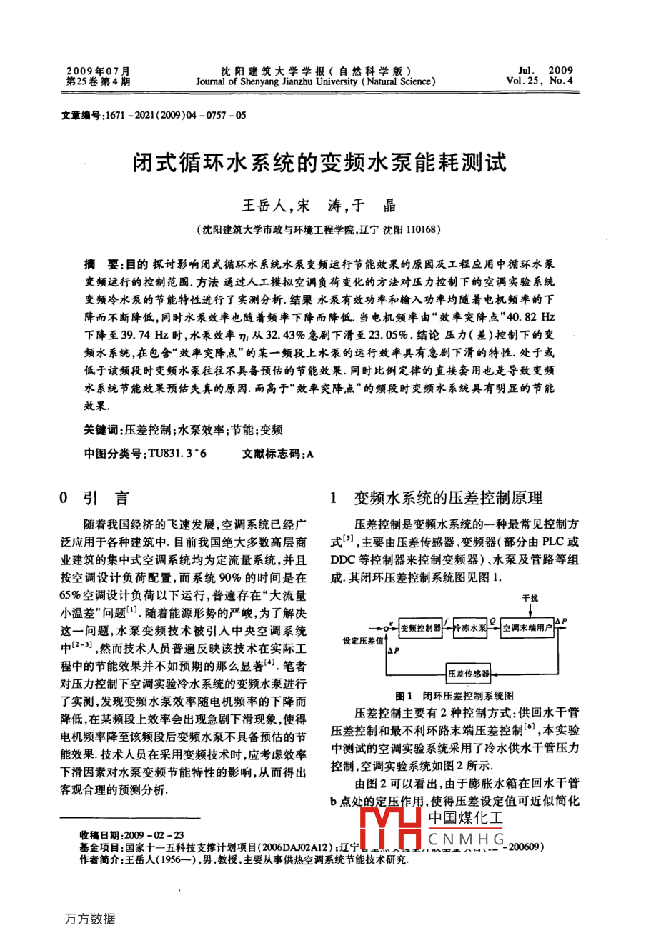 2009年07月沈陽建筑大學(xué)學(xué)報(自然科學(xué)版)Jul. 2009第25卷第4期Joumal of Shenyang Jianzhu University ( Natural Science)Vol.25, No. 4文章編號:1671 -2021(2009)04 -0757 -05閉式循環(huán)水系統(tǒng)的變頻水泵能耗測試王岳人,宋濤,于晶(沈陽建筑大學(xué)市政與環(huán)境工程學(xué)院,遼寧沈陽110168)摘要:目的 探討影響閉式循環(huán)水系統(tǒng)水泵變頻運行節(jié)能效果的原因及工程應(yīng)用中循環(huán)水泵變頻運行的控制范圍.方法通過人工模擬空調(diào)負(fù)荷變化的方法對壓力控制下的空調(diào)實驗系統(tǒng)變頻冷水泵的節(jié)能特性進(jìn)行了實測分析.結(jié)果水泵有效功率和輸入功率均隨著電機頻率的下降而不斷降低,同時水泵效率也隨著頻率下降而降低.當(dāng)電機頻率由“效率突降點"40.82 Hz下降至39.74 Hz時,水泵效率η,從32.43%急劇下滑至23.05%.結(jié)論壓力(差)控制下的變頻水系統(tǒng),在包含“效率突降點”的某一頻段上水泵的運行效率具有急劇下滑的特性.處于或低于該頻段時變頻水泵往往不具備預(yù)估的節(jié)能效果.同時比例定律的直接套用也是導(dǎo)致變頻水系統(tǒng)節(jié)能效果預(yù)估失真的原因.而高于“效率突降點”的頻段時變頻水系統(tǒng)具有明顯的節(jié)能效果.關(guān)鍵詞:壓差控制;水泵效率;節(jié)能;變頻中圖分類號:TU831.3*6文獻(xiàn)標(biāo)志碼:A0引言1變頻水系統(tǒng)的壓差控制原理隨著我國經(jīng)濟的飛速發(fā)展,空調(diào)系統(tǒng)已經(jīng)廣壓差控制是變頻水系統(tǒng)的-一種最常見控制方泛應(yīng)用于各種建筑中.目前我國絕大多數(shù)高層商式[1] ,主要由壓差傳感器、變頻器(部分由PLC或業(yè)建筑的集中式空調(diào)系統(tǒng)均為定流量系統(tǒng),并且DDC等控制器來控制變頻器)、水泵及管路等組按空調(diào)設(shè)計負(fù)荷配置,而系統(tǒng)90%的時間是在成.其閉環(huán)壓差控制系統(tǒng)圖見圖1.65%空調(diào)設(shè)計負(fù)荷以下運行,普遍存在“大流量干找小溫差"問題['.隨著能源形勢的嚴(yán)峻,為了解決↓這一問題,水泵變頻技術(shù)被引入中央空調(diào)系統(tǒng)--交頻控制器冷陳水第二一空調(diào)末端用戶個中1-3] ,然而技術(shù)人員普遍反映該技術(shù)在實際工設(shè)定壓差值f4sP程中的節(jié)能效果并不如預(yù)期的那么顯著(4].筆者壓差傳感器對壓力控制下空調(diào)實驗冷水系統(tǒng)的變頻水泵進(jìn)行圄1閉環(huán)壓差控制系統(tǒng)圖了實測,發(fā)現(xiàn)變頻水泵效率隨電機頻率的下降而降低,在某頻段上效率會出現(xiàn)急劇下滑現(xiàn)象,使得壓差控制主要有2種控制方式:供回水干管電機頻率降至該頻段后變頻水泵不具備預(yù)估的節(jié)壓差控制和最不利環(huán)路末端壓差控制(6] ,本實驗?zāi)苄Ч?技術(shù)人員在采用變頻技術(shù)時,應(yīng)考慮效率中測試的空調(diào)實驗系統(tǒng)采用了冷水供水干管壓力下滑因素對水泵變頻節(jié)能特性的影響,從而得出控制,空調(diào)實驗系統(tǒng)如圖2所示.由圖2可以看出,由于膨脹水箱在回水干管客觀合理的預(yù)測分析.b點處的定壓作用,使得壓差設(shè)定值可近似簡化中國煤化工基金項目:國家+一五科技支撐計劃項目(2006DAJ02A12);遼寧收稿日期:2009 -02 -23.MHCNMHG_- 20090作者簡介:王岳人(1956一),男,教授,主要從事供熱空調(diào)系統(tǒng)節(jié)能技術(shù)研究.758沈陽建筑大學(xué)學(xué)報(自然科學(xué)版)第25卷為供水千管恒壓點a處的壓力設(shè)定值,系統(tǒng)中的泵性能曲線1。(工頻)與管網(wǎng)特性曲線的交點壓差傳感器也相應(yīng)地可簡化為壓力傳感器,故而M6.隨著室內(nèi)負(fù)荷下降,部分空調(diào)末端機組停止此實驗系統(tǒng)中供水千管的壓力控制實際上即是供運行,管路系統(tǒng)中電動二通閥的開度相應(yīng)減小,系回水干管壓差控制.統(tǒng)阻力增加,管網(wǎng)特性曲線由S。變化至S.負(fù)荷變化過程中,水泵的運行工況點在干管壓力控制目脹水箱下沿等壓力線P=P。(等壓差線)由M。變化至M,水泵電機轉(zhuǎn)速由額定轉(zhuǎn)速no變化至n;,流量測點由Qo減小至Q.水泵有效功率與其流量關(guān)系(”壓力變送器為除幫C J99調(diào)N, =yQH=Q(Po-Pb),(1)冷水機組式中:N。為水泵有效功率,kW;r為水的重度,變頻器kg/m' 's;Q為水泵流量, m'/s;P為系統(tǒng)設(shè)計壓力,MPa;P,為系統(tǒng)定壓點b處的壓力,MPa.由式(1)可以看到,對于AP=(Po-P,)為常圖2空調(diào)實驗系統(tǒng)當(dāng)空調(diào)負(fù)荷變化時,由于相應(yīng)管路上控制閥數(shù)的定壓系統(tǒng),水泵的有效功率是與水泵流量成門開度的自動變化而引起供回水干管上壓差變化正比的.當(dāng)空調(diào)系統(tǒng)流量減小時水泵輸人功率也(供水壓力的變化) ,壓力傳感器采樣后將這一-變隨之相應(yīng)減小,從而達(dá)到水泵節(jié)能的目的.根據(jù)冷化傳送給變頻控制器,變頻控制器與預(yù)設(shè)的供水凍水泵的額定揚程,筆者將水泵的供水壓力P。設(shè)壓力值進(jìn)行比較后,產(chǎn)生輸出信號調(diào)節(jié)水泵電機為0.3MPa,水泵實際運行工況如圖4所示.從圖的運行頻率和轉(zhuǎn)速,從而實現(xiàn)改變水泵的流量來中可以看出,整個實驗過程中水泵揚程基本穩(wěn)定在定值H=27 m處.適應(yīng)空調(diào)的負(fù)荷變化.2壓力控制下變頻水泵的節(jié)能分析,-++"+2s