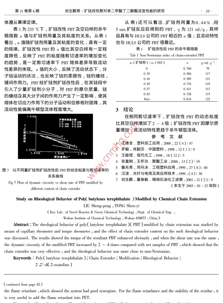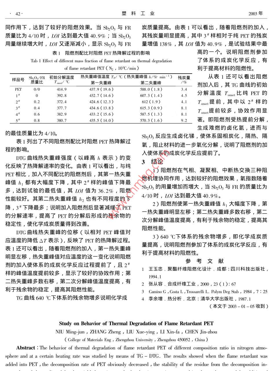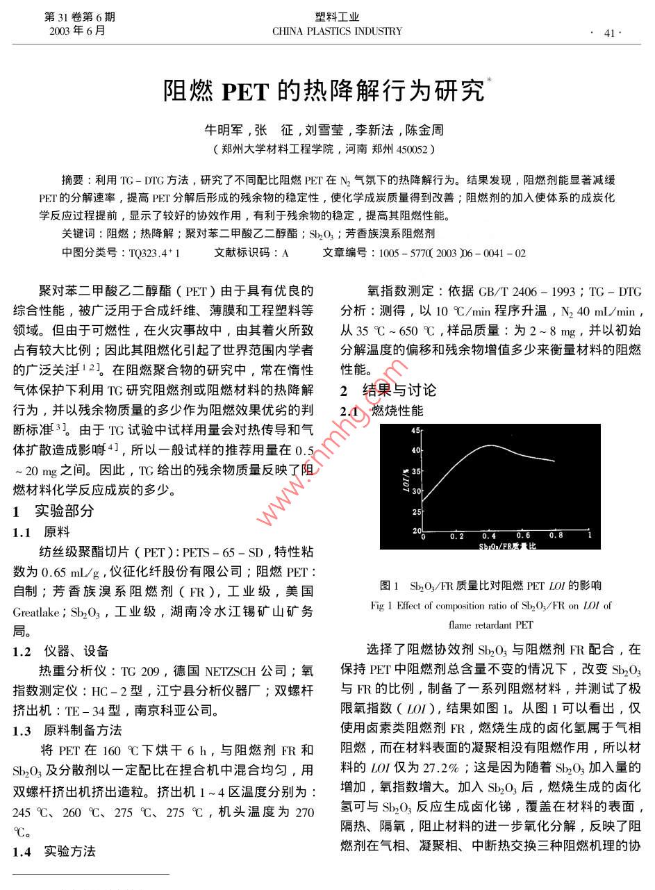 第31卷第6期塑料工業(yè)2003年6月CHINA PLASTICS INDUSTRY阻燃PET的熱降解行為研究牛明軍,張征,劉雪瑩,李新法,陳金周鄭州大學(xué)材料工程學(xué)院,河南鄭州450052)摘要∶利用τG-rG方法,研究了不同配比阻燃P在№2氣氛下的熱降解行為。結(jié)果發(fā)現(xiàn),阻燃劑能顯著減緩PET的分解速率,提高PET分解后形成的殘余物的穩(wěn)定性,使化學(xué)成炭質(zhì)量得到改善;阻燃劑的加入使體系的成炭化學(xué)反應(yīng)過程提前,顯示了較好的協(xié)效作用,有利于殘余物的穩(wěn)定,提高其阻燃性能。關(guān)鍵詞∶阻燃冫熱降解;聚對(duì)苯二甲酸乙二醇酯冫SO3;芳香族溴系阻燃劑中圖分類號(hào):T0323.4+1文獻(xiàn)標(biāo)識(shí)碼:A文章編號(hào):1005-577(2003)6-0041-02聚對(duì)苯二甲酸乙二醇酯(PET)由于具有優(yōu)良的氧指數(shù)測(cè)定:依據(jù)GBT2406-1993;TG-DI綜合性能,被廣泛用于合成纖維、薄膜和工程塑料等分析:測(cè)得,以10℃/min程序升溫,N’40m/min,領(lǐng)域。但由于可燃性,在火災(zāi)事故中,由其著火所致從35℃~650℃,樣品質(zhì)量:為2~8mg,并以初始占有較大比例;因此其阻燃化引起了世界范圍內(nèi)學(xué)者分解溫度的偏移和殘余物增值多少來(lái)衡量材料的阻燃的廣泛關(guān)注12J。在阻燃聚合物的研究中,常在惰性性能。氣體保護(hù)下利用TG研究阻燃劑或阻燃材料的熱降解2結(jié)果與討論行為,并以殘余物質(zhì)量的多少作為阻燃效果優(yōu)劣的判2,1燃燒性能斷標(biāo)準(zhǔn)3。由于TG試驗(yàn)中試樣用量會(huì)對(duì)熱傳導(dǎo)和氣體擴(kuò)散造成影呵4],所以一般試樣的推薦用量在0.5~20mg之間。因此,TG給出的殘余物質(zhì)量反映了阻燃材料化學(xué)反應(yīng)成炭的多少實(shí)驗(yàn)部分11原料紡絲級(jí)聚酯切片(PET):PEIN-65-SD,特性粘數(shù)為0.65mL/g,儀征化纖股份有限公司:阻燃PET自制;芳香族溴系阻燃劑(FR),工業(yè)級(jí),美國(guó)圖1Sb2O3/FR質(zhì)量比對(duì)阻燃 PET LO的影響Greatlake;SbO3,工業(yè)級(jí),湖南冷水江錫礦山礦務(wù)Fig 1 Effect of composition ratio of Sb O,/FR on LOl of局flame retardant PET1.2儀器、設(shè)備選擇了阻燃協(xié)效劑Sh2O3與阻燃劑FR配合,在熱重分析儀:TG209,德國(guó) NETZSCH公司;氧保持PT中阻燃劑總含量不變的情況下,改變S2O3指數(shù)測(cè)定儀:HC-2型,江寧縣分析儀器廠;雙螺桿與H的比例,制備了一系列阻燃材料,并測(cè)試了極擠出機(jī):T-34型,南京科亞公司限氧指數(shù)(DO),結(jié)果如圖1。從圖1可以看出,僅13原料制備方法使用鹵素類阻燃劑FR,燃燒生成的鹵化氫屬于氣相將PE在160℃下烘干6h,與阻燃劑FR和阻燃,而在材料表面的凝聚相沒有阻燃作用,所以材Sh2O3及分散劑以一定配比在捏合機(jī)中混合均勻,用料的O僅為27.2%;這是因?yàn)殡S著Sh2O3加入量的雙螺桿擠岀機(jī)擠岀造粒。擠岀機(jī)1~4區(qū)溫度分別為增加,氧指數(shù)增大。加入S2O3后,燃燒生成的鹵化245℃、260℃、275℃、275℃,機(jī)頭溫度為270氫可與S2O3反應(yīng)生成鹵化銻,覆蓋在材料的表面,隔熱、隔氧,阻止材料的進(jìn)一步氧化分解,反映了阻1.4實(shí)驗(yàn)方法燃劑在氣相、凝聚相、中斷熱交換三種阻燃機(jī)理的協(xié)塑料工業(yè)2003年同作用下,達(dá)到了較好的阻燃效果。當(dāng)Sh2O3與FR炭質(zhì)量提高。由表1可以看出,隨著阻燃劑的加入,質(zhì)量比為4/10時(shí),JO達(dá)到最大值40.9%;當(dāng)Sh2O3其殘?zhí)苛棵黠@提高,其中3樣相對(duì)于純PE的殘?zhí)坑昧坷^續(xù)增大時(shí),LOⅠ又逐漸減小,顯示SbO3與F量增值138%,其LO/值為40.9%,是試驗(yàn)結(jié)果中最表1阻燃劑配比對(duì)阻燃PET熱降解過程的影響高的一個(gè)。說(shuō)明阻燃劑參加Tab 1 Effect of different mass fraction of flame retardant on thermal degradation了體系的成炭化學(xué)反應(yīng),有of flame retardant PET( N,, 10%C/min利于提高材料的阻燃性。樣品號(hào)S2O/H初始分解溫度熱失重峰值溫度Ty/℃(熱失重峰值h/%min-)殘?zhí)苛繌谋?還可以看出阻燃第一失重峰第二失重峰劑加入后,其TG曲線的初始414.9432.7(14.6)607.3(1.4)分解溫度T比純PET的424.6(12.3)612(1.9)4.1T提前,其中以2#樣的382.9433.2(15.6)587.5(1.3)T灬提前較多,協(xié)效作用顯380.7435.5(14.0)570.3(1.6)9.2著。即阻燃劑受熱提前分解,生成難燃的鹵化氫,進(jìn)而與的最佳質(zhì)量比為4/10。表1列出了不同阻燃劑配比對(duì)阻燃PE熱降解過S2O3反應(yīng)生成鹵化銻,使體系固相炭化,隔熱、隔氧,阻止材料的進(jìn)一步氧化分解,說(shuō)明了阻燃劑的加入使體系的成炭化學(xué)反應(yīng)提前了。DG曲線熱失重峰強(qiáng)度(以峰高h(yuǎn)表示)的變3結(jié)論P(yáng)ET相比,加入不同配比的阻燃劑后,其第一熱失重1)阻燃劑在氣相、凝聚相、中斷熱交換三種阻峰值h1都有大幅度下降,其中2“樣的峰值下降最燃機(jī)理協(xié)同作用,達(dá)到較好的阻燃效果,氧指數(shù)隨著多,達(dá)到試驗(yàn)的最低值,其LO/值為36.2%,阻燃b2O3的用量增加而增大,當(dāng)Sh2O3與HR的質(zhì)量比為性能較好。其第二熱失重峰值h2也有不同程度的下4/10時(shí),LO達(dá)到最大值40.9%。降,3*下降最多;說(shuō)明加入阻燃劑后顯著減緩了PET2)阻燃劑使第一熱失重峰值h大幅度下降,第的分解速率,提高了PET的分解后形成的殘余物的穩(wěn)定性,使化學(xué)成炭質(zhì)量得到改善。的次分解峰值溫度提高,有利于殘余物的穩(wěn)定,提高其DG曲線