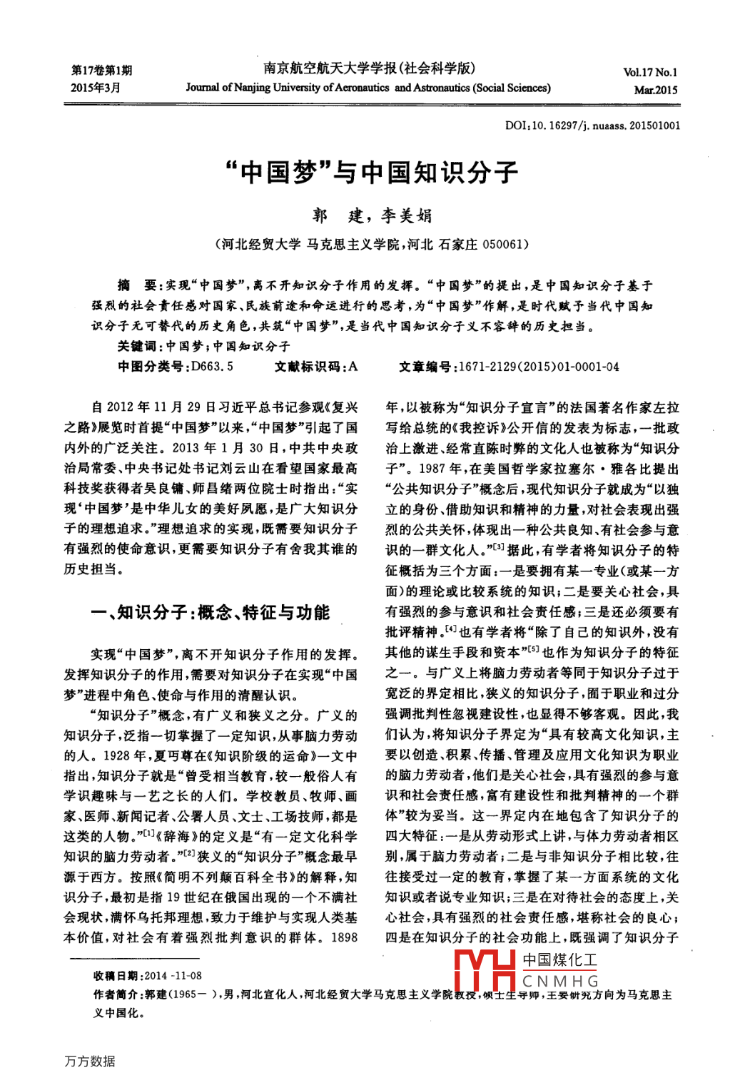 第17卷第1期南京航空航天大學(xué)學(xué)報(bào)(社會(huì)科學(xué)版)Vol 17 No, 12015年3月Journal of Nanjing University of Aeronautics and Astronautics(Social Sciences)Mar 2015DOI:10.16297/j. maass.201501001“中國(guó)夢(mèng)”與中國(guó)知識(shí)分子郭建,李美娟(河北經(jīng)貿(mào)大學(xué)馬克思主義學(xué)院,河北石家莊050061)摘要:實(shí)現(xiàn)“中國(guó)夢(mèng)”,離不開(kāi)知識(shí)分子作用的發(fā)揮?!爸袊?guó)夢(mèng)”的提出,是中國(guó)知識(shí)分子基于強(qiáng)烈的社會(huì)責(zé)任感對(duì)國(guó)家、民族前途和命運(yùn)進(jìn)行的思考,為“中國(guó)夢(mèng)”作解,是時(shí)代賦予當(dāng)代中國(guó)知識(shí)分子無(wú)可替代的歷史角色,共筑“中國(guó)夢(mèng)”,是當(dāng)代中國(guó)知識(shí)分子義不容辭的歷史擔(dān)當(dāng)。關(guān)鍵詞:中國(guó)夢(mèng);中國(guó)知識(shí)分子中圖分類(lèi)號(hào):D663.5文獻(xiàn)標(biāo)識(shí)碼:A文章編號(hào):1671-2129(2015)01-0001-04自2012年11月29日習(xí)近平總書(shū)記參觀《復(fù)興年,以被稱(chēng)為“知識(shí)分子宜言”的法國(guó)著名作家左拉之路》展覽時(shí)首提“中國(guó)夢(mèng)”以來(lái),“中國(guó)夢(mèng)”引起了國(guó)寫(xiě)給總統(tǒng)的《我控訴》公開(kāi)信的發(fā)表為標(biāo)志,一批政內(nèi)外的廣泛關(guān)注。2013年1月30日,中共中央政治上激進(jìn)、經(jīng)常直陳時(shí)弊的文化人也被稱(chēng)為知識(shí)分治局常委、中央書(shū)記處書(shū)記劉云山在看望國(guó)家最高子”。1987年,在美國(guó)哲學(xué)家拉塞爾·雅各比提出科技獎(jiǎng)獲得者吳良鏞、師昌緒兩位院士時(shí)指出:“實(shí)“公共知識(shí)分子”概念后,現(xiàn)代知識(shí)分子就成為“以獨(dú)現(xiàn)中國(guó)夢(mèng)是中華兒女的美好夙愿,是廣大知識(shí)分立的身份、借助知識(shí)和精神的力量,對(duì)社會(huì)表現(xiàn)出強(qiáng)子的理想追求?!崩硐胱非蟮膶?shí)現(xiàn),既需要知識(shí)分子烈的公共關(guān)懷,體現(xiàn)出一種公共良知、有社會(huì)參與意有強(qiáng)烈的使命意識(shí)更需要知識(shí)分子有舍我其誰(shuí)的識(shí)的一群文化人。叫據(jù)此,有學(xué)者將知識(shí)分子的特歷史擔(dān)當(dāng)。征概括為三個(gè)方面:一是要擁有某一專(zhuān)業(yè)(或某一方面)的理論或比較系統(tǒng)的知識(shí);二是要關(guān)心社會(huì),具、知識(shí)分子:概念、特征與功能有強(qiáng)烈的參與意識(shí)和社會(huì)責(zé)任感;三是還必須要有批評(píng)精神。也有學(xué)者將“除了自己的知識(shí)外,沒(méi)有實(shí)現(xiàn)“中國(guó)夢(mèng)”,離不開(kāi)知識(shí)分子作用的發(fā)揮。其他的謀生手段和資本”5也作為知識(shí)分子的特征發(fā)揮知識(shí)分子的作用,需要對(duì)知識(shí)分子在實(shí)現(xiàn)“中國(guó)之一。與廣義上將腦力勞動(dòng)者等同于知識(shí)分子過(guò)于夢(mèng)”進(jìn)程中角色、使命與作用的清醒認(rèn)識(shí)寬泛的界定相比,狹義的知識(shí)分子,囿于職業(yè)和過(guò)分知識(shí)分子”概念,有廣義和狹義之分。廣義的強(qiáng)調(diào)批判性忽視建設(shè)性,也顯得不夠客觀。因此,我知識(shí)分子,泛指一切掌握了一定知識(shí),從事腦力勞動(dòng)們認(rèn)為,將知識(shí)分子界定為“具有較高文化知識(shí),主的人。1928年,夏丐尊在《知識(shí)階級(jí)的運(yùn)命》一文中要以創(chuàng)造、積累、傳播、管理及應(yīng)用文化知識(shí)為職業(yè)指出,知識(shí)分子就是“曾受相當(dāng)教育較一般俗人有的腦力勞動(dòng)者,他們是關(guān)心社會(huì),具有強(qiáng)烈的參與意學(xué)識(shí)趣味與一藝之長(zhǎng)的人們。學(xué)校教員、牧師、畫(huà)識(shí)和社會(huì)責(zé)任感,富有建設(shè)性和批判精神的一個(gè)群家、醫(yī)師新聞?dòng)浾?、公署人員、文士、工場(chǎng)技師,都是體”較為妥當(dāng)。這一界定內(nèi)在地包含了知識(shí)分子的這類(lèi)的人物?!掇o海》的定義是“有一定文化科學(xué)四大特征:一是從勞動(dòng)形式上講,與體力勞動(dòng)者相區(qū)知識(shí)的腦力勞動(dòng)者?!?狹義的“知識(shí)分子”概念最早別屬于腦力勞動(dòng)者;二是與非知識(shí)分子相比較,往源于西方。按照《簡(jiǎn)明不列顛百科全書(shū)》的解釋,知往接受過(guò)一定的教育,掌握了某一方面系統(tǒng)的文化識(shí)分子,最初是指19世紀(jì)在俄國(guó)出現(xiàn)的一個(gè)不滿(mǎn)社知識(shí)或者說(shuō)專(zhuān)業(yè)知識(shí);三是在對(duì)待社會(huì)的態(tài)度上,關(guān)會(huì)現(xiàn)狀,滿(mǎn)懷烏托邦理想,致力于維護(hù)與實(shí)現(xiàn)人類(lèi)基心社會(huì),具有強(qiáng)烈的社會(huì)責(zé)任感,堪稱(chēng)社會(huì)的良心;本價(jià)值,對(duì)社會(huì)有著強(qiáng)烈批判意識(shí)的群體。1898四是在知識(shí)分子的社會(huì)功能上,既強(qiáng)調(diào)了知識(shí)分子中國(guó)煤化工收稿日期:2014-11-08CNMHG作者簡(jiǎn)介:郭建(1965-),男,河北宣化人,河北經(jīng)貿(mào)大學(xué)馬克思主義學(xué)院教孜,唄士生導(dǎo)卿,王要魷死方向?yàn)轳R克思主義中國(guó)化。南京航空航天大學(xué)學(xué)報(bào)(社會(huì)科學(xué)版)第17卷要具有批判精神,又突出了
