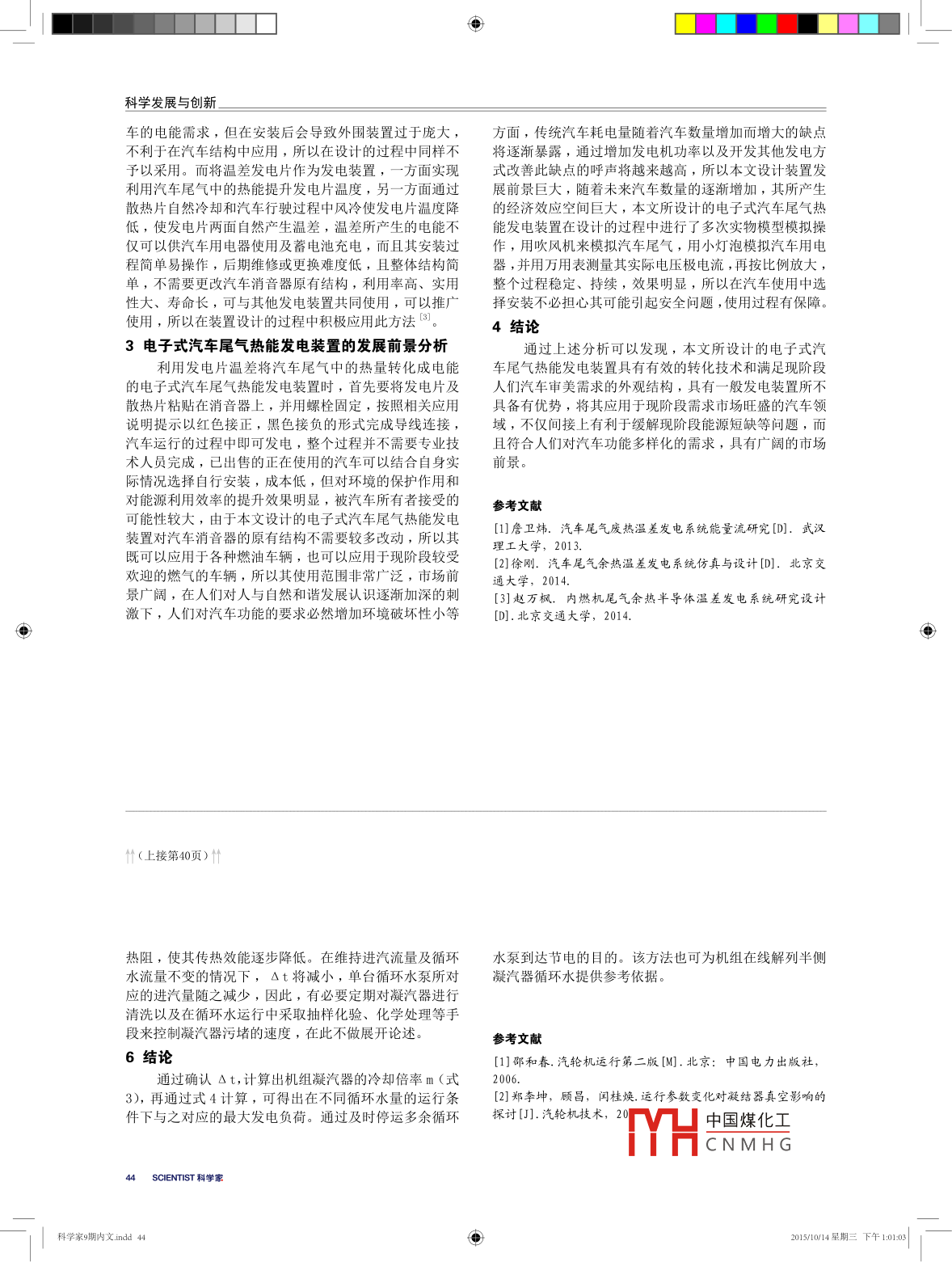 科學(xué)發(fā)展與創(chuàng)新25MW汽輪機(jī)組凝汽器循環(huán)水泵的合理啟停秦洋,陳波,楊運(yùn)輝寧波鋼鐵有限公司能源環(huán)保部,浙江寧波315807摘要本文通過理論計(jì)算并結(jié)合現(xiàn)場實(shí)際情況, 得出了一臺循環(huán)水泵運(yùn)行時對應(yīng)的最佳發(fā)電負(fù)荷??梢允刮磁鋫渥冾l調(diào)節(jié)的循環(huán)水泵,在發(fā)電負(fù)荷降低到一定值時,通過停運(yùn)多余的循環(huán)水泵,在不影響機(jī)組安全運(yùn)行的前提下,達(dá)到降低附屬設(shè)備電耗的目的。關(guān)鍵詞25MW 汽輪機(jī)組;凝汽器;循環(huán)水泵中圖分類號TM文獻(xiàn)標(biāo)識碼A文章編號2095-6363 (2015) 09-0040-01寧波鋼鐵有限公司焦化廠CDQ余熱鍋爐配有一臺.循環(huán)水比熱,kJ/ (kg . C);一般情況下,汽輪機(jī)排25MW抽凝式汽輪發(fā)電機(jī)組(型號為C25-8.83/0.98),汽干度X為90%~ 95%,則X(h,_-hi )=2140 ~ 2220kJ/該汽輪發(fā)電機(jī)組于2010年3月投產(chǎn),在投產(chǎn)初期為純kg, 取中間值2180kJ/kg;循環(huán)水比熱c=4. 187kJ/冷凝工況運(yùn)行,該機(jī)組配有3臺(2用1備或1用2備)(kg.C),則有:功率為280KW的循環(huán)水泵(額定流量2020m/h,最大流2180q. =4.187q.. ,Ar或N(2)4.1879m量為2340m/h),在實(shí)際運(yùn)行中,流量計(jì)顯示單臺循環(huán)水泵流量為2400m*/h左右,兩臺泵運(yùn)行流量為4000m/h令9m=mm就是循環(huán)水量與排汽量的比值,稱為左右。冷卻倍率。它表示冷凝器每凝結(jié)1kg蒸汽所需要的循環(huán)1現(xiàn)狀及問題水量,所以有:由于該汽輪發(fā)電機(jī)組所配備的鍋爐為干熄焦余熱Ot≈:(3)鍋爐,余熱鍋爐負(fù)荷的不穩(wěn)定導(dǎo)致了發(fā)電負(fù)荷的不穩(wěn)3單臺循環(huán)水泵對應(yīng)發(fā)電負(fù)荷的確定6定。該機(jī)組投產(chǎn)初期規(guī)定發(fā)電負(fù)荷10MW 以上,保持兩在多流程的凝汽器中,中、小機(jī)組可取臺循環(huán)水泵運(yùn)行,10MW以下保持一臺循環(huán)水泵運(yùn)行,Ot=7.5~12°C,大機(jī)組可取△t=5~6°C。本機(jī)組凝汽以10MW為界線只是投產(chǎn)初期為保證機(jī)組安全運(yùn)行而定,器為二流道四流程,額定真空值為9kpa (a), 運(yùn)行并無過多理論和實(shí)踐依據(jù),而循環(huán)水泵是汽輪發(fā)電機(jī)組中Ot=11'C時,不會對機(jī)組真空造成影響,故取值功率最大的附屬設(shè)備,所以合理的啟、停循環(huán)泵可以給△t=11C,則該機(jī)組凝汽器冷卻倍率為:機(jī)組節(jié)能降耗方面帶來-定的經(jīng)濟(jì)效益。2凝汽器的熱力特性分析m=L = 47.3凝汽:器循環(huán)水量的多少將直接影響機(jī)組經(jīng)濟(jì)、安單臺循環(huán)水泵運(yùn)行最大流量為2400m3/h,其對應(yīng)全運(yùn)行。循環(huán)水量qmw與循環(huán)水溫升Ot (冷凝器循環(huán)排汽量為:水進(jìn)、出口溫差)有著密切的關(guān)系:循環(huán)水量過少會使9m=m= 472400= 50.7(4得循環(huán)水溫升提高從而使得排汽溫度升高,直接影響凝汽器真空,導(dǎo)致真空下降,從而使機(jī)組效率降低;而真純冷凝工況下,該機(jī)組50.7t的進(jìn)汽流量對應(yīng)的空進(jìn)一步惡化還會使機(jī)組被迫停機(jī);而水量過多則使得發(fā)電負(fù)荷為14MW左右,即單臺循環(huán)水泵運(yùn)行的情況下循環(huán)水溫升過低,浪費(fèi)循環(huán)水泵耗電量。電廠凝汽器一可維持14MW發(fā)電負(fù)荷。般運(yùn)行經(jīng)驗(yàn)表明,凝汽器真空下降1kPa,機(jī)組的熱耗將4實(shí)際應(yīng)用增加1.5%~2. 5%。因此,控制凝汽器循環(huán)水量必須在不通過理論計(jì)算,我們將以往以10MW為界啟、停一影響凝汽器真空的前提下進(jìn)行。汽輪機(jī)的排汽在凝汽器中放出的熱量,由循環(huán)水臺循環(huán)水泵的規(guī)定提高到以14MW為界,僅從2010年11全部吸收。在凝汽中排汽放出的總熱量應(yīng)等于循環(huán)水所月份來看,該機(jī)組發(fā)電負(fù)荷在10MIW~14MW 之間的運(yùn)行時間為440h左右,在此期間運(yùn)行一臺循環(huán)水泵,機(jī)組真吸收的熱量,其熱平衡方程式為:空值及汽耗均正常。按一臺循環(huán)水泵正常負(fù)荷250KW計(jì)Xqmm(n, - hin)= 9mm.Stc(1)算, 當(dāng)月節(jié)約用電約11萬度。式中:X-排汽干度,%;qm-凝汽器排汽量,kg/h ;5凝汽器換熱效能降低的影響h.-排汽焓,kJ/kg;hi。- 凝結(jié)水焓,kJ/kg; 0t-凝隨著機(jī)組運(yùn)行時間的增加,凝汽器管壁內(nèi)不可避汽器循環(huán)水進(jìn)、出口溫差,C;q.-循環(huán)水量,kg/h;c-免會附著鹽垢、污泥及微生物,因此將大幅增加凝汽器中國煤化工頁)↓↓YHCNMH GSCIENTIST 科學(xué)家科學(xué)家9期內(nèi)文:indd 40由2015/1014星期三 下午10102 |科學(xué)發(fā)展與創(chuàng)新車的電能需求,但在安裝后會導(dǎo)致外圍裝置過于龐大,方面,傳統(tǒng)汽車耗電量隨著汽車數(shù)量增加而增大的缺點(diǎn)不利于在汽車結(jié)構(gòu)中應(yīng)用,所以在設(shè)計(jì)的過程中同樣不將逐漸暴露,通過增加發(fā)電機(jī)功率以及開發(fā)其他發(fā)電方予以采用。而將溫差發(fā)電片作為發(fā)電裝置,一方面實(shí)現(xiàn)式改善此缺點(diǎn)的呼聲將越來越高,所以本文設(shè)計(jì)裝置發(fā)利用汽車尾氣中的熱能提升發(fā)電片溫度,另一方面通過展前景巨大,隨著未來汽車數(shù)量的逐漸增加,其所產(chǎn)生散熱片自然冷卻和汽車行駛過程中風(fēng)冷使發(fā)電片溫度降的經(jīng)濟(jì) 效