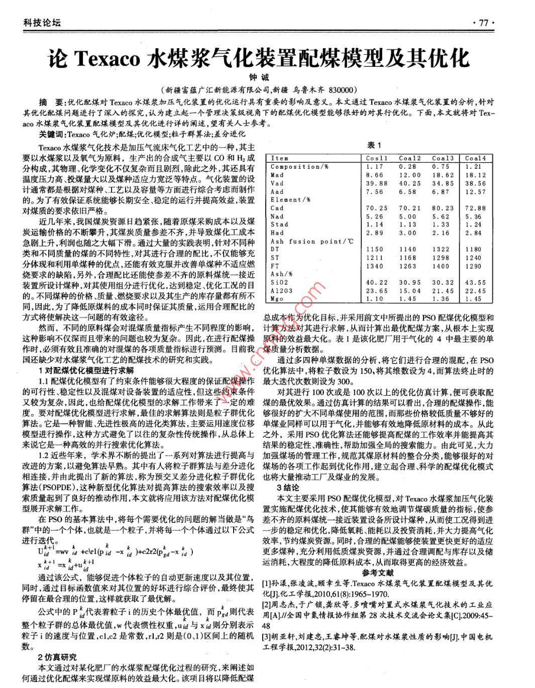 科技論壇論 Texaco水煤漿氣化裝置配煤模型及其優(yōu)化鐘誠(新疆富蘊(yùn)廣匯新能源有限公司,新疆烏魯木齊830000摘要:優(yōu)化配煤對(duì) Texaco水煤漿加壓氣化裝置的優(yōu)化運(yùn)行具有重要的影響及意義。本文通過 Texaco水煤漿氣化裝置的分析,針對(duì)其優(yōu)化配煤?jiǎn)栴}進(jìn)行了深入的探究,認(rèn)為建立起一個(gè)管理決策綴視角下的配煤優(yōu)化模型能夠很好的對(duì)其行優(yōu)化。下面,本文就將對(duì)Tex-aco水煤漿氣化裝置配煤模型及其優(yōu)化進(jìn)行詳?shù)年U述,望有關(guān)人士參考。關(guān)鍵詞: Texaco氣化爐配煤;優(yōu)化模型;粒子群算法;差分進(jìn)化Texaco水煤漿氣化技術(shù)是加壓氣流床氣化工藝中的一種,其主表要以水煤漿以及氧氣為原料,生產(chǎn)出的合成氣主要以CO和H2成[IteCosl1 Coal2 Coal Coal4分構(gòu)成其物理化學(xué)變化不僅復(fù)雜而且劇烈除此之外其還具有C。 mposition/溫度壓力高投煤量大以及煤種適應(yīng)力寬泛等特點(diǎn)。氣化裝置的設(shè)Mad8,6612.0018,6218.12計(jì)通常都是根據(jù)對(duì)煤種、工藝以及容量等方面進(jìn)行綜合考慮而制作|Aad39.8840.2534.8538.567.566.586.8712.57的。為了有效保證系統(tǒng)能夠長期安全穩(wěn)定的運(yùn)行并提高效益裝置| Element/%對(duì)煤質(zhì)的要求依舊嚴(yán)格70.2570.2180.2372.88Nad近幾年來我國煤炭資源日趨緊張隨著原煤采購成本以及煤|stad5.265.005.625.361.33炭運(yùn)輸價(jià)格的不斷攀升其煤炭質(zhì)量參差不齊,并導(dǎo)致煤化工成本|Had急劇上升利潤也隨之大幅下滑。通過大量的實(shí)踐表明針對(duì)不同種 Ash fusion point//2.8s2.893.002.162.84類和不同質(zhì)量的煤的不同特性,對(duì)其進(jìn)行合理的配比,不僅能夠充1150114013221180ST121111681298分體現(xiàn)和利用單煤種的優(yōu)點(diǎn)還能有效克服并改善單煤種不適應(yīng)燃|F126314001290燒要求的缺陷,另外合理配比還能使參差不齊的原料煤統(tǒng)一接近|Ash/裝置所設(shè)計(jì)煤種,對(duì)其使用組分進(jìn)行優(yōu)化達(dá)到穩(wěn)定優(yōu)化工況的目510240.2230.9530.3243.55的。不同煤種的價(jià)格質(zhì)量燃燒要求以及其生產(chǎn)的庫存量都有所不420323.6515.0421.4522.41.101.451.36同,因此,為了降低原煤料的成本同時(shí)保證其質(zhì)量,運(yùn)用合理配比的方式將使解決這一問題的有效途徑總成本作為優(yōu)化目標(biāo),并采用前文中所提出的PSO配煤優(yōu)化模型和然而,不同的原料煤會(huì)對(duì)混煤質(zhì)量指標(biāo)產(chǎn)生不同程度的影響,計(jì)算方法對(duì)其進(jìn)行求解,從而計(jì)算出最優(yōu)配煤方案,從根本上實(shí)現(xiàn)這種影響不僅深而且?guī)淼膯栴}也較為復(fù)雜。因此,在進(jìn)行配煤操原料的效益最大化。表1是該化肥廠用于氣化的4中最主要的單作時(shí),必須有效且準(zhǔn)確的對(duì)混煤的各項(xiàng)質(zhì)量指標(biāo)進(jìn)行預(yù)測(cè)。目前我煤質(zhì)量分析數(shù)據(jù)國還缺少對(duì)水煤漿氣化工藝的配煤技術(shù)的研究和實(shí)踐。通過多四種單煤數(shù)據(jù)的分析,將它們進(jìn)行合理的混配,在PO1對(duì)配煤優(yōu)化模型進(jìn)行求解優(yōu)化算法中,將粒子數(shù)設(shè)為150,將其維數(shù)設(shè)為4,而算法終止時(shí)的1.1配煤優(yōu)化模型有了約束條件能夠很大程度的保證配煤操作最大迭代次數(shù)則設(shè)為300。的可行性穩(wěn)定性以及混煤對(duì)設(shè)備裝置的適應(yīng)性,但這些約束條件對(duì)其進(jìn)行100次或是100次以上的優(yōu)化仿真計(jì)算,便可獲取配又較為復(fù)雜,因此,也給配煤優(yōu)化模型的求解工作帶來了一定的難煤的最優(yōu)效果。通過仿真計(jì)算的結(jié)果可以看出,合理的配煤操作,能度。要對(duì)配煤優(yōu)化模型進(jìn)行求解,最佳的求解算法則是粒子群優(yōu)化夠很好的擴(kuò)大不同單煤使用的范圍,而那些價(jià)格較低質(zhì)量不夠好的算法。它是一種智能先進(jìn)性極高的進(jìn)化類算法,主要運(yùn)用速度位移單煤業(yè)同樣可以用于氣化,并能夠有效地降低原材料的成本。從此模型進(jìn)行操作,這種方式避免了以往的復(fù)雜性傳統(tǒng)操作,從總體上之外,采用PSO優(yōu)化算法還能夠提高配煤的工作效率并能提高其來說它是一種高效的并行搜索優(yōu)化算法結(jié)果的穩(wěn)定性、準(zhǔn)確性,幫助加強(qiáng)全局的搜索能力。由此可見,大力1.2近些年來,學(xué)術(shù)界不斷的提出了一系列對(duì)算法進(jìn)行提高與加強(qiáng)煤場(chǎng)的管理工作,規(guī)范其煤原材料的整合分類能夠很好的對(duì)改進(jìn)的方案,以避免算法早熟。其中有人將粒子群算法與差分進(jìn)化煤場(chǎng)的各項(xiàng)工作起到優(yōu)化作用,建立起合理、科學(xué)的配煤優(yōu)化模式相連接,并由此提出了新的算法,稱為預(yù)交叉差分進(jìn)化粒子群優(yōu)化也將大量推動(dòng)工廠及煤業(yè)的發(fā)展算法( PSOPDE),這種新型優(yōu)化算法對(duì)提高算法的搜索效率以及搜3結(jié)論索質(zhì)量起到了良好的推動(dòng)作用,本文就將應(yīng)用該方法對(duì)配煤優(yōu)化模本文主要采用PSO配煤優(yōu)化模型,對(duì) Texaco水煤漿加壓氣化裝型展開求解工作。置實(shí)施配煤優(yōu)化技術(shù),使其能夠有效地調(diào)節(jié)煤
