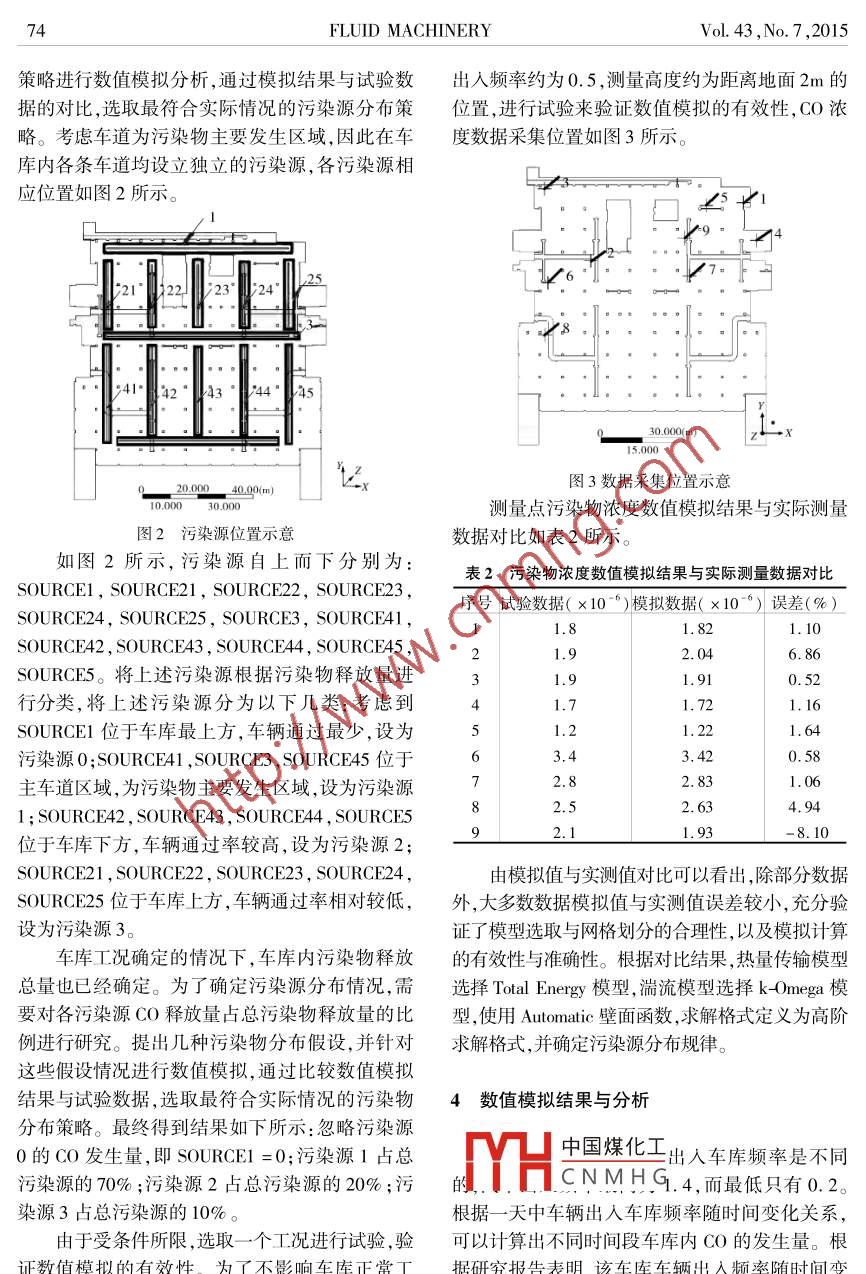 72FLUID MACHINERYVol. 43 ,No. 7 ,2015文章編號: 1005 -0329(2015)07 -0072 -05地下空間通風系統(tǒng)的優(yōu)化高超,陳梅珊,吳偉亮(_ 上海交通大學,上海200240)摘要:由于車輛出人車庫的頻率時刻都在變化,車庫內單位時間污染物釋放量相應發(fā)生變化,針對不同工況采取相同的通風量顯然是不合理的。過低的通風量將導致車庫內空氣品質不佳,過高的通風量將導致能源的浪費。本文以某車庫為研究對象,進行數(shù)值模擬分析,探索通風系統(tǒng)的優(yōu)化控制策略。關鍵詞:空氣污染;CFD模擬;C0濃度場;地下空間;中圖分類號: TH43;X511文獻標志碼: Adoi:10. 3969/j. issn. 1005 -0329.2015.07.015Optimization of Air Flow Field in the Underground GarageGAO Chao , CHEN Mei- shan , WU WeiHiang( Shanghai Jiaotong University ,Shanghai 200240 ,China)Abstract: Because the frequency that cars enter the garage is changing,so it is unreasonable that applying the same ventilationquantity to different situations. Low ventilation quantity will cause bad air quality , however high ventilation quantity will causewaste of energy. Based on a real underground garage , discussing the optimization of flow field by simulation.Key words: air pollution; underground garage ;CO concentration field; CFD simulation1前言據(jù)研究表明:如果CO濃度指標達到要求,那么其他污染物濃度也一定會滿足要求[3.41。所以在地為解決汽車保有量上升帶來的停車緊張問下停車庫通風量的計算與控制中,通常以C0濃題,大型商業(yè)建筑和居住小區(qū)等人口密集區(qū)都配度 為依據(jù),因此本文將主要考察尾氣中的CO。有地下車庫,-般采用定風量運行的機械通風系根據(jù)相關文獻[5],由于本車庫位于人口密統(tǒng)來保證空氣品質。由于汽車出人車庫的數(shù)量是集區(qū),需要考慮機械通風系統(tǒng)排出的污染物對周時刻變化的,車庫內單位時間污染物發(fā)生量也是圍環(huán)境的影響,本文CO污染物限值取為25x不斷變化的,定風量運行的機械通風系統(tǒng)將造成10-°。 地下車庫污染源物放量的計算采用經(jīng)驗公能源的浪費11。式法:本文針對某地下車庫,利用數(shù)值模擬的方法G = mrqt對不同時段地下車庫的污染物濃度場進行研究,式中G一地下空間CO總排放量,mg/s從而為通風系統(tǒng)的優(yōu)化控制提供參考意見。m-地下停車場的車位數(shù),輛r- - 汽車出人車庫頻率(1h內進出車輛2研究對象描述數(shù)與停車位之比)中國煤化工付間內C0排放量,mg/s2.1污染物濃度限值和釋放量的確定1HCN MH G車場平均運行時間,s地下車庫內汽車排放的污染物中主要含有一結合本文研究對象,停車庫容納車位數(shù)為氧化碳、碳氫化合物、氮氧化合物等有害物質(21。100 ;地下車庫內空氣污染物的排放情況是在不同收稿日期: 2014-12-23 修稿日期: 2015-01 -09基金項目: 863 基金項目(2012AA062703)2015年第43卷第7期流體機械73的時段內不斷變化的,汽車出入車庫頻率峰值為換 ,圍護結構絕熱;1.4,平時為0.261 ;假定每輛車在車庫內平均運(4)室內除汽車排放的廢氣外,無其它熱源。行時間為90s;每輛汽車單位時間內CO排放量為由于汽車在車庫內的運行主要出于怠速狀態(tài),根200mg/s!",據(jù)相關文獻[8],尾氣溫度定義為400K;2.2物理模型(5)送排風口進出氣流恒定;某地下車庫長為90m,寬為80m,建筑面積(6)車庫送風中的有害物濃度為大氣污染濃7200m2 ,層高3. 6m,車庫平面如圖1所示。1個度限值, 取3.0mg/m'。新風管道位于遠離進出口的上部,4個排風管道為簡化問題,進行濃度場模擬計算時,忽略汽位于圖1中部和下部,大致呈左右對稱布置。車停放的隨機性,將CO視為面污染源釋放,認為污染物發(fā)生率恒定。2.4流體動 力學控制方程在計算中,車庫內氣體流動假設為定常、粘性不可壓縮流動。需要研究空氣流動的速度場、溫度場、污染物濃度場情況,其流動過程要受物理守恒定律的支配,即:質量守恒定律、動量守恒定律能量守恒定律、組分質量守恒定律。為了便于對各控制方程進行分析,建立各基本控制方程的圖1 車庫平面示意該地下停車場采用風管式機械通風系統(tǒng),風通用形式(9-15]:機型號為HTF-1No. 10,額定風量為45679m'/h。a( p中)+div (ρUφ) =div(Tgdφ) +S9τ送風機1臺,排風機4臺,即地下車庫的送風量為式中φ_ 通用變量, 可以代表u、v、w、T等求45679m’/h,排風量為182716 m'/h。解變量送風管道位于平面圖上方,有送風口8個;4T- -廣義擴散系數(shù).個排風管道,其中位于平面圖中間位置的兩個排S--廣義源項風管道各有風口10個,位于平面圖底部、近車庫式中各項依次為瞬態(tài)項、對流項、擴散項和源出入口的2個排風管道各有風口12個。送風口項。對于特定的方程,φ T和S具有特定的形式,尺寸為800mmx320mm,排風口尺寸為630mmx表1中給出了3個符號與各特定方程的對應的250mm ,送、排風風口位置距地面約3m。關系。車庫新風管道的8個送風口風速分別為表1針對不同方 程各符號對應表達式6. 2m/s,中部的排風管道的20個排風口風速為φ8. 1m/s,車庫進出口附近的排風管道的24個排風口風速為6. 7m/s。固體壁面采用無滑移壁面,質量方程0動量方程μp+s,壁面粗糙度定義為光滑壁面,傳熱類型選為絕熱。x;2.3通風系統(tǒng)模型簡化假設能量方程k:/CS為了能夠滿足現(xiàn)有的計算條件,并能夠最大程組分方程D, ρ度地反映通風的實際情況,在進行數(shù)值計算前,我們要對物理模型做相應簡化假設,滿足如下條件:3模擬計算方 法可行性驗證(1)室內