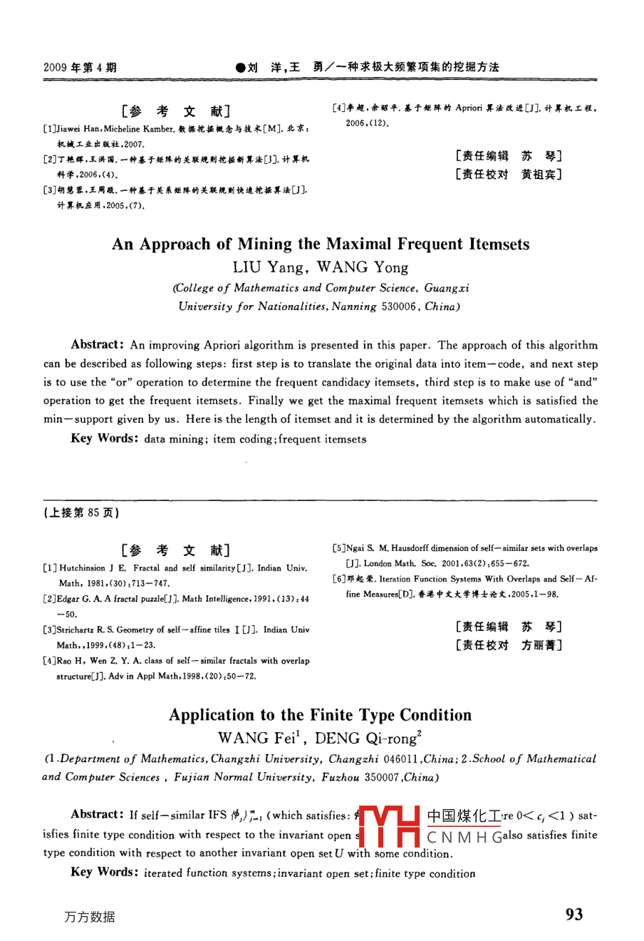 廣西民族大學(xué)學(xué)報(bào)(自然科學(xué)版第15卷第4期JOURNAL OF GUANGXI UNIVERSITY FOR NATIONALITIESVol. 15 No 42009年12月( Natural Science EditionDec.2009有限型條件的應(yīng)用王飛1,鄧起榮2(1.長(zhǎng)治學(xué)院數(shù)學(xué)系,山西長(zhǎng)治046011;2.福建師范大學(xué)數(shù)學(xué)與計(jì)算機(jī)科學(xué)學(xué)院,福建福州350007)摘要:若自相似迭代函數(shù)系匣,}1(滿足:啊(x)=cx+b,b∈R其中00中國(guó)煤化工·收稿日期:20090925CNMHG基金項(xiàng)目:長(zhǎng)治學(xué)院科研項(xiàng)目(200909)作者簡(jiǎn)介:王飛(1981),男,山西運(yùn)城人,碩士研究生,長(zhǎng)治學(xué)院數(shù)學(xué)系助教,主要從事分形幾何研究.鄧起萊(1962-),男廣西桂林人,博士,教授,主要從事分形幾何及數(shù)理統(tǒng)計(jì)方面的研究8方數(shù)據(jù)2009年第4期●王飛鄧起榮/有限型條件的應(yīng)用對(duì)任意的k≥0及v∈A4,定義C;")-1記v1=j1jΩ(u)={;∈山,(Ω)∩(9)≠O}.j1j2…j如果詞v∈A4,v∈A,且存在相似變換r(x)Cu= Ci,jcx+d,d∈R,滿足{mo:∈9(v)}={:∈9(v)},rOs=s.又因?yàn)閏n2≤[max()]”則稱Ω(v)與Ω(u)是等價(jià)的,記為g(v)o∴cs[max(c)”,n-r≤logp/max(c),92(v),我們用[9(v)]記為9(v)的等價(jià)類1S≤m定義3如果存在有界不變開(kāi)集ΩcR,使得故對(duì)任意的v=j…∈∑我們有結(jié)論v=Q()]:∈UA,}是有限集,則稱選代函數(shù)系2,n∈A,n1≤1x(){}-1關(guān)于不變開(kāi)集Ω滿足有限型條件,稱為有于是對(duì)任意的j∈∑n=(1,2,…,m},我們可限型條件集選取整數(shù)n以及叫=j…j∈∑,使得∈A定義49如果存在c∈O,1)及一列正整數(shù)由于迭代函數(shù)系》1關(guān)于不變開(kāi)集Ω滿足有限型52-1,使得c=(c),則稱{ogc)1是可公度條件,故存在k>>0,使得[Q(u)]=[(u)]由引理1的結(jié)論知c,=c2,由v的選法得到主要結(jié)果(c)=,令可=k二,則c=,顯然存在引理1設(shè)豆是選代函數(shù)系(=的不變開(kāi)正整數(shù)易,,,…,,使得8=5設(shè)c·=,則集,則對(duì)任意的v∈A4,v∈Ax,[9(v)]=[9(v)]So當(dāng)且僅當(dāng)=(cC),因而{log}1是可共度的:單∈9(v)}={o:卓∈9(v)};且另一方面,因?yàn)閏,=(c),=1,2,…,m,由于(c)是單調(diào)遞減函數(shù),故c=(c·)m,對(duì)任意的k證明:由[(v)]=[9(v)]的定義可知以及v∈A4,設(shè)c=(c)*(c)',根據(jù)引理1的結(jié)論知dt,=c,即c=c;cr∈(1,2,…,maxs}是由[9(v)]唯一確定的,并記假設(shè)c=cc,即ccn=c→,故滿足定義2為r(v)]考慮映射:的相似變換r為∮.因而[()]=[9(v)]等[9(v)]→({向o:φ∈[9(v)]},r[9(v)])價(jià){:∈g2()}=事:∮∈(m)},此式與令如是的子集構(gòu)成的集族則{φ:φ∈g(v)}=φ:φ∈Ω(v)}等價(jià)上述映射是從{Lg()J:v∈4A}到中a×10,定理1迭代函數(shù)系{}-關(guān)于不變開(kāi)集Ω滿1,2,…,maxs}的一一映射由于φ是有限集則足有限型條件當(dāng)且僅當(dāng)=U1{:v,v∈A4,(2)中2是有限集,從而{[9(v)]:v∈U,}是有限集,(9)≠O}是有限集且{logc1}1是可公度的故迭代函數(shù)系{}1關(guān)于不變開(kāi)集滿足有限型條證明:一方面迭代函數(shù)系}1關(guān)于不變開(kāi)集g滿足有限型條件,不妨設(shè)定理2設(shè)迭代函數(shù)系{}1關(guān)于不變開(kāi)集S滿足有限型條件,若UC9是另一不變開(kāi)集,則迭代()]:v∈U4,}=()],[9(v)],,函數(shù)系1)1關(guān)于不變開(kāi)集U滿足有限型條件9(v)],v∈41≤k≤N證明:若U)∩U)≠D,則(9)∩由引理1知φ=UN1{o:卓∈(v)}是有限集TH中國(guó)煤化工1可知也是有限CNMH或立任取v=j…,∈∑,由于()+。是單調(diào)遞(下轉(zhuǎn)第93頁(yè))減的,故存在k≥0及n≥r>0,使得:*≤c<;2009年第4期●劉洋,王勇/一種求極大頻繁項(xiàng)集的挖掘方法[參考文獻(xiàn)][4]李超,余昭平,基于矩陣的 Apriori算法改進(jìn)[冂]、計(jì)算機(jī)工程,[l] Jiawei Han, Micheline Kamber.數(shù)據(jù)挖掘概念與技術(shù)[M].北京2006,(12)[2]丁艷輝,王洪國(guó)一種基于矩陣的關(guān)聯(lián)規(guī)則挖拯新算法[].計(jì)算機(jī)[責(zé)任編輯蘇琴]科學(xué),2006,(4)[責(zé)任校對(duì)黃祖賓][3]胡慧蓉王周敬,一種基于關(guān)系炬陣的關(guān)聯(lián)規(guī)則快速挖梹算法[]計(jì)算機(jī)應(yīng)用,2005,(7)An Approach of Mining the Maximal Frequent ItemsetsLiU Yang, WANG YongCollege of Mathematics and Computer Science, guangriUniversity for Nationalities, Nanning 530006, China)Abstract: An improving Apriori algorithm is presented in this paper. The approach of this algorithmcan be described as following steps first step is to translate the original data into item -code, and next stepis to use the "or"operation to determine the frequent candidacy itemsets, third step is to make use of"andoperation to get the frequent itemsets. Finally we get the maximal frequent itemsets which is satisfied themin-support given by us. Here is the length of itemset and it is determined by the algorithm automaticallyKey words data mining; item coding; frequent itemsets上接第85頁(yè))[參考文獻(xiàn)][5]Ngai S. M. Hausdorff dimension of self-similar sets with overlaps[1] Hutchinsion J E. Fractal and self similarity [J]. Indian Univ[J]. London math.Soe.2001,63(2):655-672[6]鄧起蒙.[2]Edgar G. A. A fractal puzzle[J]. Math Intelligence, 1991,(13):44fine Measures[D].香港中文大學(xué)博士論文,2005,1-98[3]Strichartz R.S. Geometry of self-affine tiles I [J]. Indian Univ[責(zé)任編輯蘇琴]Math,,1999,(48):1-23.[責(zé)任校對(duì)方麗菁][4]Rao H, Wen Z Y. A class of self-similar fractals with overlapstructure[J]. Adv in Appl Math, 1998, (20):50-72.Application to the Finite Type ConditionWANG Fei, dENG Qi-rong(1. Department of Mathematics, Changzhi University, Changz