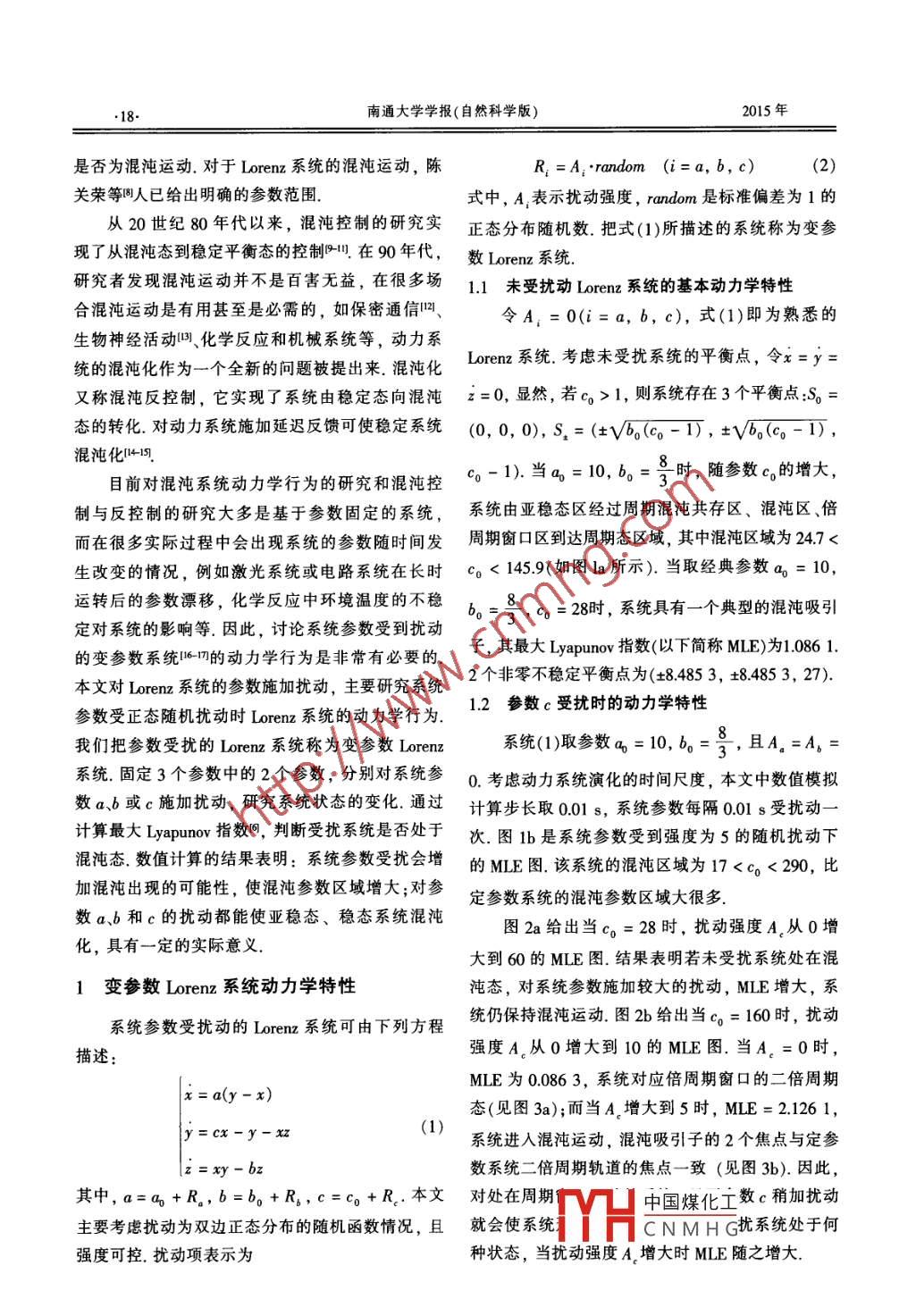 第14卷第4期南通大學學報(自然科學版)Vol 14 No 42015年12月Journal of Nantong University(Natural Science Edition)Dec.2015變參數 Lorenz系統(tǒng)的動力學特性研究解霞),黃洪斌2,陳翠萍1(L.南通大學理學院,江蘇南通226019;2.東南大學物理系,江蘇南京210096)摘要:為了研究參數漂移對混沌系統(tǒng)的影響,對 orenz系統(tǒng)的3個參數a、b和ε分別施加正態(tài)隨機擾動,數值計算變參數 Lorenz a系統(tǒng)的解和最大 Lyapunov指數,研究系統(tǒng)參數受擾動的變參數 Lorenz系統(tǒng)的動力學行為和混沌參數區(qū)域,并和定參數 Lorenz系統(tǒng)的混沌參數區(qū)城作比較.計算結果表明:對處于亞穩(wěn)態(tài)、周期態(tài)的 Lorenz系統(tǒng)施加一定的參數擾動,系統(tǒng)將產生混沌運動;變參數Lωrenz系統(tǒng)的混沌參數區(qū)域比固定參數 Lorenz系統(tǒng)的混沌參數區(qū)城更為廣闊,文章提出的系統(tǒng)參數擾動法作為混沌反控制的一種新方法,能實現穩(wěn)態(tài)系統(tǒng)的混沌化關鍵詞:變參數 Lorenz系統(tǒng);動力學特性;混沌; Lyapunov指數中圖分類號:0415文獻標志碼:A文章編號:1673-2340(2015)04-0017-06Study on Dynamics of the Varying Parameter Lorenz SystemXIE Xia, HUANG Hongbin, CHEN Cuiping(1. School of Sciences, Nantong University, Nantong 226019, China2. Department of Physics, Southeast University, Nanjing 210096, China)Abstract: In order to study the influence of parameter shift on the chaotic system, normal random disturbance wasapplied to the parameters, and of Lorenz system respectively, and numerical solution and the Maximal Lyapunovexponent of this varying parameter Lorenz system were calculated. The behaviors and the chaotic region of varyingparameter Lorenz system were investigated and the differences between varying parameter Lorenz system and thenormal system with fixed parameters were later demonstrated. The results showed that the disturbance of parameters toLorenz system which is originally in meta-stable or periodic states can generate chaos, and the chaotic region ofvarying parameter Lorenz system is much wider than the fixed parameter system. The system parameter perturbationnethod proposed in this paper is a new way for anti-chaos controlling that achieve chaos control of the stable systemKey words: varying parameter Lorenz system; dynamic characteristics; chaos Lyapunov exponent自從1963年美國氣象學家 Lorenz在模擬大氣 Lorenz系統(tǒng)具有豐富的動力學特征,其至今仍吸對流建立的 Lorenz模型中發(fā)現混沌吸引子叫以后,引人們作更深入的研究s.系統(tǒng)的混沌運動是對初Lo系統(tǒng)便成為一個經典混沌系統(tǒng).半個世紀以始條件極端敏感導致的長期不可預測的運動.通過來,國內外學者對 Lorenz方程作了廣泛研究,發(fā)現計算 Lyapunov指數間、功率譜η等方法可以判斷系統(tǒng)收稿日期:2015-05-08基金項目:國家自然科學青年基金項目(1104151);江蘇省高等教育教改研究立項課H中國煤化工CNMHG作者簡介:解霞(1981—),女,講師,主要研究方向為非線性光學混沌E-mai:xiexia@mtu.edu.cn18南通大學學報(自然科學版015年是否為混沌運動.對于 Lorenz系統(tǒng)的混沌運動,陳R ,=Arandom (i=a, b, c)(2)關榮等人已給出明確的參數范圍式中,A1表示擾動強度, random是標準偏差為1的從20世紀80年代以來,混沌控制的研究實正態(tài)分布隨機數把式(1)所描述的系統(tǒng)稱為變參現了從混沌態(tài)到穩(wěn)定平衡態(tài)的控制田在90年代,數 T系統(tǒng)研究者發(fā)現混沌運動并不是百害無益,在很多場1.1未受擾動 L系統(tǒng)的基本動力學特性合混沌運動是有用甚至是必需的,如保密通信嗎令A,=0(i=a,b,c),式(1)即為熟悉的生物神經活動叫、化學反應和機械系統(tǒng)等,動力系統(tǒng)的混沌化作為一個全新的問題被提出來.混沌化Lorenz系統(tǒng)考慮未受擾系統(tǒng)的平衡點,令x=y=又稱混沌反控制,它實現了系統(tǒng)由穩(wěn)定態(tài)向混沌z=0,顯然,若co>1,則系統(tǒng)存在3個平衡點:S態(tài)的轉化對動力系統(tǒng)施加延遲反饋可使穩(wěn)定系統(tǒng)(0,0,0),S=(±Vb0(c0-1),±Vbo(o-1,混沌化1目前對混沌系統(tǒng)動力學行為的研究和混沌控-1.當a=10,b。=8時,隨參數c的增大,制與反控制的研究大多是基于參數固定的系統(tǒng),系統(tǒng)由亞穩(wěn)態(tài)區(qū)經過周期混沌共存區(qū)、混沌區(qū)、倍而在很多實際過程中會出現系統(tǒng)的參數隨時間發(fā)周期窗口區(qū)到達周期態(tài)區(qū)域,其中混沌區(qū)域為247<生改變的情況,例如激光系統(tǒng)或電路系統(tǒng)在長時co<1459(如圖la所示).當取經典參數a=10,運轉后的參數漂移,化學反應中環(huán)境溫度的不穩(wěn)bo-3,c0=28時,系統(tǒng)具有一個典型的混沌吸引定對系統(tǒng)的影響等.因此,討論系統(tǒng)參數受到擾動的變參數系統(tǒng)的動力學行為是非常有必要的,子,其最大 Lyapunov指數(以下簡稱MLE)為10861本文對 Lorenz系統(tǒng)的參數施加擾動,主要研究系統(tǒng)2個非零不穩(wěn)定平衡點為(±84853,±84853,27)參數受正態(tài)隨機擾動時 Lorena系統(tǒng)的動力學行為,1.2參數c受擾時的動力學特性我們把參數受擾的 Lorenz系統(tǒng)稱為變參數 Lorenz系統(tǒng)(1)取參數a=10,b=3,且A.=A,=系統(tǒng)固定3個參數中的2個參數,分別對系統(tǒng)參0.考慮動力系統(tǒng)演化的時間尺度,本文中數值模擬數ab或c施加擾動,研究系統(tǒng)狀態(tài)的變化,通過計算步長取0.015,系統(tǒng)參數每隔001s受擾動一計算最大 Lyapunov指數間,判斷受擾系統(tǒng)是否處于