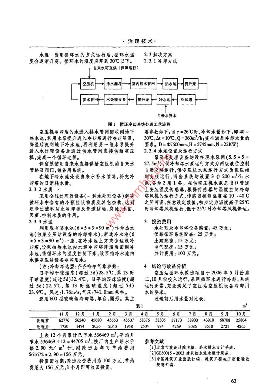 第33卷第2期黑龍江環(huán)境通報Vol 33 No. 22008年7月Heilongjiang Environmental JoumalJuy.2008空壓站循環(huán)水改造王志國高鳳枝(齊齊哈爾軌道交通裝備有限責(zé)任公司黑龍江齊齊哈爾161002)摘要:齊齊哈爾軌道交通裝備有限責(zé)任公司空壓站多臺空壓機(jī)設(shè)備一直采用自來水直排冷卻方式,并且24h運(yùn)行,浪費(fèi)很大。通過對水質(zhì)、水溫、水壓進(jìn)行處理可實現(xiàn)循環(huán)使用,運(yùn)行結(jié)果裹明:該系統(tǒng)運(yùn)行正常,節(jié)能效果顯著。并進(jìn)行了該工程運(yùn)行一年后的效益分析。關(guān)鍵詞:空壓機(jī);冷卻水;循環(huán)利用;效益分析中圖分類號:X124文獻(xiàn)標(biāo)識碼:A文章編號:1674-263X(2008)02-0062-02Modification Works of Recycled Water In Compressed Air StationWang Zhi-guo Gao Feng -zhi( Qiqihar Railway Rolling Stock Co.. Ltd 161002)Abstract Several air compressors waste a lot of water in the Qiqihar Railway Rolling Stock Co.. Ltd, which a-dopted direct tap water cooling-down method and work 24 hours. By processing water quality, water temperature and water pressure, cooling water recycle is realized. It shows that the system works well and saves energycaned when the system working for one yearKey words: Air compressor; Cooling water Recycle; Benefit analysis1問題的提出鹽量逐漸增加,加上水中二氧化碳在塔中解析逸空壓站多臺空壓機(jī)設(shè)備一直采用自來水直排散,使水中碳酸鈣在冷卻器及管道結(jié)垢,使換熱效冷卻方式,日耗水量2000多噸,月耗水量60000率降低,嚴(yán)重時影響生產(chǎn),甚至出現(xiàn)嚴(yán)重事故多m3,年耗水量72萬m3,浪費(fèi)很大。按廠內(nèi)生產(chǎn)腐蝕——冷卻水在循環(huán)使用過程中,水在冷用水價格2.90元/m3計,則每年約流失水費(fèi)72卻塔內(nèi)和空氣充分接觸,使水中的溶解氧得到補(bǔ)萬m3*2.9元/m3=208.8萬元。經(jīng)考查,可以將充,所以循環(huán)水中的溶解氧總是飽和的。水中溶空壓站設(shè)備的直排冷卻方式改為循環(huán)冷卻方式解氧是造成金屬電化學(xué)腐蝕的主要原因,故會腐每年可節(jié)約費(fèi)用200多萬元。蝕冷卻器及管道生物生長和玷污一—冷卻水和空氣接觸,吸收2設(shè)計方案了空氣中大量的灰塵、泥砂、微生物及其孢子,使系2.1設(shè)計依據(jù)及參數(shù)要求統(tǒng)的污泥增加。冷卻塔內(nèi)的光照、適宜的溫度、充1)空壓機(jī)冷卻水應(yīng)采用較清潔的水,不允許足的氧和養(yǎng)分都有利于細(xì)菌和藻類的生長,使系統(tǒng)用渾濁水或硬水,最好是軟水,以免結(jié)垢影響冷卻粘泥增加,在冷卻器內(nèi)沉積下來,造成危害。效果。冷卻水內(nèi)不應(yīng)含有腐蝕性介質(zhì)、泥沙、水草冷卻水循環(huán)使用后溫度會很快增加。及其它雜物。22改造需解決的問題(2)單臺空壓機(jī)冷卻水進(jìn)水溫度應(yīng)在30℃以下,根據(jù)以上空壓機(jī)對冷卻水的要求條件和循環(huán)冷卻水出水溫度一般在30~40℃,水量為70m3/h,進(jìn)水使用后對空壓機(jī)產(chǎn)生的影響,將空壓站設(shè)備的水工作壓力在0.2-0.3Mpa;直排冷卻方式改為循環(huán)冷卻方式需解決:(3)7-8月份時空壓站運(yùn)行4臺100m23和1冷卻方式一將自來水進(jìn)入空壓機(jī)后即排走的臺40m3空壓機(jī),總水量為315m3/h,其他月份運(yùn)直排方式改為將自來水進(jìn)入空壓機(jī)后出來的水收行3臺100m3空壓機(jī),總水量為210m3/h集經(jīng)提升到冷卻塔冷卻后再送入空壓機(jī)的循環(huán)冷4)冷卻水經(jīng)循環(huán)使用后,由于水質(zhì)變化會對卻方式。空壓站設(shè)備產(chǎn)生如下不利的影響:水質(zhì)一去除水中泥沙、水草及其它雜物并改結(jié)垢——水在冷卻塔中蒸發(fā),使循環(huán)水中含變水分子結(jié)構(gòu)防止結(jié)垢、腐蝕,控制微生物生長;收稿日期:2008-03-30第一作者簡介:王志國(1969-),男,本科,工程師,從事給排水工作18年。62治理技術(shù)水溫一改用循環(huán)水的方式運(yùn)行后,循環(huán)水溫23解決方案度會逐漸升高。循環(huán)水的溫度應(yīng)降到30℃以下。2.3.1冷卻方式自來水可直供(保障運(yùn)行)空壓機(jī)排水漏斗一一室內(nèi)排水管網(wǎng)熱水池}提升泵供水管水處理設(shè)備一提升泵H冷水池冷卻塔自來水補(bǔ)水圖1循環(huán)冷卻系統(tǒng)處理工藝流程空壓機(jī)冷卻后的水進(jìn)入排水管網(wǎng)回收到地下要參數(shù)如下:當(dāng)T=26℃時,冷卻水量如下:即40~熱水池,利用水泵提升進(jìn)入冷卻塔進(jìn)行冷卻降溫,30℃,△=10℃,Q=360m3/h;完全滿是冷卻水量的降溫后流到地下冷水池,再利用另一組水泵提升要求。D=47600mm、H=5745mmN=22xW)進(jìn)入水處理設(shè)備后通過供水管網(wǎng)直接供給空壓2.3.4水泵設(shè)置及運(yùn)行方式機(jī),完成一個循環(huán)過程。泵及水處理設(shè)備均設(shè)在現(xiàn)水泵間(55*5=保留原使用自來水直接供給空壓機(jī)的自來水27.5m3),供冷卻塔水泵運(yùn)行方式為兩級液位控制管路及閥門,儆備用系統(tǒng)。自動交替運(yùn)行,供空壓機(jī)水泵運(yùn)行方式為恒壓控在地下冷水池處設(shè)自來水補(bǔ)水管路,補(bǔ)充冷制變頻運(yùn)行,兩套系統(tǒng)均設(shè)置3臺200m3/h水卻塔的日消耗水量。泵,各為2用1備。在供空壓機(jī)水泵總出口管道2.3.2水質(zhì)上安裝溫度傳感器,根據(jù)傳感器的溫度控制冷卻采用全程處理器設(shè)備(一種水處理設(shè)備)解