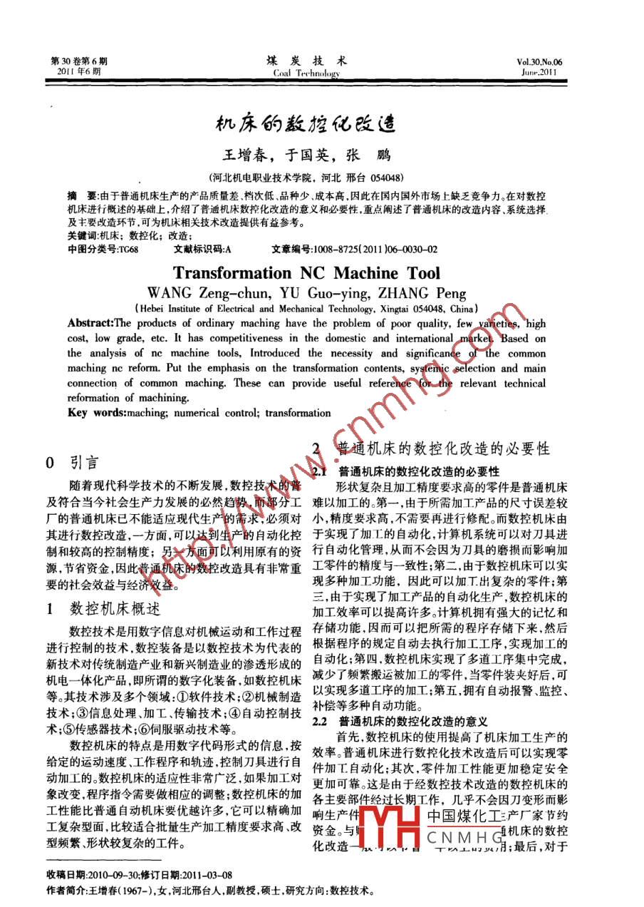 30卷第6期炭技術(shù)Vol 30. No, 0620II年6期Coal Technol機(jī)床的數(shù)控化改造王增春,于國(guó)英,張鵬(河北機(jī)電職業(yè)技術(shù)學(xué)院,河北邢臺(tái)054048)摘要:由于普通機(jī)床生產(chǎn)的產(chǎn)品質(zhì)量差、檔次低、品種少成本高因此在國(guó)內(nèi)國(guó)外市場(chǎng)上缺乏競(jìng)爭(zhēng)力。在對(duì)數(shù)控機(jī)床進(jìn)行概述的基礎(chǔ)上,介紹了普通機(jī)床數(shù)控化改造的意義和必要性,重點(diǎn)闡述了普通機(jī)床的改造內(nèi)容、系統(tǒng)選擇及主要改造環(huán)節(jié),可為機(jī)床相關(guān)技術(shù)改造提供有益參考。關(guān)鍵詞機(jī)床;數(shù)控化;改造;中圖分類號(hào)c68文獻(xiàn)標(biāo)識(shí)碼A文章編號(hào):1008-8725(2011)060030-02Transformation NC Machine toolWANG Zeng-chun, YU Guo-ying, ZHANG PengHebei Institute of Electrical and Mechanical Technology, Xingtai 054048, China)Abstract: The products of ordinary maching have the problem of poor quality, few varieties, highcost,low grade, etc. It has competitiveness in the domestic and intermational market. Based onthe anal,significance of the commonmaching ne reform. Put the emphasis on the transformation contents, systemic selection and mainconnection of common maching. These can provide useful reference for the relevant technicalreformation of machiniKey words: maching: numerical control; transformation2普通機(jī)床的數(shù)控化改造的必要性0引言2.1普通機(jī)床的數(shù)控化改造的必要性隨著現(xiàn)代科學(xué)技術(shù)的不斷發(fā)展數(shù)控技術(shù)的普形狀復(fù)雜且加工精度要求高的零件是普通機(jī)床及符合當(dāng)今社會(huì)生產(chǎn)力發(fā)展的必然趨勢(shì),而部分工難以加工的第一,由于所需加工產(chǎn)品的尺寸誤差較廠的普通機(jī)床已不能適應(yīng)現(xiàn)代生產(chǎn)的需求,必須對(duì)小,精度要求高,不需要再進(jìn)行修配。而數(shù)控機(jī)床由其進(jìn)行數(shù)控改造,一方面,可以達(dá)到生產(chǎn)的自動(dòng)化控于實(shí)現(xiàn)了加工的自動(dòng)化,計(jì)算機(jī)系統(tǒng)可以對(duì)刀具進(jìn)制和較高的控制精度;另一方面可以利用原有的資行自動(dòng)化管理從而不會(huì)因?yàn)榈毒叩哪p而影響加源,節(jié)省資金,因此普通機(jī)床的數(shù)控改造具有非常重工零件的精度與一致性;第二,由于數(shù)控機(jī)床可以實(shí)要的社會(huì)效益與經(jīng)濟(jì)效益?,F(xiàn)多種加工功能,因此可以加T出復(fù)雜的零件;第三,由于實(shí)現(xiàn)了加工產(chǎn)品的自動(dòng)化生產(chǎn),數(shù)控機(jī)床的1數(shù)控機(jī)床概述加工效率可以提高許多。計(jì)算機(jī)擁有強(qiáng)大的記憶和數(shù)控技術(shù)是用數(shù)字信息對(duì)機(jī)械運(yùn)動(dòng)和工作過(guò)程存儲(chǔ)功能,因而可以把所需的程序存儲(chǔ)下來(lái)然后進(jìn)行控制的技術(shù),數(shù)控裝備是以數(shù)控技術(shù)為代表的根據(jù)程序的規(guī)定自動(dòng)去執(zhí)行加工工序,實(shí)現(xiàn)加工的新技術(shù)對(duì)傳統(tǒng)制造產(chǎn)業(yè)和新興制造業(yè)的滲透形成的自動(dòng)化;第四,數(shù)控機(jī)末實(shí)現(xiàn)了多道工序集中完成,機(jī)電一體化產(chǎn)品,即所謂的數(shù)字化裝備,如數(shù)控機(jī)床減少了頻繁搬運(yùn)被加工的零件,當(dāng)零件裝夾好后可等。其技術(shù)涉及多個(gè)領(lǐng)域:①軟件技術(shù);②機(jī)械制造以實(shí)現(xiàn)多道工序的加工;第五擁有自動(dòng)報(bào)警監(jiān)控技術(shù);③信息處理、加工、傳輸技術(shù);④自動(dòng)控制技補(bǔ)償?shù)榷喾N自動(dòng)功能。術(shù);⑤傳感器技術(shù);⑥伺服驅(qū)動(dòng)技術(shù)等。22普通機(jī)床的數(shù)控化改造的意義數(shù)控機(jī)床的特點(diǎn)是用數(shù)字代碼形式的信息,按首先數(shù)控機(jī)床的使用提高了機(jī)床加工生產(chǎn)的效率。普通機(jī)床進(jìn)行數(shù)控化技術(shù)改造后可以實(shí)現(xiàn)零給定的運(yùn)動(dòng)速度、工作程序和軌跡,控制刀具進(jìn)行自件加工自動(dòng)化;其次,零件加工性能更加穩(wěn)定安全動(dòng)加工的數(shù)控機(jī)床的適應(yīng)性非常廣泛,如果加工對(duì)更加可靠。這是由于經(jīng)數(shù)控技術(shù)改造的數(shù)控機(jī)床的象改變程序指令需要做相應(yīng)的調(diào)整數(shù)控機(jī)床的加各主要部件經(jīng)過(guò)長(zhǎng)期工作,幾乎不會(huì)因刀變形而影工性能比普通自動(dòng)機(jī)床要優(yōu)越許多,它可以精確加響生產(chǎn)件中國(guó)煤化工產(chǎn)廠家節(jié)約工復(fù)雜型面比較適合批量生產(chǎn)加工精度要求高改資金。與型頻繁、形狀較復(fù)雜的工件。化改造CNMHG機(jī)床的數(shù)控以;最后,對(duì)于收稿日期201009-30修訂日期2011-03-08作者簡(jiǎn)介:王增春(1967-),女,河北邢臺(tái)人,副教授,碩士,研究方向:數(shù)控技術(shù)第6期王增春,等:機(jī)床的數(shù)控化改造復(fù)雜的加工零件而言,改造難度越高,其功效提高的機(jī),其變速通過(guò)主軸箱獲得不同速度,滿足加工要越顯著且可不用或少用工裝,這樣不但節(jié)約費(fèi)用,求,由于機(jī)械檔數(shù)一般較多,使變速箱結(jié)構(gòu)復(fù)雜、體還可以縮短零件生產(chǎn)的準(zhǔn)備時(shí)間。積龐大,對(duì)于零件加工精度會(huì)產(chǎn)生不