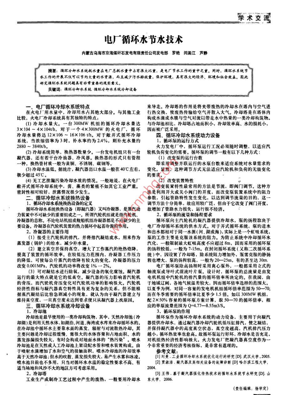 學(xué)術(shù)交遠(yuǎn)電廠循環(huán)水節(jié)水技術(shù)內(nèi)蒙古烏海市京海煤矸石發(fā)電有限責(zé)任公司發(fā)電部羅艷閆美江蘆靜摘要:環(huán)冷卻水系統(tǒng)耗水量在電廠總耗水量中占有很大比重,是電廠節(jié)水工作的重中之重。同時(shí),搪環(huán)水系統(tǒng)節(jié)水工作的開(kāi)展不僅可以節(jié)約大量的水資源,而且減少污水排放量,保護(hù)環(huán)境,具有很大的經(jīng)濟(jì)、環(huán)境和社會(huì)效益。因此研究循環(huán)水系就問(wèn)題具有非常重要的現(xiàn)實(shí)意義。關(guān)鍵詞:捕環(huán)冷卻水系統(tǒng)循環(huán)冷卻水系統(tǒng)冷卻設(shè)備一、電廠循環(huán)冷卻水系統(tǒng)特點(diǎn)來(lái)導(dǎo)走。冷卻塔的作用是將夾帶廢熱的冷卻水在塔內(nèi)與空氣進(jìn)在火電廠用水量中,冷卻用水占其絕大部分。與其他工業(yè)行熱交換,使廢熱傳輸給空氣并散入大氣。冷卻塔是在塔體內(nèi)比較,火電廠冷卻系統(tǒng)具有其獨(dú)特的特點(diǎn):構(gòu)成水滴或水膜與空氣對(duì)流以帶走水中熱量的一類冷卻構(gòu)筑物。(1)冷卻水量大。一臺(tái)300MW機(jī)組的循環(huán)冷卻水量達(dá)與冷卻池相比,冷卻塔占地面積小,冷卻效率高、水的損耗小3×104~4×104h,對(duì)于一個(gè)4×30MW的火電廠,循環(huán)因而被廣泛采用冷卻水量將達(dá)12×106~16×106h。對(duì)于散開(kāi)式循環(huán)冷卻四、循環(huán)冷卻水系統(tǒng)動(dòng)力設(shè)備系統(tǒng),當(dāng)濃縮倍率為3時(shí),補(bǔ)水率約為24%,則補(bǔ)充水量約1.循環(huán)泵的運(yùn)行方式2880~3840uh。火力發(fā)電廠中,循環(huán)泵運(yùn)行工況必須隨時(shí)調(diào)整,以適應(yīng)汽(2)冷卻系統(tǒng)簡(jiǎn)單,換熱器數(shù)量少。一臺(tái)發(fā)電機(jī)組只有一臺(tái)輪機(jī)負(fù)荷變化的需要。循環(huán)泵的調(diào)節(jié)一般有以下幾種方式凝汽器,還有若干臺(tái)冷油器、冷風(fēng)器。換熱器的形式只有管程(1)改變泵的運(yùn)行臺(tái)數(shù)種,換熱管材質(zhì)一般為黃銅、不銹鋼、碳鋼等即采用調(diào)整并聯(lián)運(yùn)行的水泵臺(tái)數(shù)來(lái)適應(yīng)系統(tǒng)對(duì)水量需求的(3)冷卻水溫低。據(jù)統(tǒng)汁,凝汽器出口水溫一般在40℃左右,變化。顯然,這種調(diào)節(jié)方式無(wú)法適應(yīng)汽輪機(jī)和負(fù)荷的無(wú)級(jí)變化極少超過(guò)45℃。的要求4)無(wú)工藝泄漏污染冷卻水質(zhì)的情況。一般地說(shuō),在火電廠2)改變裝置特性敞開(kāi)式循環(huán)冷卻系統(tǒng)中,茵、藻類的繁殖不如其它工業(yè)嚴(yán)重改變裝置特性最常用的方法是節(jié)流,即閥門調(diào)節(jié)。這種方密封性相對(duì)較好,泄露情況很少發(fā)生。法是利用開(kāi)大或關(guān)小閥門的開(kāi)度,而改變泵裝置系統(tǒng)中的阻力二、循環(huán)冷卻水系統(tǒng)換熱設(shè)備參數(shù),引起管路特性發(fā)生變化,以達(dá)到調(diào)節(jié)流量的目的,這1.循環(huán)冷卻水系統(tǒng)換熱設(shè)備的定義調(diào)節(jié)方法十分簡(jiǎn)單,故應(yīng)用較廣泛,但由于它改變了閥門開(kāi)度,循環(huán)冷卻水系統(tǒng)換熱設(shè)備(即凝汽器)又叫冷凝器,、是蒸汽動(dòng)故增加了管路水力損失,運(yùn)行很不經(jīng)濟(jì)力裝置中不可缺少的重要組成之一。所謂汽輪機(jī)組就是指汽輪機(jī)2.循環(huán)泵的流量和揚(yáng)程要求冷凝器的總稱。不論電站機(jī)組或艦船機(jī)組冷凝器都是不可缺少的主循環(huán)泵向主汽輪機(jī)的凝汽器提供冷卻水,泵的揚(yáng)程取決于要設(shè)備。冷凝器在汽輪機(jī)裝置的熱力循環(huán)中起著冷源的作用電廠冷卻循環(huán)系統(tǒng)的供水方式。對(duì)于開(kāi)式循環(huán)系統(tǒng),泵的進(jìn)水2.冷凝器的主要作用和出水都相對(duì)于同一水源(河、湖或海),實(shí)際上是一個(gè)虹吸系統(tǒng)(1)接受主汽輪機(jī)的排汽,并將排汽凝結(jié)成水,用來(lái)作為泵的工作主要是克服該系統(tǒng)的阻力。為防止系統(tǒng)中冷卻循環(huán)水蒸發(fā)器(鍋爐)的給水,減少補(bǔ)水量汽化,一般限制最大虹吸高度不應(yīng)超過(guò)8m,因而采用的循環(huán)泵(2)建立真空井保持真空,增大了工作蒸汽的絕熱焓降,的揚(yáng)程較低,一般為7-15m。在封閉循環(huán)系統(tǒng)(又稱二次循環(huán)系提高了裝置的循環(huán)效率。在較低壓力范圍內(nèi),冷凝器工作壓力統(tǒng))中,因設(shè)置了冷卻塔,除系統(tǒng)阻力增加外,泵需克服的靜揚(yáng)的降低,可使每公斤蒸汽的焓降有較大的變化,冷凝器的壓力程也增大,泵的揚(yáng)程較高,一般為2025m,有的甚至達(dá)30m改變000MPa,汽輪機(jī)的功率將改變1%一2%電廠循環(huán)泵除高揚(yáng)程時(shí)采用離心泵外,一般都采用立式的(3)可對(duì)凝結(jié)水進(jìn)行除氧,減少設(shè)備的氧化腐蝕。凝汽器軸流泵或?qū)~式混流葉片泵。設(shè)計(jì)時(shí),循環(huán)泵的總流量是由發(fā)運(yùn)行的最大特點(diǎn)就是它的低真空。凝汽器的壓力影響著汽輪機(jī)電機(jī)機(jī)組中汽輪機(jī)的排汽量的循環(huán)倍率所決定的。在我國(guó),由的背壓,而汽輪機(jī)背壓變化對(duì)汽輪機(jī)功率的影響很大。汽輪機(jī)于地域遼闊,各地氣候溫差較大,因而循環(huán)倍率選擇的范圍大經(jīng)