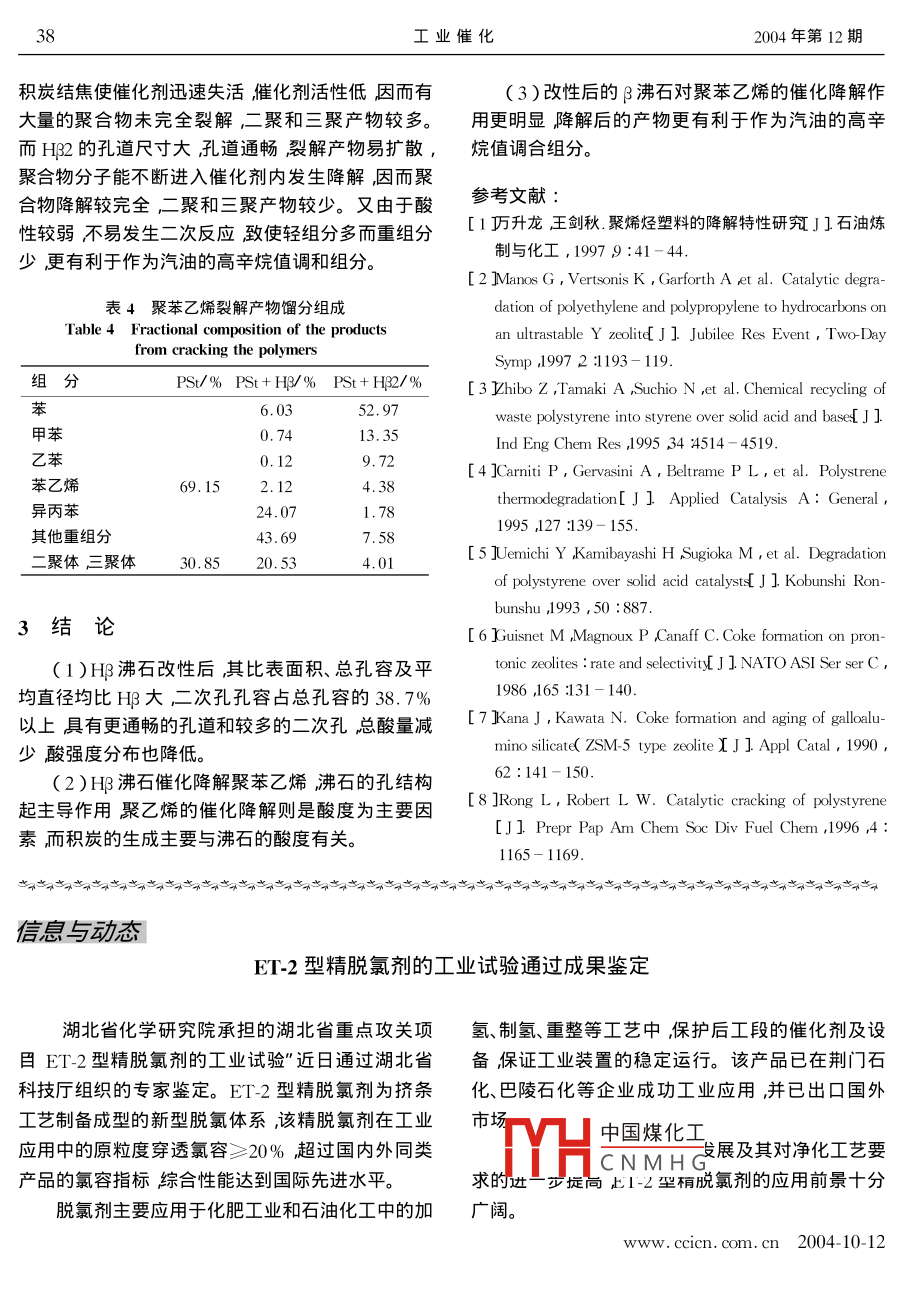 2004年12月工業(yè)催化Dec. 2004第12卷第12期INDUSTRIAL CATALYSISVol.12 No. 12環(huán)境保護與催化H沸石催化降解聚烯烴的研究陳平孫永康?( 1.遼寧石油化工大學(xué)石化學(xué)院遼寧撫順113001 2.中國石油遼寧銷售分公司遼寧沈陽110031 )摘要:將Hβ沸石進行水熱處理和酸處理改性后 其比表面積、總孔容及平均直徑均增大二次孔孔容占總孔容的38.7%以上說明改性后的沸石具有更通暢的孔道和較多的二次孔,總酸量減少,酸強度分布降低。熱重分析研究了處理前后的Hβ沸石作催化劑對聚苯乙烯及聚乙烯催化降解的作用。結(jié)果表明Hβ沸石能顯著降低聚乙烯的熱降解溫度對聚苯乙烯的熱降解溫度影響不大。催化劑的酸量對聚乙烯降解溫度、活化能及積炭生成有很大的影響。催化劑酸量增加聚乙烯的降解溫度和活化能均明顯下降,但積炭量增加。催化劑對聚苯乙烯的熱降解影響主要取決于孔結(jié)構(gòu)。關(guān)鍵詞Hβ沸石聚苯乙烯聚乙烯催化降解中圖分類號:TE624. 9+50632. 12文獻標(biāo)識碼A文章編號:1008- 1143( 2004 )12-0035-04Catalytic degradation of polyolefin over H catalystCHEN Ping' , SUN Yong kang2( 1. Petrochemical Engineering Faculty , Liaoning University of Petrochemical & Technology ,Fushun 113001 , Liaoning China 2. PetroChina Distribution Company Liaoning Branch ,Shenyang 110031 ,Liaoning China)Abstract : Pore structure of Hβ zeolite was modified by hydrothermal and acid treatment. The surfacearea , diameter and total pore volume increased after hydrothermal treatment , while the acid amountand acid strength decreased. Thermogravimetric analysis was used to investigate activity of the cata-lysts for degradation of polystyrene and polyethylene. The results showed that modified Hβ zeolite cangreatly lower degradation temperature for degradation of polyethylene, but had lttle influence ondegradation temperature for degradation of polystyrene. The increase of catalyst acidity led to signifi-cantly decrease in degradation temperature and apparent activation energy for degradation of polyethy-lene , but a remarkable increase in coke formation. The influence of Hβ modification on degradation ofpolystyrene mainly depended on pore structure of catalyst.Key words : Hβ zeolite catalyst ; polyethylene degradation ; polystyrene degradationCLC number :TE624.9+5 0632.12 Document code :A Article ID : 1008-1143( 2004 )12-0035-04廢聚合物的循環(huán)利用對環(huán)境保護和資源的合理耗,使催化降解成為回收廢塑料的有效方法。文獻開發(fā)與利用具有重要的意義。通過降解可以實現(xiàn)聚報道2用超穩(wěn)Y沸石催化降解聚乙烯和聚丙烯表合物循環(huán)再利用的目的11。不同的聚合物可采用明產(chǎn)物分日可用你克年量的燃料而聚苯乙烯中國煤化工不同的降解方法得到的回收成分不同,因而用于不熱裂Y片乙烯單體為主3。固同的用途。由于催化降解能顯著降低聚合物的熱降體酸在C NMHS苯、甲苯和乙苯等芳烴解溫度和活化能加快降解速率有利于節(jié)約能源消衍生物4-5]可作為汽油的高辛烷值調(diào)和組分。因收稿日期2004-08-17 .作者簡介陳平1963- )女遼寧省撫順市人碩士遼寧石油化工大學(xué)石化學(xué)院副教授。36工業(yè)催化2004年第12期而根據(jù)回收的目的不同采用不同的降解方法。表1邯沸石的物化性能本文利用熱重分析法研究了H3沸石及改性后Table 1 Physicochemical properties of H耶zeolite作為催化劑催化降解聚乙烯和聚苯乙烯,討論了催樣品HβHβ2化劑不同酸量和孔結(jié)構(gòu)對聚乙烯、聚苯乙烯熱降解比表面積/m2 g 1691. 15744. 61孔容/mI: g溫度、活化能以及降解過程中積炭生成的影響。研V微孔0.230.19究結(jié)果表明Hp沸石的酸量是影響聚乙烯催化降解V中孔0.050.12V總孔0.290.31的主要因素而聚苯乙烯的催化降解則主要取決于Vp/Vg/% .17.238.7Hβ沸石的孔結(jié)構(gòu)積炭的生成與沸石的酸度有很大平均直徑/nm1.722. 29酸量/mmot g 11.540.32關(guān)系。酸強度分布/%1實驗部分強8.373. 85中34. 3628. 85弱36. 5636. 541.1原料β沸石,撫順石油三廠提供。將一定量的β沸2.2催化劑對聚 合物分解溫度的影響石與1.0mot L-1 NH4Cl溶液進行離子交換然后在氮氣流中以10 °C min-1 速率升溫至于500 C加熱使之分解生成Hβ沸石。Hβ沸石再700 °C高純氮氣流速100 ml: min-'后切換 成空經(jīng)水熱處理、酸處理、洗滌、抽濾和干燥制成改性氣空氣流速100 mL: min-'條件下將上述Hβ沸H32沸石。使用前以程序升溫至550 C恒溫焙燒石作為催化劑分別考察催化劑對聚苯乙烯和聚乙4 ho聚合物為高密度聚乙烯撫順乙烯化工廠提供。烯降解的影響。圖1為聚苯乙烯在各種條件下的熱聚苯乙烯撫順石化公司化塑廠提供。失重曲線。圖2為聚乙烯在各種條件下的熱失重樣品制備將催化劑與聚合物按重量比1:2共曲線?;旌髠溆?。1.2儀器與實驗條件31熱重分析使用美國杜邦公司951型熱重分析30 t儀。取大約3 mg樣品置于鉑筐中在氮氣流中,以310°C min-'的速率升溫至700 。C高純氮氣流速10 t100 mL. min-'后切換成空氣,空氣流速為100 ml: min 1“5506006500750溫度/K酸度分析采用NH3-TPD法,使用美國杜邦公司951型熱重分析儀。圖1聚苯乙烯熱失重曲線Figure 1 TG curves for polystyrene孔結(jié)構(gòu)分析使用美國Micromeritics 公司ASAP1. PSt ;2. H3 ;3. Hβ2。2400-物理吸附儀。20 r2結(jié)果與討論90卜2.1催化劑的物化性 能\2將Hβ沸石經(jīng)水熱處理和酸處理改性后得到50 tHβ2其物化性能見表1。中國煤化工表1數(shù)據(jù)表明經(jīng)改性后沸石的比表面積、