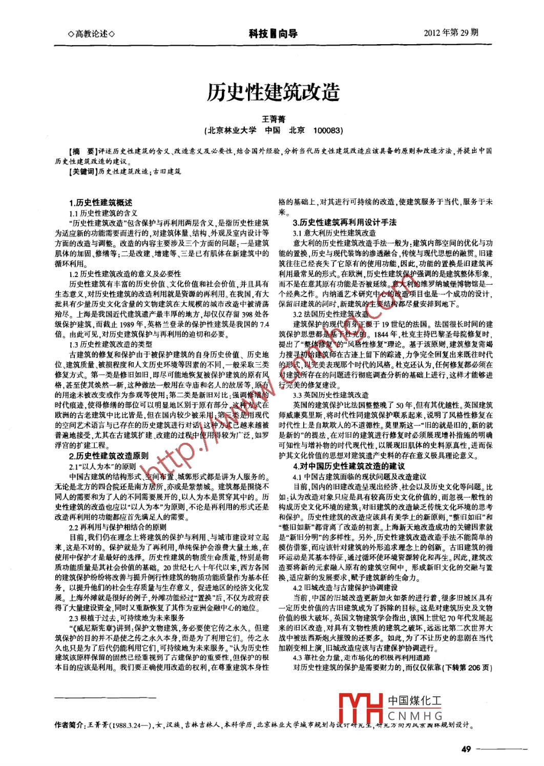 ◇高教論述◇科技圓向?qū)?012年第29期歷史性建筑改造王菁菁(北京林業(yè)大學(xué)中國北京100083)【摘要】評述歷史性建筑的含義、改造意義及必要性,結(jié)合國外經(jīng)驗,分析當(dāng)代歷史性建筑改造應(yīng)該具備的原則和改造方法,并提出中國歷史性建筑改造的建議?!娟P(guān)鍵詞】歷史性建筑改造;古舊建筑1歷史性建筑概述格的基礎(chǔ)上,對其進(jìn)行可持續(xù)的改造,使建筑服務(wù)于當(dāng)代,服務(wù)于未11歷史性建筑的含義“歷史性建筑改造”包含保護(hù)與再利用兩層含義,是指歷史性建筑3歷史性建筑再利用設(shè)計手法為適應(yīng)新的功能需要而進(jìn)行的,對建筑體量、結(jié)構(gòu)、外觀及室內(nèi)設(shè)計等3.1意大利歷史性建筑改造方面的改造與調(diào)整。改造的內(nèi)容主要涉及三個方面的問題:一是建筑意大利的歷史性建筑改造手法一般為:建筑內(nèi)部空間的優(yōu)化與功肌體的加固、修繒等;二是改建、增建等、三是已有肌體在新建筑中的能的置換歷史與現(xiàn)代裝飾的滲透融合傳統(tǒng)與現(xiàn)代思想的融貫。舊建循環(huán)利用。筑往往已經(jīng)喪失了它原有的使用功能因此,功能的置換是舊建筑再12歷史性建筑改造的意義及必要性利用最常見的形式。在歐洲歷史性建筑保護(hù)強調(diào)的是建筑整體形象歷史性建筑有豐富的歷史價值、文化價值和社會價值,并且具有而不是在意其原有功能是否被延續(xù)。意大利的維羅納城堡博物館是一生態(tài)意義,對歷史性建筑的改造利用就是資源的再利用。在我國,有大個經(jīng)典之作。內(nèi)納通藝術(shù)研究中心的改造項目也是一個成功的設(shè)計批具有少量歷史文化含量的文物建筑在大規(guī)模的城市改造中被清蕩保留舊建筑的同時,新建筑的主要結(jié)構(gòu)都盡量安排到地下。殆盡。上海是我國近代建筑遺產(chǎn)最豐厚的地方卻僅僅存留398處各32法國歷史性建筑改造級保護(hù)建筑,而截止1989年,英格蘭登錄的保護(hù)性建筑是我國的74建筑保護(hù)的現(xiàn)代萌芽正源于19世紀(jì)的法國。法國很長時間的建倍。由此可見,對歷史建筑保護(hù)與再利用的迫切和必要。筑保護(hù)思想都是基于杜克的。184年,杜克主持巴黎圣母院修復(fù)時13歷史性建筑改造的類型提出了“整體修復(fù)”的“風(fēng)格性修復(fù)”理論?;谠撛瓌t,建筑修復(fù)需竭古建筑的修復(fù)和保護(hù)由于被保護(hù)建筑的自身歷史價值、歷史地力搜尋初始建筑師在古跡上留下的蹤跡,力爭完全回復(fù)出來既往時代位、建筑質(zhì)量、被損程度和人文歷史環(huán)境等因素的不同,一般采取三類的形式,以完美表現(xiàn)那個時代的風(fēng)格。杜克還認(rèn)為任何修復(fù)都必須在修復(fù)方式。第一類是修舊如舊,即盡可能地恢復(fù)被保護(hù)建筑的原有風(fēng)對建筑所存在的問題進(jìn)行徹底調(diào)查分析的基礎(chǔ)上進(jìn)行,這樣才能夠進(jìn)格,甚至使其煥然一新這種做法一般用在寺廟和名人的故居等原有行完美的修復(fù)建設(shè)。的用途未被改變或作為參觀等使用;第二類是新舊對比:強調(diào)修鐠的33英國歷史性建筑改造時代痕跡使得修繕的部位可以明顯地區(qū)別于原有部分,這種方式在英國的建筑保護(hù)比法國整整晚了50年,但有其優(yōu)越性。英國建筑歐洲的古老建筑中比比皆是,但在國內(nèi)較少被采用;第三類是用現(xiàn)代師威亷莫里斯,將時代性同建筑保護(hù)聯(lián)系起來,說明了風(fēng)格性修復(fù)在的空間藝術(shù)語言與已存在的歷史建筑進(jìn)行對話,這種方式已越來越被時代性上是自欺欺人的不道德性。莫里斯這一“舊的就是舊的,新的就普遍地接受,尤其在古建筑擴建改建的過程中使用得較為廣泛,如羅是新的”的提法,在對舊的建筑進(jìn)行修復(fù)時必須展現(xiàn)增補指施的明確浮宮的擴建工程??芍耘c增補物的時代現(xiàn)代性,以展現(xiàn)舊肌體的史料原真性進(jìn)而保2歷史性建筑改造原則護(hù)其文化價值的思想對建筑遺產(chǎn)史料的存在意義極具理論意義21“以人為本”的原則4對中國歷史性建筑改造的建議中國古建筑的結(jié)構(gòu)形式、空間布置、城郭形式都是講為人服務(wù)的41中國古建筑面臨的現(xiàn)狀問題及改造建議無論是北方的四合院還是南方居所,亦或是紫禁城。建筑都是圍繞不目前國內(nèi)的舊建改造呈現(xiàn)出經(jīng)濟、社會以及歷史文化等問題。比同人的需要和為了人的不同需要展開的,以人為本是貫穿其中的。歷如:認(rèn)為改造對象只應(yīng)是具有較高歷史文化價值的,而忽視一般性的史性建筑的改造也應(yīng)以“以人為本”為原則,不論是再利用的形式還是構(gòu)成歷史文化環(huán)境的建筑對舊建筑的改造缺乏傳統(tǒng)文化環(huán)境的思考改造再利用的功能都應(yīng)首先滿足人的需要。和保護(hù)。歷史性建筑的改造應(yīng)該具有美學(xué)上的新原則,“整舊如舊”和2.2再利用與保護(hù)相結(jié)合的原則整舊如新”都背離了改造的初衷。上海新天地改造成功的關(guān)鍵因素就目前我們?nèi)栽诶砟钌蠈⒔ㄖ谋Wo(hù)與利用、與城市建設(shè)對立起是“新舊分明的多樣性。另外,歷史性建筑改造改造手法不能簡單的來,這是不對的。保護(hù)就是為了再利用,單純保護(hù