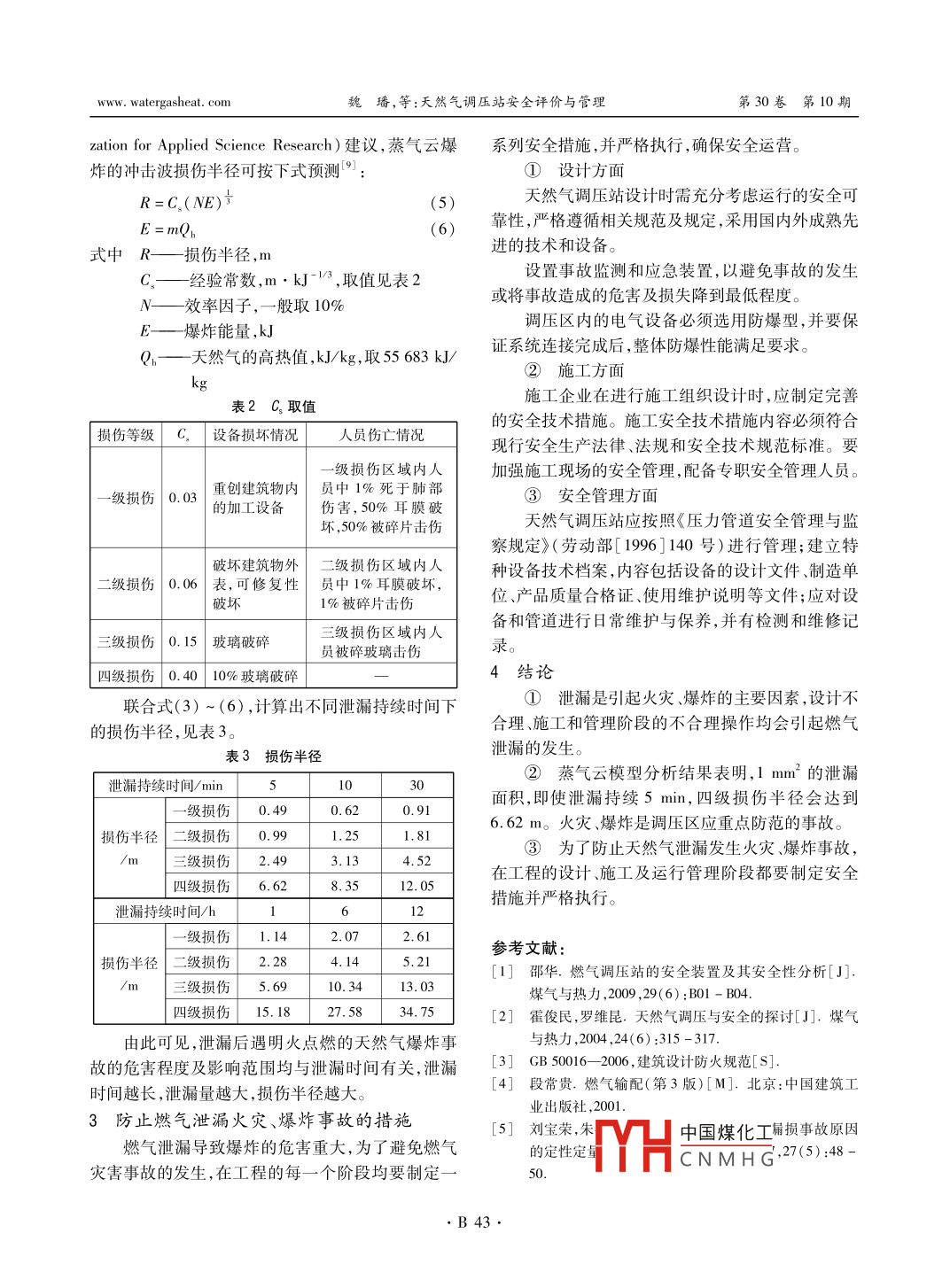 第30卷第10期煤氣與熱力Ⅴol.30No.102010年10月gas heatOct.2010天然氣調(diào)壓站安全評(píng)價(jià)與管理魏璠,渠潁(1.天津城市建設(shè)學(xué)院能源與機(jī)械工程系,天津300384;2.中國(guó)市政工程華北設(shè)計(jì)研究總院,天津300074)摘要:分析了導(dǎo)致天然氣調(diào)壓站泄漏造成火災(zāi)、爆炸的危險(xiǎn)因素,遵循安全訐評(píng)價(jià)中事故最大化原則,以燕氣云爆炸為模型,對(duì)天然氣泄漏火災(zāi)、爆炸的災(zāi)害后果進(jìn)行了定量分析。在泄漏面積為1mm2的情況下,即使泄漏持續(xù)5mi,四級(jí)損傷半徑會(huì)達(dá)到6.62m。在工程的設(shè)計(jì)、施工及運(yùn)行管理階段要制定有針對(duì)性的安全措施并嚴(yán)格執(zhí)行。關(guān)鍵詞:調(diào)壓站;泄漏;火災(zāi);爆炸;安全評(píng)價(jià)中圖分類號(hào):TU996文獻(xiàn)標(biāo)識(shí)碼:B文章編號(hào):1000-4416(2010)10-0B41-04Safety evaluation and management of Natural Gas regulator StationWEI Fan, QU YingAbstract: The risk factors causing leakage at natural gas regulator station, resulting in fire and ex-plosion, are analyzed. The consequences of fire and explosion from leakage of natural gas are quantitatively analyzed by vapor cloud explosion model according to the accident maximization principle in safetyevaluation. Under the condition of leakage area of I mm, the four-stage damage radius will reach 6.62m even if the leakage lasts for 5 min. The safety measures must be established and strictly implemented inthe project design, construction and operation managementKey words: regulator station; leakage; fire; explosion; safety measure調(diào)壓站是天然氣輸配系統(tǒng)的重要組成部分,其1.2工藝過(guò)程危險(xiǎn)性安全運(yùn)營(yíng)是天然氣穩(wěn)定供應(yīng)的重要保證。由于調(diào)壓調(diào)壓器是調(diào)壓站的主要設(shè)備,其功能是根據(jù)燃站內(nèi)設(shè)備繁雜,且天然氣運(yùn)行壓力較高,一旦燃?xì)獍l(fā)氣的需要情況將燃?xì)庹{(diào)至不同壓力,實(shí)現(xiàn)穩(wěn)定輸生泄漏,易造成火災(zāi)、爆炸或中毒等事故2。本文送4。由于設(shè)備及管道材質(zhì)的問(wèn)題、施工不當(dāng)、運(yùn)對(duì)天然氣調(diào)壓站存在的安全問(wèn)題進(jìn)行分析,提出有行管理不到位等原因,均會(huì)造成燃?xì)庑孤?引起火效的防范措施,消除安全隱患,從而確保城市燃?xì)獍矠?zāi)、爆炸等安全事故3全、平穩(wěn)供應(yīng)。①設(shè)備及管道材質(zhì)問(wèn)題1主要危險(xiǎn)因素分析調(diào)壓器的工作壓力較高,要求設(shè)備和管道的材1介質(zhì)本身的危險(xiǎn)性質(zhì)滿足強(qiáng)度要求。在設(shè)計(jì)及選型過(guò)程中,如果對(duì)設(shè)天然氣是易燃易爆的物質(zhì),屬于甲類火災(zāi)危險(xiǎn)備和管道規(guī)格、材質(zhì)要求不合理,必將對(duì)后繼過(guò)程產(chǎn)性物質(zhì)。天然氣泄漏后,極易擴(kuò)散到空氣中,形生嚴(yán)重影響,造成安全隱患。成蒸氣云,遇火源或高溫?zé)嵩礃O易發(fā)生爆炸。此外②施工中國(guó)煤化工天然氣為烴類混合物,雖然毒性較低,但長(zhǎng)期接觸也施工質(zhì)量經(jīng)濟(jì)效益緊CNMH可出現(xiàn)神經(jīng)衰弱綜合癥,危害人體健康。密相關(guān),而且關(guān)爾到基們女王。施工質(zhì)量的第30卷第10期煤氣與熱力www.watergasheat.com影響因素主要有施工現(xiàn)場(chǎng)管道焊接質(zhì)量不合格、設(shè)到發(fā)生爆炸的時(shí)間分別為5min、10min、30min、I備安裝存在缺陷。h、6h、12h。③運(yùn)行管理問(wèn)題①天然氣泄漏時(shí)流動(dòng)狀態(tài)判斷a設(shè)備超壓滿足式(1)時(shí),流動(dòng)屬于音速流。為保證調(diào)壓器穩(wěn)定運(yùn)行,必須時(shí)刻監(jiān)測(cè)調(diào)壓設(shè)Po備進(jìn)出口燃?xì)鈮毫?一旦出現(xiàn)超壓情況,不僅會(huì)損害P調(diào)壓器,甚至?xí)<罢緟^(qū)和管網(wǎng)的運(yùn)行安全。調(diào)壓式中P—大氣絕對(duì)壓力,Pa設(shè)備超壓受以下幾個(gè)方面影響:上游來(lái)氣壓力升高P—管道內(nèi)天然氣絕對(duì)壓力,Pa進(jìn)口壓力表出現(xiàn)故障而未能及時(shí)顯示;調(diào)壓器運(yùn)行κ——天然氣等熵指數(shù),取1.316過(guò)程中安全閥失效,致使超壓燃?xì)鉄o(wú)法放散;運(yùn)行過(guò)滿足式(2)時(shí),流動(dòng)屬于亞音速流。程中人員操作失誤等。超壓爆炸雖然屬于物理爆P炸,但爆炸后引起的燃?xì)庑孤O易引發(fā)后繼的火災(zāi)P爆炸。經(jīng)計(jì)算得b天然氣泄漏與爆炸=0.059設(shè)備、管道被腐蝕,密封件失效,儀器、儀表故障,人為誤操作,外界干擾等均是造成燃?xì)庑孤┑囊蛩亍P孤┤細(xì)庥龅秸緟^(qū)內(nèi)火源如施工動(dòng)火、雷電、靜K+1電火花等,易被引燃,發(fā)生爆炸。根據(jù)式(1),氣體泄漏屬于音速流2天然氣泄漏爆炸事故災(zāi)害后果分析②天然氣泄漏量計(jì)算通過(guò)對(duì)危險(xiǎn)有害源辨識(shí)可知,由天然氣泄漏導(dǎo)音速流的泄漏量可采用下式計(jì)算8致的火災(zāi)、爆炸事故是影響面最廣、發(fā)展最迅速、后果最嚴(yán)重的燃?xì)馐鹿手?。天然氣爆炸事故大多是由天然氣泄漏后遇到點(diǎn)式中qm—天然氣泄漏質(zhì)量流量kg/火源而形成。事故引起損失的大小與天然氣的泄漏C氣體泄漏系數(shù),圓形裂口取1量和泄漏點(diǎn)附近的人員、財(cái)物分布有關(guān)。A——裂口面積,mm燃?xì)庑孤┖