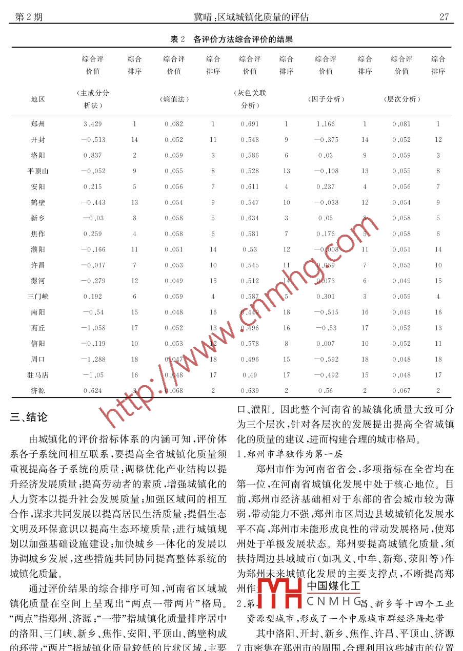 第32卷第2期西安航空學(xué)院學(xué)報(bào)Vol .32 No.22014年3月Journal of Xi' an A eronautical U niversityMar .2014區(qū)域城鎮(zhèn)化質(zhì)量的評估以河南省為例冀晴(鄭州大學(xué)商學(xué)院,河南鄭州450001 )滴要:城鎮(zhèn)化已成為社會經(jīng)濟(jì)發(fā)展以及可持續(xù)發(fā)展的必然趨勢。以河南省為例,并結(jié)合河南省的省情,借鑒河南省城鎮(zhèn)化進(jìn)程中出現(xiàn)的問題對城鎮(zhèn)化質(zhì)量進(jìn)行分析評估。采用多指標(biāo)綜合評價方法,得出評估結(jié)果。關(guān)鍵詞:城鎮(zhèn)化質(zhì)量;評價體系;河南省中圖分類號:F299 .21文獻(xiàn)標(biāo)識碼:A文章編號:1008-9233 (2014 )02-0025-04城鎮(zhèn)化在當(dāng)今全面建設(shè)小康社會過程中的地較衡量各指標(biāo)與現(xiàn)代化水平的目標(biāo)值”]。王家庭位日益凸顯,城鎮(zhèn)化的質(zhì)量更是備受關(guān)注。在快速等建立的評價指標(biāo)體系涵蓋經(jīng)濟(jì)、社會、環(huán)境及城推進(jìn)城鎮(zhèn)化的政策號召下,鄉(xiāng)鎮(zhèn)市民化的人口數(shù)量市化水平四個方面,并對30個大中城市通過主成與日俱增,與此同時,冒進(jìn)式城鎮(zhèn)化問題成為一分分析法進(jìn)行實(shí)證分析”。常阿平則對30個省會大隱患,城鎮(zhèn)化過程中重?cái)?shù)量輕質(zhì)量傾向明顯,伴城市 及直轄市通過因子分析進(jìn)行比較。韓增林隨著交通、環(huán)境和生態(tài)的日益變化,各種城市病凸等通過分別選取我國286個地級市的31個指標(biāo)的顯,這些城鎮(zhèn)化進(jìn)程中的質(zhì)量問題困擾著我國大部樣本數(shù)據(jù),從經(jīng)濟(jì)發(fā)展、基礎(chǔ)設(shè)施、就業(yè)、居民生活、分省份城鎮(zhèn)化的發(fā)展。河南省作為中部大省以及社會發(fā)展、生態(tài)環(huán)境、用地質(zhì)量、創(chuàng)新質(zhì)量和城鄉(xiāng)協(xié)農(nóng)業(yè)大省,亟待解決城鎮(zhèn)化的問題,相對于東西部調(diào)等十個方面探討了城市化質(zhì)量的空間差異特地區(qū),河南省作為人口大省對其研究更具有代表征”。白先春等運(yùn)用綜合評價分析方法提出了測性。因此本文以河南省為例,構(gòu)建城鎮(zhèn)化質(zhì)量的評算城鎮(zhèn)質(zhì)量系統(tǒng)協(xié)調(diào)發(fā)展程度的- - 般計(jì)量模型6]。價指標(biāo)體系,衡量其具有空間聯(lián)系的城市圈的區(qū)域綜觀已有的關(guān)于城鎮(zhèn)化質(zhì)量的研究,研究多為城鎮(zhèn)化質(zhì)量,并根據(jù)評估結(jié)果有針對性地提出提升同一級別城市的比較,樣本數(shù)量由幾個到幾百個不河南省城鎮(zhèn)化質(zhì)量的相應(yīng)措施。這對于加速河南等,建立的指標(biāo)體系多為涵蓋經(jīng)濟(jì)、社會、生態(tài)等方省城鎮(zhèn)化的發(fā)展具有實(shí)際意義,對于其它省份的城面體現(xiàn)城鎮(zhèn)化內(nèi)涵的各類指標(biāo),運(yùn)用的定量分析測鎮(zhèn)化改革具有借鑒意義。度方法多為客觀賦權(quán)法(如主成分分析法、因子分析法、熵值法等)及主觀賦權(quán)法。然而對具有空間-、研究現(xiàn)狀聯(lián)系的城市都市圈的區(qū)域城鎮(zhèn)化質(zhì)量研究不多。目前,國內(nèi)對城鎮(zhèn)化質(zhì)量已進(jìn)行了初步研究。本文將在此基礎(chǔ)上,通過對已有評價指標(biāo)體系的綜葉裕民對我國9個超大城市(擁有300萬以上人口合地” 中國煤化工七內(nèi)涵的多項(xiàng)指標(biāo),并的城市) ,選取反映城市經(jīng)濟(jì)、基礎(chǔ)設(shè)施及人三個方運(yùn)HCNMHG價方法對河南省城鎮(zhèn)面的現(xiàn)代化水平的12個指標(biāo),采用主觀賦權(quán)法比化質(zhì)量進(jìn)行評價 ,開對伴價結(jié)果比較分析,以尋求收稿日期:2014-01-28 .作者簡介:冀晴(1989 - ),女,河南駐馬店人,碩士研究生,研究方向?yàn)榻?jīng)濟(jì)預(yù)測與決策。26西安航空學(xué)院學(xué)報(bào)第32卷最合理的城鎮(zhèn)化質(zhì)量的評價結(jié)果,構(gòu)建合理的城市(- )評價體系格局??紤]影響城鎮(zhèn)化質(zhì)量的多方面的復(fù)合效應(yīng),本.二、河南省市域城鎮(zhèn)化質(zhì)量的評價文從經(jīng)濟(jì)發(fā)展質(zhì)量、社會發(fā)展質(zhì)量、居民生活質(zhì)量、生態(tài)環(huán)境質(zhì)量、基礎(chǔ)設(shè)施質(zhì)量、城鄉(xiāng)協(xié)調(diào)發(fā)展質(zhì)量本文以2011年河南省內(nèi)的鄭州、開封、洛陽、六個方面選取可獲得的20個具體指標(biāo)構(gòu)建城鎮(zhèn)化平頂山、安陽、鶴壁、新鄉(xiāng)、焦作、濮陽、許昌、漯河、質(zhì)量的綜合評價體系。指標(biāo)數(shù)據(jù)源自《河南省統(tǒng)計(jì)三門峽、南陽、商丘、信陽、周口駐馬店、濟(jì)源18個年鑒2012)》”。為了便于不同規(guī)模城市的城鎮(zhèn)化質(zhì)管轄市作為研究對象建立評價體系,對各城市的城量的指標(biāo)比較,多數(shù)指標(biāo)均采用人均指標(biāo),滿足指鎮(zhèn)化質(zhì)量進(jìn)行定量測度并給出對應(yīng)的排序,找出各標(biāo)量綱的一致性。評價指標(biāo)體系如表1所示。城市在推進(jìn)城鎮(zhèn)化過程中的差距。表1城鎮(zhèn)化質(zhì) 量評價體系經(jīng)濟(jì)發(fā)展社會發(fā)展居民生活生態(tài)環(huán)境基礎(chǔ)設(shè)施城鄉(xiāng)協(xié)調(diào)質(zhì)量指標(biāo)發(fā)展指標(biāo)國家財(cái)政性教育經(jīng)費(fèi)