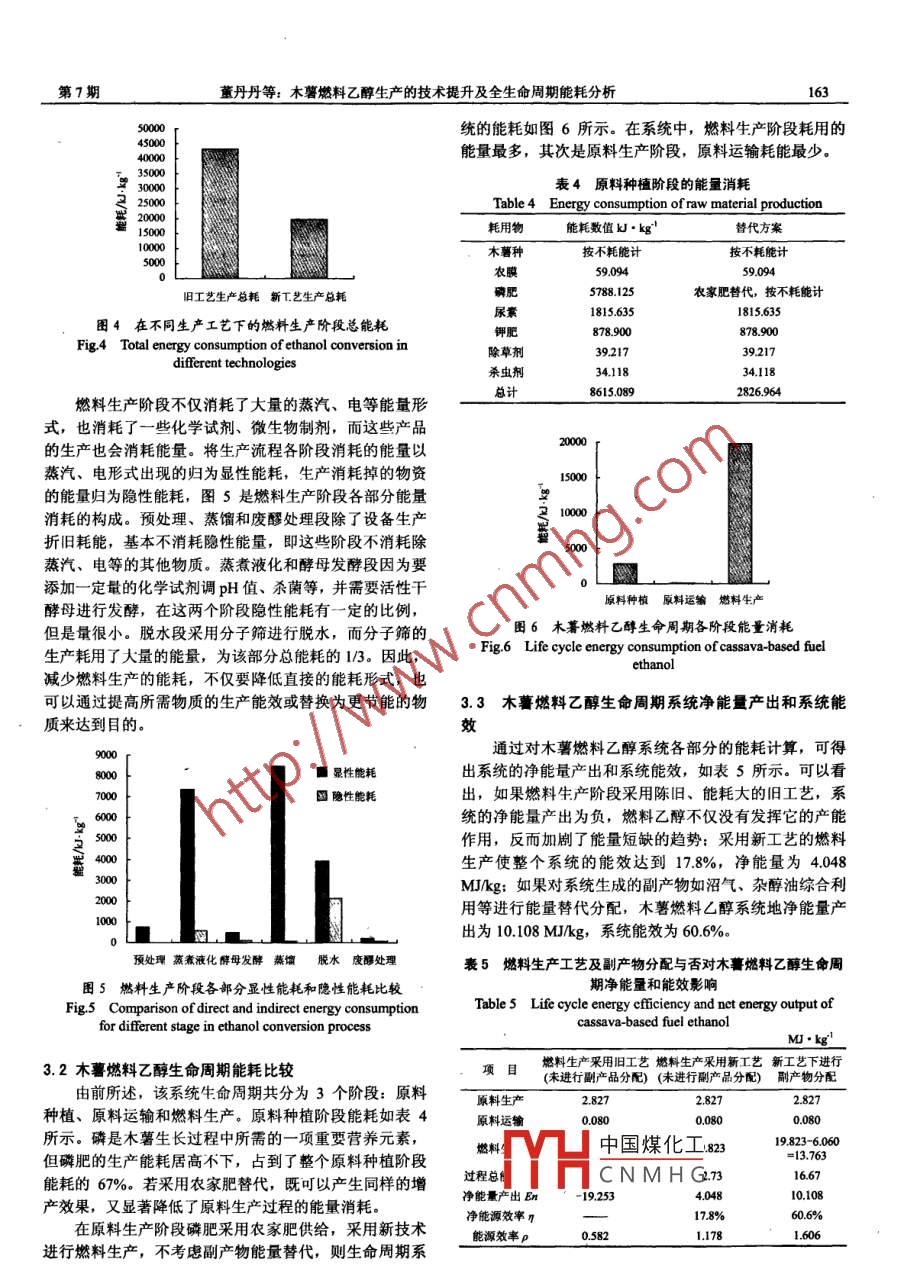 第24卷第7期農(nóng)業(yè)工程學報VoL 24 No. 71602008年7月Transactions of the CSaeJu.2008木薯燃料乙醇生產(chǎn)的技術提升及全生命周期能耗分析董丹丹1,趙黛青1,廖翠萍',陳憲笙2,林琳(1.中國科學院廣州能源研究所,廣州510640;2.廣東中科天元新能源科技有限公司,廣州510640)摘要:發(fā)展燃料乙醇是中國替代能源戰(zhàn)略大框架下的成熟模式,木薯燃料乙醇因為不耗用糧食原料也日益提上發(fā)展日程。該文引入生命周期理論,對木薯燃料乙醇系統(tǒng)的三個階段進行了能耗分析,重點討論了燃料生產(chǎn)階段采用新舊工藝對周期能耗的影響。能耗計算發(fā)現(xiàn),采用新工藝可以較大地增加系統(tǒng)周期的凈能量產(chǎn)出,提高系統(tǒng)的能效;加強副產(chǎn)品的開發(fā),使用農(nóng)家肥替代化肥也可產(chǎn)生同樣的效果關鍵詞:木薯燃料乙醇;生命周期;燃料生產(chǎn)階段;能源效率中圖分類號:TK6文獻標識碼:A文章編號:10026819(2008)-7-016005董丹丹,趙黛青,廖翠萍,等木薯燃料乙醇生產(chǎn)的技術提升及全生命周期能耗分析[J].農(nóng)業(yè)工程學報,2008,24(7):160-164.ith English abstract)0引言食供給形勢造成了壓力。國家發(fā)改委價格司對玉米價格的監(jiān)測數(shù)據(jù)顯示,2006年主產(chǎn)區(qū)玉米每50kg平均出售燃料乙醇是以玉米、小麥、薯類、甘蔗、甜菜等為價格59.28元,比上年提高3.75元,升幅6.8%。繼續(xù)采原料,經(jīng)發(fā)酵、蒸餾制得乙醇,脫水后再添加變性劑變用玉米等糧食作物為生產(chǎn)原料,勢必會引起國內(nèi)國際糧性而成的。在替代能源戰(zhàn)略的大框架下,燃料乙醇已經(jīng)食市場的動蕩。此外,燃料乙醇生產(chǎn)能耗高,生產(chǎn)成本成為替代石油的成熟模式。中國自2002年啟動燃料乙居高不下,只有具備國家補貼的情況下企業(yè)才能生存。醇項目以來,已形成每年102萬t的生產(chǎn)能力,乙醇汽油家現(xiàn)階段針對這兩個問題,首先是鼓勵生產(chǎn)企業(yè)發(fā)展消費量已占全國汽油消費量的20%。中國也已成為世界非糧原料燃料乙醇,其次在逐年降低補貼額度,以促使上繼巴西、美國之后第三大生物燃料乙醇生產(chǎn)國和消費企業(yè)采用先進低能耗乙醇生產(chǎn)技術。木薯是非糧食農(nóng)產(chǎn)國。中國發(fā)展燃料乙醇的初衷是消化陳化糧,卸掉貯糧品,對土質(zhì)的要求低,耐旱、耐貧瘠;采用木薯為原料的巨額財政負擔;隨著化石原料的日漸短缺,國際油價生產(chǎn)燃料乙醇符合中國“不爭糧,不爭(食)油,不爭的大幅波動,燃料乙醇成為替代能源的優(yōu)勢凸顯。而且糖,充分利用邊際性土地(指基本不適合種植糧、棉、汽油中添加乙醇,可以替代普通汽油中含有用于防腐、油等作物的土地)”的糧食發(fā)展戰(zhàn)略S。并且以木薯為原防爆的添加劑MTBE,從而避免了MTBE對地下水和空料生產(chǎn)酒精相對于玉米、小麥、甘蔗等更具有經(jīng)濟性氣的污染,環(huán)境效益相當明顯。實際上燃料乙醇發(fā)展“十木薯生長于亞熱帶地區(qū),對中國南方農(nóng)業(yè)的發(fā)展、提高五”規(guī)劃中提出的“拉動農(nóng)業(yè)、保護環(huán)境、替代能源”三農(nóng)民收入都具有重要意義大戰(zhàn)略已經(jīng)逐步顯現(xiàn)其作用。按照有關規(guī)劃,中國生物本文引入生命周期理論呵( Life Cycle Assessment),燃料產(chǎn)業(yè)發(fā)展將分三個階段:“十一五”實現(xiàn)技術產(chǎn)業(yè)化以廣東地區(qū)木薯燃料乙醇生產(chǎn)為實例,依托廣州中科天“十一五”實現(xiàn)產(chǎn)業(yè)規(guī)?;?2015年以后大發(fā)展。到“十元可再生能源公司的技術支持,對木薯燃料乙醇的全生一五”末期,中國燃料乙醇的年產(chǎn)能將由現(xiàn)在的剛剛超命周期進行了能耗分析。本文首先建立了木薯燃料乙醇過100萬t達到500萬t預計到2020年,中國生物燃料生命周期模型,綜合考慮廣東地區(qū)木薯種植水平、乙醇消費量將占到全部交通燃料的1%左右,建立起具有國轉化技術和能源利用狀況等實際條件,定量評價了木薯際競爭力的生物燃料產(chǎn)業(yè)。燃料乙醇的能源效率和其凈能量產(chǎn)出,并針對不同工藝在燃料乙醇的發(fā)展過程中,也出現(xiàn)了一些問題。隨進行了敏感性分析,進而提出改進方向,為木薯燃料乙著玉米逐步取代陳化糧成為燃料乙醇的主要原料,給糧醇的能量可持續(xù)性發(fā)展提供量化依據(jù)。收稿日期:20070915修訂日期:200804151評價模型基金項目:廣東省軟科學研究項目(No2005B70101040,No2006870103016)作者簡介:董丹丹(1982-),女,河南鶴壁人,研究方向為可再生能源生中國煤化工薯種植、木薯運輸?shù)矫芷谠u價。廣州市天河區(qū)五山能源路2號中科院廣州能源研究所乙醇510640除草HCNMHG個過程消耗了化肥※通訊作者:趙黛青(1958-),江蘇南京人,研究員,主要從事能源利用不、天然氣、水等。本文技術研發(fā)與評價工作,廣州市天河區(qū)五山能源路2號中科院廣州能源研究對生命周期的三大過程的能耗進行了統(tǒng)計,包括原料生FT, 510640. Email: zhaoda@msgiecaccn產(chǎn)、原料運輸和燃料轉化。無水乙醇生產(chǎn)出來直接添加第7期董丹丹等:木薯燃料乙醇生產(chǎn)的技術提升及全生命周期能耗分析變性劑,以10%的體積分數(shù)與汽油混合就可以作為燃料使用。變性和使用階段乙醇幾乎不消耗能量,本文選取2評價方法的系統(