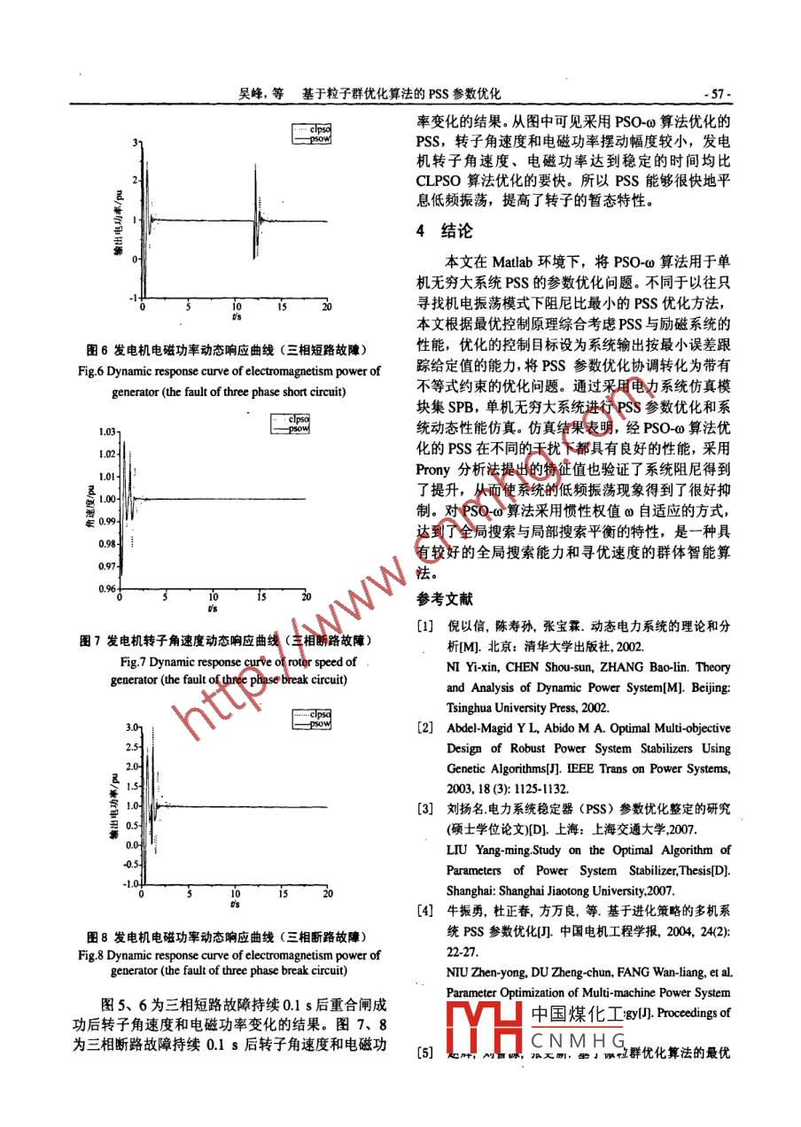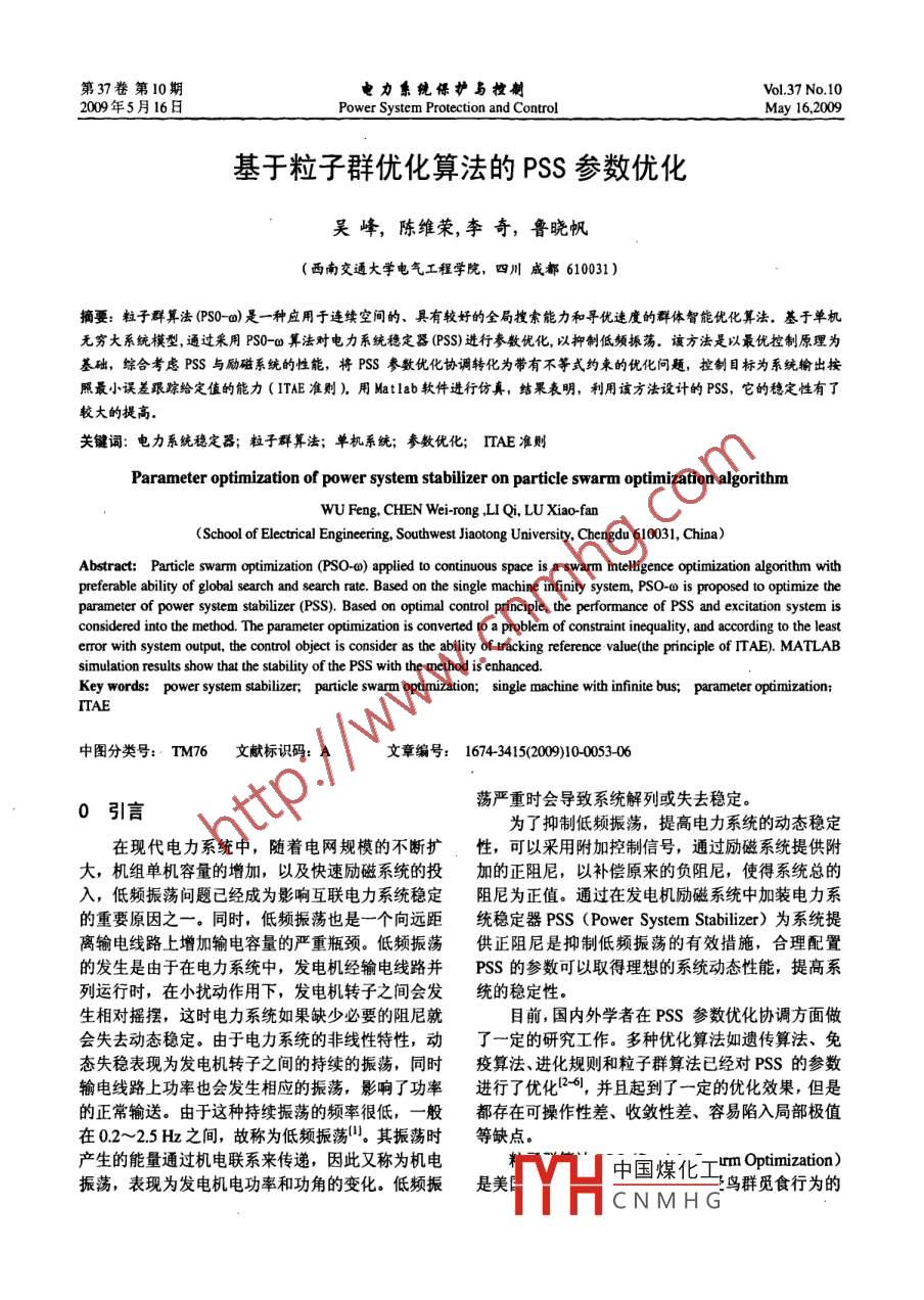 第37卷第10期電力系統(tǒng)保護(hù)與控制Vol.37 No.102009年5月16日Power System Protection and ControlMay 16,2009基于粒子群優(yōu)化算法的PSS參數(shù)優(yōu)化吳峰,陳維榮,李奇,魯曉帆(西南交通大學(xué)電氣工程學(xué)院,四川成都610031 )摘要:粒子群算法(PS0-a)是一種應(yīng)用于連續(xù)空間的、具有較好的全局搜索能力和尋優(yōu)速度的群體智能優(yōu)化算法。基于單機(jī)無窮大系統(tǒng)模型,通過采用PS0-co算法對(duì)電力系統(tǒng)穩(wěn)定器(PSS)進(jìn)行參數(shù)優(yōu)化,以抑制低頻振蕩。該方法是以最優(yōu)控制原理為基礎(chǔ),綜合考慮PSS與勵(lì)磁系統(tǒng)的性能,將PSS參數(shù)優(yōu)化協(xié)調(diào)轉(zhuǎn)化為帶有不等式約柬的優(yōu)化問題,控制目標(biāo)為系統(tǒng)輸出按照最小誤差跟蹤給定值的能力(ITAE準(zhǔn)則)。用Matlab軟件進(jìn)行仿真,結(jié)果表明,利用該方法設(shè)計(jì)的PSS,它的穩(wěn)定性有了較大的提高.關(guān)鍵詞:電力系統(tǒng)穩(wěn)定器;粒子群算法;單機(jī)系統(tǒng);參數(shù)優(yōu)化; ITAE準(zhǔn)則Parameter optimization of power system stabilizer on particle swarm optimization algorithmWU Feng, CHEN Wei-rong ,LI Qi, LU Xiao-fan(School of Electrical Engineering, Southwest Jiaotong University, Chengdu 610031, China)Abstract: Particle swarm optimization (PSO-0) applied to continuous space is a swarm inelligence optimization algorithm withpreferable ability of global search and search rate. Based on the single machine infinity system, PSO-o is proposed to optimize theparameter of power system stabilizer (PSS). Based on optimal control principle, the performance of PSS and excitation system isconsidered into the method. The parameter optimization is converted to a problem of constraint inequality, and according to the leasterror with system output, the control object is consider as the ability of tracking reference value(the principle of ITAE). MATLABsimulation results show that the stability of the PSS with the method is enbanced.Key words:power system stabilizer, particle swarm optimization; single machine with infinite bus; parameter opimization;ITAE中圖分類號(hào): TM76文獻(xiàn)標(biāo)識(shí)碼: A文章編號(hào): 1674-3415(2009)10-0053-06蕩嚴(yán)重時(shí)會(huì)導(dǎo)致系統(tǒng)解列或失去穩(wěn)定。0引言.為了抑制低頻振蕩,提高電力系統(tǒng)的動(dòng)態(tài)穩(wěn)定在現(xiàn)代電力系統(tǒng)中,隨著電網(wǎng)規(guī)模的不斷擴(kuò)性,可以采用附加控制信號(hào),通過勵(lì)磁系統(tǒng)提供附大,機(jī)組單機(jī)容量的增加,以及快速勵(lì)磁系統(tǒng)的投加的正阻尼,以補(bǔ)償原來的負(fù)阻尼,使得系統(tǒng)總的入,低頻振蕩問題已經(jīng)成為影響互聯(lián)電力系統(tǒng)穩(wěn)定阻尼為正值。通過在發(fā)電機(jī)勵(lì)磁系統(tǒng)中加裝電力系的重要原因之一。同時(shí),低頻振蕩也是一個(gè)向遠(yuǎn)距統(tǒng)穩(wěn)定器PSS (Power System Stabilizer)為系統(tǒng)提離輸電線路上增加輸電容量的嚴(yán)重瓶頸。低頻振蕩供正阻尼是抑制低頻振蕩的有效措施,合理配置的發(fā)生是由于在電力系統(tǒng)中,發(fā)電機(jī)經(jīng)輸電線路并PSS的參數(shù)可以取得理想的系統(tǒng)動(dòng)態(tài)性能,提高系列運(yùn)行時(shí),在小擾動(dòng)作用下,發(fā)電機(jī)轉(zhuǎn)子之間會(huì)發(fā)統(tǒng)的穩(wěn)定性。生相對(duì)搖擺,這時(shí)電力系統(tǒng)如果缺少必要的阻尼就目前,國內(nèi)外學(xué)者在PSS參數(shù)優(yōu)化協(xié)調(diào)方面做會(huì)失去動(dòng)態(tài)穩(wěn)定。由于電力系統(tǒng)的非線性特性,動(dòng)了一定的研究工作。多種優(yōu)化算法如遺傳算法、免態(tài)失穩(wěn)表現(xiàn)為發(fā)電機(jī)轉(zhuǎn)子之間的持續(xù)的振蕩,同時(shí)疫算法、進(jìn)化規(guī)則和粒子群算法已經(jīng)對(duì)PSS的參數(shù)輸電線路上功率也會(huì)發(fā)生相應(yīng)的振蕩,影響了功率進(jìn)行了優(yōu)化2-6),并且起到了一定的優(yōu)化效果,但是的正常輸送。由于這種持續(xù)振蕩的頻率很低,- -般都存在可操作性差、收斂性差、容易陷入局部極值在0.2~2.5 Hz之間,故稱為低頻振蕩"。其振蕩時(shí)等缺點(diǎn)。產(chǎn)生的能量通過機(jī)電聯(lián)系來傳遞,因此又稱為機(jī)電中國煤化工umm Optimization)振蕩,表現(xiàn)為發(fā)電機(jī)電功率和功角的變化。低頻振是美E鳥群覓食行為的CNMHG-54-電力系統(tǒng)保護(hù)與控制啟發(fā),于1995年提出的一種生物進(jìn)化算法間。PSO本文PSS采用超前-滯后校正模型,以發(fā)電機(jī)的算法采用速度-位置搜索模型,每個(gè)粒子代表解空間轉(zhuǎn)速偏差A(yù)op為輸入信號(hào),傳遞函數(shù)如下:的一一個(gè)候選解,粒子在搜索空間以一-定的速度飛行,sT。, 1+sT 1+sT3(5)飛行速度根據(jù)飛行經(jīng)驗(yàn)進(jìn)行動(dòng)態(tài)調(diào)整。每個(gè)潛在解1+sTm 1+sTr 1+sT。與粒子運(yùn)行速度相聯(lián)系,該速度不停地根據(jù)粒子經(jīng)式中: U為發(fā)電機(jī)的PSS輸出信號(hào); T。為隔直環(huán)節(jié)驗(yàn)以及與該粒子鄰近的粒子經(jīng)驗(yàn)來調(diào)整大小、方向,的時(shí)間常數(shù): T下T2、 T3、 T4為超前-滯后環(huán)節(jié)的時(shí)總是希望粒子能朝著更好的方向發(fā)展。因此,在搜間常數(shù); K為PSS增益。索過程中全局搜索能力與局部搜索能力的平衡關(guān)系1. 3 PSS優(yōu)化的