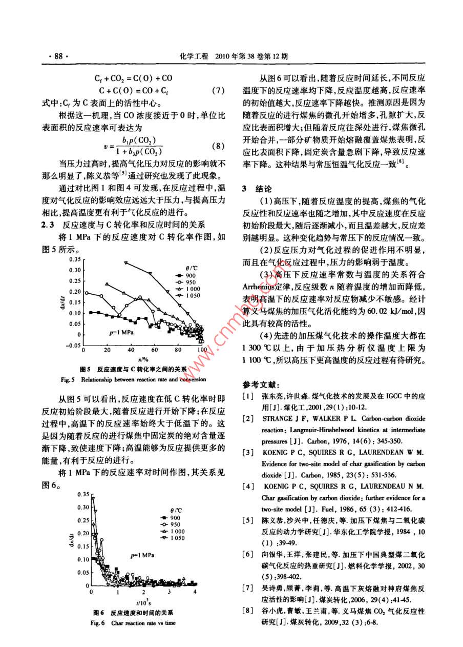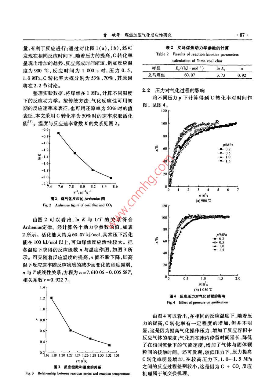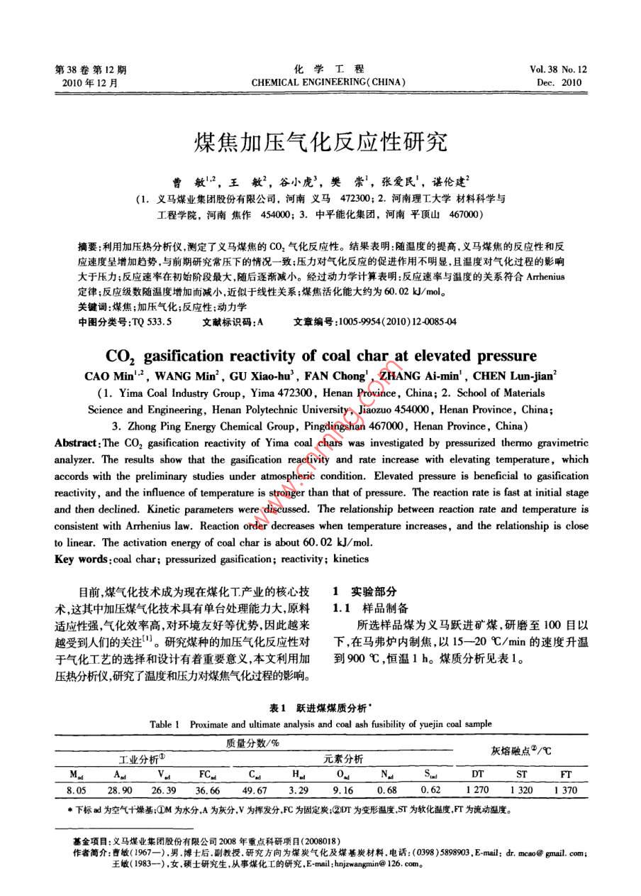 第38卷第12期化學(xué)工君Vol. 38 No. 122010年12月CHEMICAL ENGINEERING( CHINA)Dec. 2010煤焦加壓氣化反應(yīng)性研究曹敏'”,王敏’,谷小虎’,樊崇',張愛(ài)民',諶倫建“(1.義馬煤業(yè)集團(tuán)股份有限公司,河南義馬472300;2. 河南理工大學(xué)材料科學(xué)與工程學(xué)院,河南焦作454000; 3.中平能化集團(tuán),河南平頂山467000)摘要:利用加壓熱分析儀,測(cè)定了義馬煤焦的CO2氣化反應(yīng)性。結(jié)果表明:隨溫度的提高,義馬煤焦的反應(yīng)性和反應(yīng)速度呈增加趨勢(shì),與前期研究常壓下的情況-致;壓力對(duì)氣化反應(yīng)的促進(jìn)作用不明顯,且溫度對(duì)氣化過(guò)程的影響大于壓力;反應(yīng)速率在初始階段最大,隨后逐漸減小。經(jīng)過(guò)動(dòng)力學(xué)計(jì)算表明:反應(yīng)速率與溫度的關(guān)系符合Arhenius定律;反應(yīng)級(jí)數(shù)隨溫度增加而減小,近似于線性關(guān)系;煤焦活化能大約為60. 02 kJ/mol。關(guān)鍵詞:煤焦;加壓氣化;反應(yīng)性;動(dòng)力學(xué)中圖分類號(hào):TQ 533.5文獻(xiàn)標(biāo)識(shí)碼:A文章編號(hào):1005-9954(2010) 12008504CO2 gasification reactivity of coal char at elevated pressureCAO Min'2, WANG Min', GU Xiao-hu', FAN Chong' , ZHANG Ai-min' , CHEN Lun-jian'(1. Yima Coal Industry Group, Yima 472300, Henan Province , China; 2. School of MaterialsScience and Engineering, Henan Polytechnic University, Jiaozuo 454000, Henan Province, China;3. Zhong Ping Energy Chemical Group, Pingdingshan 467000, Henan Province,China)Abstract:The CO2 gasification reactivity of Yima coal chars was investigated by pressurized thermo gravimetricanalyzer. The results show that the gasifcation reactivity and rate increase with elevating temperature, whichaccords with the preliminary studies under atmospheric condition. Elevated pressure is beneficial to gasificationreactivity, and the influence of temperature is stronger than that of pressure. The reaction rate is fast at initial stageand then declined. Kinetic parameters were discussed. The relationship between reaction rate and temperature isconsistent with Arrhenius law. Reaction order decreases when temperature increases,and the relationship is closeto linear. The activation energy of coal char is about 60. 02 kJ/mol.Key words: coal char; pressurized gasification; reactivity; kinetics目前,煤氣化技術(shù)成為現(xiàn)在煤化T產(chǎn)業(yè)的核心技1 實(shí)驗(yàn)部分術(shù),這其中加壓煤氣化技術(shù)具有單臺(tái)處理能力大,原料1.1樣品制備適應(yīng)性強(qiáng),氣化效率高,對(duì)環(huán)境友好等優(yōu)勢(shì),因此越來(lái)所選樣品煤為義馬躍進(jìn)礦煤,研磨至100目以越受到人們的關(guān)注"。研究煤種的加壓氣化反應(yīng)性對(duì)下,在馬弗爐內(nèi)制焦,以15- -20 C/min的速度升溫于氣化工藝的選擇和設(shè)計(jì)有著重要意義,本文利用加到900 C ,恒溫1 h。煤質(zhì)分析見(jiàn)表1。.壓熱分析儀,研究了溫度和壓力對(duì)煤焦氣化過(guò)程的影響。表1躍進(jìn)煤煤質(zhì)分析'Table 1 Proximate and ultimate analysis and coal ash fusility of yuejin coal sample質(zhì)量分?jǐn)?shù)/%灰熔融點(diǎn)*/C工業(yè)分析中元素分析MAuVaFC.CNDTSTFT8.0528.90 26.39 36.66 49. 679.160.680.621 270I 320370*下標(biāo)ad為空氣+燥基;①M(fèi)為水分,A為灰分,V為揮發(fā)分.FC為固定炭;②DI為變形溫度,5T為軟化溫度,FT為流動(dòng)溫度?;痦?xiàng)目:義馬煤業(yè)集團(tuán)股份有限公司2008年重點(diǎn)科研項(xiàng)月(2008018)作者簡(jiǎn)介:曹敏(1967-).男,博士后.副教授.研究方向?yàn)槊禾繗饣懊夯坎牧?電話: (0398 )5898903. E-mil: dr. mceo@ gmail. com;王敏(1983--) ,女.碩士研究生.從事煤化工的研究. E-mail:hnjzwangmin@ 126. com?!?6.化學(xué)工程2010年第38卷第12期1.2實(shí)驗(yàn)方法In元=lnK+nln(1-x)(5)實(shí)驗(yàn)采用美國(guó)Thermo Cahn公司TherMax 500” du加壓熱分析儀,保護(hù)氣為N2 ,升溫階段反應(yīng)氣為N2,把ln和ln(1 -x)作圖得直線,截距為ln K,氣化時(shí)反應(yīng)氣為CO2。將義馬煤焦(40 mg左右)裝斜率為n。將式(4)兩邊取對(duì)數(shù)可得人坩堝中,以25C/min升至設(shè)定的反應(yīng)溫度,恒溫p(CO2)E,3 min待溫度穩(wěn)定后,迅速將反應(yīng)氣N2切換成CO2,lnK=lm[AoI+apCO,)] -RT(6)進(jìn)行氣化反應(yīng)。恒定氣化反應(yīng)溫度分別為900,把InK和1/T作圖得直線,截距為950,1 000,1 050 C ,反應(yīng)壓力分別為0.2,0.5,1.0,E.1.5 MPa。In[orapco,],斜率為-R°1.3 計(jì)算碳轉(zhuǎn)化率根據(jù)實(shí)驗(yàn)數(shù)據(jù)按式(1)計(jì)算氣化反應(yīng)C轉(zhuǎn)化率:2結(jié)果與討論mo-m,x= m[1 -w(H,0) -切、-wv](1)2.1溫度對(duì)氣化過(guò)程的影響將不同溫度θ下計(jì)算得到C轉(zhuǎn)化率對(duì)時(shí)間作式中:mo為氣化反應(yīng)初始質(zhì)量;m,為氣化反應(yīng)l時(shí)圖,見(jiàn)圖1??痰馁|(zhì)量;m為樣品初始質(zhì)量;w(H20)為樣品水分質(zhì)量分?jǐn)?shù),% ;w\為樣品灰分質(zhì)量分?jǐn)?shù), % ;wv為樣100品揮發(fā)分質(zhì)量分?jǐn)?shù),%。將x對(duì)相應(yīng)的反應(yīng)時(shí)間求一階微分,得到氣化80-θrC反應(yīng)速率等。瓷60-9001.4 計(jì)算反應(yīng)動(dòng)力學(xué)參數(shù)4(古1000平1050反應(yīng)動(dòng)力學(xué)方面,研究者(25)認(rèn)為C與CO2的反應(yīng)速率可用式(2)來(lái)表述。b,p(CO2)56"=1+b2p(CO) +bsp(CO2)(2)1/10s(a)0.5 MPa式中:為單位比表面積的反應(yīng)速率;p(CO2)和120rp(C0)為CO2和CO的分壓;b1,b2和b3分別為表面氧化物的分解生成CO并逸人氣相及CO的