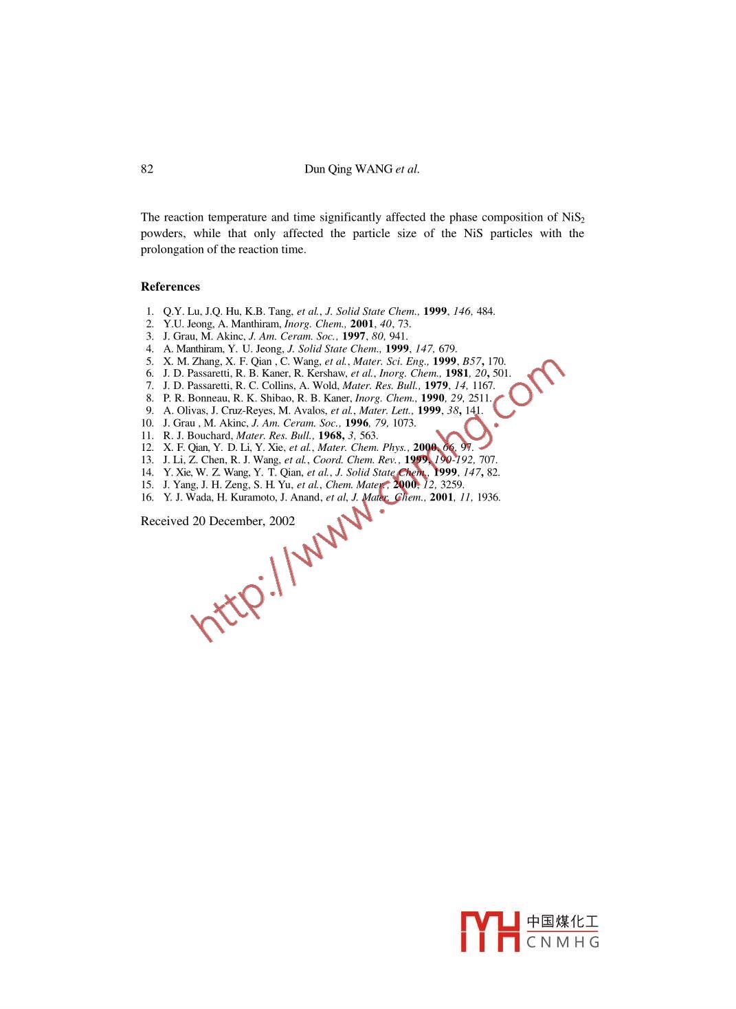 Chinese Chemical Letters Vol. 15, No. 1, pp 79- 82 , 200479htp://ww.imm.ac. cn/journal/ccl.htmlSynthesis of Nickel Sulfide Particles by Solvothermal ProcessDun Qing WANG.2 , Dai Rong CHEN' *, Xiu Ling JIAO'Department of Chemistry, Shandong University, Jinan 250100Department of Chemistry, Dezhou College, Dezhou 253000A bstract: Pyrite nickel disulfide and millerite nickel monosulfide have been successfully preparedby solvothermal method based on the reaction of Ni(NO3)26H2O and H2NC(S)NH2 in benzene andethylenediamine (EDA). The final products were characterized by X-ray powder diffraction(XRD), transmission electron microscopy (TEM), scanning electron microscopy (SEM). Theeffects of the solvent, reaction temperature and time on the morphology and phase of the productshave been discussed.Keywords: Chalcogenides, solvothermnal synthesis, X-ray diffaction analysis.Sulfides of many transition metals show electronic and optical properties such assemiconductivity and photoconductivity 12 For example, nickel sulfide is a potentialtransformation toughening agent for semiconductor materials 3, while nickel disulfideadopts the pyrite structure and exhibits semiconducting properties . Thus, the synthesisof the 3d transition metal sulfides has attracted great interests for several decades.Normally, these sulfides are prepared through stoichiometric amount of the metal andsulfur heated in evacuated and sealed quartz ampoules at 500-1000°C 5. However, thelow melting point and volatilization of sulfur in some cases may make the control ofcomposition difficult, and then several low temperature routes to group VIIItransition-metal disulfides were recently reportedFor the preparation of sulfides ofnickel, several techniques, such as solid-state reaction 8, chemical vapor transport 39.10,and liquid phase technique 35,9-12, have been developed.t is reported thatwell-crystallized nickel sulfides could be obtained through the solvothermal technique,but the Na+ was easily adsorbed on the nanocrystallite to contaminate the product. Inthis work, pyrite nickel disulfide nanoparticles and millerite nickel monosulfide withmicrometer size have been obtained through solvothermal process based on the reactionof Ni(NO3)26H2O and H2NC(S)NH2. The novel pathway effectively prevents thproduct from the contaminating of the Nat ions.Analytical grade solvents and reagents were applied as raw materials. In a typicalreaction, stoichiometric Ni(NO3)2 6H2O and thiourea were added into 11 mL benzene orEDA and then poured into a 15 mL Teflon- lined autoclave. Maintaining at 160-200°Cfor 12-30 h, the autoclave was cooled to room temperature. A black powder wasE-mail: cdr@ sdu.edu.cn.中國(guó)煤化工MHCNMH G.80Dun Qing WANG et al.collected by filtration, washed several times with absolute ethanol and distilled water andair-dried at ambient temperature.XRD patterns were recorded on a Rigaku D/MAX2200PC diffractometer with Cu-Ka radiation (n=0.15418 nm) and graphitemonochromator. JEM- 100 transmission electron microscopy and Hitachi S-520scanning electron microscopy were used to observe the morphology and size of theparticles.Because the interaction between the different solvents and N4 + is different, varioussulfides of nickel were obtained in different solvents. When benzene was selected assolvent, pure NiS2 was obtained, while pure NiS formed in EDA.Figure 1 a shows the XRD pattern of pure NS2 sample. All the peaks can beindexed as the pyrite nickel disulfide (JCPDS: 11-99). The crystalline size of thesample was about 29 nm from the full-width at half maximum (FWHM) of the strongestdiffraction peaks. The reaction time and temperature have an important effect on thephase composition of products during the solvothermal synthesis of NiS2 powders. Theoptimal condition is 180-200°C for 16-30 h. Lower temperature or shorter time leads toan incomplete reaction and other phases, such as tetrahedral Nis or polydymite NisS4(Figure 1b), millerite Nis and nickel sulfide NiS at higher temperature (Figure 1 c,d).It is likely that NisS4 decomposes to millerite NiS and tetrahedral Nis at 200°C sinceNisS4 is metastable'. Prolonging the reaction time to 16h at 180°C or 18 h at 200°C,only the pyrite NiS2 particles formed indicated by XRD patterns. It can be seen fromFigure 3a that the prepared NiS2 are spherical particles with the size of ca. 20 nm. Butthe particles tend to aggregate.The reaction was significantly influenced by the coordinating ability of the solvent.If the solvent is EDA at the same condition, pure phase of NiS was obtained asdemonstrated in Figure 2. All the peaks are indexed to millerite nickel sulfide (JCPDS:12-41). This is different from the results of reference 12, in which spherical and cubicshape NiS2 were obtained using the same precursor (NiSO4 6H2O with Na2S3) in benzeneor EDA at 130°C for 8-12 h. In their experiments EDA was supposed as template forinorganic ion self-assembling and growth, while benzene operated as the solvent. EDA,with strong N-chelation ability and basicity acts as a bidentate ligand to form a relativelystable Ni2+ complex cation just like [Ni(EDA);]2+13, which is a purple solution at roomtemperature. The complex cation formed usually acts as a template which possiblyincreases the reactivity of Ni (I), promoting the reactions 14. Although there wasthiourea in the solution, the coordination ability of thiourea is much smaller than that ofEDA 15. The preparation process of NiS may be proposed as a liquid reaction: Firstly,H2NC(S)NH2 is soluble in EDA at room temperature and decomposed to produce S- inthe base environment 16. Then [Ni(EDA)3] 2+ and S- were reacted to produce NiSpowder.The whole process may be expressed as follows:H2NC(S)NH2→s2Ni2+ + 3EDA→[Ni(EDA)3]2+[Ni(EDA)3]2++S2-NiS↓+ 3EDAIn our experiment, the optimal condition to prepare NiS was reacting at 200°C formore than 6 h. When the temperature was lower than 160°C, the reaction could notinitiate even the heating time was 30 