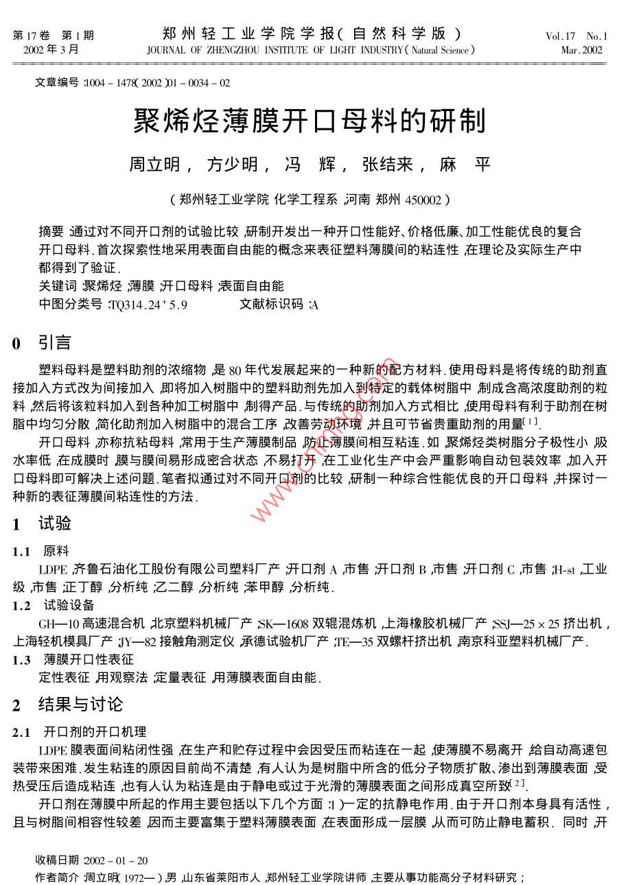第17卷第1期鄭州輕工業(yè)學(xué)院學(xué)報(bào)(自然科學(xué)版)Vol.17 No.12002年3月JOURNAL OF ZHENGZHOU INSTTTUTE OF LICHT INDUSTRY( Natural Science )Mar. 2002文章編號(hào):1004- 1478( 2002 )1 - 0034- 02聚烯烴薄膜開(kāi)口母料的研制周立明,方少明,馮輝,張結(jié)來(lái),麻平(鄭州輕工業(yè)學(xué)院化學(xué)工程系河南鄭州450002 )摘要通過(guò)對(duì)不同開(kāi)口劑的試驗(yàn)比較研制開(kāi)發(fā)出-種開(kāi)口性能好、價(jià)格低廉、加工性能優(yōu)良的復(fù)合開(kāi)口母料.首次探索性地采用表面自由能的概念來(lái)表征塑料薄膜間的粘連性在理論及實(shí)際生產(chǎn)中都得到了驗(yàn)證.關(guān)鍵詞聚烯烴薄膜開(kāi)口母料表面自由能中圖分類(lèi)號(hào):TQ314.24*5.9文獻(xiàn)標(biāo)識(shí)碼:A0引言塑料母料是塑料助劑的濃縮物是80年代發(fā)展起來(lái)的一種新的配方材料.使用母料是將傳統(tǒng)的助劑直接加入方式改為間接加入,即將加入樹(shù)脂中的塑料助劑先加入到特定的載體樹(shù)脂中制成含高濃度助劑的粒料然后將該粒料加入到各種加工樹(shù)脂中制得產(chǎn)品.與傳統(tǒng)的助劑加入方式相比使用母料有利于助劑在樹(shù)脂中均勻分散簡(jiǎn)化助劑加入樹(shù)脂中的混合工序改善勞動(dòng)環(huán)境并且可節(jié)省貴重助劑的用量[ 1].開(kāi)口母料亦稱(chēng)抗粘母料常用于生產(chǎn)薄膜制品防止薄膜間相互粘連.如聚烯烴類(lèi)樹(shù)脂分子極性小吸水率低,在成膜時(shí)膜與膜間易形成密合狀態(tài)不易打開(kāi)在工業(yè)化生產(chǎn)中會(huì)嚴(yán)重影響自動(dòng)包裝效率加入開(kāi)口母料即可解決上述問(wèn)題.筆者擬通過(guò)對(duì)不同開(kāi)口劑的比較研制一種綜合性能優(yōu)良的開(kāi)口母料并探討一種新的表征薄膜間粘連性的方法.1試驗(yàn)1.1原料LDPE齊魯石油化工股份有限公司塑料廠產(chǎn);開(kāi)口劑A ,市售;開(kāi)口劑B市售;開(kāi)口劑C市售;H-st 工業(yè)級(jí)市售正丁醇分析純;乙二醇分析純苯甲醇分析純.1.2試驗(yàn)設(shè)備GH- -10高速混合機(jī)北京塑料機(jī)械廠產(chǎn)SK- -1608 雙輥混煉機(jī)r上海橡膠機(jī)械廠產(chǎn)SSJ- 25 x 25擠出機(jī),上海輕機(jī)模具廠產(chǎn);JY- -82 接觸角測(cè)定儀承德試驗(yàn)機(jī)廠產(chǎn),TE- -35 雙螺桿擠出機(jī)南京科亞塑料機(jī)械廠產(chǎn).1.3薄膜開(kāi)口性表征定性表征用觀察法;定量表征用薄膜表面自由能.2結(jié)果 與討論2.1開(kāi)口劑的開(kāi)口機(jī)理LDPE膜表面間粘閉性強(qiáng)在生產(chǎn)和貯存過(guò)程中會(huì)因受壓而粘連在-起使薄膜不易離開(kāi)給自動(dòng)高速包裝帶來(lái)困難.發(fā)生粘連的原因目前尚不清楚有人認(rèn)為是樹(shù)脂中所含的低分子物質(zhì)擴(kuò)散、滲出到薄膜表面受熱受壓后造成粘連也有人認(rèn)為粘連是由于靜電或過(guò)于光滑的薄膜表面之間形成真空所致2].開(kāi)口劑在薄膜中所起的作用主要包括以下幾個(gè)方面: )-定的抗靜電作用.由于開(kāi)口劑本身具有活性,且與樹(shù)脂間相容性較差,因而主要富集于塑料薄膜表面在表面形成-層膜,從而可防止靜電蓄積.同時(shí)開(kāi)收稿日期2002 - 01-20作者簡(jiǎn)介周立明1972- ) 男山東省萊陽(yáng)市人鄭州輕工業(yè)學(xué)院講師主要從事功能高分子材料研究;萬(wàn)方張結(jié)來(lái)麻平系鄭州輕工業(yè)學(xué)院化學(xué)工程系高分子材料專(zhuān)業(yè)2001屆畢業(yè)生.第1期周立明等聚烯烴薄膜開(kāi)口母料的研制口劑賦予材料表面-定的潤(rùn)滑性降低其摩擦系數(shù),從而可抑制或減少靜電荷的產(chǎn)生.2表面活性劑的作用.由于開(kāi)口劑的加入使得體系的表面自由能降低.表面自由能即增加單位表面積所做的功此值降低說(shuō)明增加其表面積變得容易,因而薄膜容易揭開(kāi)即開(kāi)口性好不易粘連2].2.2利用表面自由能表征塑料薄膜間粘連性的理論依據(jù)3]Eisman等曾做過(guò)大量系統(tǒng)的研究低能表面潤(rùn)濕的工作他們發(fā)現(xiàn)增塑劑的有機(jī)高聚物表面前進(jìn)角與后退角相等,而且接觸角數(shù)據(jù)有很好的重復(fù)性.這說(shuō)明這些表面接近理想表面與液體-樣其表面自由能與表面張力在數(shù)值.上是一致的.由潤(rùn)濕方程可知4]固體的表面自由能越小越不易于被液體所潤(rùn)濕接觸角越大而表面自由能越小增加單位表面積所做的功就越小薄膜越易于開(kāi)口.所以,只要測(cè)得薄膜與同系有機(jī)液體的接觸角,即可判斷出開(kāi)口性的優(yōu)劣.2.3各種助劑對(duì)開(kāi)口性的影響根據(jù)開(kāi)口劑的開(kāi)口機(jī)理結(jié)合有關(guān)資料參考配方初擬配方如表1所示.各取上述配方母料用于PE吹膜并測(cè)定所得薄膜的接觸角所得結(jié)果如表2所示.表1 開(kāi)口母料基本配方由表1表2可知:未加開(kāi)口母料同加開(kāi)口母料后所制薄膜載體樹(shù)脂開(kāi)口劑/g分 散劑相比前者接觸角小其薄膜表面自由能比后者大,而加入開(kāi)口母配方號(hào)/\BC料后薄膜的開(kāi)口性變好.2 )配方不同所測(cè)得的接觸角不同,因6:30而其開(kāi)口性不同.3比較5組配方可知開(kāi)口劑A B的開(kāi)口效果22065很好.但開(kāi)口劑A熔點(diǎn)低油性大不易加工,且價(jià)格昂貴開(kāi)口劑15 15B若大量加入會(huì)使產(chǎn)品外觀受