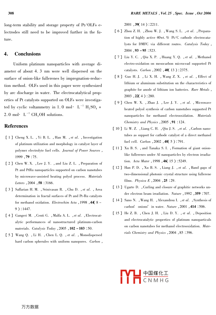 RARE METALS .Vol. 25 ,Spec. Issue , Oct 2006 ,p. 305Pt/ onion-like fullerenes as catalyst for direct methanol fuel cellGUO Jumjie2) ,YANG Xiaowei'2) , YAO Yanlit 2) ,WANG Xiaomin' 2) ,LIU Xuguang) ,and XU Bingshe' 2)1 ) College of Materials Science and Engineering , Taiyuan University of Technology ,Taiyuan 0300242 ) Key Laboratory of Interface Science and Engineering in Advanced Materials , Ministry of Education ,Taiyuan University of Technolo-gy ,Taiyuan 030024 , China( Received 2006-06-25 )Abstract : Onion-like fullerenes synthesized by are discharge in water were used as support of Pt nanoparticles as electro-catalytic materials for direct methanol fuel cell. Uniform platinum nanoparticles with the average diameter of about 4.3 nmwere well dispersed on the surface of onion-like fullerenes by impregnation-reduction method. The morphologies and micro-structures of the as-prepared composites were studied by means of XRD and TEM. Electrochemical analysis shows that thiskind of nano material may be an excellent candidate to be used as the support of catalyst for methanol electrochemical oxi-dation.Key words : DMFC iarc discharge ; onion-like fullerenes ; electrochemical properties[ This work was financially supported by National Basic Research Program of China ( No. 2004CB217808 ) ,National .Natural Science Foundation of China ( No. 20471041 ) , Key Project of National Natural Science Foundation of Chi-na( No. 90306014 ) , Natural Science Foundation of Shanxi Province ( No. 20051018 ) and Shanxi Research Fundfor Returned Scholars ( No. 200428 200523 ). ]that Pt , Ru and PtRu deposited on CNTs have better1. Introductionperformance than other carbon-supported catalyst[ 9-Noble metal nanoparticles , such as Pt and Ru,10 ]are unique materials and have a broad application asRecently , the appearance of novel carbon materi-electrocatalysts in the direct methanol fuel cell ( DM-als provides new choices of carbon supports[ 10 ]. YetFC [ 1-3 ] To improve the performance of the directthe synthesis of Pt nanoparticles with uniform size andmethanol fuel cell( DMFC ) , intense efforts have beengood dispersion over the carbon supports as an electro-devoted towards the development of the electrocatalystscatalytic materials remains to be a challenging work.[4 ] It has been shown that nanometer-sized Pt parti-Onion-like fullerenes( OLFs )[ 11-12 ] have atcles with a high density of active sites usually exhibittracted great attention from both a fundamental and anfavorable catalytic properties. In addition to catalystapplied point of view since their discovery[ 13 ]preparation , the choice of a suitable carbon support isIn this paper , OLFs prepared by arc discharge ina factor that may affect the performance of supportedwate中國(guó)煤化Isupport of Pt nanoparti-catalysts. It has been proved that the structure of thecl:IYHCN M H Gpaticles were preparedcarbon support[ 5-8 ] can influence the structure of theby the method of impregnation reduction with formal-catalyst layer and , as a result , the electrochemical .dehyde as reducing agent. The morphologies and mi-properties of the catalyst. For instance , it was found .crostructure of Pt/ OLFs composite nanoparticles wereCorresponding aJ BingsheE-mail : xubs@ public. ty. sx. cn306RARE METALS , Vol. 25 ,Spec. Issue , Oct 2006observed on a high-resolution transmission electron mi-High-resolution transmission electron microscopycroscope( HRTEM ) and X-ray diffraction( XRD ).( HRTEM ) images were obtained on a JEOL JEM-The object of the present work was to study the proba-2010. X-ray diffraction ( XRD ) measurements werebility of PvVOLFs as the catalyst of DMFC.carried out on a D/ max-3C X-ray diffractometer usinga Cu Ka source operating at 30 kV and 200 mA to2. Experimentalcharacterize the structure of the Pt/OLFs.2.1. Synthesis and characterization of Pt/OLFs .2.2. Preparation and characterization of elec-catalyststrodesHigh-quality OLFs were synthesized by arc dis-Electrochemical experiments of the as-preparedcharge in water. Our apparatus consisted of two graph-20wt. % Pv/C catalysts were carried out on an electro-ite electrodes submerged to a depth of 8 cm below wa-chemical interface ( Autolab PGSTAT302 ). A stand-ter surface in a glass container. The arc current andard three-electrode cell was used with saturated calo-voltage could be altered between 50 A and 22-28 V ,respectively. The synthesis details of OLFs may bemel electrode ( SCE ) as the reference electrode andplatinum foil as the counter electrode. Working elec-found elsewhere[ 14 ] For the better anchoring of thetrode was made of a paste on a glassy carbon platePt nanoparticles , as-produced OLFs were oxidized inwith a diameter of4 mm , which was mixed with a so-concentrated HNO, for4 h.lution of perfluorosulfonic acid( 5wt. % , Nafion , DuA typical impregnation-reduction method was em-Pont )( Acros Inc. ) and electrocatalyst. The Pt load-ployed to prepare OLFs- supported Pt catalyst withing on the electrodes was ca. 0.12 mg° cm-All theformaldehyde as reducing agent. For synthesizing Pv/OLFs with the Pt loading of 20wt. % ,a 0. 060 g ofpotentials in this study are reported with respect tcSCE. The electrolyte solution was 2. 0 mol. IOLFs were uniformly dispersed in 2.1 ml of an aque-CH20H/1.0 mol. L-1 H2SO4 , which was preparedous solution of H2PtCl。( 7.4 g° L-' ) by ultrasound.from high-purity sulfuric , methanol and distilled wa-Then 20 ml of the formaldehyde was dropped slowlyter.into the H2PtCl。solution at 333 K and0.8 ml of H2O2( 30v/o ) was added to stabilize the Pt particles undercontinuous stirring for 5 h. The solid product was3. Results and discussionrinsed with deionized water repeatedly and filtered.3.1. Morphology and structure of PV/OLFs cata-Finally , the product was dried at 343 K for 12 h in alystsvacum oven. The final P/OLFs catalyst with a metalFig.1 shows TEM images of synthesizedloading of 20wt. % was obtained.Pt / OLFs catalysts ,It can be found that the(田),(b中