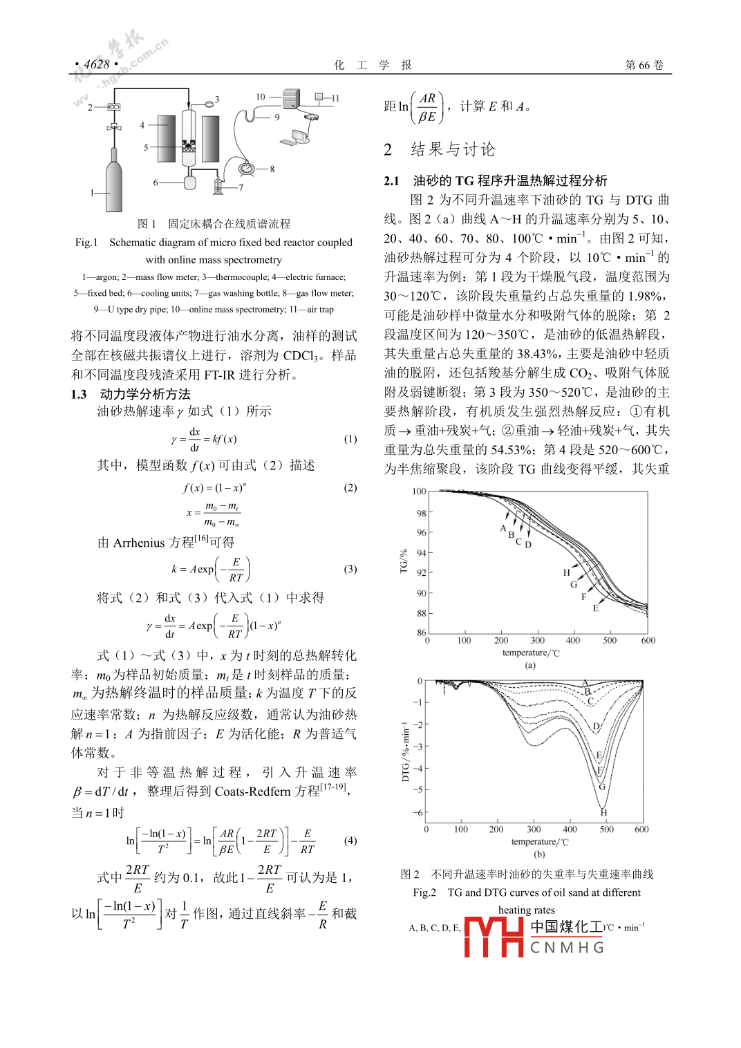 第66卷第11期化工學(xué)報(bào)Vol. 66 No 112015年1I月CIESC Journalovember 2015研究論文新疆托里油砂分段熱解機(jī)理白翔,馬鳳云,劉景梅,鐘梅(新疆大學(xué)化學(xué)化工學(xué)院,新疆烏魯木齊830046)摘要:在熱重分析儀中考察了不同升溫速率下油砂的熱解特性,結(jié)果表眀:油砂樣品失重過程分為少量氣體脫附低溫?zé)峤?、主要熱解、半焦縮聚4個(gè)階段。通過微型固定床與在線質(zhì)譜耦合測得的氣體釋放順序?yàn)镃O2、COC2H、CH4和H2,所對應(yīng)的初釋溫度分別為155、178、146、174、354℃。結(jié)合核磁和紅外對不同溫度段液固產(chǎn)物的化學(xué)結(jié)構(gòu)進(jìn)行分析,發(fā)現(xiàn)350℃前主要是油砂中輕質(zhì)油脫附,還包括羧基和烷基側(cè)鏈的斷裂,輕質(zhì)油品中芳碳率達(dá)792%;350~520℃之間為油砂的主要熱解階段,油砂油結(jié)構(gòu)中芳碳率為23.51%。據(jù) Coats- Redfern法計(jì)算得到油砂低溫?zé)峤夂椭饕獰峤舛蔚幕罨芊謩e為27.63和90.30kJ·mol',說明開環(huán)與裂解反應(yīng)所需活化能大于油砂油脫附、羧基分解和弱鍵斷裂反應(yīng)的活化能,揭示了分段熱解機(jī)理。關(guān)鍵詞:油砂;熱重分析:氣體逸岀順序;核磁和紅外分析;熱解機(jī)理DOI:10.11949/isn.0438-115720150493中圖分類號文獻(xiàn)標(biāo)志碼:A文章編號:0438-1157(2015)11-4626-08Segmenting pyrolysis mechanism of Tuoli oil sand in XinjiangBAI Xiang, MA Fengyun, LIU Jingmei, ZHONG MeiCollege of Chemical and Engineering, Xinjiang University, Urumqi 830046, Xinjiang, China)Abstract: The pyrolysis characteristics of oil sand at different heating rate was investigated by using athermogravimetric analyzer. The results showed that the mass loss of oil sand sample contained four processesdesorption, low temperature pyrolysis, main pyrolysis and char condensation. The evolution order of CO2, COC2H6, CHa and H2 was determined via the micro fixed bed reactor coupled with mass spectra analyzer, and thecorresponding initial releasing temperature were 155, 178, 146, 174 and 354C, respectively. The composition andchemical structure parameters of liquid and solid products in different temperature ranges were studied by nmrspectroscopy and IR spectrometry. The results showed that the principle reaction before 350C was desorption oflight oil, in which the aromatic carbon ratio amounted to 7.92% including the breaking of carboxylic and alkylside chains. The oil sand pyrolysis process mainly occurred in the temperature range of 350--520C. The aromaticcarbon ratio of the obtained pyrolysis oil was 23.51%. By using Coats-Redfern method, the correspondingactivation energy of low temperature pyrolysis and main pyrolysis process were 27.63 and 90.30 kJ molrespectively, indicating that the activation energy of ring-opening and cracking reaction was higher than that ofdesorption of oil sand, decomposition of carboxyl and breaking of the weak bondsKey words: oil sand; pyrolysis; gas evolution order; NMR and IR analysis; pyrolysis mechanism2015-04-17收到初稿,2015-08-10收到修改稿。Received date: 2015-04-17聯(lián)系人:鐘梅。第一作者:白翔(1988—),男,碩士研究生。CorrespondingauthorpRof.ZhoNgMei,zhongmei0504@126.com基金項(xiàng)目:新疆維吾爾自治區(qū)高校科研基金項(xiàng)目( XJEDU2014003Foundation itethe University Scientific ResearchFoundation of Xinjian中國煤化工20141003CNMHG第11期白翔等:新疆托里油砂分段熱解機(jī)理4627能,驗(yàn)證了油砂熱解斷鍵的難易程度,從而為油砂低溫?zé)峤饧夹g(shù)提供基礎(chǔ)參數(shù)。中國能源結(jié)構(gòu)為“富煤、貧油、少氣”,2014年原油對外依存度已達(dá)596%。故此,國家對非常規(guī)油1實(shí)驗(yàn)部分氣資源的開發(fā)愈來愈重視。油砂因其儲量豐富、分布1.1樣品集中等特點(diǎn)成為石油資源的有益補(bǔ)充。油砂資源的油砂樣取自中國新疆托里二區(qū)油砂礦,其工業(yè)分開發(fā)利用,將對中國能源戰(zhàn)略安全起到積極的作用。砂的提油工藝包括水熱洗法叮、溶劑萃取法24析和元素分析分別采用國標(biāo)GB/T212-2001和元素和低溫?zé)峤夥é堑?。與前兩種方法相比,低溫?zé)峤夥治鰞x測定( Thermo Flash ea-1112, Thermo finnigan節(jié)水、節(jié)能和減排 Corporation),結(jié)果如表1所示。油砂樣品中有機(jī)質(zhì)等特點(diǎn)。王擎等考察了不同干餾終溫下印尼油砂熱含量(干基)為914%(質(zhì)量)。其中,干燥無灰基解產(chǎn)物,在150℃氣體產(chǎn)率達(dá)0.52%,通過核磁分析固定碳含量僅為21.2%(質(zhì)量)。該樣品中HC高了油砂熱解油,發(fā)現(xiàn)隨溫度的升高,芳碳率變化較小,達(dá)1.99,說明熱解產(chǎn)物中油產(chǎn)率較高。實(shí)驗(yàn)所用的芳碳和環(huán)烷碳含量減少。孫楠等研究了扎賚特旗油油砂樣磨至粒徑≤74m,在105℃下干燥2h除去砂,當(dāng)反應(yīng)溫度高于540℃時(shí),油砂二次裂解反應(yīng)加水分,密封干燥保存待用劇,縮合成焦炭,裂解成小分子。Meng等對圖牧1.2實(shí)驗(yàn)儀器與方法吉油砂熱解特性及熱解干餾提油法進(jìn)行了系統(tǒng)研究,實(shí)驗(yàn)采用的主要儀器有SDTQ600熱重分析儀發(fā)現(xiàn)350~550℃范圍內(nèi)油砂的失重量最大,520℃時(shí)(美國TA公司)、LCDl00m在線質(zhì)譜(美國油砂熱解液體產(chǎn)率達(dá)到最大為80.4%(mass,daf),AMETEK公司)、GC-4000A氣相色譜(東西電子研究表明,在較低溫度下聚合物之間的-CH2-CH2、有限公司)、 Varian Inova-400超導(dǎo)核磁共振譜儀(美CH2-O、-O等橋鍵,受熱易裂解生成自國Mman公司)、 EQUINOX-55傅里葉變換紅外