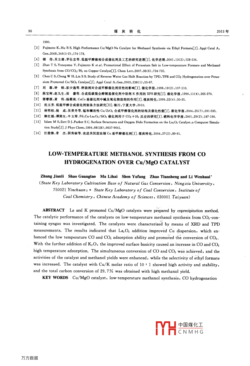 Cu/MgO催化劑CO加氫低溫甲醇合成研究