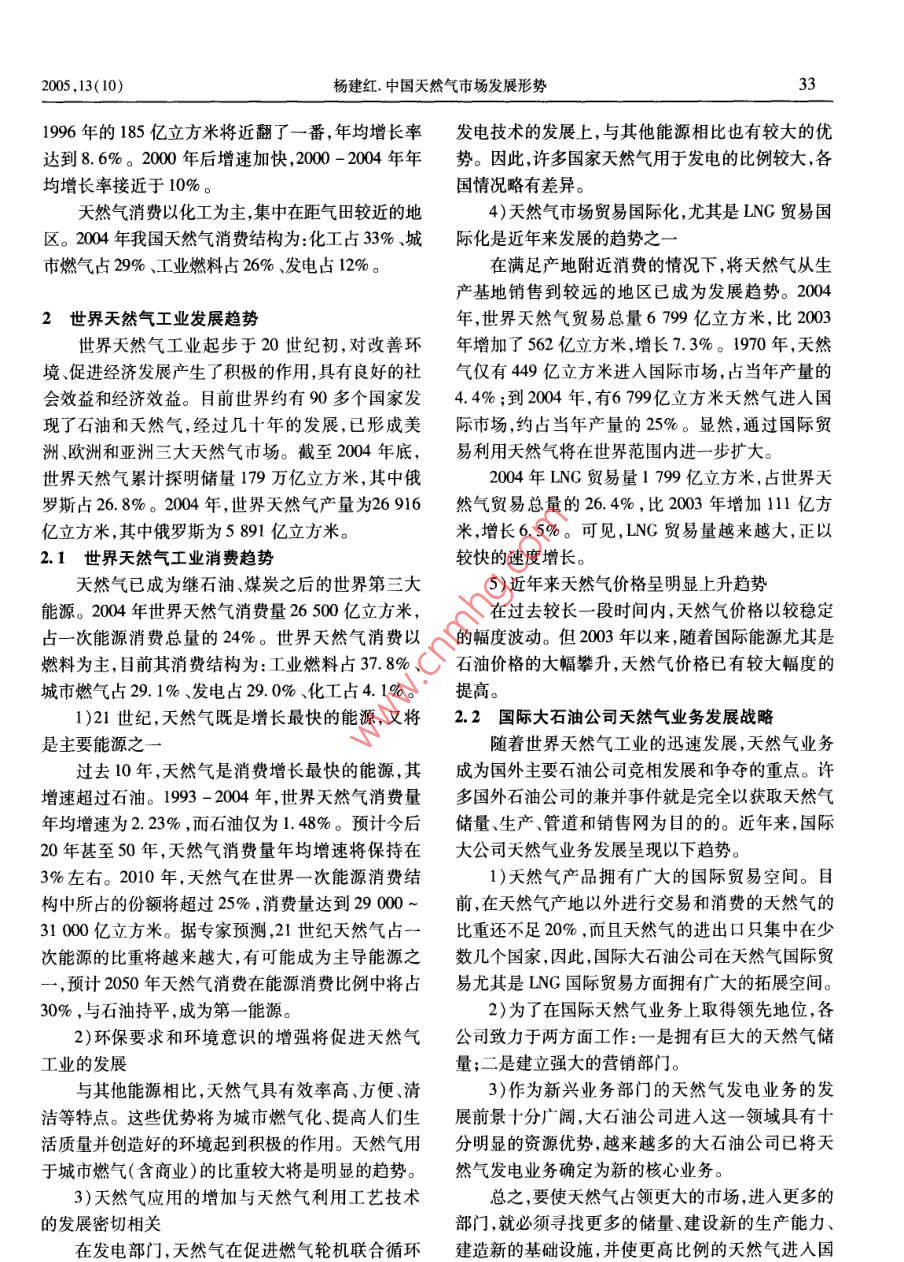 ·市場研究當(dāng)代石油石化Vol. 13 No. 10PETROLEUM PEtROCHEMICAL TODAYoct.2005中國天然氣市場發(fā)展形勢楊建紅(中國石油規(guī)劃總院,北京100083)摘要:介紹了中國和世界天然氣市場的發(fā)展?fàn)顩r指出了中國天然氣市場發(fā)展的前景和存在的主要問題提出了發(fā)展我國天然氣市場的幾點(diǎn)政策建議。關(guān)鍵詞:中國世界天然氣市場2004年12月30日西氣東輸管道工程正式商大超過120億立方米,約占全國天然氣產(chǎn)量的30%;業(yè)運(yùn)作,標(biāo)志著中國天然氣工業(yè)由啟動期向發(fā)展期長慶氣區(qū)天然氣產(chǎn)量增長迅速,增長幅度達(dá)到43%,邁進(jìn),天然氣市場將呈現(xiàn)爆發(fā)性增長,天然氣工業(yè)進(jìn)主要是長慶周邊市場和陜京輸氣管道銷量增長。入大發(fā)展時(shí)期。2004年,全國天然氣銷售量為300億立方米同比增長16%。其中,中國石油的天然氣銷售量為1中國天然氣市場現(xiàn)狀222億立方米,占全國天然氣銷售量的74%。中國1.1探明儲量穩(wěn)步增長石油銷售市場主要分布在西南、華北、西北、東北和004年,全國天然氣探明可采儲量2.79萬億立油氣田周邊。西南市場銷售量最大,為117.5億立方米,比2003年有所上升。其中,中國石油的天然氣方米,占全國天然氣銷售量的39%。銷售量增長最探明可采儲量209萬億立方米,占當(dāng)年全國探明可快的是華北地區(qū)陜京輸氣管道沿線市場,其次是西采儲量的75%;中國石化0.36萬億立方米,占13%;南地區(qū)和西北地區(qū)澀寧蘭管道沿線青海、甘肅市場。中國海油034萬億立方米,占12%。截至2004年天然氣銷售結(jié)構(gòu)以化工和城市用氣為主,占銷售量底全國剩余天然氣可采儲量約2.38萬億立方米,比的比例接近60%,增長最快的為城市用氣。2003年增加0.17萬億立方米,增長71%,具有加快1.3管道工程建設(shè)和運(yùn)行進(jìn)展順利發(fā)展的潛力。其中,中國石油的剩余天然氣可采儲量截至2004年底,全國天然氣管道總長度約24為1.78萬億立方米,占全國剩余天然氣可采儲量的萬千米,其中管徑大于426毫米的管道總長度為74.8%;中國石化0.31萬億立方米,占13%;中國海1.48萬千米。中國石油的天然氣管道總長度為18油0.209萬億立方米,占12.2%萬千米,占全國的72%2004年,我國陸上天然氣儲量增長地區(qū)主要集近幾年是中國天然氣管道建設(shè)的高峰期,除了中在塔里木柴達(dá)木鄂爾多斯和四川盆地四大氣西氣東輸管道以外,2004年以來在建或已建成的輸區(qū)海上天然氣的儲量增長海域集中在南海海域和氣管線還有忠武輸氣管道陜京二線輸氣管道、冀寧渤海海域。天然氣勘探不斷取得新成果,中國石化聯(lián)絡(luò)管道等基干管道及聯(lián)絡(luò)線。在川東、中國石油在大慶均獲得上千億的探明儲量。1.4天然氣消費(fèi)量大幅度增長探明儲量的穩(wěn)定增長,為天然氣工業(yè)發(fā)展提供了資近年來我國天然氣消費(fèi)量大幅度增長,2004年源基礎(chǔ)。為360億立方米,占一次能源消費(fèi)總量的2.6%;比1.2生產(chǎn)量和銷售量持續(xù)上升2004年,中國天然氣產(chǎn)量約為407億立方米,比收稿日期:2005-07-13。2003年增加66億立方米,增長約19%。其中,中國作者簡介:楊建紅,1993年畢業(yè)于北京化工大學(xué)。主要從事天然石油的天然氣產(chǎn)量286.6億立方米,占全國天然氣產(chǎn)氣市場研究工作,先后參加了西氣東輸陜京二線等重大工程前期研究工作。負(fù)責(zé)的“我國天然氣市場發(fā)育規(guī)律研究”獲得中國量的70.4%。在各氣區(qū)中氣區(qū)天然氣產(chǎn)量最2005,13(10)楊建紅中國天然氣市場發(fā)展形勢1996年的185億立方米將近翻了一番,年均增長率發(fā)電技術(shù)的發(fā)展上,與其他能源相比也有較大的優(yōu)達(dá)到8.6%。2000年后增速加快,2000-2004年年勢。因此,許多國家天然氣用于發(fā)電的比例較大,各均增長率接近于10%。國情況略有差異。天然氣消費(fèi)以化工為主,集中在距氣田較近的地4)天然氣市場貿(mào)易國際化,尤其是LNG貿(mào)易國區(qū)。2004年我國天然氣消費(fèi)結(jié)構(gòu)為:化工占3%、城際化是近年來發(fā)展的趨勢之市燃?xì)庹?9%、工業(yè)燃料占26%、發(fā)電占12%。在滿足產(chǎn)地附近消費(fèi)的情況下,將天然氣從生產(chǎn)基地銷售到較遠(yuǎn)的地區(qū)已成為發(fā)展趨勢。2004世界天然氣工業(yè)發(fā)展趨勢年,世界天然氣貿(mào)易總量6799億立方米,比2003世界天然氣工業(yè)起步于20世紀(jì)初,對改善環(huán)年增加了562億立方米,增長7.3%。1970年,天然境、促進(jìn)經(jīng)濟(jì)發(fā)展產(chǎn)生了積極的作用,具有良好的社氣僅有449億立方米進(jìn)入國際市場,占當(dāng)年產(chǎn)量的會效益和經(jīng)濟(jì)效益。目前世界約有90多個(gè)國家發(fā)4.4%;到2004年,有6799億立方米天然氣進(jìn)入國現(xiàn)了石油和天然氣,經(jīng)過幾十年的發(fā)展,已形成美際市場,約占當(dāng)年產(chǎn)量的25%。顯然,通過國際貿(mào)洲、歐洲和亞洲三大天然氣市場。截至2004年底,易利用天然氣將在世界范圍內(nèi)進(jìn)一步擴(kuò)大。世界天然氣累計(jì)探明儲量179萬億立方米,其中俄2004年LNG貿(mào)易量1799億立方米,占世界天羅斯占268%。2004年,世界天然氣產(chǎn)量為26916然氣貿(mào)易總量的26.4%,比2003年增加111億方億立方米,其中俄羅斯為5891億立方米。米,增長6.5%。可見,LNG貿(mào)