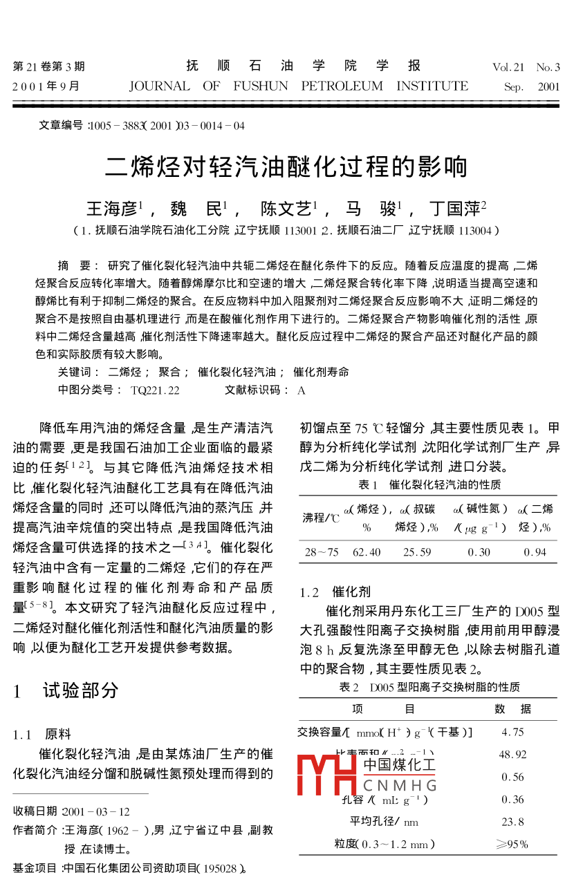第21卷第3期撫順石油學(xué)院學(xué)報(bào)Vol 21 No. 32001年9月JOURNAL OF FUSHUN PETROLEUM INSTITUTE Sep. 2001文章編號(hào):1005-38832001)3-0014-04二烯烴對(duì)輕汽油醚化過(guò)程的影響王海彥1,魏民,陳文藝1,馬駿,丁國(guó)萍2〔1.撫順石油學(xué)院石油化工分院遼寧撫順1130011.撫順石油二廠遼寧撫順113004)摘要:研究了催化袈化輕汽油中共軛二烯烴在醚化條件下的反應(yīng)。隨著反應(yīng)溫度旳提高,二烯烴聚合反應(yīng)轉(zhuǎn)化率增大。隨著醇烯摩爾比和空速的增大,烯烴聚合轉(zhuǎn)化率下降,說(shuō)明適當(dāng)提高空速和醇烯比有利于抑制二烯烴的聚合。在反應(yīng)物料中加入阻聚劑對(duì)二烯烴聚合反應(yīng)影響不大證明二烯烴的聚合不是按照自由基機(jī)理進(jìn)行而是在酸催化劑作用下進(jìn)行的。二烯烴聚合產(chǎn)物影響催化劑的活性原料中二烯烴含量越高催化劑活性下降速率越大。醚化反應(yīng)過(guò)程中二烯烴的聚合產(chǎn)品還對(duì)醚化產(chǎn)品的顏色和實(shí)際膠質(zhì)有較大影響關(guān)鍵詞:二烯烴;聚合;催化裂化輕汽油;催化劑壽命中圖分類號(hào):TQ221.22文獻(xiàn)標(biāo)識(shí)碼:A降低車用汽油的烯烴含量是生產(chǎn)清潔汽初餾點(diǎn)至75℃輕餾分其主要性質(zhì)見(jiàn)表1。甲油的需要更是我國(guó)石油加工企業(yè)面臨的最緊醇為分析純化學(xué)試劑沈陽(yáng)化學(xué)試劑廠生產(chǎn)異迫的任務(wù)12】與其它降低汽油烯烴技術(shù)相戊二烯為分析純化學(xué)試劑進(jìn)口分裝。比催化裂化輕汽油醚化工藝具有在降低汽油表1催化裂化輕汽油的性質(zhì)烯烴含量的同時(shí)還可以降低汽油的蒸汽壓并沸程/℃烯烴),叔碳(堿性氮)“(二烯提高汽油辛烷值的突岀特點(diǎn)是我國(guó)降低汽油%烯烴),%A四g1)烴),烯烴含量可供選擇的技術(shù)之34。催化裂化28-7562.4025.59輕汽油中含有一定量的二烯烴,它們的存在嚴(yán)重影響醚化過(guò)程的催化劑壽命和產(chǎn)品質(zhì)1.2催化劑量5-81。本文研究了輕汽油醚化反應(yīng)過(guò)程中,催化劑采用丹東化工三廠生產(chǎn)的D005型二烯烴對(duì)醚化催化劑活性和醚化汽油質(zhì)量的影大孔強(qiáng)酸性陽(yáng)離子交換樹(shù)脂使用前用甲醇漫響似以便為醚化工藝開(kāi)發(fā)提供參考數(shù)據(jù)泡8h反復(fù)洗滌至甲醇無(wú)色以除去樹(shù)脂孔道中的聚合物,其主要性質(zhì)見(jiàn)表2。試驗(yàn)部分表2D005型陽(yáng)離子交換樹(shù)脂的性質(zhì)數(shù)據(jù)1.1原料交換容量亻mmo〔H·)g(干基)]4.75催化裂化輕汽油是由某煉油廠生產(chǎn)的催化裂化汽油經(jīng)分餾和脫堿性氮預(yù)處理而得到的中國(guó)煤化工CNMHG孔容fml:g1)收稿日期2001-03-12作者簡(jiǎn)介注王海彥(1962-),男遼寧省遼中縣副教平均孔徑/nm23.8授在讀博士。粒度0.3~1.2mm)≥95%基金項(xiàng)目沖國(guó)石化集團(tuán)公司資助項(xiàng)目195028第3期王海彥等·二烯烴對(duì)輕汽油醚化過(guò)程的影響1.3實(shí)驗(yàn)裝置醇)/mn(叔碳烯烴)比大于1.0(此時(shí)甲醇濃度試驗(yàn)在小型連續(xù)膨脹床醚化反應(yīng)裝置上進(jìn)為205mol·L-1)后,二烯烴的聚合轉(zhuǎn)化率下行。反應(yīng)器是內(nèi)徑14mm,長(zhǎng)800mm的不銹降幅度不大,說(shuō)明甲醇的存在對(duì)二烯烴的聚合鋼管,內(nèi)部插人一根外徑為3mm的不銹鋼管反應(yīng)有一定的抑制作用。作熱電偶套管,催化劑裝量為50mL(干基)在反應(yīng)體系中加入阻聚劑,二烯烴聚合轉(zhuǎn)按一定比例配調(diào)配好的原料經(jīng)過(guò)計(jì)量泵打入反化率變化不大,證明二烯烴在醚化條件下的聚應(yīng)器,反應(yīng)產(chǎn)品進(jìn)入產(chǎn)品罐,反應(yīng)器溫度由DD合反應(yīng)不是按照自由基機(jī)理而主要是按照酸催溫度顯示控制器顯示并控制,壓力由氮?dú)馄刻峄恼茧x子機(jī)理進(jìn)行的。催化劑酸性越強(qiáng),供的氮?dú)饩S持。1.4分析方法二烯烴聚合轉(zhuǎn)化率越大。甲醇是一種極性物質(zhì),所以原料中的甲醇催化裂化輕汽油和醚化輕汽油中叔碳烯烴優(yōu)先在樹(shù)脂的酸性中心上吸附使陽(yáng)離子交換和二烯烴分析采用德國(guó)產(chǎn)MAT9GCMs聯(lián)樹(shù)脂磺酸基團(tuán)上的質(zhì)子轉(zhuǎn)變成溶劑化的質(zhì)子,用儀定性和上海分析儀器廠生產(chǎn)1002毛細(xì)管使催化劑的催化活性降低。隨著n(醇)/n(叔氣相色譜儀定量。實(shí)驗(yàn)條件:色譜柱為Ov碳烯烴)比增加,反應(yīng)體系中甲醇濃度的提高,101(50m×0.25mm)彈性石英毛細(xì)管柱,載氣溶劑化的質(zhì)子增多,二烯烴聚合轉(zhuǎn)化率下降。為№2,分流比為130:1。汽化室溫度200℃,檢當(dāng)甲醇濃度大于205moL以后,催化劑活測(cè)室溫度250℃。柱溫:初始溫度30℃,恒溫性中心的溶劑化已基本完成所以繼續(xù)增加甲10min;以4℃/min的速率升溫到150℃。醇用量對(duì)二烯烴聚合的影響減小。甲醇濃度大2結(jié)果與討論于2.05molL1以后二烯烴轉(zhuǎn)化率略有增加可能是CH3OH濃度增加,部分二烯烴與甲醇發(fā)生了醚化反應(yīng)。2.1釀化反應(yīng)條件對(duì)二烯烴聚合的影響211溫度的影響圖1為溫度對(duì)二烯烴聚合反應(yīng)的影響。由圖1可以看出,反應(yīng)溫度由50℃升高到80℃,二烯烴聚合轉(zhuǎn)化率由313%提高到57%。這是因?yàn)榉磻?yīng)溫度越高二烯烴聚合速率越大。a.8n(略)/n(叔破烯