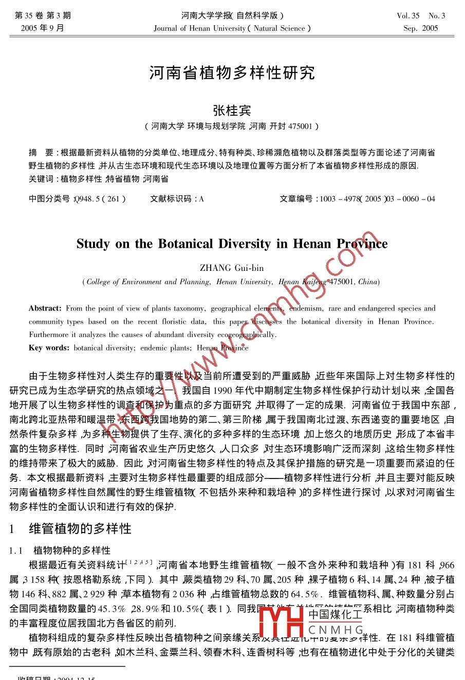 第35卷第3期河南大學(xué)學(xué)報(自然科學(xué)版)Vol.35 No.32005年9月Journal of Henan University ( Natural Science )Sep. 2005河南省植物多樣性研究張桂賓(河南大學(xué)環(huán)境與規(guī)劃學(xué)院河南開封475001 )商要:根據(jù)最新資料從植物的分類單位、地理成分、特有種類、珍稀瀕危植物以及群落類型等方面論述了河南省野生植物的多樣性并從古生態(tài)環(huán)境和現(xiàn)代生態(tài)環(huán)境以及地理位置等方面分析了本省植物多樣性形成的原因.關(guān)鍵詞:植物多樣性特省植物河南省中圖分類號:Q948.5( 261 )文獻(xiàn)標(biāo)識碼:A文章編號:1003 - 4978( 2005 )03 - 0060 -04Study on the Botanical Diversity in Henan ProvinceZHANG Gui-bin( College of Environment and Planning, Henan Universiy, Henan Kaifeng 475001, China)Abstract: From the point of view of plants taxonomy, geographical elements, endemism, rare and endangered species andcommunity, types based on the recent floristic data, this paper discusses the botanical diversity in Henan Province.Furthermore it analyzes the causes of abundant diversity ecogeographically.Key words: botanical diversity; endemic plants; Henan Province由于生物多樣性對人類生存的重要性以及當(dāng)前所遭受到的嚴(yán)重威脅近些年來國際上對生物多樣性的研究已成為生態(tài)學(xué)研究的熱點領(lǐng)域之一.我國自1990年代中期制定生物多樣性保護(hù)行動計劃以來,全國各地開展了以生物多樣性的調(diào)查和保護(hù)為重點的多方面研究并取得了-定的成果.河南省位于我國中東部,南北跨北亞熱帶和暖溫帶東西跨我國地勢的第二、第三階梯屬于我國南北過渡、東西遞變的重要地區(qū),自然條件復(fù)雜多樣為多種生物提供了生存、演化的多種多樣的生態(tài)環(huán)境加上悠久的地質(zhì)歷史形成了本省豐富的生物多樣性.同時河南省農(nóng)業(yè)生產(chǎn)歷史悠久人口眾多對生態(tài)環(huán)境影響廣泛而深刻,這給生物多樣性的維持帶來了極大的威脅.因此對河南省生物多樣性的特點及其保護(hù)措施的研究是一項重要而緊迫的任務(wù).本文根據(jù)最新資料主要對生物多樣性最重要的組成部分一植物多樣性進(jìn)行分析并且主要對能反映河南省植物多樣性自然屬性的野生維管植物(不包括外來種和栽培種)的多樣性進(jìn)行探討,以求對河南省生物多樣性的全面認(rèn)識和進(jìn)行有效的保護(hù).1維管植物的多樣性1. 1植物物種的多樣性根據(jù)最近有關(guān)資料統(tǒng)計12451河南省本地野生維管植物( -般不含外來種和栽培種)有181 科966屬3158種(按恩格勒系統(tǒng)下同).其中蕨類植物29科、70屬、205種裸子植物6科、14屬、24種被子植物146科、882屬、2929種草本植物有2036種,占維管植物總數(shù)的64.5%.維管植物科、屬、種數(shù)量分別占全國同類植物數(shù)量的45.3% 28. 9%和10.5%(表1 ).同我國艾沙有首國的精倫罕系相比河南植物種類中國煤化工的豐富程度位居我國北方各省區(qū)的前列.MHCNMH G植物科組成的復(fù)雜多樣性反映出各植物種之間親緣關(guān)系x兵任進(jìn)幾中的互木夕祥性.在181科維管植物中既有原始的古老科如木蘭科、金粟蘭科、領(lǐng)春木科、連香樹科等他有在植物進(jìn)化中處于分化的關(guān)鍵類收稿日期:2004-12-15作者簡介:張桂賓( 1955- )男河南南陽人河南大學(xué)副教授.張桂賓河南省植物多樣性研究1群如金縷梅科、虎耳草科等還有高度進(jìn)化的科,如菊科、禾本科、蘭科等.按科的大小統(tǒng)計分(表2 )既有.含200種以上的特大科,也有僅含-種的單種科.由表2可知,位于前10位的大科依次為菊科、薔薇科、禾本科、豆科、毛茛科、莎草科、唇形科、百合科、傘形科、虎耳草科包含1 335種,占全省種數(shù)的42.3%.表1河南野生維管植物與鄰省和全國的比較國土面積蕨類植物裸子植物被子植物種維管植物總計( 10*km2 )科種屬寓和河南16. 7297(142846 882 2929 181966 3158河北19.02137973244 809 2471 172 860 2700山東15. 724 39053520 572 1437 147 614 1547中國96063228 30001034193327 3082 26807 400 3344 30000表2河南種 子植物科的大小順序(按含種數(shù)多少排列)種數(shù)>200種科3科:61~80種科3科:石竹科38龍膽科30小檗科2:菊科248傘形科80蹄蓋蕨科藜科茜草科2薔薇科233虎耳草科木犀科紫草科.桔梗科禾本科201蘭科62大戟科鼠李科堇菜科22101 ~200種科2科: 41 ~60種科4科:衛(wèi)毛科33槭樹科罌粟科豆科129玄參科53報春花科榆科毛莨科109忍冬科樟科鱗毛蕨科馬鞭草科81~100種科3科:蓼科葡萄科31殼斗科26 11 ~20種科25科:莎草科9十字花科52景天科樺木科26 |s~ 10種科32科:唇形科8731~40種科,10科:21~30種科19科:五加科1~4種科80科:百合科8楊柳科39水龍骨科蕁麻科1.2特有 植物及珍稀瀕危植物的豐富性據(jù)統(tǒng)計河南境內(nèi)的維管植物有中國特有屬41屬(種子植物39屬);中國特有種1 605種(種子植物1514種)屬于河南特有的植物有42種(含變種X表3).在種子植物中中國特有屬占全國特有屬總數(shù)的15%屬數(shù)與整個華北地區(qū)該類數(shù)量相同;中國特有種占河南種子植物的52.5%種數(shù)比整個華北地區(qū)的該類植物還要多居北方各植物區(qū)之首.它們比較集中分布于本省西部和南部山區(qū).河南特有的42種維管植物,多數(shù)也分布于上述地區(qū)所以西部和南部山區(qū)是我國特有種分布中心之一,也是河南特有種形成與分布中心.珍稀瀕危植物屬國家級保護(hù)(第一批