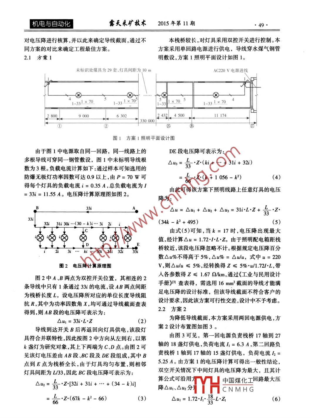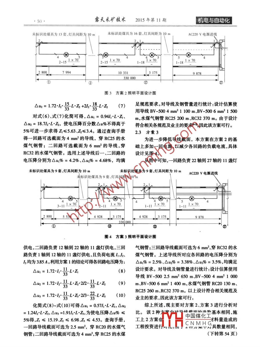 ●48.露天采礦技術(shù)2015年第11期機(jī)電與自動(dòng)化DOI:10.13235/j.cnki.tcm. 2015.11.015煤炭運(yùn)輸中長(zhǎng)棧橋照明方案陳旭(中煤科工集團(tuán)沈陽(yáng)設(shè)計(jì)研究院有限公司,遼寧沈陽(yáng)110015)摘要:對(duì)扎哈淖爾露天礦地面生產(chǎn)系統(tǒng)移設(shè)改造工程中某條長(zhǎng)棧橋的照明設(shè)計(jì)提出了3個(gè)方案,介紹了復(fù)雜照明方案下電壓降的計(jì)算方法,并通過(guò)研究及對(duì)比,分析出了在保證照度滿足規(guī)范要求的前提下節(jié)約工程投資的最佳方案。關(guān)鍵詞:長(zhǎng)棧橋;電壓降;照度中圖分類號(hào):TD612文獻(xiàn)標(biāo)志碼: B文章編號(hào):1671 - 9816 (2015) 11 - 0048 - 04.Long trestle lighting plan during coal transportationCHEN Xu(China Cool Technology and Engineering Croup Shenyang Design & Research Institute, Shenyang 110015, China)Abstract: The article presents three plans on the ilumination design of long trestle during ground production system shift design inZhahanao'er Open-pit Mine, and introduces the calculation method of volage drop under the complicated lighting scheme. Throughresearch and comparation , the author analyzes the best plan of saving engineering investment under the premise of ensuring theilumination to meet the standard requirements.Key words: long trestle; voltage drop; ilumnination由于煤炭工程中棧橋內(nèi)為粉塵防爆區(qū)域,因此單個(gè)燈具的光通量,lm;Cu為空間利用系數(shù),M。為維該區(qū)間燈具須為防爆型,通常情況下棧橋內(nèi)的照明護(hù)系數(shù),S為區(qū)域面積,m2。電源會(huì)取自與棧橋相連轉(zhuǎn)載站內(nèi)的照明配電箱。由由《建筑照明設(shè)計(jì)標(biāo)準(zhǔn)》可知,棧橋類場(chǎng)合的照于長(zhǎng)棧橋燈具數(shù)量多,線路阻抗大,因此電壓降較為度需滿足50lx,因此只需要知道其他參數(shù)即可確定明顯,長(zhǎng)期欠壓下運(yùn)行會(huì)嚴(yán)重減少燈具的使用壽命,燈具的數(shù)量N。通過(guò)工程項(xiàng)目中的土建資料了解到造成額外投資;電壓降過(guò)大甚至?xí)斐蔁艟哳l閃或棧橋長(zhǎng)330 m,寬為4.3 m,燈具安裝高度為2.8 m,無(wú)法啟動(dòng)。因此需對(duì)燈具數(shù)量進(jìn)行控制以降低負(fù)荷考慮到燈具所處環(huán)境可設(shè)定維護(hù)系數(shù)Mr= 0.7,利電流,并對(duì)導(dǎo)線截面進(jìn)行選取,以使載流量及電壓降用系數(shù)Cu則可通過(guò)軟件計(jì)算求得。由棧橋尺寸數(shù)據(jù)均滿足要求。通過(guò)照度要求標(biāo)準(zhǔn)對(duì)燈具數(shù)量及布置及建筑材料可確定室形系數(shù)為1.49,棚頂反射比為進(jìn)行確定,提出了3種不同的設(shè)計(jì)方案,通過(guò)對(duì)比,30%,墻反射比30%,地面反射比為10%,在軟件中提出了一種最為節(jié)省成本的設(shè)計(jì)方案。對(duì)上述參數(shù)進(jìn)行設(shè)置并最終可得利用系數(shù)Cu =0.537。初步設(shè)計(jì)選用功率為70 w的無(wú)極防爆燈,通1照度分 析及燈具布置設(shè)計(jì)過(guò)樣本查得光通量為5 880 lm,將各參數(shù)帶人式防爆燈具價(jià)格較貴,減少燈具的數(shù)量可有效減(1), 可得燈具數(shù)量為N= 32。 對(duì)燈具進(jìn)行布置如少照明項(xiàng)目的投資,但其數(shù)量及布置要以滿足規(guī)范下:由于棧橋長(zhǎng)330 m,帶式輸送機(jī)沿棧橋中線布對(duì)照度的要求為前提。平均照度的計(jì)算公式為: .置,兩邊過(guò)道均為1.2m,因此設(shè)計(jì)中將防爆無(wú)極燈Eav = N.φCu.M]S(1)吸頂安裝,間距定為10m,則整個(gè)棧橋防爆燈具數(shù)式中:Eav為平均照度,lx;N為燈具數(shù)量;中為量為33盞。將N=33帶人式(1)可得平均照度Eav=51.4 lx,滿收稿日期:2015-05-15中國(guó)煤化工作者簡(jiǎn)介:陳旭(1978-),男 ,滿族,遼寧人,高級(jí)工程2照明方案THCNMH G師,就職于中煤科工集團(tuán)沈陽(yáng)設(shè)計(jì)研究院有限公司,從事煤炭行業(yè)電氣設(shè)計(jì)工作。由于棧橋較長(zhǎng),照明負(fù)荷和線路阻抗均很大,需機(jī)電與自動(dòng)化露天采礦技術(shù)2015年第11期對(duì)電壓降進(jìn)行核算,并以此來(lái)確定導(dǎo)線截面,通過(guò)不本棧橋較長(zhǎng),對(duì)燈具采用雙控開關(guān)進(jìn)行控制。本同方案的對(duì)比來(lái)確定工程最佳方案。方案采用單回路電源進(jìn)行供電,導(dǎo)線穿水煤氣鋼管2.1方案1明敷設(shè),方案1照明平面設(shè)計(jì)如圖1。未標(biāo)識(shí)處煤具為29套,燈具間距為10 mAC220 V電源進(jìn)線程' 1-331x701-331x70233|1x70l28009 0006 302I 330 000子432.450011 174D②2圖1方案1照明平面設(shè)計(jì)圖由于圖1中電源取自同- -回路,同- -線路上的DE段電壓降可表示為:多根導(dǎo)線可穿同一鋼管敷設(shè),圖1中未標(biāo)明導(dǎo)線根Ous= .Z.(ki+... + 31i + 32i)數(shù)為3根。負(fù)載電流計(jì)算如下:通過(guò)樣本可知選用的防爆無(wú)極燈功率因數(shù)可達(dá)0.9以上,由P= 70 W可= .z.(k+ 1056-k2)(4)6得每個(gè)燈具的負(fù)載電流i = 0.35 A,總負(fù)載電流為1由此可得該方案下照明線路上任意燈具的電壓= 33i= 11.55 A。電壓降計(jì)算原理圖如圖2。降為:3i_Ou= Ou1+ Ou2+ Ou3= 31i.L.Z+上.Z.3231i 3.*.0-13)3..3 2i(34k - k2 + 495)(5)由式(5)可知,當(dāng)k = 17時(shí),電壓降出現(xiàn)最大值,經(jīng)計(jì)算Ou= 1.721以.Z。由于照明配電箱距棧橋較近,該段電壓降忽略不計(jì)。根據(jù)規(guī)定電壓降百分?jǐn)?shù)△u%不得高于5%, Ou%= Oul/u, 式中u= 220圖2