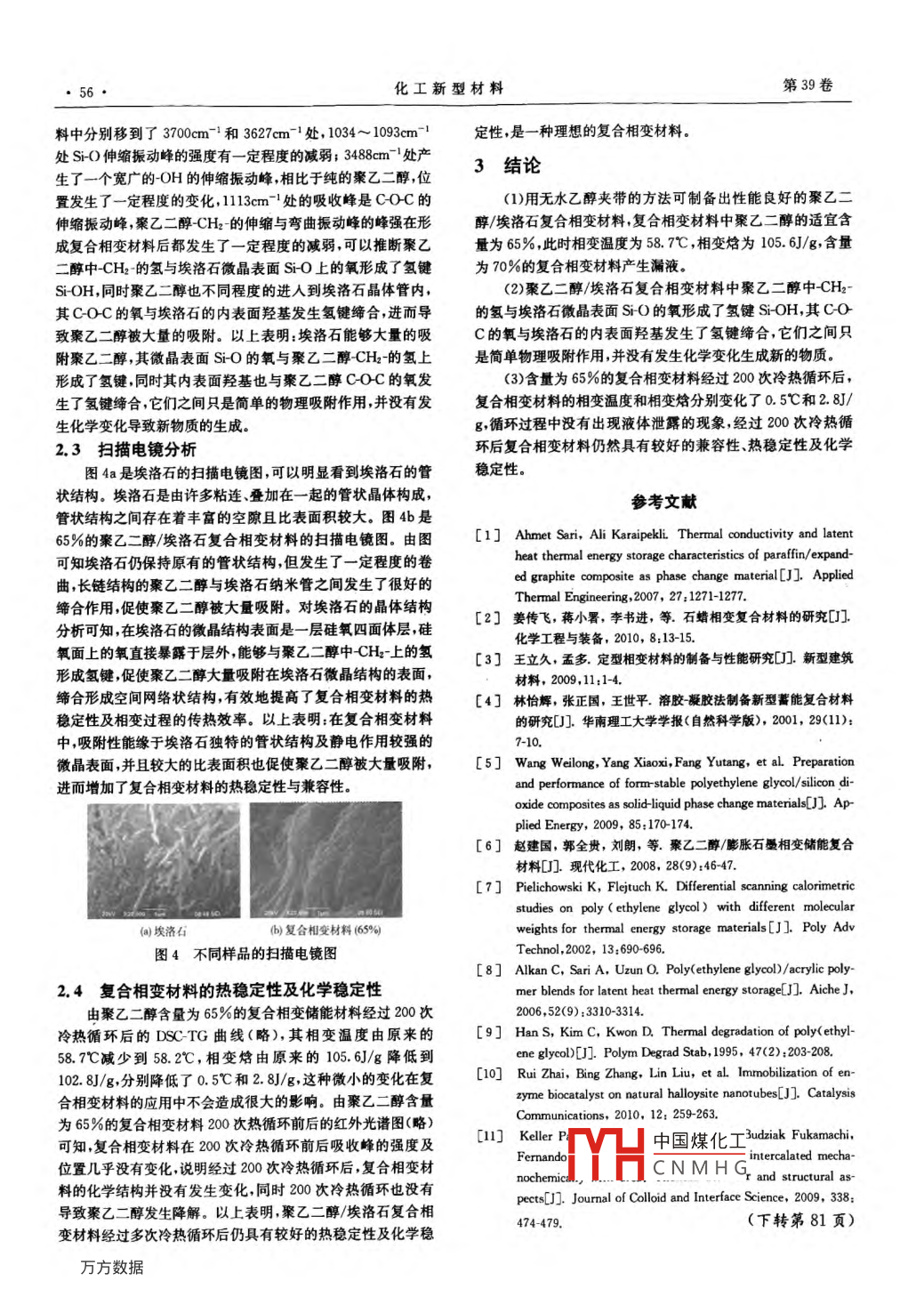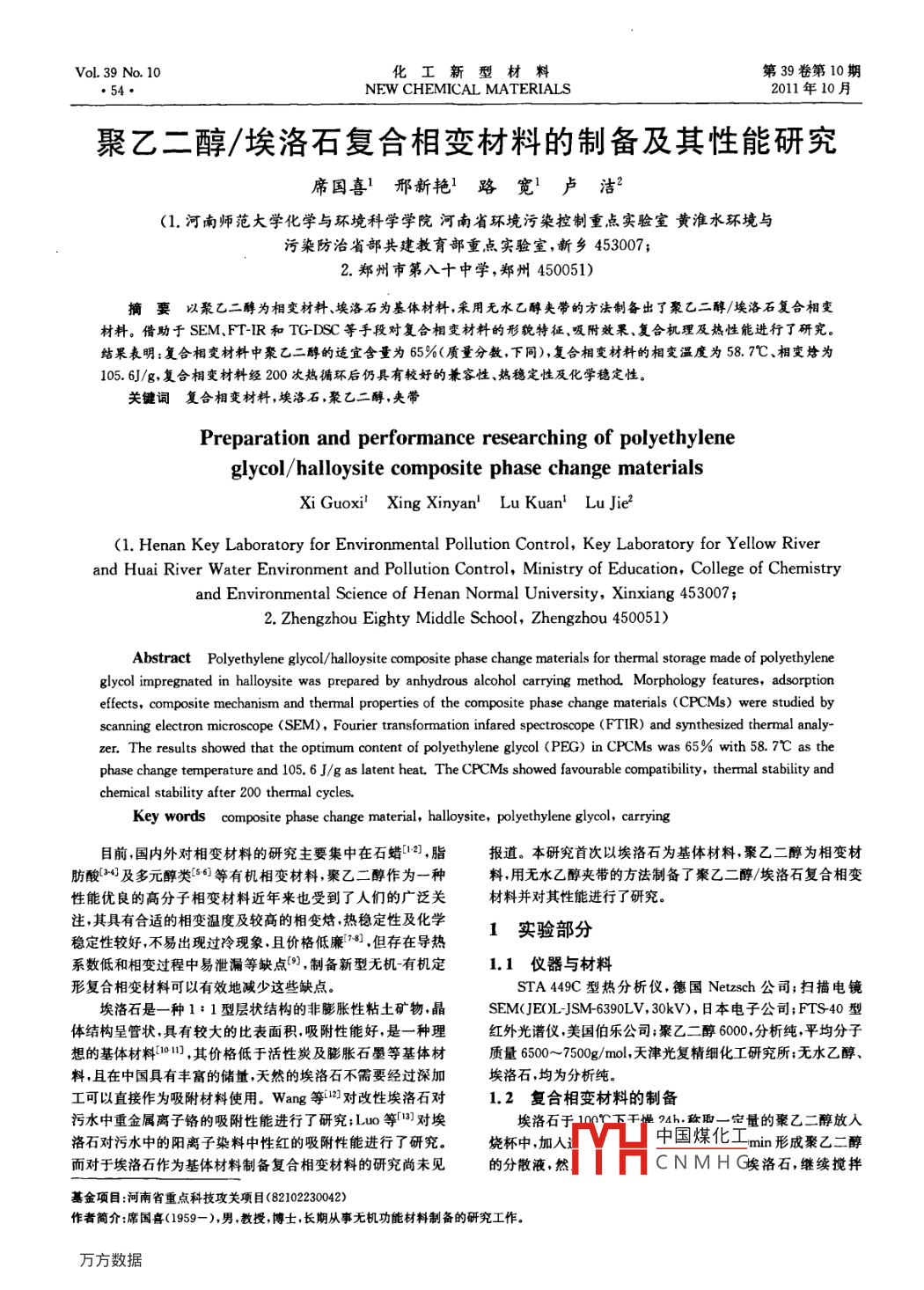 Vol. 39 No. 10化工新型材料第39卷第10期NEW CHEMICAL MATERIALS2011年10月聚乙二醇/埃洛石復合相變材料的制備及其性能研究席國喜'邢新艷'路寬'盧潔2(1.河南師范大學化學與環(huán)境科學學院河南省環(huán)境污染控制重點實驗室黃淮水環(huán)境與污染防治省部共建教育部重點實驗室,新鄉(xiāng)453007;2.鄭州市第八十中學,鄭州450051)摘要以聚乙二醇為相變材料、埃洛石為基體材料,采用無水乙醇夾帶的方法制備出了聚乙二醇/埃洛石復合相變材料。借助于SEM.FT-IR和TG-DSC等手段對復合相變材料的形貌特征、吸附效果、復合機理及熱性能進行了研究。結果表明:復合相變材料中聚乙二醇的適宜含量為65%(質(zhì)量分數(shù),下同),復合相變材料的相變溫度為58.7C、相變焓為105. 6J/g,復合相變材料經(jīng)200次熱循環(huán)后仍具有較好的兼容性、熱穩(wěn)定性及化學穩(wěn)定性。關鍵詞復合相變材料,埃洛石,聚乙二醇,央帶Preparation and performance researching of polyethyleneglycol/ halloysite composite phase change materialsXi Guoxi' Xing Xinyan' Lu Kuan' Lu Jjie2(1. Henan Key Laboratory for Environmental Pollution Control, Key Laboratory for Yellow Riverand Huai River Water Environment and Pollution Control, Ministry of Education, College of Chemistryand Environmental Science of Henan Normal University, Xinxiang 453007 ;2. Zhengzhou Eighty Middle School, Zhengzhou 450051)Abstract Polyethylene glyco/halloysite composite phase change materials for thermal storage made of polyethyleneglycol impregnated in halloysite was prepared by anhydrous alcohol carrying method. Morphology features, adsorptioneffects, composite mechanism and thermal properties of the composite phase change materials (CPCMs) were studied byscanning electron microscope (SEM),F(xiàn)ourier transformation infared spectroscope (FTIR) and synthesized thermal analy-zer. The results showed that the optimum content of polyethylene glycol (PEG) in CPCMs was 65% with 58. 7C as thephase change temperature and 105. 6 J/g as latent heat. The CPCMs showed favourable compatibility, thermal stability andchemical stability after 200 thermal cycles.Key words composite phase change material, halloysite, polyethylene glycol, carrying目前,國內(nèi)外對相變材料的研究主要集中在石蠟12],脂報道。本研究首次以埃洛石為基體材料,聚乙二醇為相變材肪酸[30]及多元醇類[56]等有機相變材料,聚乙二醇作為一種料,用無水乙醇夾帶的方法制備了聚乙二醇/埃洛石復合相變性能優(yōu)良的高分子相變材料近年來也受到了人們的廣泛關材料并對其性能進行了研究。注,其具有合適的相變溫度及較高的相變焓,熱穩(wěn)定性及化學1實驗部分穩(wěn)定性較好,不易出現(xiàn)過冷現(xiàn)象.且價格低廉[74] ,但存在導熱系數(shù)低和相變過程中易泄漏等缺點(°),制備新型無機-有機定1.1儀器 與材料形復合相變材料可以有效地減少這些缺點。STA 449C型熱分析儀,德國Netzsch 公司;掃描電鏡埃洛石是一種1: 1型層狀結構的非膨脹性粘土礦物,晶SEM(JE0L-JSM-6390LV, 30kV),日本電子公司;FTS-40型體結構呈管狀,具有較大的比表面積.吸附性能好,是一種理紅外光譜儀,美國伯樂公司;聚乙二醇6000,分析純,平均分子想的基體材料1[01,其價格低于活性炭及膨脹石墨等基體材質(zhì)量6500~7500g/mol,天津光復精細化工研究所;無水乙醇、料,且在中國具有豐富的儲量,天然的埃洛石不需要經(jīng)過深加埃洛石,均為分析純。工可以直接作為吸附材料使用。Wang 等i12對改性埃洛石對1.2復合相變材料的制備污水中重金屬離子鉻的吸附性能進行了研究;Luo等[3]對埃埃洛石于100個下千幄?4h.稱雨一定量的聚乙二醇放人洛石對污水中的陽離子染料中性紅的吸附性能進行了研究。燒杯中,加入中國煤化工:min形成聚乙二醇而對于埃洛石作為基體材料制備復合相變材料的研究尚未見的分散液,然MYHCNMHC埃洛石,繼續(xù)攪拌.基金項目:河南省重點科技攻關項目(82102230042)作者簡介:席國喜(1959-),男,教授,博士,長期從事無機功能材料制備的研究工作。第10期席國喜等:聚乙二醇/埃洛石復合相變材料的制備及其性能研究30min,移到恒溫水浴槽中控溫80°C ,攪拌至無水乙醇大量揮表1復合材料的相變溫 度相變焓測量值及理論值發(fā),產(chǎn)物干燥至恒重,粉碎研磨,即得復合相變材料。分別制聚乙二醇含量相變溫度 相交焓測 地值相變焓理論值備了聚乙二醇含量為50% .55%、60%、65%、70%的復合相變/%(J/g)/(J/g)5054. 582.7786. 90材料。5553.689.5195.591.3樣品的表征56.497.88104. 28用掃描電鏡觀察埃洛石及65%的復合相變材料的形貌;558.7105.60112. 97用STA449C型熱分析儀對樣品的熱性能及熱穩(wěn)定性進行了7054.1107. 70121.66研究,采用N2氣氛,升溫速率5C/min,溫度范圍25~ 100°C ;取65%的復合相變材料做IR測定,采用KBr壓片,掃描范圍110r為400~ 400cm~'.0s-1.4數(shù)據(jù)處理復合相變材料相變焓的理論值可由公式△OH= WsaX5|△Hsa計算](△HsA與△H分別是聚乙二醇和復合相變材料的相變焓,Wsa是復合相變材料中聚乙二醇的質(zhì)量百分含0量)。st2結果與討論;豪乙一醇含量%2.1聚乙二醇含量對復 合相變材料熱穩(wěn)定性的影響圖2復合材料的相變焓 與聚乙二醇含量的關系圖la為聚乙二醇的TG-DSC曲線,由圖可知聚乙二醇的相變溫度為60. 2C ,相變焓為173. 8J/g。分別制備了聚乙二2.2復合相變材料的兼容性醇含量為50%,55% .60%、65%、70%的復合相變材料。實驗紅外光譜分析可以確定聚乙二醇/埃洛石復合相變材料過程中發(fā)現(xiàn)聚乙二醇
