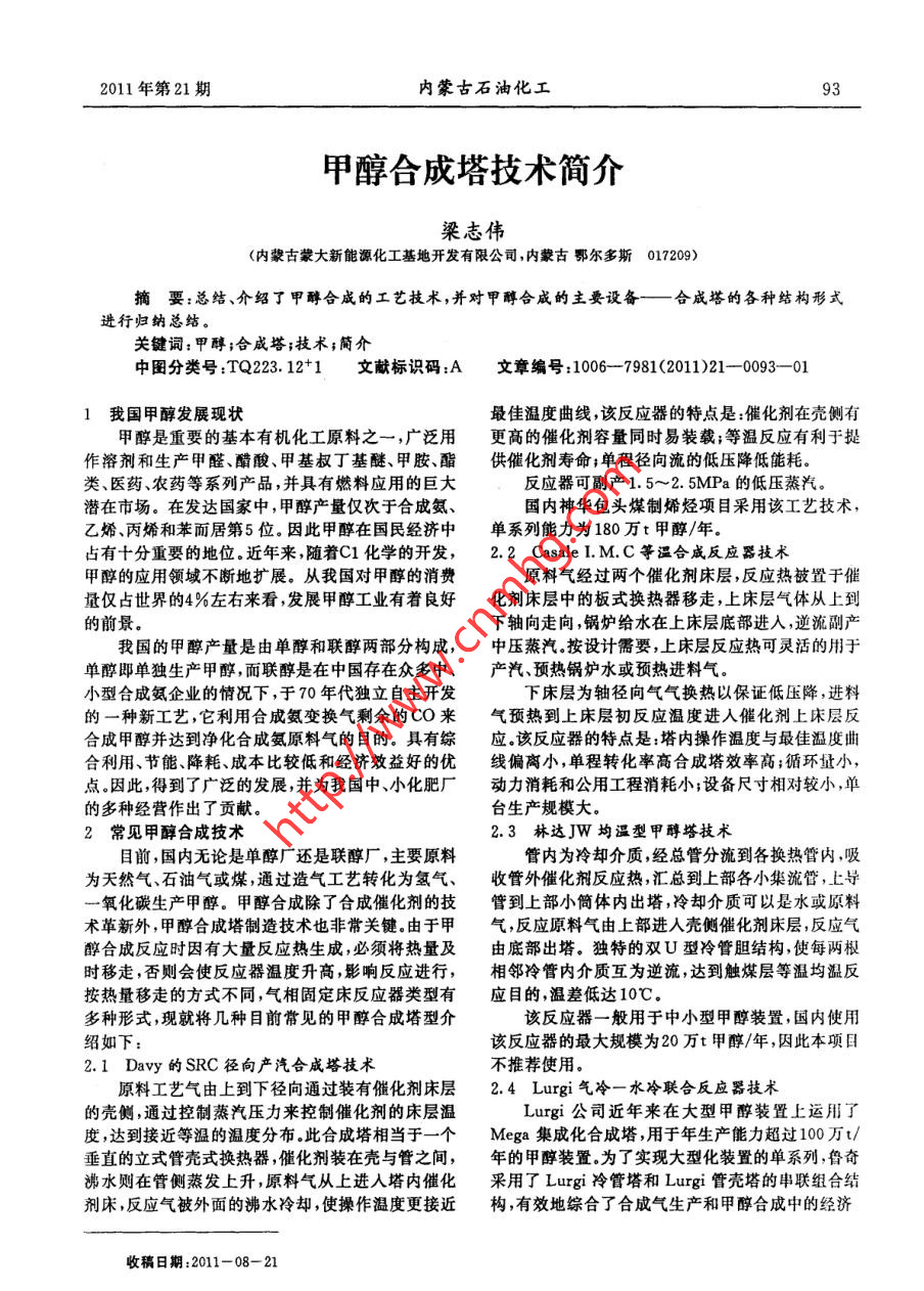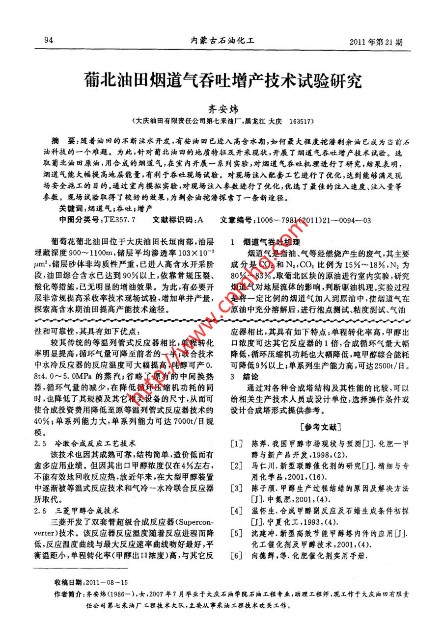 2011年第21期內(nèi)蒙古石油化工)3甲醇合成塔技術簡介梁志偉(內(nèi)蒙古蒙大新能源化工基地開發(fā)有限公司,內(nèi)蒙古鄂爾多斯017209)摘要:總結、介紹了 甲醇合成的工藝技術,并對甲醇合成的主要設備一合 成塔的各種結構形式進行歸納總結。關鍵詞:甲醇;合成塔;技術;簡介中囝分類號:TQ223. 12+1文獻標識碼:A文章編號:1006--7981(2011)21-0093-01我國甲醇發(fā)展現(xiàn)狀最佳溫度曲線,該反應器的特點是:催化劑在殼側有甲醉是重要的基本有機化工原料之一,廣泛用更高的催化劑容量同時易裝載;等溫反應有利于提作溶劑和生產(chǎn)甲醛、醋酸、甲基叔丁基醚、甲胺、酯供催化劑壽命;單程徑向流的低壓降低能耗。類、醫(yī)藥、農(nóng)藥等系列產(chǎn)品,并具有燃料應用的巨大反應器可副產(chǎn)1.5~2.5MPa的低壓蒸汽。潛在市場。在發(fā)達國家中,甲醇產(chǎn)量僅次于合成氨、國內(nèi)神華包頭煤制烯烴項目采用該工藝技術,乙烯、丙烯和苯而居第5位。因此甲醇在國民經(jīng)濟中單系列能力為180萬t甲醇/年。占有十分重要的地位。近年來,隨著C1化學的開發(fā),2.2 Casale 1.M.C等溫合成反應器技術甲醇的應用領域不斷地擴展。從我國對甲醇的消費原料氣經(jīng)過兩個催化劑床層,反應熱被置于催量僅占世界的4%左右來看,發(fā)展甲醇工業(yè)有著良好化劑床層中的板式換熱器移走,上床層氣體從上到的前景。下軸向走向,鍋爐給水在上床層底部進入,逆流副產(chǎn)我國的甲醇產(chǎn)量是由單醇和聯(lián)醇兩部分構成,中壓蒸汽。按設計需要,上床層反應熱可靈活的用于單醇即單獨生產(chǎn)甲醇,而聯(lián)醇是在中國存在眾多中、產(chǎn) 汽、預熱鍋爐水或預熱進料氣。小型合成氨企業(yè)的情況下,于70年代獨立自主開發(fā)下床層為軸徑向氣氣換熱以保證低壓降,進料的一種新工藝,它利用合成氨變換氣剩余的co來氣預熱到上床層初反應溫度進人催化劑上床層反合成甲醇并達到凈化合成氨原料氣的目的。具有綜應。該反應器的特點是:塔內(nèi)操作溫度與最佳溫度曲合利用、節(jié)能、降耗、成本比較低和經(jīng)濟效益好的優(yōu)線偏離小,單程轉化率高合成塔效率高;循環(huán)量小,點。因此,得到了廣泛的發(fā)展,并為我國中、小化肥廠動力消耗和公用工程消耗小;設備尺寸相對較小,單的多種經(jīng)營作出了貢獻。臺生產(chǎn)規(guī)模大。2常見甲醇合成技術2.3林達JW 均溫型甲醇塔技術目前,國內(nèi)無論是單醇廠還是聯(lián)醇廠,主要原料管內(nèi)為冷卻介質(zhì),經(jīng)總管分流到各換熱管內(nèi),吸為天然氣、石油氣或煤,通過造氣工藝轉化為氫氣、收管外催化劑反應熱,匯總到上部各小集流管,上導-氧化碳生產(chǎn)甲醇。甲醇合成除了合成催化劑的技管到上部小簡體內(nèi)出塔,冷卻介質(zhì)可以是水或原料術革新外,甲醇合成塔制造技術也非常關鍵。由于甲氣,反應原料氣由上部進人殼側催化劑床層,反應氣醉合成反應時因有大量反應熱生成,必須將熱量及由底部出塔。獨特的雙U型冷管膽結構,使每兩根時移走,否則會使反應器溫度升高,影響反應進行,相鄰冷管內(nèi)介質(zhì)互為逆流,達到觸煤層等溫均溫反按熱量移走的方式不同,氣相固定床反應器類型有應目的,溫差低達10C.多種形式,現(xiàn)就將幾種目前常見的甲醇合成塔型介該反應器- -般用于中小型甲醇裝置,國內(nèi)使用紹如下:該反應器的最大規(guī)模為20萬t甲醇/年,因此本項目2.1 Davy的SRC徑向產(chǎn)汽合成塔技術不推薦使用。原料工藝氣由.上到下徑向通過裝有催化劑床層2.4 Lurgi 氣冷一水冷聯(lián)合反應器技術.的殼側,通過控制蒸汽壓力來控制催化劑的床層溫Lurgi公司近年來在大型甲醇裝置上運用了度,達到接近等溫的溫度分布.此合成塔相當于-一個Mega集成化合成塔,用于年生產(chǎn)能力超過100萬t/垂直的立式管殼式換熱器,催化劑裝在殼與管之間,年的甲醇裝置。為了實現(xiàn)大型化裝置的單系列,魯奇沸水則在管側蒸發(fā)上升,原料氣從上進入塔內(nèi)催化采用了Lurgi冷管塔和Lurgi管殼塔的串聯(lián)組合結劑床,反應氣被外面的沸水冷卻,使操作溫度更接近構,有效地綜合了合成氣生產(chǎn)和甲醇合成中的經(jīng)濟收稿日期:2011-08- 21)4內(nèi)蒙古石油化工2011年第21期葡北油田煙道氣吞吐增產(chǎn)技術試驗研究齊安煒(大慶油田有限責任公司第七采油廠,黑龍江大慶163517)摘要:隨著油田的不斷注水開發(fā),有些油田巳進入高含水期,如何最大程度挖潛剩余油巳成為當前石油科技的一個難題。為此,針對葡北油田的地質(zhì)特征及開采現(xiàn)狀,開展了煙道氣吞吐增產(chǎn)技術試驗。選取葡北油田原油,用合成的煙道氣,在室內(nèi)開展一系列實驗,對煙道氣吞吐機理進行了研究,結果表明,煙道氣能大幅提高地層能量,有利于吞吐現(xiàn)場試驗。對現(xiàn)場注入配套工藝進行了優(yōu)化,達到能夠滿足現(xiàn)場安全施工的目的。通過室內(nèi)模擬實驗,對現(xiàn)場注入?yún)?shù)進行了優(yōu)化,優(yōu)選了最佳的注入速度、注入量等參數(shù)?,F(xiàn)場試驗取得了較好的效果,為剩余油挖潛探索了一條新途徑。關鍵詞:煙道氣;吞吐;增產(chǎn)中圖分類號:TE357. 7文獻標識碼:A文章編號:1006-7981(2011)21-0094--03葡萄花葡北油田位于大慶油田長垣南部,油層1煙道氣吞 吐機理埋藏深