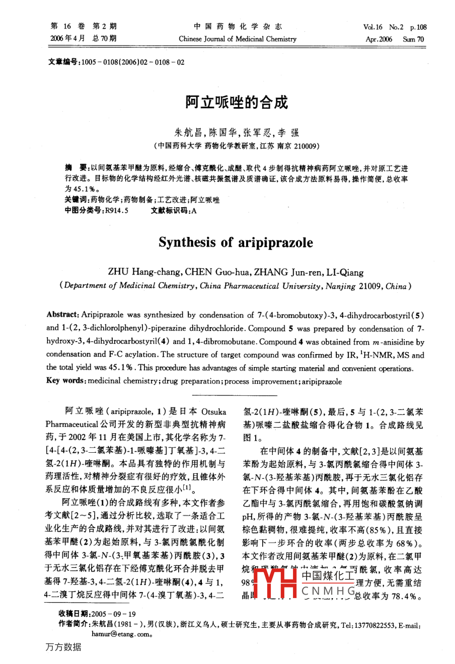 第16卷第2期中國藥物化學(xué)雜志Vol.16 No.2 p. 1082006年4月總70期Chinese Jourmal of Medicinal ChemistryApr.2006 Sum 70文章編號: 1005 - 0108(2006)02 - 0108 - 02阿立哌唑的合成朱航昌,陳國華,張軍忍,李強(qiáng)(中國藥科大學(xué)藥物化學(xué)教研室,江蘇南京210009)摘要:以間氨基苯甲醚為原料,經(jīng)縮合、傅克?;⒊擅?、取代4步制得抗精神病藥阿立哌唑,并對原工藝進(jìn)行改進(jìn)。目標(biāo)物的化學(xué)結(jié)構(gòu)經(jīng)紅外光譜、核磁共振氫譜及質(zhì)譜確證,該合成方法原料易得,操作簡便,總收率為45.1%。關(guān)鍵詞:藥物化學(xué);藥物制備;工藝改進(jìn);阿立哌唑中圖分類號:R914.5文獻(xiàn)標(biāo)識(shí)碼:ASynthesis of aripiprazoleZHU Hang chang, CHEN Guo-hua, ZHANG Jun-ren, LI-Qiang(Department of Medicinal Chemistry, China Pharmaceutical Universisy, Nanjing 21009, China)Abstract: Aripiprazole was synthesized by condensation of 7-(4-bromobutoxy)-3, 4-dihydrocarbostyri(5)and 1-(2, 3-dichlorolphenyl)-piperazine dibydrochloride. Compound 5 was prepared by condensation of 7-hydroxy-3, 4-dihydrocarbostyril(4) and 1, 4-dibromobutane. Compound 4 was obtained from m -anisidine bycondensation and F-C acylation. The structure of target compound was confirmed by IR, H-NMR, MS andthe total yield was 45. 1 % .This procedure has advantages of simple starting material and convenient operations.Key words: medicinal chemistry;drug preparation;process improvement; aripiprazole阿立哌唑(aripiprazole, 1)是日本Otsuka氫2(1H)-喹啉酮(5),最后,5與1-(2,3-二氯苯Pharmaceutical公司開發(fā)的新型非典型抗精神病基)哌嗪二鹽酸鹽縮合得化合物1。合成路線見藥,于2002年11月在美國上市,其化學(xué)名稱為7-.圖1。[4-[4-(2, 3-二氯苯基)-1-哌嗪基]丁氧基]-3,4二在中間體4的制備中,文獻(xiàn)[2, 3]是以間氨基氫-2(1H)-喹啉酮。本品具有獨(dú)特的作用機(jī)制與苯酚為起始原料,與3~氯丙酰氯縮合得中間體3-藥理活性,對精神分裂癥有很好的療效,且錐體外氯_N-(3-羥基苯基)丙酰胺,再于無水三氯化鋁存系反應(yīng)和體質(zhì)量增加的不良反應(yīng)很小[1。在下環(huán)合得中間體4。其中,間氨基苯酚在乙酸.阿立哌唑(1)的合成路線有多種,本文作者參乙酯中與3~氯丙酰氯縮合,再用飽和碳酸氫鈉調(diào)考文獻(xiàn)[2~ 5],通過分析比較,選取了一條適合工pH,所得的產(chǎn)物3~氯-N-(3_羥基苯基)丙酰胺呈業(yè)化生產(chǎn)的合成路線,并對其進(jìn)行了改進(jìn):以間氨棕色黏稠物,很難提純,收率不高(85%),且直接基苯甲醚(2)為起始原料,與3~氯丙酰氯?;朴绊懴乱徊江h(huán)合的收率(兩步總收率為68%)。得中間體3-氯-N-(3.甲氧基苯基)丙酰胺(3), 3.本文作者改用間氨基苯甲醚(2)為原料,在二氯甲于無水三氯化鋁存在下經(jīng)傅克?;h(huán)合并脫去甲烷 和中國煤化工下酰氯,收率高達(dá)基得7-羥基3, 4-二氫-2(1H)-喹啉酮(4),4與1,98三理方便,無需重結(jié)4-二溴丁烷反應(yīng)得中間體7-(4-溴丁氧基)-3,4二晶即TYHE NMH G總收率為78.4%。收稿日期:2005 - 09- 19作者簡介:朱航昌(1981 - ),男(漢族),浙江義烏人,碩士研究生,主要從事藥物合成研究, Tel: 1370828535 E mail:hamur@ etang. com。第2期朱航昌等:阿立哌唑的合成實(shí)驗(yàn)中發(fā)現(xiàn),在中間體5的制備過程中,有1,4二生成,提高了收率。目標(biāo)物1用乙腈代替乙醇重溴丁烷兩個(gè)溴均被取代的副產(chǎn)物生成,作者采用結(jié)晶所得產(chǎn)物純度較好,經(jīng)HPLC檢測可達(dá)提高1,4-二溴丁烷投料比的方法,將摩爾比由文99.5%。獻(xiàn)[4]的1.5:1 提高到2.5:1,減少了該副產(chǎn)物的CICICH2)2COCIAICyBr(CH)4BrHzCO^NH2CH2ClyNaHCO2HOoKz2CO3jH●2HC10(CH2)4N(0(CH2)BrEIyN1cl ClFigure 1 Synthetie route of aripiprazole所用儀器為YR-3型熔點(diǎn)儀(溫度未經(jīng)校69.0 g(0. 46 mol)、1-(2, 3~二氯苯基)哌嗪二鹽酸鹽正)、Nicolet Impact 410型紅外光譜儀(KBr壓76.0 g(0.25 mol)、三乙胺114.8 mL(0.83 mol)、乙片)、AV - 300(300 MHz)型核磁共振儀(TMS為腈700mL,加熱回流6ho趁熱過濾濾液減壓濃內(nèi)標(biāo))、Agilent 1100 LC- MS型質(zhì)譜儀??s,加入二氯甲烷,水洗,無水硫酸鈉干燥,過濾,濃3-氯-N-(3-甲氧基苯基)丙酰胺(3)的制備:縮得淺黃色固體,用乙腈重結(jié)晶兩次即得白色片狀于2 000 mL的三頸瓶中投入間氨基苯甲醚61.5 g晶體(1) 63.8 g, 收率71%, mp 139~141七。IR(0.5 mol)、二氯甲烷600 mL、碳酸氫鈉24.0 g(KBr)σ:3191、3105、3051、2945、2810、1677、1627、(0.5 mol)。攪拌,冰浴冷卻下滴加3_氯丙酰氯1594、1576、1521.1378、1197、1047. 1030、858、830、61.5 mL(0.65 mol),滴完繼續(xù)攪拌1 h。抽濾,有806.779 cm -1.'H-NMR(CDCAlz)8:1.65(4H, m)、機(jī)層水洗,無水硫酸鈉干燥,過濾,濃縮得白色粉2.45(2H, t)、2.78(6H, t)、2.90(2H, t)、3.18(4H,末狀固體(3) 104.5 g,收率98% , mp 84~86 C。s).3.96(2H, t).6. 36(1H, d)、6.54(1H, dd).6.967:羥基3, 4-二氫-2(1H)-喹啉酮(4)的制備:(1H, dd)、7.05(1H, d).7.15 (2H, m)、8.50(1H,s)。,于500 mL的三頸瓶中投入化合物385.4 gMS m/z:448.1[M+ H]*、470.1 [M+Na]*。(0.4 mol)、無水三氯化鋁400.5 g(3.0 mol)。攪拌,于170 C反應(yīng)5 h。冷卻,將反應(yīng)物倒入冰水參考文獻(xiàn):中,析出粉紅色沉淀,過濾,濾餅用體積分?jǐn)?shù)為[1]羅榮.阿立哌唑- 新型抗精神病藥[].現(xiàn)代診斷與治80%的乙醇重結(jié)晶得淺黃色晶體(4) 52.1 g,收療, 2003, 14(6):372-373.率80%, mp 228~232 C。[2] Mayer F, Zutphen L, Philipss H. Bechreibung der ver-7-(4溴丁氧基)-3, 4-二氫_2(1H)-_喹啉酮(5)suche drsellung der arylide[J]. Ber, 1927, 60( 10): 858的制備[4]:于1 000 m