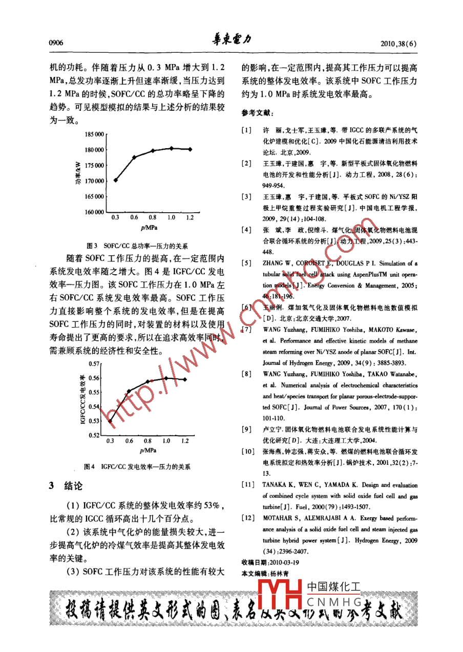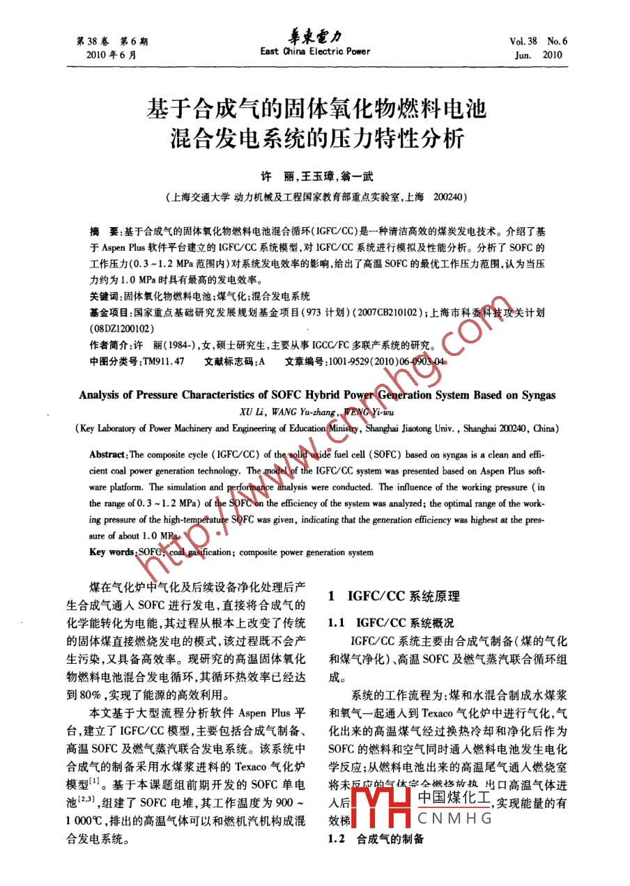 第38卷第6期阜束電力Vol 38 No 62010年6月East China Electric PowerJun.2010基于合成氣的固體氧化物燃料電池混合發(fā)電系統(tǒng)的壓力特性分析許麗,王玉璋,翁一武(上海交通大學(xué)動(dòng)力機(jī)械及工程國家教育部重點(diǎn)實(shí)驗(yàn)室,上海200240)摘要:基于合成氣的固體氧化物燃料電池混合循環(huán)( IGFC/CC)是一種清潔高效的煤炭發(fā)電技術(shù)。介紹了基于 Aspen Plus軟件平臺(tái)建立的 IGFC/CC系統(tǒng)模型,對(duì) IGFC/CC系統(tǒng)進(jìn)行模擬及性能分析。分析了SOFC工作壓力(0.3-1.2MPa范圍內(nèi))對(duì)系統(tǒng)發(fā)電效率的影響,給出了高溫SOFC的最優(yōu)工作壓力范圍,認(rèn)為當(dāng)力約為10MPa時(shí)具有最高的發(fā)電效率。關(guān)鍵詞:固體氧化物燃料電池;煤氣化;混合發(fā)電系統(tǒng)基金項(xiàng)目:國家重點(diǎn)基礎(chǔ)研究發(fā)展規(guī)劃基金項(xiàng)目(973計(jì)劃)(2007CB210102);上海市科委科技攻關(guān)計(jì)劃(08DZ1200102)作者簡介:許麗(1984-),女,碩士研究生,主要從事 IGCC/FC多聯(lián)產(chǎn)系統(tǒng)的研究。中圖分類號(hào):TM911.47文獻(xiàn)標(biāo)志碼:A文章編號(hào):10019529(2010)060903404Analysis of Pressure Characteristics of SOFC Hybrid Power Generation System Based on SyngasXU L, WANG Yu-zhang, WENG Yi-wuKey Laboratory of Power Machinery and Engineering of Education Ministry, Shanghai Jiaotong Univ, Shanghai 200240, ChinaAbstract: The composite cycle (IGFC/CC)of the solid oxide fuel cell( SOFC) based on syngas is a clean and effi-cient coal power generation technology. The model of the IGFC/CC system was presented based on Aspen Plus soft-ware platform. The simulation and performance analysis were conducted. The influence of the working pressure( inthe range of 0. 3-1 2 MPa)of the SOFC on the efficiency of the system was analyzed; the optimal range of the work-ing pressure of the high-temperature SOFC was given, indicating that the generation efficiency was highest at the pres-sure of about 1.0 MPaKey words: SOFC; coal gasification; composite power generation system煤在氣化爐中氣化及后續(xù)設(shè)備凈化處理后產(chǎn)生合成氣通入SOFC進(jìn)行發(fā)電,直接將合成氣的1IGFC/CC系統(tǒng)原理化學(xué)能轉(zhuǎn)化為電能,其過程從根本上改變了傳統(tǒng)1.1IGFC/CC系統(tǒng)概況的固體煤直接燃燒發(fā)電的模式,該過程既不會(huì)產(chǎn)1GFC/CC系統(tǒng)主要由合成氣制備(煤的氣化生污染,又具備高效率。現(xiàn)研究的高溫固體氧化和煤氣凈化)、高溫SOFC及燃?xì)庹羝?lián)合循環(huán)組物燃料電池混合發(fā)電循環(huán),其循環(huán)熱效率已經(jīng)達(dá)成。到80%,實(shí)現(xiàn)了能源的高效利用。系統(tǒng)的工作流程為:煤和水混合制成水煤漿本文基于大型流程分析軟件 Aspen Plus平和氧氣一起通入到 Texaco氣化爐中進(jìn)行氣化,氣臺(tái),建立了IGFC/CC模型,主要包括合成氣制備、化出來的高溫煤氣經(jīng)過換熱冷卻和凈化后作為高溫SOFC及燃?xì)庹羝?lián)合發(fā)電系統(tǒng)。該系統(tǒng)中SOFC的燃料和空氣同時(shí)通入燃料電池發(fā)生電化合成氣的制備采用水煤漿進(jìn)料的 Texaco氣化爐學(xué)反應(yīng);從燃料電池出來的高溫尾氣通入燃燒室模型口?;诒菊n題組前期開發(fā)的SOFC單電將未反應(yīng)的氣休宗仝桃檔前執(zhí)出口高溫氣體進(jìn)23),組建了SOFC電堆,其工作溫度為900池入后中國煤化工實(shí)現(xiàn)能量的有1000℃排出的高溫氣體可以和燃機(jī)汽機(jī)構(gòu)成混效梯CNMHG合發(fā)電系統(tǒng)。1.2合成氣的制備0904束電力010,38(6)進(jìn)入SOFC發(fā)電的合成氣制備主要分為兩該模型為了較為清晰的描述高溫SOFC整個(gè)工作步:煤在 Texaco氣化爐的氣化和后續(xù)的煤氣凈過程,將實(shí)際過程中同時(shí)進(jìn)行的置換反應(yīng)和電化化。 Texaco氣化爐采用水煤漿進(jìn)料的方式。原煤學(xué)反應(yīng)分兩步處理:首先凈化后的合成氣和循和水、添加劑、石灰石、氨水等混合制成濃度約環(huán)氣混合通入SHHT模塊進(jìn)行置換反應(yīng),將煤氣65%的水煤漿,經(jīng)高壓煤漿泵加壓后與高壓氧氣中的CO轉(zhuǎn)化為H2,然后通入到燃料電池的陽極經(jīng)燒嘴混合后噴入氣化爐內(nèi)進(jìn)行氣化。衡量氣化模擬電化學(xué)。根據(jù)燃料量(即合成氣量)和燃料爐性能優(yōu)劣的重要指標(biāo):合成氣中有效氣體成分,利用率可計(jì)算出陽極電化學(xué)反應(yīng)需要的氧氣量,冷煤氣效率和碳轉(zhuǎn)化率。表1為研究煤種的特性 CATHODE模塊則實(shí)現(xiàn)將該氧量從加壓后的空氣及氣化過程的工作參數(shù)。具體對(duì) Texaco氣化爐中分離并通入電池陽極,剩余空氣則用于吸收燃?xì)饣^程的建模及分析見文獻(xiàn)[1]。料電池電化學(xué)反應(yīng)釋放的熱量來模擬空氣冷卻燃表1氣化相關(guān)參數(shù)料電池的過程。煤工業(yè)分析%煤元素分析/%氣化爐工作參數(shù)燃料電池出口高溫氣體中仍含有部分未反應(yīng)W3.44‖c13.21進(jìn)煤量/kg·h-14000A59.09‖H69.27臨低位發(fā)熱量/·kg-12900的有效氣體,將它通入到后置燃燒室(BURN)進(jìn)5704.56工作壓力/MPa3步燃燒放熱,燃燒室出口的高溫尾氣驅(qū)動(dòng)燃?xì)鈜6.9N.28氧煤比08透平發(fā)電,從而實(shí)現(xiàn)了能量梯級(jí)利用,有效提高了3.6氧氣濃度98系統(tǒng)的發(fā)電效率。水煤漿濃度氣化爐出口的髙溫煤氣中含有H2S、COS等2SOFO雜質(zhì)氣體,對(duì)