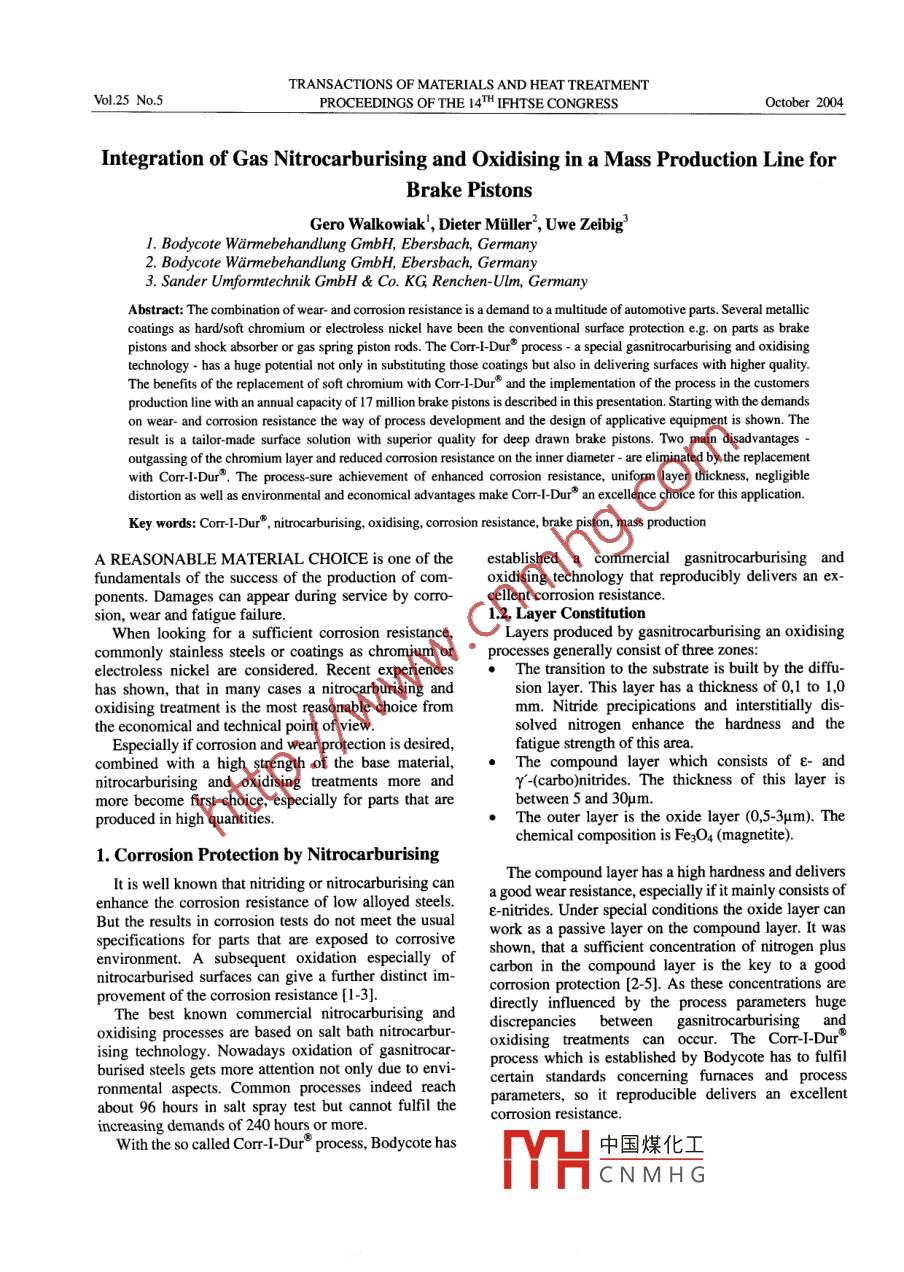 TRANSACTIONS OF MATERIALS AND HEAT TREATMENTPROCEEDINGS OF THE 14 IFHTSE CONGRESSOctobeIntegration of Gas Nitrocarburising and Oxidising in a Mass Production Line forBrake pistonsGero Walkowiak, Dieter Muller", Uwe Zeibig1. Bodycote Warmebehandlung GmbH, Ebersbach, Germany2. Bodycote Warmebehandlung gmbH, Ebersbach, Germany3. Sander Umformtechnik gmbH Co K Renchen-UIm, GermanyAbstract: The combination of wear-and corrosion resistance is a demand to a multitude of automotive parts. Several metalliccoatings as hard/soft chromium or electroless nickel have been the conventional surface protection e. g. on parts as brakepistons and shock absorber or gas spring piston rods. The Corr-l-Dur process-a special gasnitrocarburising and oxidisingtechnology. has a huge potential not only in substituting those coatings but also in delivering surfaces with higher qualityThe benefits of the replacement of soft chromium with Corm-I-Durand the implementation of the process in the customersproduction line with an annual capacity of 17 million brake pistons is described in this presentation, Starting with the demaron wear- and corrosion resistance the way of process development and the design of applicative equipment is shown. Thresult is a tailor-made surface solution with superior quality for deep drawn brake pistons. Two main disadvantageoutgassing of the chromium layer and reduced corrosion resistance on the inner diameter-are eliminated by the replacementwith Corr-I-Dur, The process-sure achievement of enhanced corrosion resistance, uniform layer thickness, negligibledistortion as well as environmental and economical advantages make Corr-"an excellence choice for this applicationKey words: Corr-I-Dur nitrocarburising, oxidising, corrosion resistance, brake piston, mass productionA REASONABLE MATERIAL CHOICE is one of the established a commercial gasnitrocarburising andfundamentals of the success of the production of com- oxidising technology that reproducibly delivers an ex-ponents. Damages can appear during service by corro- cellent corrosion resistancesion, wear and fatigue failure1. 2. Layer ConstitutionWhen looking for a sufficient corrosion resistance,Layers produced by gasnitrocarburisingan oxidisingommonly stainless steels or coatings as chromium or processes generally consist of three zones:electroless nickel are considered. Recent experiencesThe transition to the substrate is built by the diffu-has shown, that in many cases a nitrocarburising andsion layer. This layer has a thickness of 0, 1 to 1, 0oxidising treatment is the most reasonable choice frommm. Nitride precipications and interstitially dis-the economical and technical point of viewsolved nitrogen enhance the hardness and theEspecially if corrosion and wear protection is desiredfatigue strength of this areacombined with a high strength of the base material,The compound layer which consists of E-andnitrocarburising and oxidising treatments more andY(carbo)nitrides. The thickness of this layer ismore become first choice, especially for parts that arebetween 5 and 30umproduced in high quantities.The outer layer is the oxide layer(0,5-3um). Thechemical composition is Fe] O4(magnetite).1. Corrosion Protection by NitrocarburisingIt is well known that nitriding or nitrocarburising canThe compound layer has a high hardness and deliversenhance the corrosion resistance of low alloyed steelsgood wear resistance, especially if it mainly consists ofe-nitrides. Under special conditions the oxide layer canBut the results in corrosion tests do not meet the usual work as a passive layer on the compound layer. It wasspecifications for parts that are exposed to corrosiveshown, that a sufficient concentration of nitrogen plusenvironment. A subsequent oxidation especially of carbon in the compound layer is the key to a goodnitrocarburised surfaces can give a further distinct improvement of the corrosion resistance [1-3orrosion protection[2-5]. As these concentrations aredirectly influenced by the process parameters hugeThe best known commercial nitrocarburising and discrepancies between gasnitrocarburising andoxidising processes are based on salt bath nitrocarbuising technology. Nowadays oxidation ot gasnitrocar-. process which is established by Bodycote has to fulfilronmental aspects. Common processes indeed reach certain standards concerning furnaces and processparameters, so it reproducible delivers an excellentabout 96 hours in salt spray test but cannot fulfil the corrosion resistanceincreasing demands of 240 hours or moreWith the so called Corr-I-Dur process, Bodycote has中國(guó)煤化工CNMHG406PROCEEDINGS OF THE 14IFHTSE CONGRESSOctober 20042. Fields of ApplicationProducing the surface in an environmentally comTypical applications are automotive parts on which aibleCorr-l-Dur is a suitable process for the treatment ofcombiantion of wear- and corrosion resistance is the deep drawn brake pistons. To keep the core hardnessrequired. In a lot of cases the Corr-I-Durtreatmentreplaces traditional coatings as chromium or electrolessof the material, the process has to run at reducednickel. On many parts customers changed the treatment temperatures compared to a standard process.Thefrom gasnitrocarburising to Corr-I-Dur, adopting the maximum allowed value was found in annealing tests atpossibility of an additional corrosion resistancedifferent temperatures. For a good corrosion resistance itIn this work we present the substitution of a chreis very important to control the process in that way that amium coating on brake pistons for automotive industry compound layer with a sufficient nitrogen content isby a special Corr-I-Dur treatment, and its introduction produced, in spite of the reduced treatment temperaturesThis could be obtained by optimised gas compositionsinto mass production3. Process Development for Brake Pistonson the inner diameter because CorT-I-Dur is based upongasnitrocarburisingStart of the development of the new surface for brakeWe deci