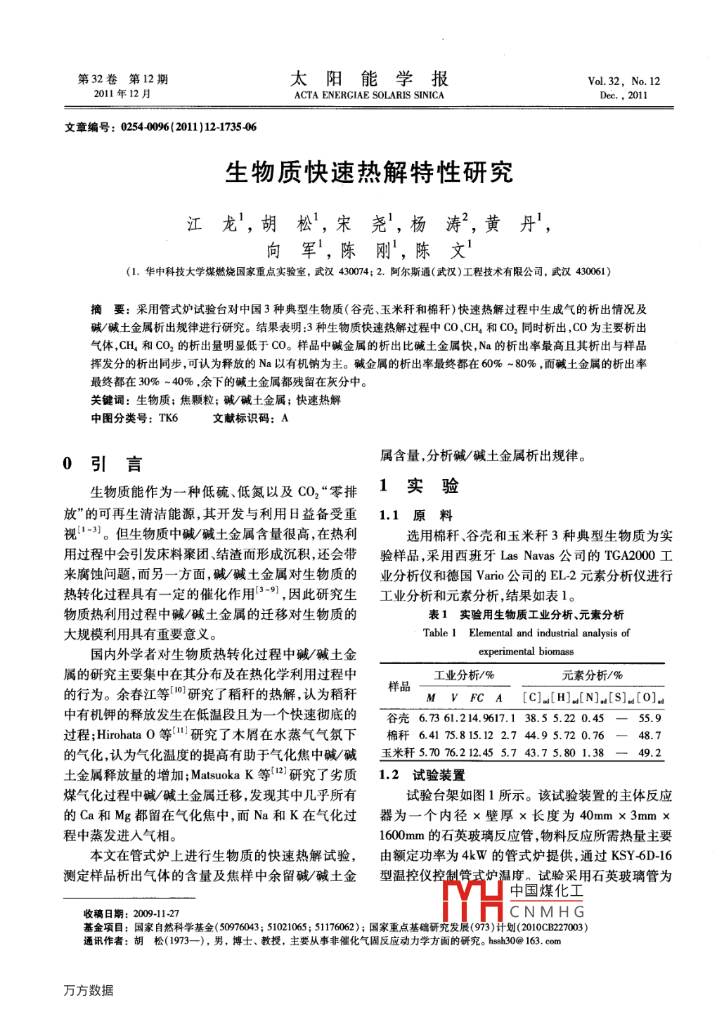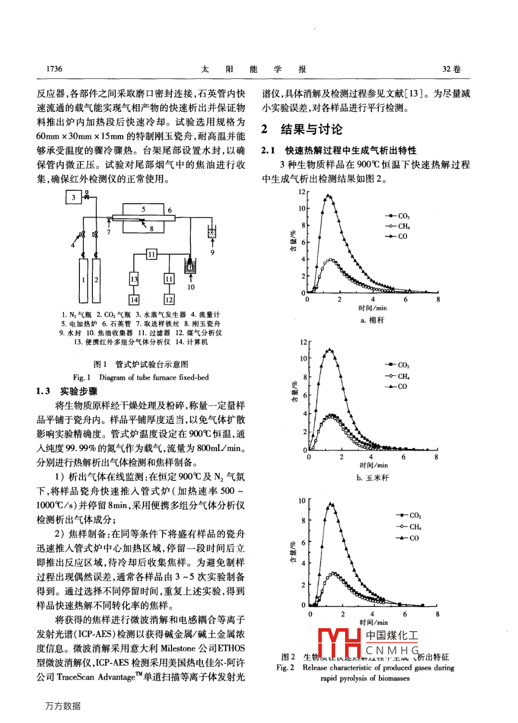 第32卷第12期太陽能學(xué)報Vol 32. No 122011年12月ACTA ENERGIAE SOLARIS SINICADec.,2011文章編號:02540096(2011)12-173506生物質(zhì)快速熱解特性研究江龍1,胡松,宋堯!,楊濤2,黃丹,向軍,陳剛,陳文1(1.華中科技大學(xué)煤燃燒國家重點實驗室,武漢430074;2.阿爾斯通(武漢)工程技術(shù)有限公司,武漢430061)摘要:采用管式爐試驗臺對中國3種典型生物質(zhì)(谷殼、玉米稈和棉稈)快速熱解過程中生成氣的析出情況及堿/堿土金屬析出規(guī)律進行研究。結(jié)果表明:3種生物質(zhì)快速熱解過程中CO、CH4和CO2同時析出,CO為主要析出氣體,CH4和CO2的析出量明顯低于CO。樣品中堿金屬的析出比堿土金屬快,Na的析出率最高且其析出與樣品揮發(fā)分的析出同步,可認(rèn)為釋放的Na以有機鈉為主。堿金屬的析出率最終都在60%~80%,而堿土金屬的析出率最終都在30%~40%,余下的堿土金屬都?xì)埩粼诨曳种嘘P(guān)鍵詞:生物質(zhì);焦顆粒;堿/堿土金屬;快速熱解中圖分類號:TK6文獻(xiàn)標(biāo)識碼:A0引言屬含量,分析堿/堿土金屬析出規(guī)律。生物質(zhì)能作為一種低硫、低氮以及CO2“零排1實驗放”的可再生清潔能源,其開發(fā)與利用日益?zhèn)涫苤?.1原料視-3)。但生物質(zhì)中堿/堿土金屬含量很高,在熱利選用棉稈、谷殼和玉米稈3種典型生物質(zhì)為實用過程中會引發(fā)床料聚團、結(jié)渣而形成沉積,還會帶驗樣品,采用西班牙 Las navas公司的TGA2000工來腐蝕問題,而另一方面,堿/堿土金屬對生物質(zhì)的業(yè)分析儀和德國Ⅴaro公司的EL2元素分析儀進行熱轉(zhuǎn)化過程具有一定的催化作用”,因此研究生工業(yè)分析和元素分析,結(jié)果如表1。物質(zhì)熱利用過程中堿/堿土金屬的遷移對生物質(zhì)的表1實驗用生物質(zhì)工業(yè)分析、元素分析大規(guī)模利用具有重要意義。Table 1 Elemental and industrial analysis of國內(nèi)外學(xué)者對生物質(zhì)熱轉(zhuǎn)化過程中堿/堿土金experimental biomass屬的研究主要集中在其分布及在熱化學(xué)利用過程中樣品、工業(yè)分析%元素分析/%的行為。余春江等研究了稻稈的熱解,認(rèn)為稻稈M v FC A [CM[H[Nd[S][o].中有機鉀的釋放發(fā)生在低溫段且為一個快速徹底的谷殼6761.21491138.55220.455.9過程; Hirohata O等研究了木屑在水蒸氣氣氛下棉稈64175.815.12274.95.720.76的氣化,認(rèn)為氣化溫度的提高有助于氣化焦中堿/堿玉米稈5706.212455743.75801.38二492土金屬釋放量的增加; Matsuoka K等2研究了劣質(zhì)1.2試驗裝置煤氣化過程中堿/堿土金屬遷移,發(fā)現(xiàn)其中幾乎所有試驗臺架如圖1所示。該試驗裝置的主體反應(yīng)的Ca和Mg都留在氣化焦中,而Na和K在氣化過器為一個內(nèi)徑壁厚x長度為40mm×3mmx程中蒸發(fā)進入氣相1600mm的石英玻璃反應(yīng)管,物料反應(yīng)所需熱量主要本文在管式爐上進行生物質(zhì)的快速熱解試驗,由額定功率為4kW的管式爐提供,通過KSY6D-16測定樣品析出氣體的含量及焦樣中余留堿/堿土金型溫控儀控制管式爐溫度。試驗采用石英玻璃管為中國煤化工收稿日期:2009-1127ICNMHG通訊作者:胡松(1973),男,博士、教授,主要從事非催化氣固反應(yīng)動力學(xué)方面的研究。hs30@163.wm基金項目:國家自然科學(xué)基金(50976043;51021065;51176062);國家重點基礎(chǔ)研究發(fā)展(973)計劃(2010cB27003)1736太陽能學(xué)報32卷反應(yīng)器,各部件之間釆取磨口密封連接,石英管內(nèi)快譜儀,具體消解及檢測過程參見文獻(xiàn)[13]。為盡量減速流通的載氣能實現(xiàn)氣相產(chǎn)物的快速析出并保證物小實驗誤差,對各樣品進行平行檢測。料推出爐內(nèi)加熱段后快速冷卻。試驗選用規(guī)格為60mm×30mm×15mm的特制剛玉瓷舟,耐高溫并能2結(jié)果與討論夠承受溫度的驟冷驟熱。臺架尾部設(shè)置水封,以確2.1快速熱解過程中生成氣析出特性保管內(nèi)微正壓。試驗對尾部煙氣中的焦油進行收3種生物質(zhì)樣品在900℃恒溫下快速熱解過程集,確保紅外檢測儀的正常使用。中生成氣析出檢測結(jié)果如圖2。國回回2時間/min1.N2氣瓶2.CO2氣瓶3.水蒸氣發(fā)生器4.流量計5.電加熱爐6.石英管7.取送樣鐵絲8.剛玉瓷舟棉稈9.水封10.焦油收集器11.過濾器12.煤氣分析儀13.便攜紅外多組分氣體分析儀14.計算機圖1管式爐試驗臺示意圖Fig. 1 Diagram of tube furnace fixed-bed-o- CH1.3實驗步驟a-co將生物質(zhì)原樣經(jīng)干燥處理及粉碎稱量一定量樣品平鋪于瓷舟內(nèi)。樣品平鋪厚度適當(dāng),以免氣體擴散影響實驗精確度。管式爐溫度設(shè)定在900℃恒溫,通人純度99.9%的氮氣作為載氣,流量為800mL/min。分別進行熱解析出氣體檢測和焦樣制備。時間/min1)析出氣體在線監(jiān)測:在恒定900℃及N2氣氛b.玉米稈下,將樣品瓷舟快速推入管式爐(加熱速率500~1000℃/s)并停留8min,采用便攜多組分氣體分析儀檢測析出氣體成分2)焦樣制備:在同等條件下將盛有樣品的瓷舟迅速推入管式爐中心加熱區(qū)域,停留一段時間后立即推出反應(yīng)區(qū)域,待冷卻后收集焦樣。為避免制樣過程出現(xiàn)偶然誤差,通常各樣品由3~5次實驗制備得到。通過選擇不同停留時間,重復(fù)上述實驗,得到樣品快速熱解不同轉(zhuǎn)化率的焦樣。將獲得的焦樣進行微波消解和電感耦合等離子0時間/min發(fā)射光譜(ICP-AFS)檢測以獲得堿金屬/堿土金屬濃中國煤化工度信息。微波消解采用意大利 Milestone公司 ETHOSJHCNMHG型微波消解儀,