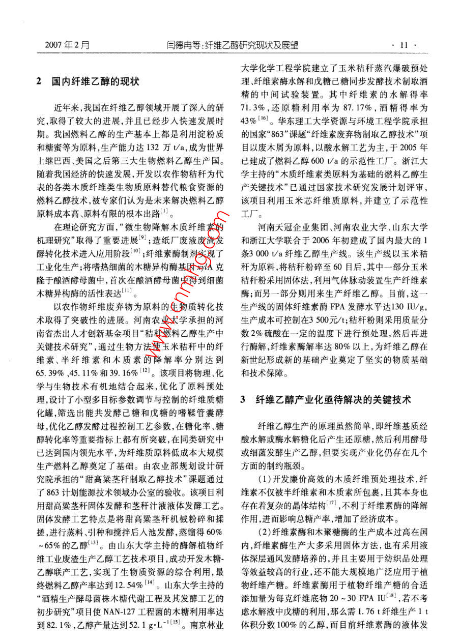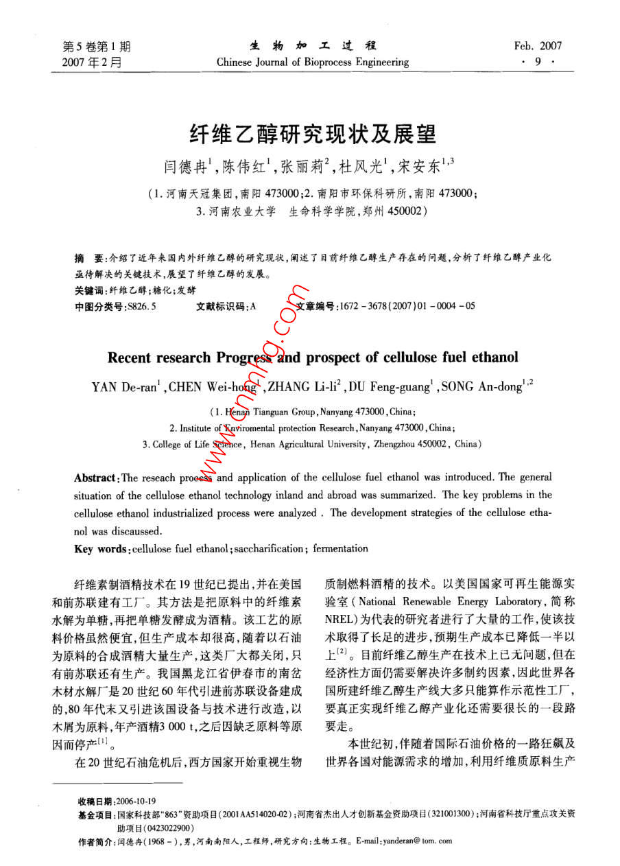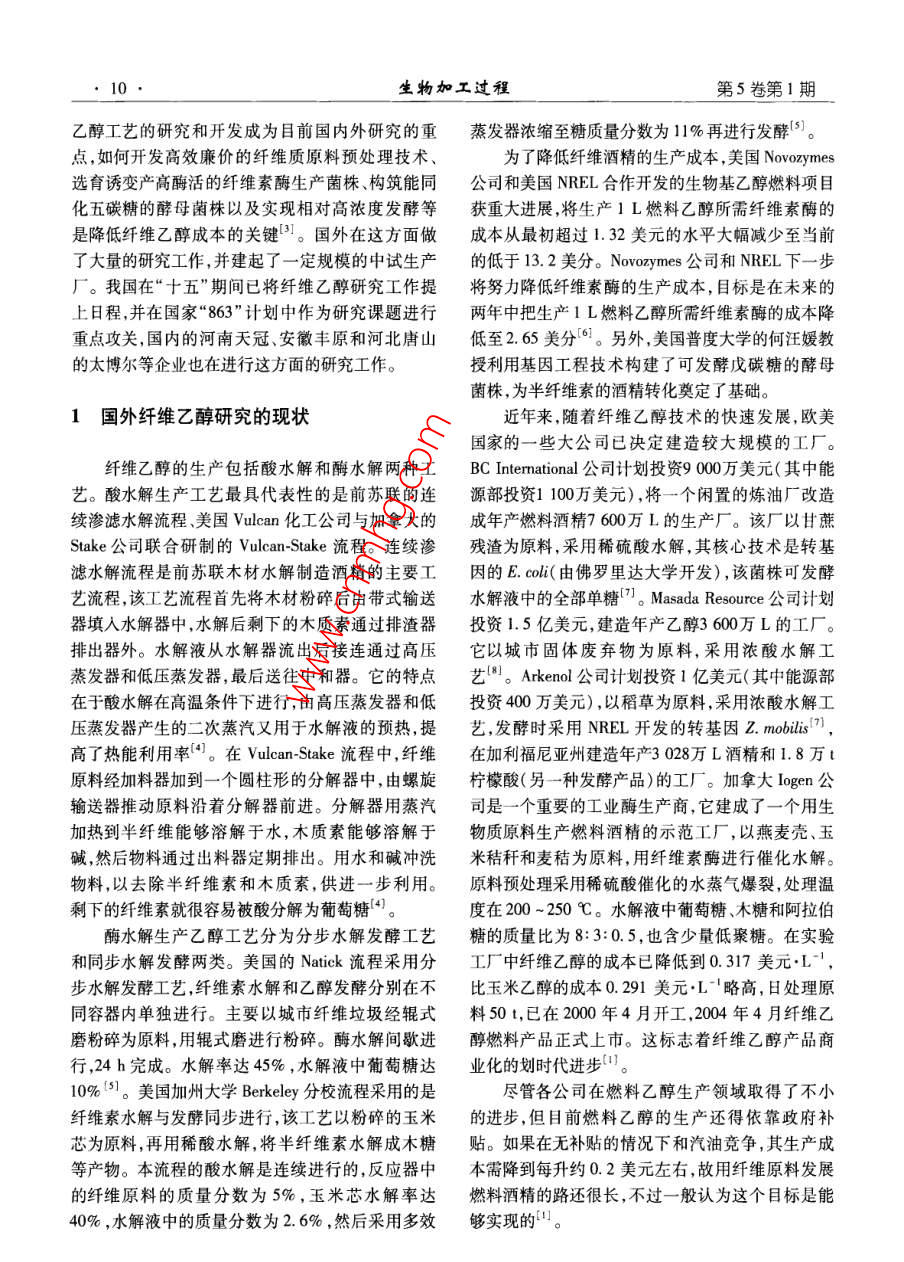 第5卷第1期生物加工過程Feb.20072007年2月 Chinese Journal of Bioprocess Engineering9纖維乙醇研究現(xiàn)狀及展望閆德冉,陳偉紅,張麗莉2,杜風(fēng)光,宋安東3(1.河南天冠集團(tuán),南陽473000:2.南陽市環(huán)??蒲兴?南陽473000;3.河南農(nóng)業(yè)大學(xué)生命科學(xué)學(xué)院,鄭州450002)摘要:介紹了近年來國內(nèi)外纖維乙醇的研究現(xiàn)狀,闡述了目前纖維乙醇生產(chǎn)存在的問題,分析了纖維乙醇產(chǎn)業(yè)化亟待解決的關(guān)鍵技術(shù),展望了纖維乙醇的發(fā)展。關(guān)鍵詞:纖維乙醇;糖化;發(fā)酵中圖分類號:S826.5文獻(xiàn)標(biāo)識碼:A文章編號:1672-3678(20071-0004-05 Recent research Progress and prospect of cellulose fuel ethanol YAN De-ran', CHEN Wei-hong', ZHANG Li-li2, DU Feng-guang', SONG An-dong'.2 (1. Henan Tianguan Group, Nanyang 473000, China; 2. Institute of Enviromental protection Research, Nanyang 473000,China; 3. College of Life Science, Henan Agricultural University, Zhengzhou 450002, China) Abstract: The reseach process and application of the cellulose fuel ethanol was introduced. The general situation of the cellulose ethanol technology inland and abroad was summarized. The key problems in the cellulose ethanol industrialized process were analyzed. The development strategies of the cellulose etha- nol was discaussed. Key words: cellulose fuel ethanol; saccharification; fermentation纖維素制酒精技術(shù)在19世紀(jì)已提出,并在美國質(zhì)制燃料酒精的技術(shù)。以美國國家可再生能源實和前蘇聯(lián)建有工廠。其方法是把原料中的纖維素驗室( National Renewable Energy Laboratory,簡稱水解為單糖,再把單糖發(fā)酵成為酒精。該工藝的原NREL)為代表的研究者進(jìn)行了大量的工作,使該技料價格雖然便宜,但生產(chǎn)成本卻很高,隨著以石油術(shù)取得了長足的進(jìn)步,預(yù)期生產(chǎn)成本已降低一半以為原料的合成酒精大量生產(chǎn),這類廠大都關(guān)閉,只上目前纖維乙醇生產(chǎn)在技術(shù)上已無問題,但在有前蘇聯(lián)還有生產(chǎn)。我國黑龍江省伊春市的南岔經(jīng)濟(jì)性方面仍需要解決許多制約因素,因此世界各木材水解廠是20世紀(jì)60年代引進(jìn)前蘇聯(lián)設(shè)備建成國所建纖維乙醇生產(chǎn)線大多只能算作示范性工廠,的,80年代末又引進(jìn)該國設(shè)備與技術(shù)進(jìn)行改造,要真正實現(xiàn)纖維乙醇產(chǎn)業(yè)化還需要很長的一段路木屑為原料,年產(chǎn)酒精3000t,之后因缺乏原料等原要走。因而停產(chǎn)。本世紀(jì)初,伴隨著國際石油價格的一路狂飆及在20世紀(jì)石油危機(jī)后,西方國家開始重視生物世界各國對能源需求的增加,利用纖維質(zhì)原料生產(chǎn)收稿日期:2006-10-19基金項目:國家科技部“863”資助項目(2001AA51402002);河南省杰出人才創(chuàng)新基金資助項目(321001300;河南省科技廳重點攻關(guān)資助項目(0423022900)作者簡介:德(1968-),男,河南南陽人,工程師,研究方向:生物工程-mai l yanderan tom.com10生物加工過程第5卷第1期乙醇工藝的研究和開發(fā)成為目前國內(nèi)外研究的重蒸發(fā)器濃縮至糖質(zhì)量分?jǐn)?shù)為11%再進(jìn)行發(fā)酵點,如何開發(fā)高效廉價的纖維質(zhì)原料預(yù)處理技術(shù)、為了降低纖維酒精的生產(chǎn)成本,美國 Novozymes選育誘變產(chǎn)高酶活的纖維素酶生產(chǎn)菌株、構(gòu)筑能同公司和美國NREL合作開發(fā)的生物基乙醇燃料項目化五碳糖的酵母菌株以及實現(xiàn)相對高濃度發(fā)酵等獲重大進(jìn)展,將生產(chǎn)1L燃料乙醇所需纖維素酶的是降低纖維乙醇成本的關(guān)鍵國外在這方面做成本從最初超過1.32美元的水平大幅減少至當(dāng)前了大量的研究工作,并建起了一定規(guī)模的中試生產(chǎn)的低于13.2美分。 Novozymes公司和NREL下一步廠。我國在“十五”期間已將纖維乙醇研究工作提將努力降低纖維素酶的生產(chǎn)成本,目標(biāo)是在未來的上日程,并在國家“863計劃中作為研究課題進(jìn)行兩年中把生產(chǎn)1L燃料乙醇所需纖維素酶的成本降重點攻關(guān),國內(nèi)的河南天冠、安徽豐原和河北唐山低至2.65美分。另外,美國普度大學(xué)的何汪媛教的太博爾等企業(yè)也在進(jìn)行這方面的研究工作。授利用基因工程技術(shù)構(gòu)建了可發(fā)酵戊碳糖的酵母菌株,為半纖維素的酒精轉(zhuǎn)化奠定了基礎(chǔ)。1國外纖維乙醇研究的現(xiàn)狀近年來,隨著纖維乙醇技術(shù)的快速發(fā)展,歐美國家的一些大公司已決定建造較大規(guī)模的工廠。纖維乙醇的生產(chǎn)包括酸水解和酶水解兩種工 BC International公司計劃投資9000萬美元(其中能藝。酸水解生產(chǎn)工藝最具代表性的是前蘇聯(lián)的連源部投資1100萬美元),將一個閑置的煉油廠改造續(xù)滲濾水解流程、美國 Vulcan化工公司與加拿大的成年產(chǎn)燃料酒精7600萬L的生產(chǎn)廠。該廠以甘蔗 StakeVulcan-Stake公司聯(lián)合研制的-流程連續(xù)滲殘渣為原料,采用稀硫酸水解,其核心技術(shù)是轉(zhuǎn)基濾水解流程是前蘇聯(lián)木材水解制造酒精的主要工因的E.coli(由佛羅里達(dá)大學(xué)開發(fā)),該菌株可發(fā)酵藝流程,該工藝流程首先將木材粉碎后由帶式輸送水解液中的全部單糖 Masada Resource公司計劃器填入水解器中,水解后剩下的木質(zhì)素通過排渣器投資1.5億美元,建造年產(chǎn)乙醇3600萬L的工廠。排出器外水解液從水解器流