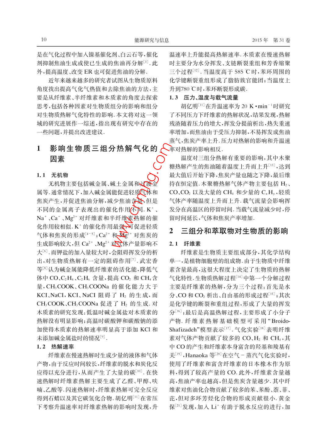 能源研究與信息第31卷第1期Energy Research and InformationVol.31 No.1 2015文章編號:1008-8857(2015)01 - 0009-05DOI: 10.13259/j. cnki. eri.2015. 01.003生物質(zhì)組分熱解氣化特性研究現(xiàn)狀蔣林宏,俞海淼(同濟大學機械與能源工程學院,上海201804)摘要:為了提升生物質(zhì)氣化氣熱值,減少焦油產(chǎn)率,越來越多的研究者開始試圖從生物質(zhì)組分的角度對熱解氣化特性進行探索.概述了堿金屬、溫度、壓力、升溫速率在熱解氣化過程中對生物質(zhì)組分造成的影響,以及纖維素、半纖維素、木質(zhì)素、萃取物和組分間相互作用對生物質(zhì)熱解氣化過程造成的影響。提出了在二組分相互作用研究的基礎上,應繼續(xù)開展三組分相互作用的實驗研究,以及生物質(zhì)模化物和生物質(zhì)原料化學結構差異對生物質(zhì)原料熱解氣化特性的影響。此外,提出了采用單變量對照實驗方法研究單變量的作用大小.關鍵詞:三組分;萃取物;相互作用中圖分類號: TK6文獻標志碼: AResearch status on gasification and pyrolysischaracteristics of biomass componentsJIANG Linhong, YU Haimiao .(School of Mechanical Engineering. Tongji University, Shanghai 201804, China)Abstract: In order to improve the heating value of the gaseous product and decrease theyield of tar from the pyrolysis and gasification of biomass, the pyrolysis and gasificationcharacteristics of biomass components are investigated widely. The effects of the alkali,temperature, pressure,and heating rate on the pyrolysis and gasification are summarized.The effects of cellulose, hemicellulose,lignin and the interactions between them on thegasification and pyrolysis are also discussed. Besides those, the effects of the interactionsamong three components, the difference among the biomass model compounds, and thchemical structure of the biomass on the gasification characteristics require some furtherinvestigations on the foundation of the two components experiments. At last, the singlevariable controlled experiments are proposed to study the effect of the single factor.Key words: three component; extract; interaction生物質(zhì)氣化和熱解是將生物質(zhì)能源轉(zhuǎn)換為高化技術的推廣.提高熱值的傳統(tǒng)方法包括提高氣品位氣體燃料時使用的一-種有效利用生物質(zhì)能源化溫度和當量比(ER)、加入催化劑、改變物料特的方式之一切.但其也存在著諸多問題,以生物質(zhì)性21.焦油對氣化過程以及相關的設備和實驗人氣化為例,主要有氣化氣低熱值以及焦油等問題.員造成很大危害.去除焦油的傳統(tǒng)方法包括催化氣化氣熱值過低導致氣化氣成本上升,阻礙了氣裂解、烘培.低溫慢速熱解處理等.催化裂解主要收稿日期: 2014-05- 06第一作者:蔣林宏(1990- ),男,碩士研究生.研究方向:生物質(zhì)氣化. E-mail: 448455796@ qq. com通信作者:俞海森(1976- ),男,副教授.研究方向:生物質(zhì)氣化. E-mail: myhtongji@ 126. com10能源研究與信息2015年第31卷是在氣化過程中加人鎳基催化劑、白云石等.催化溫速率上升能提高熱解速率.木質(zhì)素在慢速熱解劑抑制焦油生成或使已生成的焦油再分解5]。此時主要分為水分揮發(fā)、支鏈斷裂重組和芳香縮聚外,提高溫度、改變ER也可促進焦油的分解,三個過程[2],當溫度高于585 C時,苯環(huán)周圍的近年來越來越多的研究者試圖從生物質(zhì)原料化學鍵斷裂重組形成了脂肪族官能團;當溫度上角度找出提高氣化氣熱值和去除焦油的方法,主升到780 C時,苯環(huán)斷裂形成碳.要是從纖維素、半纖維素和木質(zhì)素的角度去探索.3 壓力、溫度與載氣流量思考,包括各種因素對生物質(zhì)組分的影響和組分胡億明11]在升溫速率為20 K●min~ '時研究對生物質(zhì)熱解氣化特性的影響.本文將對這一領了不同壓力下纖維素的熱解狀況,結果發(fā)現(xiàn).熱解域的研究進展作一.綜述,指出現(xiàn)有研究中存在的殘渣隨著壓力的增大,揮發(fā)分提前析出,熱失重速一些問題,并提出改進建議.率增加,而焦油由于受壓力抑制,不易揮發(fā)成焦油蒸氣,焦炭產(chǎn)率上升.壓力對熱解的影響和升溫速影響生物質(zhì)三組分熱解氣化的率對熱解的影響相反.因素溫度對三組分熱解有重要的影響,其中木聚糖熱解產(chǎn)生的焦油隨著溫度上升而上升[13] ,達到1.1無機物最大值后開始下降.焦炭產(chǎn)量也隨之下降,最后維無機物主要包括堿金屬、堿土金屬和過渡金持在恒定值.木聚糖熱解氣體產(chǎn)物主要包括H2、屬等.通常情況下,加入堿金屬能促進輕質(zhì)氣體和CO、CO2 以及大量的CH和少量的C.H,輕質(zhì)焦炭產(chǎn)生,并促進焦油分解,減少焦油含量,但是氣體產(chǎn)率隨溫度上升而上升.載氣流量會影響揮不同的金屬離子表現(xiàn)出的催化作用不同. K*、發(fā)分在高溫區(qū)的停留時間.當載氣流量減少時,停Na+、Ca*、Mg2+對纖維素和半纖維素熱解的催留時間延長,氣體和焦炭產(chǎn)率增加.化作用較相似.K*的催化作用最強,可促進輕質(zhì)2三組分和萃取物對生物質(zhì)的影響氣體和焦炭的形成[+-5];Ca+和Mg+對焦炭的生成影響較大,但Ca+、Mg°對氣體產(chǎn)量影響不2.1纖維素大回。而鉀鹽的加入量較大時,會阻礙揮發(fā)分的析纖維素是生物質(zhì)主要組成部分,其化學結構出,對生物質(zhì)熱解有一-定的阻礙作用口.武宏香單一,是植物細胞璧的組成物.由于生物質(zhì)中纖維等[8].認為堿金屬能降低纖維素的活化能,降低氣素含量最高,這很大程度上決定了生物質(zhì)的熱解體中CO