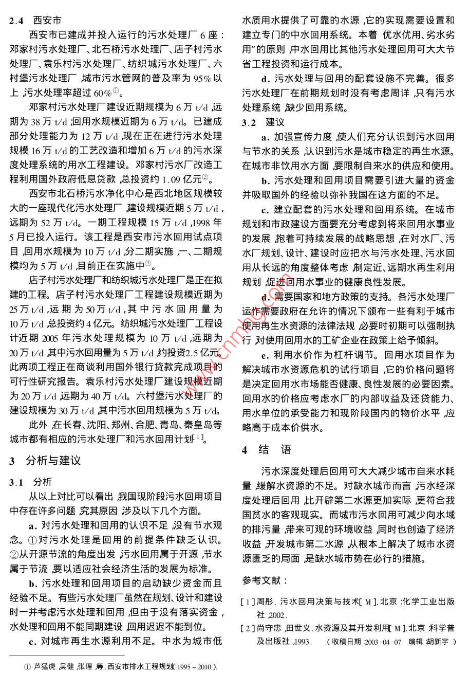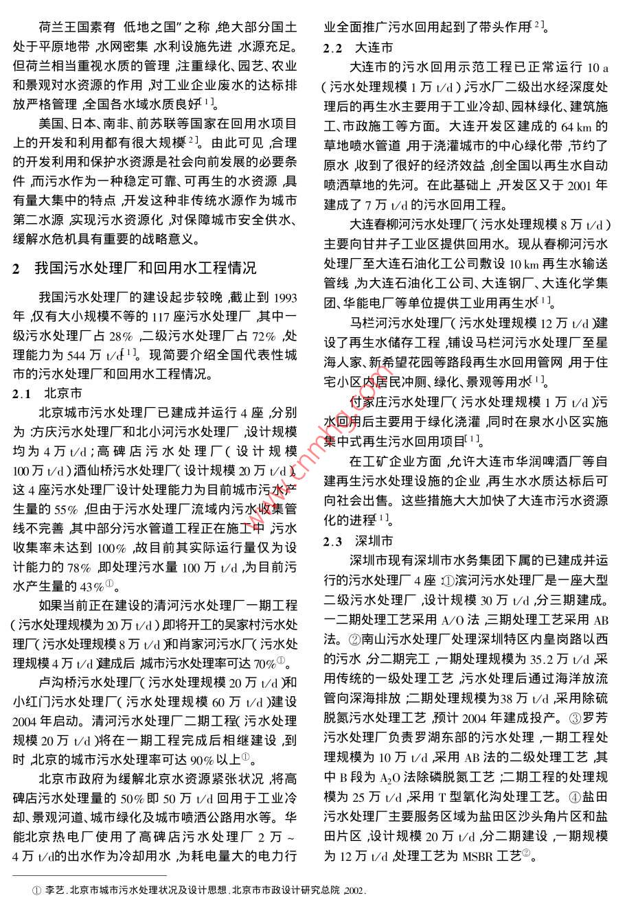 水資源保護口2004年第1期淺談我國污水處理及污水資源化李玉鯤李玉鵬2李明濤11深圳市水務(wù)集團廣東深圳5180312.黑龍江省引嫩工程管理處黑龍江安達151400)摘要炌介紹了國內(nèi)外污水處理及回用的現(xiàn)狀重點介紹了現(xiàn)階段我國北京、大連、深圳等城市污水處理廠和回用工程的情況對我國在污水回用方面存在的對污水處理和回用的認(rèn)識不足、污水處理和回用項目的啟動缺少資金而且經(jīng)驗不足、污水處理與回用的配套設(shè)施不完善等問題進行了探討,說明我國開發(fā)利用城市第二水資源——污水資源將從根本上解決城市水資源匱乏旳局面實現(xiàn)污水資源化對保障城市安全供水緩解水危機具有重要的戰(zhàn)略意義關(guān)鍵詞水資源污水處理污水回用中圖分類號X703文獻標(biāo)識碼文章編號:004-693x20041-0003-03中國水資源總量位居世界前列但由于人口眾灌和景觀用水等。以污代清既可以節(jié)約優(yōu)質(zhì)水又可多人均水資源量不足世界人均水資源量的1/41。以在解決城市缺水問題的同時減少污染物的排放起針對我國水資源存在的水炙洪水水儀缺水)水到從量上養(yǎng)蓄水資源從質(zhì)上保護水資源的作用。臟污染)大問題如何合理開發(fā)利用和保護水資但由于資金、技術(shù)、重視程度等各方面的原因中源關(guān)系到我國經(jīng)濟社會的可持續(xù)發(fā)展。污水作為國的污水處理和污水資源化進程相當(dāng)緩慢。同世界種穩(wěn)定可靠、可再生利用的水資源對其充分開發(fā)上其他國家相比中國的污水處理和回用水工程還處利用是有效節(jié)約、開發(fā)利用水資源的重要手段之于起步階段這就要求我們要及時了解國內(nèi)外污水處是解決城市缺水問題的關(guān)鍵。理行業(yè)的最新動態(tài)根據(jù)我國國情制定出適合我國污國內(nèi)外污水處理及回用現(xiàn)狀水處理和污水資源化經(jīng)營發(fā)展的新思路、新方法。12國外污水處理及回用情況1.1我國污水處理現(xiàn)狀由于地理位置、自然環(huán)境和客觀條件等因素國隨著人口的增加和工農(nóng)業(yè)旳發(fā)展城鎮(zhèn)用水量外許多國家水資源嚴(yán)重缺乏污水回用起步較已猛增造成水資源短缺進而影響城市供水。據(jù)統(tǒng)計,摒棄了城市污水處理后排放和污水搬家旳做法在全國669座城市中有400座常年供水不足其中有污水回用方面取得了長足的進展并積累了相當(dāng)豐10座嚴(yán)重缺水缺水量達到1600萬td60億υa富的經(jīng)驗?,F(xiàn)以幾個缺水國家為例簡要介紹國外由于缺水的影響工業(yè)產(chǎn)值損失達2000多億元/a的污水處理情況。天津、長春、大連、青島、唐山、煙臺等大中城市已受以色列是一個以發(fā)展農(nóng)業(yè)技術(shù)而著稱的國家,到水資源短缺的嚴(yán)重威脅1水資源的嚴(yán)重短缺促進了以色列污水回用技術(shù)的發(fā)另一方面隨著用水量的增加我國城鎮(zhèn)污水排展。目前以色列在污水凈化和回收利用方面處于世放量也迅猛增加?,F(xiàn)階段我國城市污水排放量已達界領(lǐng)先地位。以色列立法規(guī)定廢水若未用盡不可到414億t幾乎與城市供水量相等盧與此相對應(yīng)的采用海水淡化。城市中的每一滴水至少回用一次是我國污水處理率一直處于較低的水平。截止到污水回用后用于農(nóng)業(yè)灌溉、工業(yè)企業(yè)、市民沖廁、河2003年初我國已建污水處理設(shè)施400余座城市污流復(fù)蘇等方面。污水再生成本是海水淡化的1/3水處理率僅30%二級處理率僅15%。城市供水量1/5這使人們認(rèn)識到必須優(yōu)先利用污水。全國的80%變?yōu)槲鬯湃牍芫W(wǎng)中造成水資源的嚴(yán)重浪90%的污水收集排放80%經(jīng)過處理最后有60%費若將這些城市污水收集起來處理,0%可作為再65%的處理后的污水回用。這些再生水中有42%生κ1用于廁所沖洗、辦公樓拖地、沖洗車輛、綠化澆用于灌溉30%回灌地下[1J荷蘭王國素有低地之國”之稱絕大部分國土業(yè)全面推廣污水回用起到了帶頭作用2處于平原地帶水網(wǎng)密集水利設(shè)施先進水源充足。2.2大連市但荷蘭相當(dāng)重視水質(zhì)的管理注重綠化、園藝、農(nóng)業(yè)大連市的污水回用示范工程已正常運行10a和景觀對水資源的作用對工業(yè)企業(yè)廢水的達標(biāo)排(污水處理規(guī)模1萬td)污水廠二級出水經(jīng)深度處放嚴(yán)格管理全國各水域水質(zhì)良好1理后的再生水主要用于工業(yè)冷卻、園林綠化、建筑施美國、日本、南非、前蘇聯(lián)等國家在回用水項目工、市政施工等方面。大連開發(fā)區(qū)建成的64km的上的開發(fā)和利用都有很大規(guī)模2。由此可見,合理草地噴水管道用于澆灌城市的中心綠化帶節(jié)約了的開發(fā)利用和保護水資源是社會向前發(fā)展的必要條原水收到了很好的經(jīng)濟效益創(chuàng)全國以再生水自動件而污水作為一種穩(wěn)定可靠、可再生的水資源具噴灑草地的先河。在此基礎(chǔ)上開發(fā)區(qū)又于2001年有量大集中的特點開發(fā)這種非傳統(tǒng)水源作為城市建成了7萬Ud的污水回用工程第二水源實現(xiàn)污水資源化對保障城市安全供水大連春柳河污水處理「(污水處理規(guī)模8萬∽d)緩解水危機具有重要的戰(zhàn)略意義。主要向甘井子工業(yè)區(qū)提供回用水?,F(xiàn)從春柳河污水2