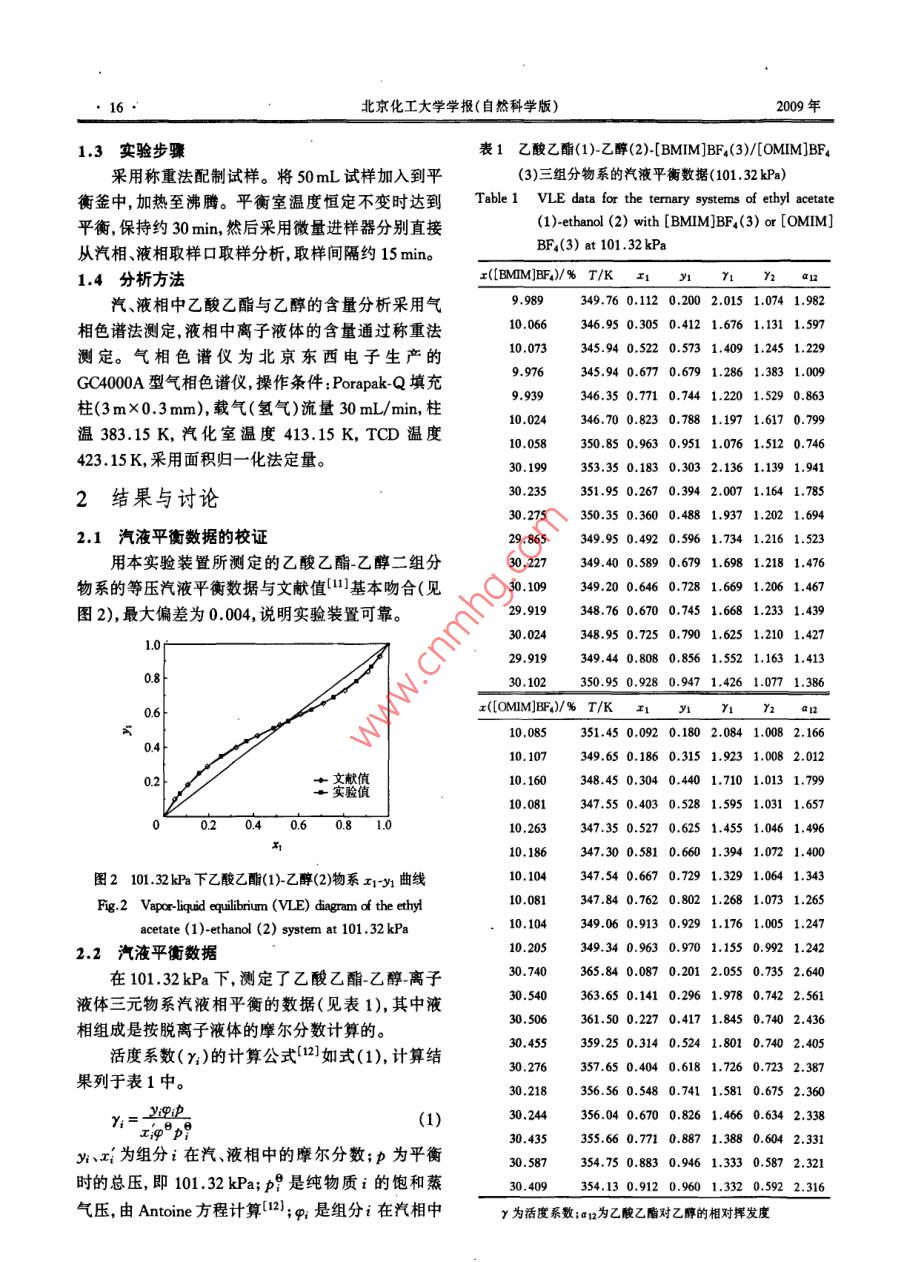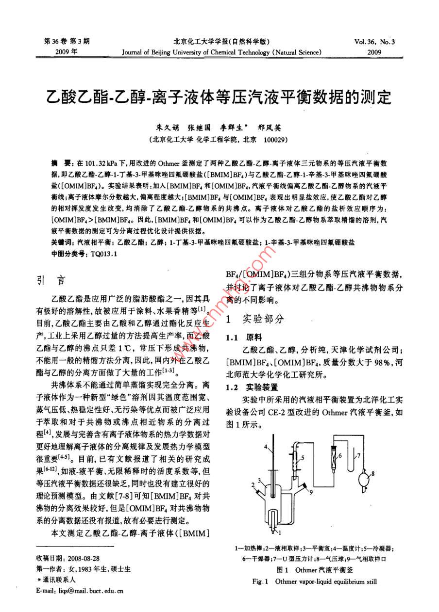 第36卷第3期北京化工大學(xué)學(xué)報(自然科學(xué)版)Vol 36, No. 32009年Journal of Beijing University of Chemical Technology(Natural Science)2009乙酸乙酯-乙醇-離子液體等壓汽液平衡數(shù)據(jù)的測定朱久娟張繼國李群生”邢風(fēng)英(北京化工大學(xué)化學(xué)工程學(xué)院,北京100029)摘要:在101.32kPa下,用改進的 Othmer釜測定了兩種乙酸乙酯乙醇離子液體三元物系的等壓汽液平衡數(shù)據(jù),即乙酸乙酯乙醇-1-丁基3-甲基咪唑四氟硼酸鹽([BMIM]BF4)與乙酸乙酯乙醇1-辛基3-甲基咪唑四氟硼酸鹽([OMIM]BF4)。實驗結(jié)果表明:加入[BMIM]BF4和[OMIM]BF4,汽液平衡線偏離乙酸乙酯乙醇物系的汽液平衡線;離子液體摩爾分數(shù)越大偏離程度越大;[BMIM]BF4與[OMM]BF4表現(xiàn)出明顯鹽效應(yīng)使乙酸乙酯對乙醇的相對揮發(fā)度發(fā)生改變,均消除了乙酸乙酯乙醇物系的共沸點。離子液體對乙酸乙酯的鹽析效應(yīng)順序為:[OMIM]BF4> [BMIM]BF4。因此,[BMIM]BF4和[OMM]BF4可以作為乙酸乙酯乙醇物系萃取精餾的溶劑汽液平衡數(shù)據(jù)的測定可為分離過程優(yōu)化設(shè)計提供依據(jù)。關(guān)鍵詞:汽液相平衡;乙酸乙酯;乙醇;1-丁基3甲基咪唑四氟硼酸鹽;1-辛基-3-甲基咪唑四氟硼酸鹽中圖分類號;TQ013.1引言BF4/[OMIM]BF4)三組分物系等壓汽液平衡數(shù)據(jù),并討論了離子液體對乙酸乙酯乙醇共沸物物系分乙酸乙酯是應(yīng)用廣泛的脂肪酸酯之一,因其具離的不同影響。有極好的溶解性,故被應(yīng)用于涂料、水果香精等山目前,乙酸乙酯主要由乙酸和乙醇通過酯化反應(yīng)生1實驗部分產(chǎn)工業(yè)上采用乙醇過量的方法提高生產(chǎn)率,而乙酸1.1原料乙酯與乙醇的沸點只差1℃,常壓下形成共沸物,乙酸乙酯、乙醇,分析純,天津化學(xué)試劑公司;不能用一般的精餾方法分離因此國內(nèi)外在乙酸乙[BMM]BF4、OMM]BF,質(zhì)量分數(shù)大于98%,河酯與乙醇的分離方面做了大量的工作13北師范大學(xué)化學(xué)化工研究所。共沸體系不能通過簡單蒸餾實現(xiàn)完全分離。離1.2實驗裝置子液體作為一種新型“綠色”溶劑因其溫度范圍寬、實驗中所采用的汽液相平衡裝置為北洋化工實蒸氣壓低熱穩(wěn)定性好、無污染等優(yōu)點而被廣泛應(yīng)用驗設(shè)備公司CE2型改進的 Othmer汽液平衡釜,如于萃取和對于共沸物或沸點相近物系的分離過圖1所示。程4,發(fā)展與完善含有離子液體物系的熱力學(xué)數(shù)據(jù)對更好地理解離子液體的分離規(guī)律及發(fā)展熱力學(xué)模型很重要4。目前,已有文獻報道了相關(guān)的研究成果612),如液液平衡、無限稀釋時的活度系數(shù)等,但等壓汽液平衡數(shù)據(jù)還很缺乏,同時也沒有建立很好的理論預(yù)測模型。由文獻[78]可知[BMM]BF4對共沸物的分離效果較好,但是[OMIM]BF4對共沸物物系的分離數(shù)據(jù)還沒有報道,故有必要進行測定。本文測定乙酸乙酯乙醇離子液體([BMIM]1一加熱棒;2-液相取樣;3—平衡室;4-溫度計;5—冷凝器;收稿日期:2008-08-28干燥器;7U型壓力計;8氣壓球;9氣相取樣口第一作者:女,1983年生,碩士生圖1 Othmer汽液平衡釜通訊聯(lián)系人ig. 1 Othmer vapoE-mail:ligs@mail,buct.edu.cn北京化工大學(xué)學(xué)報(自然科學(xué)版)2009年13實驗步驟表1乙酸乙酯(1)-乙醇(2)-[BMIM]BF4(3)[OMIM]BF4采用稱重法配制試樣。將50mL試樣加入到平(3)三組分物系的汽液平衡數(shù)據(jù)(101.32kPa)衡釜中,加熱至沸騰。平衡室溫度恒定不變時達到Tabe1 Vle data for the termary systems of ethyl acetate平衡,保持約30min,然后采用微量進樣器分別直接(1)-ethanol(2)with [BMIM]BF,(3)or [OMIM]從汽相、液相取樣口取樣分析,取樣間隔約15mnBF,(3)at 101.32 kPa14分析方法r(LBMIMJBF4)/% T/K 51 yI y1汽、液相中乙酸乙酯與乙醇的含量分析采用氣349.760.1120.2002.0151.0741.982相色譜法測定,液相中離子液體的含量通過稱重法10.066346.950.3050.4121.6761.1311.597測定。氣相色譜儀為北京東西電子生產(chǎn)的345.940.5220.5731.4091.2451.229GC4000A型氣相色譜儀,操作條件: Porapak-Q填充345.940.6770.6791.2861.3831.009柱(3m×0.3mm),載氣(氫氣)流量30mL/min,柱9939346.350.7710.7441.2201.5290.86310.024346.700.8230.7881.1971.6170.799溫383.15K,汽化室溫度413.15K,TCD溫度10.058350.850.9630.9511.0761.5120.746423.15K,采用面積歸一化法定量。353.350.1830.3032.1361.1391.9412結(jié)果與討論351.950.2670.3942.0071.1641.7852.1汽液平衡數(shù)據(jù)的校證29,865349.950.4920.5961.7341.2161.5用本實驗裝置所測定的乙酸乙酯乙醇二組分30.227349400.5890.6791.6981.2181.476物系的等壓汽液平衡數(shù)據(jù)與文獻值基本吻合(見30.109349.200.6460.7281.6691.2061.46圖2),最大偏差為0.004,說明實驗裝置可靠。29.919348.760.7451.2331.4390.7901.6251.2101,4349.440.8080.8561.5521.1631.41330.102350950.9280.9471.4261.0771.38I([OMIM]BF4)/% T/K I1 yI y1 y2 a110.085351.450.0920.1802.0841.0082.16610.107349650.1860.3151.9231.0082.0120210.160348.450.3040.4401.7101.0131.79910.081347.550.4030.5281.5951.0311.657040.60.81.010.263347.350.5270.6251,4551.0461.49610.186347.300.5810.6601.3941.0721.400圖2101.32ka下乙酸乙酯(1)乙醇(2)物系x1y1曲線10.104347.540.6670.7291.3291.0641.343Fig 2 Vapor-liquid equilibrium(vle) diagram of the ethyl10.081347.840.7620.8021.2681.07acetate(1)-ethanol (2)system at 101.32 kPa000349060.9130.9291.1762.2汽液平衡數(shù)據(jù)9630.9701.1550.9921.242在10132kPa下,測定了乙酸乙酯乙醇離子30.740365.840.0870.2012.0550.735液體三元物系汽液相平衡的數(shù)據(jù)(見表1),其中液30.540363.650.1