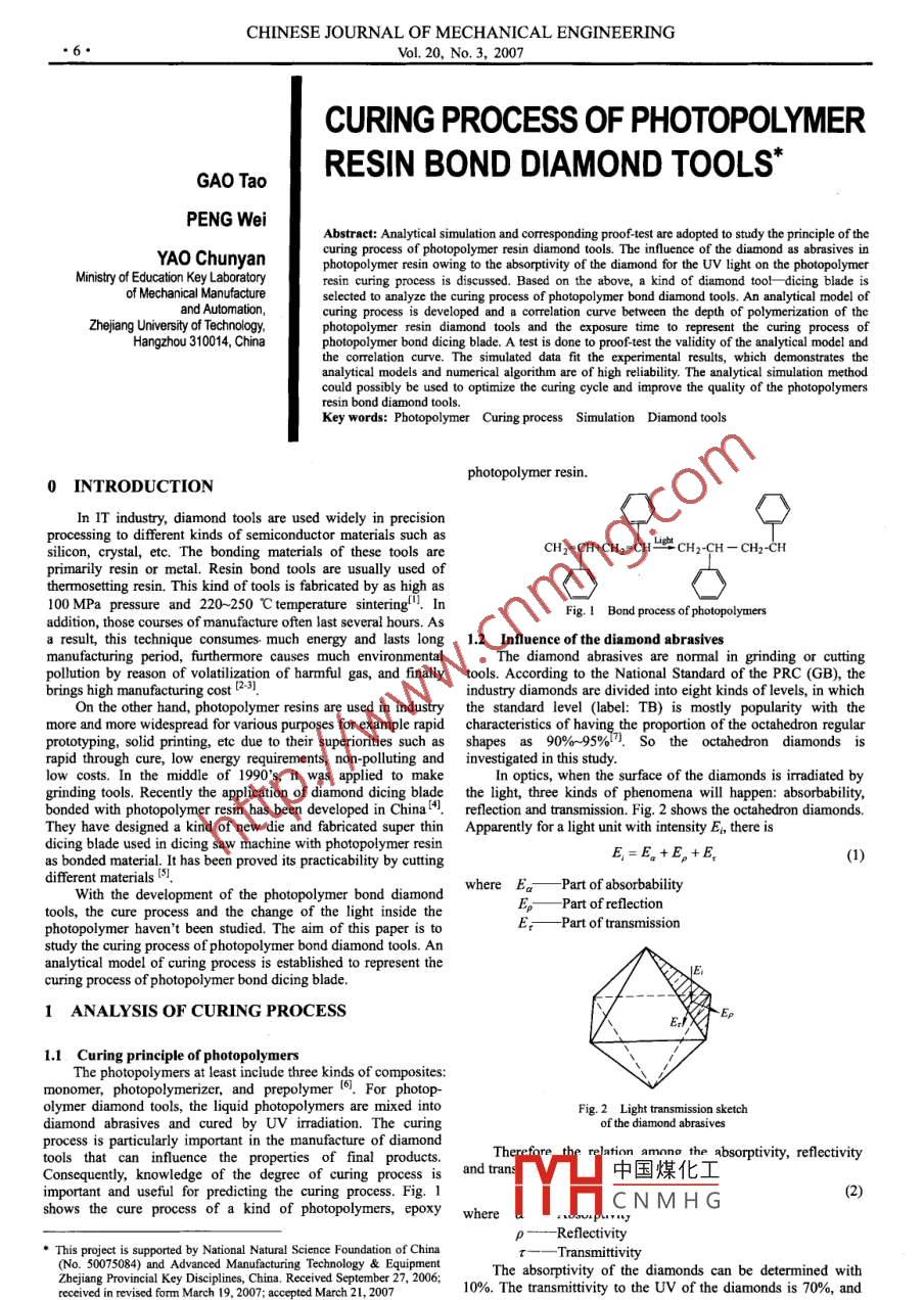 CHINESE JOURNAL OF MECHANICAL ENGINEERING.6.Vol. 20, No. 3, 2007CURING PROCESS OF PHOTOPOLYMERGAO TaoRESIN BOND DIAMOND TOOL .S*PENG WeiAbstract: Analytical simulation and corresponding proof test are adopted to study the principle of thecuring process of photopolymer resin diamond tools. The influence of the diamond as abrasives inYAO Chunyanphotopolymer resin owing to the absorptivity of the diamond for the UV light on the photopolymerMinistry of Education Key Laboratoryresin curing process is discussed. Based on the above, a kind of diamond tool- dicing blade isof Mechanical Manufactureselected to analyze the curing process of photopolymer bond diamond tools. An analytical model ofand Automation,curing process is developed and a correlation curve between the depth of polymerization of theZhejiang University of Technology,photopolymer resin diamond tools and the exposure time to represent the curing process ofHangzhou 310014, Chinaphotopolymer bond dicing blade. A test is done to proof-test the validity of the analytical model andthe correlation curve. The simulated data fit the experimental results, which demonstrates theanalytical models and numerical algorithm are of high reliability. The analytical simulation methodcould possibly be used to optimize the curing cycle and improve the quality of the photopolymersresin bond diamond tools.Key words: Pbotopolymer Curing process Simulation Diamond toolsphotopolymer resin.0 INTRODUCTIONIn IT industry, diamond tools are used widely in precision口processing to different kinds of semiconductor materials such assilicon, crystal, etc. The bonding materials of these tools areCH2=CH+CH2- CH單CH2-CH- CH2-CHprimarily resin or metal. Resin bond tools are usually used ofthermosetting resin. This kind of tools is fabricated by as high as100 MPa pressure and 220-250 C temperature sintering'". InFig. I Bond process of photopolymersaddition, those courses of manufacture often last several hours. Asa result, this technique consumes. much energy and lasts long1.2 Influence of the diamond abrasivesmanufacturing period, furthermore causes much environmentalThe diamond abrasives are normal in grinding or cuttingpollution by reason of volatilization of harmful gas, and finallytools. According to the National Standard of the PRC (GB), thebrings high manufacturing costindustry diamonds are divided into eight kinds of levels, in whichOn the other hand, photopolymer resins are used in industry the standard level (label: TB) is mostly popularity with themore and more widespread for various purposes for example rapid characteristics of having the proportion of the octahedron regularprototyping, solid printing, etc due to their superiorities such as shapes as 90%~95%". So the octahedron diamonds israpid through cure, low energy requirements, non-polluting andinvestigated in this study.low costs. In the middle of 1990's, it was applied to makeIn optics, when the surface of the diamonds is iradiated bygrindingtols. Recently the application of diamond dicing bladethe light, three kinds of phenomena will happen: absorbability,bonded with photopolymer resin has been developed in China閑]reflection and transmission. Fig. 2 shows the octahedron diamonds.They have designed a kind of new die and fabricated super thinApparently for a light unit with intensity E, there isdicing blade used in dicing saw machine with photopolymer resinas bonded material. It has been proved its practicability by cuttingE,=E。+E,+E.(1)different materials (51With the development of the photopolymer bond diamondwhere E-Part of absorbabilityEp一Part of reflectiontools, the cure process and the change of the light inside the-Part of transmissionphotopolymer haven't been studied. The aim of this paper is tostudy the curing process of photopolymer bond diamond tools. Ananalytical model of curing process is established to represent theEIcuring process of photopolymer bond dicing blade.1 ANALYSIS OF CURING PROCESSErEp1.1 Curing principle of photopolymersThe photopolymers at least include three kinds of composites:monomer, photopolymerizer, and prepolymer 0. For photop-olymer diamond tools, the liquid photopolymers are mixed intodiamond abrasives and cured by UV irradiation. The curingof the diamond abrasivesprocess is particularly important in the manufacture of diamondtools that can influence the properties of final products.Therefore. the relation, amnno, the absorptivity, reflectivityConsequently, knowledge of the degree of curing process is and trans中國(guó)煤化工important and useful for predicting the curing process. Fig. 1(2)shows the cure process of a kind of photopolymers, epoxyTYHCNMHG-Reflectivity, This project is supported by National Natural Science Foundation of Chinaτ-- Transmitivity(No. 50075084) and Advanced Manufacturing Technology & EquipmentThe absorptivity of the diamonds can be determined withZhejiang Provincial Key Disciplines, China. Received September 27, 2006;received in revised form March 19, 2007; accepted March 21, 200710%,The transmittivity to the UV of the diamonds is 70%, andCHINESE JOURNAL OF MECHANICAL ENGINEERINGthe reflectivity of the diamonds can be calculated by Eq. (2): 20%.It was found fom Fig. 3 that the proportion of the light lossIt will occur total intemal reflection while the light iradiated decreased as the rflection times of the light inside the diamondsinto the diamonds. The critical angle is defined asincreased. On the other hand, the available proportion of the lightincreased. When the reflection times were up to 16, the availablesinθ=凸(3) proportion achieved a steady result: 78.48%.n1.3 Analysis of the curing processwhere θ一Critical angleWe choose; photopolymer bond dicing blade and the-Refractive index of the photopolymerepoxy photopolymer resin to discuss. The manufacturing process-Refractive index of the diamondsof the dicing blade can be described as following steps. The liguidThe rfactive index of the diamonds and the photpolymers ph