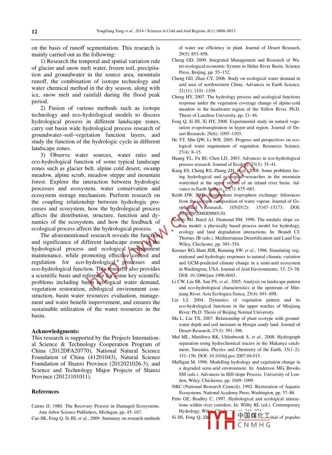Pcienceshttp://www.scar.ac.cnSciences in Cold and Arid RegionsSVolume 6, Issue 1, February, 2014Citation: Yang YG, Xiao HL, Qin ZD, et al, 2014. Research advances in eco-hydrological process and function. Sciences in Cold and AridRegions, 6(1): 8- 13. DOI: 10.3724/SPJ.1226. 2014.00008.Research advances in eco-hydrological process and functionYongGang Yang 12, HongL ang Xiao 2, ZuoDong Qin 1 , Na Kang , CaiMei Li1. Institute of Loess Plateau, Shanxi University, Taiyuan, Shanxi 030006, China2. Cold and Arid Regions Environmental Engineering Research Institute, Chinese Academy of Sciences, Lanzhou, Gansu730000, China*Correspondence to: Dr. ZuoDong Qin, Institute of Loess Plateau, Shanxi University. No. 92, Wucheng Road, Taiyuan,Shanxi 030006, China. Tel: +86-351 -7010700; E-mail: qzdsxu@ 126.comReceived: February 15, 2013 Accepted: July 24, 2013ABSTRACTPresent studies on the coupling relationship and hydrology mechanism between basin ecosystem and hydrological processsummarizes research and presents a method of combining isotopic technology with hydro chemical methods, for the studyof eco-hydrological process and function in different landscape zones. We then examine research trends for future directionand development of this field.Keywords: eco-hydrological process; eco-hydrological function; landscape zone; isotope1 Introductionvironment is on the observation of hydrological pro-cesses. Ecological systems present a relationship be-Eco-hydrology is an emerging interdisciplinarytween vegetation and environmental factors, while thefield, gradually developed after the 1980s, and is in thehydrological process, as a main driving force of eco-forefront of hydrological research. Eco-hydrology islogical system succesion, controls vegetation struc-the interaction of plants and the hydrological process,ture and distribution patterns, and ecological processand describes ecological patterns and eco-hydrological(Zhao and Cheng, 2001). International research intomechanisms (Zhao and Cheng, 2001). The researcheco-hydrology is focused on the interaction among ice,purpose of eco-hydrology is to increase the under-frozen soil, precipitation, groundwater and the eco-standing of the coupling relationship between ecologi-logical environment (Petts and Bradley, 1997). Thecal and hydrological processes, and to provide a theo-main task for future scientific development and man-retical basis of restoring and establishing a healthyagement in the basin is to recognize the coupling rela-eco-hydrological environment (ecological engineering).tionship between ecosystem and hydrological process,There is a close relationship among ecological systemand to integrate the technical system of ecologicalpatterm, ecological process change and hydrologicalrestoration (Cheng, 2009).process. The target of eco -hydrology research includesdry land, wetlands, forest, grasslands, mountains, lakes2 Research of eco-hydrological processand rivers and is based on a theoretical relationshipbetween plants and water with the scale throughout theThe structure and function of the ecosystem andstudy (Xiao and Cheng, 2006).its hydrology ame heth i中國煤化工nents of reThe research focus in the field of resource and en-search in thisLips betweenTHCNMH GYongGang Yang et al, 2014 1 Sciences in Cold and Arid Regions, 6(1): 0008- 00139hydrological processes and biological dynamics mayresearch on hydrological process and ecosystems inalso shed light on how ecological patterns and chang-the basin helps to discover eco-hydrological restora-es are interlinked, and dependent on hydrologicaltion mechanisms, such as the relationship betweenmechanisms. The study of stability and interactiondiversity change under different moisture conditionsmechanism of hydrological process and the ecosystemand the relationship between vegetation communitycan provide a theoretical basis for eco-hydrologicalsuccession and hydrological processes. This mecha-layout and its dynamic balance maintenance, and pro-nism will be helpful for plant physiology and ecologyvide a scientific explanation for the relationship be-under small scale stress conditions.tween ecological succession and hydrological circula-tion changes (Wang et al., 2001). There are three im- 2.2 Simulation research of eco-hydrological processportant scientific problems on the study ofeco-hydrological process as follows.Simulation research is another important direc-tion of eco-hydrological process research. The com-2.1 Research of eco-hydrological restorationplexity of hydrological conditions, and the hetero-geneity and variability in temporal and spatial dis-One important problem of eco-hydrological pro-tribution of the elements influences hydrologicalcess research is eco-hydrological restoration. Thbehavior, making it difficult to directly quantifystudy of eco-hydrological restoration deals with theeco-hydrological changes.effect on vegetation cover sensitivity, ecological effectCurrently, the models used for eco-hydrologicalof water behavior in its watershed, the physiologicalprocess research are: SPAC, SWAT, WAVES, SWIMV,and ecological processes, and the performance of and PATTERN, which are used to simulate the mate-plants under drought conditions (Kang et al, 2008).rial and energy transfer process of soil-vegetation-Cairns (1980) elaborated on the main theoretical andatmosphere interaction, and analyze eco-hydrologicalpractical problems in the process of damaged ecosys-effects of vegetation (Kremer et al, 1996); RHES,tem restoration. Over the past 20 years, numerousXAJ, TANK, and SLT, are used for eco-hydrologicalstudies have focused on remediation technology of thesimulation in the basin, especially for hydrologicaleco-hydrological environment, involving restorationprocess simulation (Uso-domenech et al,, 1995;and management of grasslands, mines, water and soil.Mulligan, 1996); RUTTER, MASSMAN, andSince the 1950s, China has provided long-term ob-PHILIP, are used for forest eco-hydrological process,servati