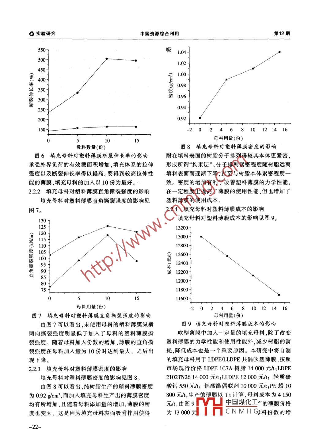 Vol 32. No 12中國(guó)資源綜合利用2014年12月China resources Comprehensive utilizationc實(shí)驗(yàn)研究聚烯烴填充母料在塑料薄膜中的應(yīng)用研究徐冬梅,高標(biāo),曾長(zhǎng)春2(1徐州工業(yè)職業(yè)技術(shù)學(xué)院,江蘇徐州221140;2徐州同創(chuàng)塑業(yè)有限公司,江蘇徐州221006)摘要:聚烯烴填充母料用于塑料薄膜,具有良好的社會(huì)和經(jīng)濟(jì)效益。采用同向雙螺桿擠出機(jī)制備了膜用填充母料,以熔體流動(dòng)速率為指標(biāo)優(yōu)化了填充母料的配方并用于吹膜實(shí)踐。結(jié)果表明,隨著母料加入份數(shù)的增多,薄膜的力學(xué)性能增大,加入的份教達(dá)到10份時(shí)效果最好;薄膜的密度會(huì)在加入母料后增大,但變化幅度不大;母料的加入使塑料薄膜的成本降低。但考慮到塑料薄膜性能,母料的加入量應(yīng)控制在10份為宜。關(guān)鍵字:聚烯烴;薄膜;填充母料中圖分類號(hào):TQ320文獻(xiàn)標(biāo)識(shí)碼:A文章編號(hào):l008-9500(2014)12001905Application of Filling Polyolefin Matrix in the Plastic Thin FilmXu Dongmei, Gao Biao, Zeng Changchun(1. Xuzhou College of Industrial Technology, Xuzhou 221140, China2. Xuzhou Tongchuang Plastic Industry Co, Ltd. Xuzhou 221006, China)Abstract: The application of filling polyolefin matrix in plastic thin film has excellent social and economicbenefits. In the present work, co-rotating twin screw extruder has been adopted to prepare film used fillingmatrix, and the formula of the filling matrix has been optimized by using the melt flow rate as index and ithas been further applied to the film blown practice. The research results showed that the mechanical propertiesof the thin films increased with the increase of the added percentage of the polyolefin matrix and theproperties reached the best with the filled matrix of 10 phr. The membrane density would increase after theddition of the polyolefin matrix, while the variation range was not great. Moreover, the addition of the polyolefinmatrix could decrease the cost, and the optimum filling amount of the polyolefin matrix should be controlledat 10 phr in consideration of the mechanical properties of the thin filmKeywords: low density polyolefin; thin film; filling matrix碳酸鈣具有原料易得、價(jià)格低廉、穩(wěn)定性好、無(wú)毒等諸多優(yōu)點(diǎn),用于填充塑料,不僅可降低材料成1實(shí)驗(yàn)本且可起增韌補(bǔ)強(qiáng)、提高材料抗沖擊強(qiáng)度、改善材1.1實(shí)驗(yàn)原料料彈性模量和拉伸性能等作用叩。吳智華等比較實(shí)驗(yàn)原料及生產(chǎn)廠家見表1。了碳酸鈣、高嶺土和淀粉吹塑薄膜的成膜性,得出表1實(shí)驗(yàn)原料及生產(chǎn)廠家了碳酸鈣的成膜性最好的結(jié)論,所以以碳酸鈣為母原料名稱生產(chǎn)廠家料核的聚烯烴填充母料在塑料薄膜中應(yīng)用最為廣LDPE(2102N26齊魯石化公司泛LDPE(IC7A)北京燕山石化公司填充母料的結(jié)構(gòu)由里向外由填料核、偶聯(lián)層、LDPE(DFDC-7050)中原石化公司體樹脂的種類、母料核填充劑碳酸鈣份數(shù)以及分散0日)余姚市雪峰碳酸鈣填充母料廠分散層和載體樹脂4部分組成。本文主要研究了載輕質(zhì)碳酸鈣余姚市奮發(fā)塑業(yè)有限公司硬脂酸余姚市榮威塑化商行劑PE蠟的用量對(duì)母料熔體流動(dòng)速率的影響,PE蠟上海華熠化工助劑有限公司并分析了應(yīng)用于吹塑薄膜時(shí)的效果。液體石蠟市售中國(guó)煤化工收稿日期:2014-10-09CNMHG作者簡(jiǎn)介:徐冬梅(1966-),女,江蘇如東人,高級(jí)工程師副教授,從事高分子材料的權(quán)實(shí)驗(yàn)研究中國(guó)資源綜合利用第12期12實(shí)驗(yàn)設(shè)備及儀器表4擠出造粒工藝參數(shù)實(shí)驗(yàn)設(shè)備及儀器見表2。機(jī)頭溫度熔體熔體喂主機(jī)表2實(shí)驗(yàn)設(shè)備及儀器(℃)溫度(℃)壓力(Mpa)頻率電流(A)頻率(Hz)195230-2420050.851801922實(shí)驗(yàn)設(shè)備及儀器生產(chǎn)廠家由表3、表4可以看出,擠出機(jī)各區(qū)段溫度最雙螺桿擠出造粒機(jī)組(CTE-35)南京科貝隆科亞機(jī)械公司高速混合機(jī)(SHR-50張家港億利機(jī)械有限公司高設(shè)置是七區(qū)的200℃,但熔體溫度在230~242℃熔體流動(dòng)速率儀(XNR-400C)河北承德試驗(yàn)機(jī)有限公司之間波動(dòng)。這是因?yàn)樵O(shè)置的溫度是機(jī)筒各區(qū)段溫真空干燥箱(DZF-6210)上海賀德實(shí)驗(yàn)設(shè)備有限公司度,并不是實(shí)際溫度,所以在擠出造粒過(guò)程中應(yīng)隨電子天平(BT22S)賽多利斯科學(xué)儀器(北京)時(shí)控制冷卻水,以更好的平衡各區(qū)段的溫度。有限公司134原料娸干吹塑薄膜機(jī)組(SJ-45/28)大連橡塑機(jī)械有限公司造粒完成后,因擠出過(guò)程需經(jīng)過(guò)冷卻水池或其塑料電子萬(wàn)能試驗(yàn)機(jī)(AI-7000LA高鐵科技股份有限公司他原因可能混入水分,因此將填充母料顆粒置于烘沖片機(jī)(CP25)江都市試驗(yàn)機(jī)械廠箱中,以溫度80℃,壓力為005Mpa烘干30min13工藝流程1.3.5吹塑薄膜工藝流程見圖1根據(jù)熔體流動(dòng)速率(MFR)選擇配方7制得的填充母料吹塑薄膜。吹塑薄膜的基體樹脂選擇擠沖性 LDPE/LLDPE共混,這是因?yàn)長(zhǎng)LDE樹脂易結(jié)晶加工性較差,但其在沖擊強(qiáng)度、斷裂伸長(zhǎng)率、韌性、合粒膜樣撓曲性等方面優(yōu)于DDPE;而LDPE薄膜的霧度、光圖1工藝流程澤度、透明度等方面又優(yōu)于LDE采用兩者共混吹1.3.1原料預(yù)處理塑薄膜可在一定程度上提高薄膜