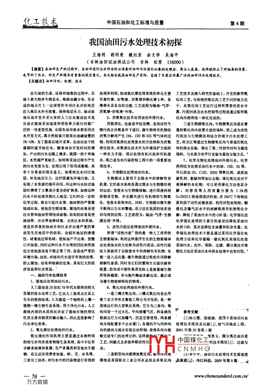 化工技術(shù)中國(guó)石油和化工標(biāo)準(zhǔn)與質(zhì)量第4期我國(guó)油田污水處理技術(shù)初探王海明胡明亮魏旭東余文學(xué)吳海平. (吉林油田試油測(cè)試公司 吉林松原138000 )[摘要]在油田生產(chǎn)的過(guò)程中,當(dāng)油田進(jìn)行注水作業(yè)時(shí)必須要對(duì)油田污水進(jìn)行必要的處理后,再注入底層,這祥就防止了對(duì)地層的傷害,也節(jié)約了用水,對(duì)生產(chǎn)環(huán)境具有重要的現(xiàn)實(shí)意義。本文結(jié)合我國(guó)油田生產(chǎn)實(shí)際,總結(jié)了目前應(yīng)用最廣泛的油田污水處理技術(shù)。[關(guān)鍵詞]油田污水;處理;技術(shù)在石油的生成、運(yùn)移和儲(chǔ)集的過(guò)程中,石處理 和利用。構(gòu)成氧化塘處理系統(tǒng)的單元主要工藝技術(shù)及深入研究的基礎(chǔ) 上,開(kāi)發(fā)的新型氧油E要天然伴生物是水。根據(jù)油藏分布,在合有兼性塘、 好氧塘、厭氧塘和熟化塘4種,各化溝工藝。 與傳統(tǒng)的氧化溝工藝不同的地方在適的地點(diǎn)打上- -定深度的專(zhuān)用注水井給地層塘 都有其各自的功能,工藝流程為隔油-氣浮-于, 此氧化溝工藝運(yùn)行過(guò)程所需要的泥水分注人高壓水補(bǔ)充能量,保持地層壓力,驅(qū)動(dòng)原厭氧塘-好氧塘外排。離、污泥回流及出水控制等過(guò)程是通過(guò)船型氧油從油井里開(kāi)采出來(lái)的人工注水驅(qū)油技術(shù)是3、厭氧氧化技術(shù)處理油田外排污水.化溝內(nèi)澄清池-體化完成的。目前在提高采油速度和采收率方面應(yīng)用最廣厭氧消化,也就是甲燒發(fā)酵,是指活性生三是生物膜氧化溝。牛物膜氧化溝是在普泛的一-項(xiàng)重要措施, 全國(guó)各油田基本都采用注物污泥 在厭氧條件下進(jìn)行,微生物將有機(jī)物經(jīng)通的氧化溝內(nèi)放置合適的填料, 使之成為活性水開(kāi)發(fā)方式。靠自然能量只能采出油藏儲(chǔ)量的厭氧分解而產(chǎn)生 CH4、C02 和H2S等氣體的過(guò)污泥法 與生物膜法相結(jié)合的混合污水處理工1%-10%,為了提高后續(xù)開(kāi)采率,在油田處于旺程。 利用厭氧消化處理廢水的方法統(tǒng)稱(chēng)為厭氧藝。 何太江等通過(guò)生物膜氧化溝與普通的氧化盛期時(shí)就開(kāi)始注水。隨著油田開(kāi)發(fā)時(shí)間的增消化技術(shù)。厭氧消化技術(shù)作為環(huán)境保護(hù)方面的溝的清水實(shí)驗(yàn), 得出了第二性軟性材料為最佳長(zhǎng),產(chǎn)出的污水也隨之增多。我國(guó)一些干早地-種 有力手段,用以處理有機(jī)污泥和有機(jī)廢填料, 與水流方向平行安裝為最佳安裝方式。'區(qū),水資源嚴(yán)重缺乏,如何將采油過(guò)程中產(chǎn)生水, 現(xiàn)已成為水污染控制工程中的一項(xiàng)重要治7、化學(xué)及物化處理油田外排污水?;瘜W(xué)的污水變廢為寶,處理后用于飲用或灞溉,具理技術(shù)。藥劑法為處理采油污水中的油、COD, ss等,有十分重要的現(xiàn)實(shí)意義。如果將此水回注地4、生物膜法處理油田污水??梢酝都?3, C102,H202 等氧化劑,或投加層,補(bǔ)充地層壓力,這樣既避免環(huán)境污染,又生物膜法主要用于去除水中的溶解性有破乳劑、 絮凝劑等加以去除:催化氧化法對(duì)于實(shí)現(xiàn)了水資源的循環(huán)利用.但這種污水經(jīng)過(guò)地機(jī)質(zhì), 它的基本原理是通過(guò)廢水與生物膜的相難降解的 有機(jī)物,可以采用催化方法使其分層時(shí)攜帶了大量成分復(fù)雜的礦物質(zhì),如將這種對(duì)運(yùn)動(dòng), 使廢水與生物膜接觸,進(jìn)行固液兩相解。 劉春英等人用質(zhì)最分?jǐn)?shù)為7.5%的污水不經(jīng)處理直接注人地層,它們經(jīng)過(guò)- -定的的物質(zhì)交換, 并在膜內(nèi)進(jìn)行有機(jī)物的生物氧Cu(N03)2 溶液浸讀活性炭,在260C下將銅還化學(xué)過(guò)程,將會(huì)引起注水管、抽油管的嚴(yán)重腐化, 使廢水獲得凈化。同時(shí),生物膜內(nèi)微生物原熱固于活性炭徽表面, 利用活性炭吸附、銅蝕或結(jié)垢,使地層空隙堵塞.腐蝕的結(jié)果是使不斷得以生 長(zhǎng)和繁殖。該乃法在我國(guó)的很多油催化及曝 氣后水中的溶解氧將有機(jī)物氧化分注水管和抽油管洞蝕或破裂,結(jié)垢的結(jié)果是使田均得到應(yīng)用, 工藝流程為:隔油-氣浮-生物解, 降低了采油污水中的COD值:化學(xué)強(qiáng)化法抽油管、注水管逐漸堵塞,無(wú)法注水和采油,膜處理 外排?;瘜W(xué)強(qiáng)化處理的主要8的是設(shè)法降低采油污使造價(jià)昂貴的抽油井和注水井出現(xiàn)嚴(yán)重的事5、活性污泥法處理油田外排污水。水的COD,其次是降低含油量和機(jī)雜含量?;拾l(fā)生在地層中的結(jié)垢,會(huì)破壞地層的滲透所謂“活性污泥"指的是種人工培養(yǎng)的學(xué)強(qiáng)化處理技術(shù)主要 是通過(guò)采用化學(xué)強(qiáng)化電性,堵塞地層即垢堵,使原油產(chǎn)不出來(lái),使整生物絮凝體, 利用這種懸浮生長(zhǎng)的生物絮凝體處理方法和化學(xué) 絮凝- -催 化鍛化來(lái)強(qiáng)化處理口井報(bào)廢。同時(shí)這種污水不合理的回注和排放去 處理廢水的方法稱(chēng)為活性污泥法。活性污泥采油污水。 此外,吸附、過(guò)濾、膜分離技術(shù)等還會(huì)使地面設(shè)備不能正常工作,會(huì)造成嚴(yán)重的法主要被用 于去除