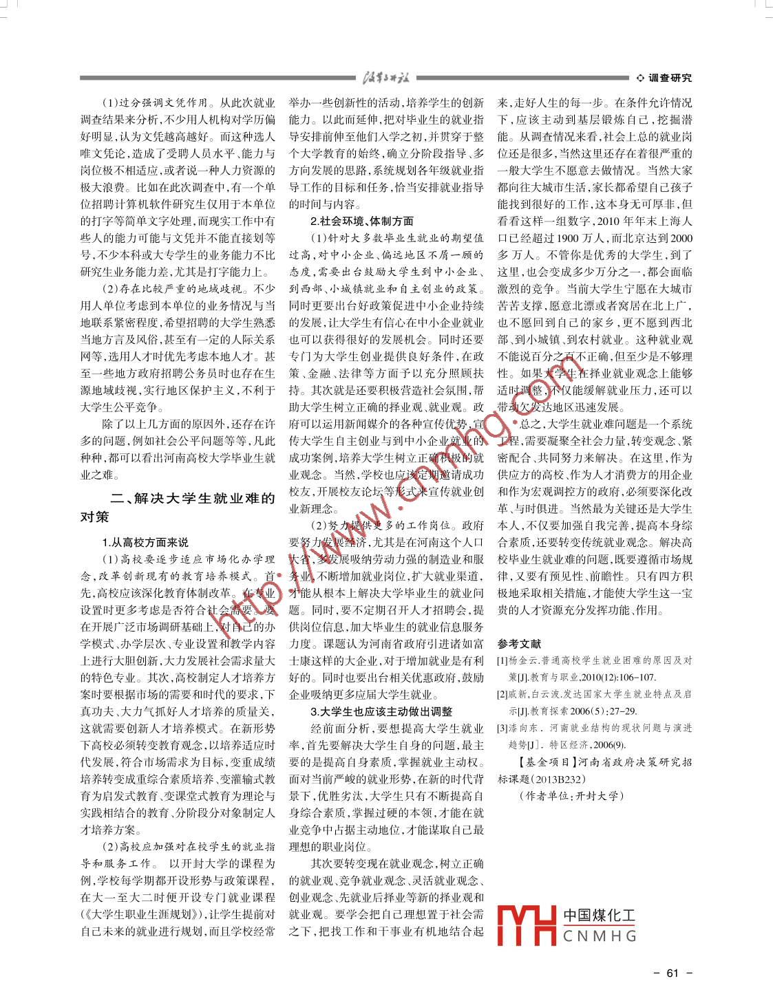 調(diào)查研究。河南省2012屆大學畢業(yè)生就業(yè)問題的研究張新梅摘要:2012年,全國高校畢業(yè)生規(guī)模 主要的原因就是大學生本 身存在的問題。2011 更是達到760萬人。2010年的就一達到680萬人,而河南高校畢業(yè)生就已高達1.大學生自身問題的探究次業(yè)率大約65%,大約有200萬的大學生50萬人,與其他地區(qū)相比河南省的畢業(yè)生就業(yè)(1)擇業(yè)觀念比較淡薄,就業(yè)期望偏在2011年處于待業(yè)狀態(tài)。與此同時,情況不容樂觀。加之,國家正在進行產(chǎn)業(yè)轉(zhuǎn)型差嚴重。 通過此次調(diào)查研究,發(fā)現(xiàn)大學生2012 年,2013年,同期畢業(yè)大學生人數(shù)不.升級,同時受世界經(jīng)濟影響,國內(nèi)經(jīng)濟發(fā)展速在擇業(yè)觀念上普遍存在偏差,對應(yīng)聘崗位斷增長 ,未就業(yè)大學生池子越來越深。與度也受到小幅下滑,人才市場也漸漸趨于飽多側(cè) 重在國外企業(yè)、國家公務(wù)員科研單此同時 ,近幾年世界經(jīng)濟遇到的美國的金和,大學生就業(yè)難似乎成為無解的難題。本文位等相對 穩(wěn)定輕松的職業(yè),而較少數(shù)選擇融 動蕩,歐債危機。中國經(jīng)濟雖然-直在針對河南大學生就業(yè)難的原因從多角度進行鄉(xiāng)鎮(zhèn)企業(yè)集體企業(yè)或者個體就業(yè);而對發(fā)展,但也出現(xiàn)波動,加之經(jīng)濟結(jié)構(gòu)調(diào)動分析,認為原因是多方面的。既有大學生自身擇業(yè)的區(qū)域 上,大多傾向于大中城市,很轉(zhuǎn) 型,這直接導致整個社會就業(yè)大環(huán)境的的原因,也有社會、體制等多方面因素使然,并少愿意去貧困地方 去西部、去小城鎮(zhèn)、去不穩(wěn)定。 進而出現(xiàn)了經(jīng)濟增長與就業(yè)增嘗試著給出解決對策。農(nóng)村。同時,大學生在擇業(yè)時,缺乏清晰長脫節(jié)的困難局面。關(guān)鍵詞:河南大學生;就業(yè);原因分析;對定位 ,擇業(yè)缺乏目的性不強,有少數(shù)還是3.高校教育機制方面存在不足分析被迫走進招聘會。此外,通過調(diào)查還發(fā)現(xiàn)學校教育與市場需求脫節(jié)-直是我了一個不容忽視的誠信問題。不少畢業(yè)國高校培養(yǎng) 方式的一大難題。 隨著近幾近年來,河南省高校畢業(yè)生數(shù)量逐年生認為,求職時如果成績單足夠優(yōu)秀和評年國家對高等教育不斷投人,學校軟硬件增多。2009 年河南省普通高校畢業(yè)生人優(yōu)獎勵的證 書足夠多,能為找工作帶來很設(shè)施有 了較大的發(fā)展,但高校學生就業(yè)問數(shù)是36.5萬人,2010年人數(shù)為41萬,2011大優(yōu)勢。 所以,很多大學生不惜通過偽造題卻越來越嚴重。 經(jīng)過調(diào)查了解,認為有年為44.6萬人,2012年為50萬。由此可一-張張 證書以騙取企業(yè)的青睞,這對大學以下幾個方面的原因: 首先是對大學生的看出每年河南省的畢業(yè)生以近4萬人數(shù)畢業(yè)生 整體形象造成一-定的損害。全面素質(zhì)教育與培養(yǎng)力度的重視程度還在增長。同時還沒有考慮歷年累積和中(2)法律意識淡薄,缺少自我保護意不夠。 由于各種因素的影響,我國高等教專的就業(yè)情況。即便政府為解決這一-問識。 據(jù)此次調(diào)查,有多于40%的求職者育改革 相對于社會需要比較滯后,教育思題調(diào)動市場能為- - 些大學生就業(yè)提供機沒有 主動與用人單位要求簽約合同,在簽想 、觀念等更新不夠及時,到今天已經(jīng)明會,但整體情況肯定也不容樂觀。而且解約合 同的人員中有多于80%的求職者沒顯 不適應(yīng)現(xiàn)代化建設(shè)對人才的要求;其決方案和措施的實施將直接關(guān)系到大學有 使用勞動、人事部門規(guī)定的合同樣本,次,教材多年未變,專業(yè)劃分改革緩慢,高生的切身利益和響應(yīng)中部崛起的計劃以更沒有 進行合同簽證。在某人才市場統(tǒng)校幾乎沒有 自主權(quán),再加之教學方法過于及我國的經(jīng)濟發(fā)展、穩(wěn)定。因此,對河南一印制并發(fā)放給招聘單位的“求職登記簡單,對知識傳授看重程度較高,而對能大學生就業(yè)困難的現(xiàn)狀進行正確歸因,指表"上, 在明顯位置專設(shè)- -欄“求職提醒”,力培養(yǎng)卻比較輕視;第三, 學校的人才培導大學生樹立正確的就業(yè)思想,采取積極包括不要 向用人單位繳納各種名義的招養(yǎng) 與社會需求脫節(jié),造成大學生就業(yè)結(jié)構(gòu)的應(yīng)對措施,都具有十分重要的意義。聘費用、不要抵押任何證件,以及及時進性供求矛盾。高等教育的滯后性和周期一、探尋2012屆河南畢業(yè)行合同簽證等內(nèi)容,而從該人才市場公布長的兩個特點確定了其與社會需求的契投訴案例來看,有一半以上的投訴與以上合度 不夠,而高校人才預(yù)測工作處于探索生就業(yè)難的原因三種行為有關(guān),用人單位收取應(yīng)聘者抵押階段 甚至還沒有開始,加之高校招生功利以2012屆開封市三所高校畢業(yè)生及金的現(xiàn) 象更為突出。性比較明顯,與社會需求結(jié)合不夠緊密,部分企業(yè)調(diào)查為例,本課題采用自制的2.整體就業(yè)環(huán)境不佳,就業(yè)呈現(xiàn)結(jié)構(gòu)甚至脫節(jié),導致高校培養(yǎng)與社會需求的結(jié)“大學生就業(yè)調(diào)查問卷”,通過QQ在線、深性失衡構(gòu)性矛盾較為突出。第四,大部分高校培人宿舍、圖書館和路