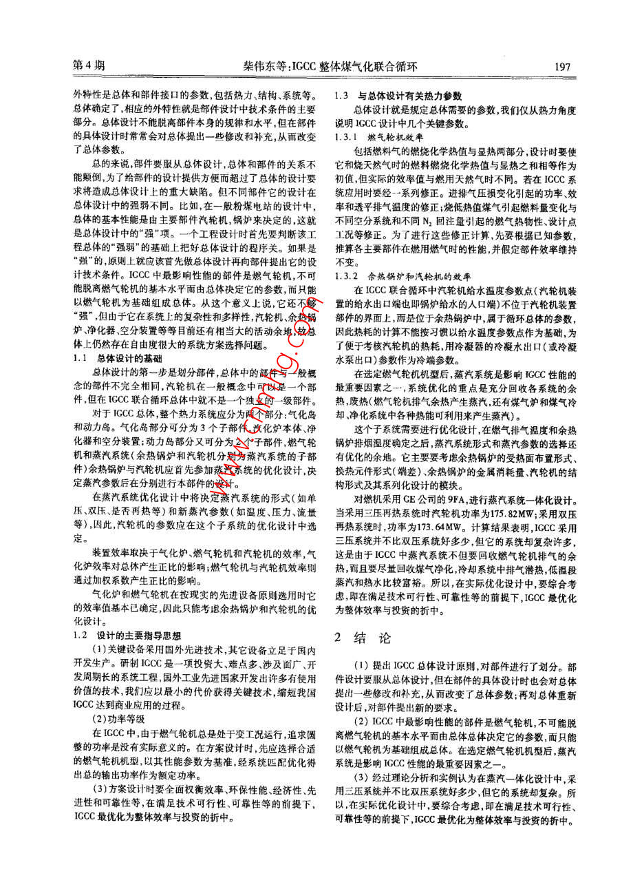 第45卷第4期汽輪機(jī)技術(shù)Vol.45 No.42003年8月.TURBINE TECHNOLOGYAug, 2003IGCC整體煤氣化聯(lián)合循環(huán)柴偉東',韓萬(wàn)金',林公舒2(1哈爾濱工業(yè)大學(xué),哈爾濱150001; 2哈爾濱汽輪機(jī)廠有限責(zé)任公司哈爾濱150046)摘要:論述ICCC總體設(shè)計(jì)及主要指導(dǎo)思想,提出在IGCC社設(shè)計(jì)中應(yīng)該重點(diǎn)考慮蒸汽系統(tǒng)的優(yōu)化。關(guān)鍵詞1CC;總體設(shè)計(jì);余熱鍋爐;汽輪機(jī)分類號(hào):TKI4文獻(xiàn)標(biāo)識(shí)碼:A文章編號(hào):1001 5884{2003 )04-0196-02Integrated Coal Gasification Combined CycleCHAI Wei-dong' , HAN Wan-jn' , IIN CGong-shu2(1 Harbin Instiute of Technobogy, Harbin 15001 ,China; 2 Harbin Tubine Company Limited, Harbin 150046, China)Abstract:ICCC Integrated design and main guide for general design project is discussed. For IGCC design it emphasizeasteam system optimum.Key words :IGCC; integrated design; HRSG; steam turbine從大型化和商業(yè)化的發(fā)展進(jìn)程看,目前更多的資金是投0前言在ICCC上?,F(xiàn)在,美國(guó)、德國(guó)、日本、英國(guó)、荷蘭、瑞典、意大整體煤氣化聯(lián)合循環(huán)( Integrated Coal Gasificarion Com-利芬蘭以及印度等國(guó)都加入到IGCC的開(kāi)發(fā)行列,取得重大binedCycle簡(jiǎn)稱ICCC)是把高效的聯(lián)合循環(huán)總能系統(tǒng)和潔進(jìn)展,已達(dá)到大型商業(yè)化驗(yàn)證階段。目前全世界正在建設(shè)或計(jì)劃建設(shè)的ICCC工程有24項(xiàng),總功率8200MW。但我國(guó)對(duì)凈的燃煤技術(shù)結(jié)合起來(lái)的先進(jìn)的發(fā)電系統(tǒng)為當(dāng)今世界能源ICCC 項(xiàng)目還停留在研究階段。隨著國(guó)家“九五”科技攻關(guān)計(jì)關(guān)注的一一個(gè)熱點(diǎn)。它將逐步取代現(xiàn)有的汽輪機(jī)電站,成為火劃項(xiàng)目“整體煤氣化聯(lián)合循環(huán)關(guān)鍵項(xiàng)目”的建立和完成,一系電動(dòng)力的主要發(fā)展方向。ICCC發(fā)電系統(tǒng)為多種高技術(shù)的集成,它包括:先進(jìn)的煤列重大基礎(chǔ)研究課題及示范工程正在規(guī)劃和實(shí)施中。氣化技術(shù)高溫凈化技術(shù)高性能的燃?xì)廨啓C(jī)、匹配協(xié)調(diào)的余1 ICCC 總體設(shè)計(jì)原則.熱鍋爐和汽輪機(jī)以及系統(tǒng)-體化技術(shù)等。ICCC首先是將煤在汽化爐中進(jìn)行氣化產(chǎn)生煤氣,然后經(jīng)過(guò)凈化處理后通到燃在ICCC總體設(shè)計(jì)中應(yīng)該采用系統(tǒng)工程的方法,綜合研氣輪機(jī)的燃燒室中燃燒,經(jīng)燃?xì)廨啓C(jī)作功后再排入余熱鍋爐究系統(tǒng)中的能量傳遞、轉(zhuǎn)換和利用的全部過(guò)程,按照能量品中產(chǎn)生蒸汽供給汽輪機(jī)作功。簡(jiǎn)單系統(tǒng)如圖1所示。位的高低,安排好功、熱和物料內(nèi)能等各種能量之間的配合氣化四鹵一國(guó)關(guān)系和轉(zhuǎn)換使用。在熱力系統(tǒng)整體上,按總能系統(tǒng)概念進(jìn)行匹配優(yōu)化,安排好不同品位能的合理利用,以取得最佳的系統(tǒng)整體性能,而不是追求提高單-一生 產(chǎn)設(shè)備的能源利用率等個(gè)別性能指標(biāo)。首先,ICCC總體設(shè)計(jì)的任務(wù)就是從裝置的總體出發(fā)使毒t GT設(shè)計(jì)滿足用戶或上一級(jí)總體設(shè)計(jì)者的要求。與總體相對(duì)應(yīng)tcy的是部件,總體是由部件組成的,但它又不是機(jī)械的組合。如果說(shuō)第n個(gè)部件在設(shè)計(jì)時(shí)有n個(gè)要決定的變量,則總體就HRSC有N= En(i=1,m)個(gè)變量(m為部件的個(gè)數(shù)) ,每個(gè)部件七ST-的設(shè)計(jì)都要確定它的n個(gè)設(shè)計(jì)變量,使它的性能滿足總體的要求,但部件性能的最優(yōu)選擇并不等于總體性能的最優(yōu)。區(qū)盧上因此,總體設(shè)計(jì)時(shí)不能只滿足于用有限的最佳性能方案的組圖1 ICCC 原則性系統(tǒng)圖合來(lái)謀求總體的最優(yōu)設(shè)計(jì)方案,而要將n;個(gè)變量統(tǒng)- -考慮以求裝置的最優(yōu)。但在ICCC總體設(shè)計(jì)中目前還達(dá)不到或較ST--汽輪機(jī);y- -壓氣機(jī);R-燃燒室;GT -燃?xì)馔钙?HRSC一余熱鍋爐;KF-空分裝置;A- -除塵裝置:S-除硫裝置難達(dá)到這種優(yōu)化選擇。IGCC總體設(shè)計(jì)是在部件外特性基礎(chǔ)上進(jìn)行的。部件的收稿日期:2003403-25作者簡(jiǎn)介:柴偉東(1967-) ,男,高級(jí)工程師.哈爾濱工業(yè)大學(xué)在讀工程碩士。第4期柴偉東等:IGCC整體煤氣化聯(lián)合循環(huán)外特性:是總體和部件接口的參數(shù),包括熱力、結(jié)構(gòu)、系統(tǒng)等。.3 與總體設(shè)計(jì)有關(guān)熱力參數(shù)總體確定了,相應(yīng)的外特性就是部件設(shè)計(jì)中技術(shù)條件的主要總體設(shè)計(jì)就是規(guī)定總體需要的參數(shù),我們僅從熱力角度部分??傮w設(shè)計(jì)不能脫離部件本身的規(guī)律和水平,但在部件說(shuō)明1CCC設(shè)計(jì)中幾個(gè)關(guān)鍵參數(shù)。的具體設(shè)計(jì)時(shí)常常會(huì)對(duì)總體提出一些修改和補(bǔ)充,從而改變1.3.1 燃?xì)廨啓C(jī)效率了總體參數(shù)。包括燃料氣的燃燒化學(xué)熱值與顯熱兩部分,設(shè)計(jì)時(shí)要使總的來(lái)說(shuō),部件要服從總休設(shè)計(jì),總體和部件的關(guān)系不它和燒天然氣時(shí)的燃料燃燒化學(xué)熱值與顯熱之和相等作為能顛倒,為了給部件的設(shè)計(jì)提供方
